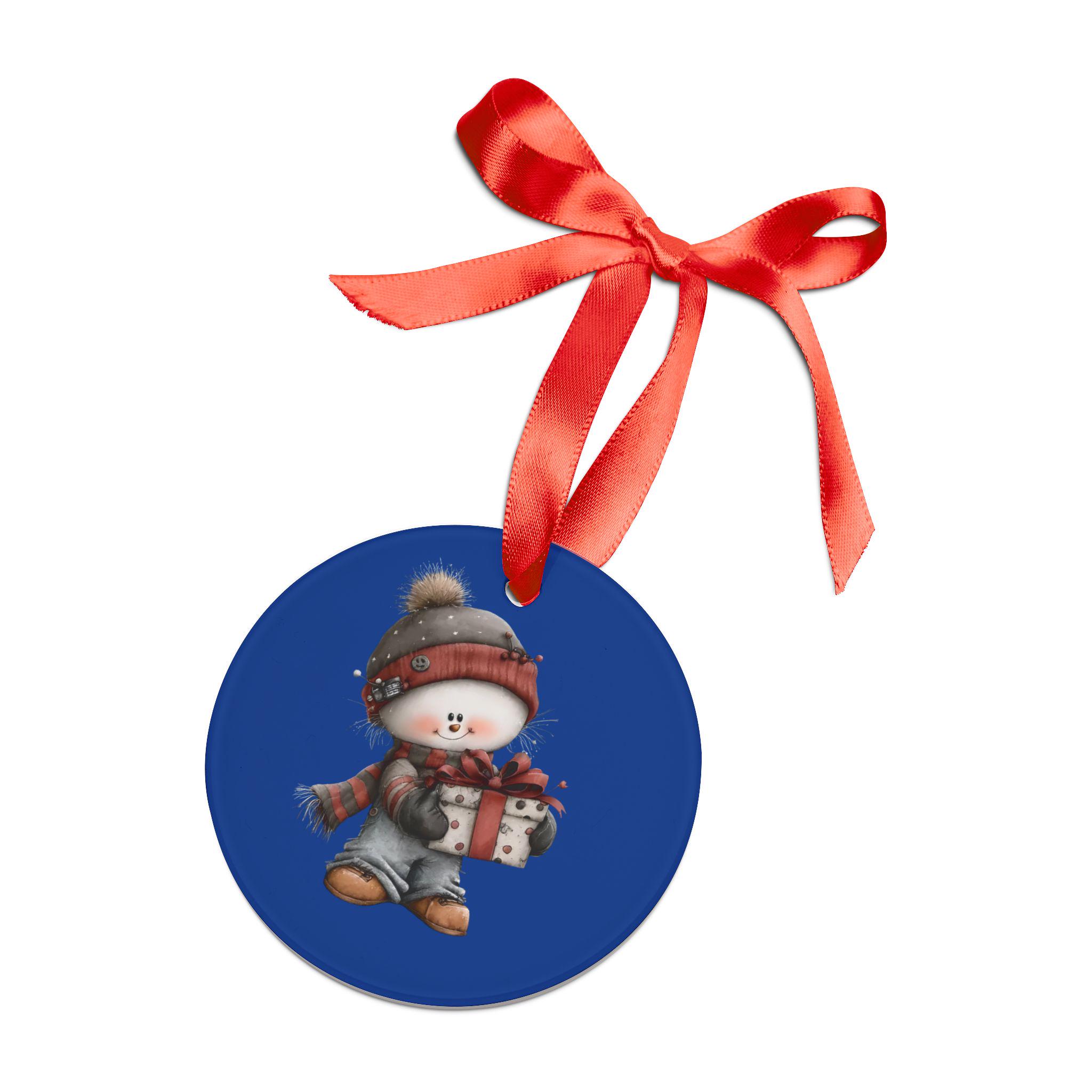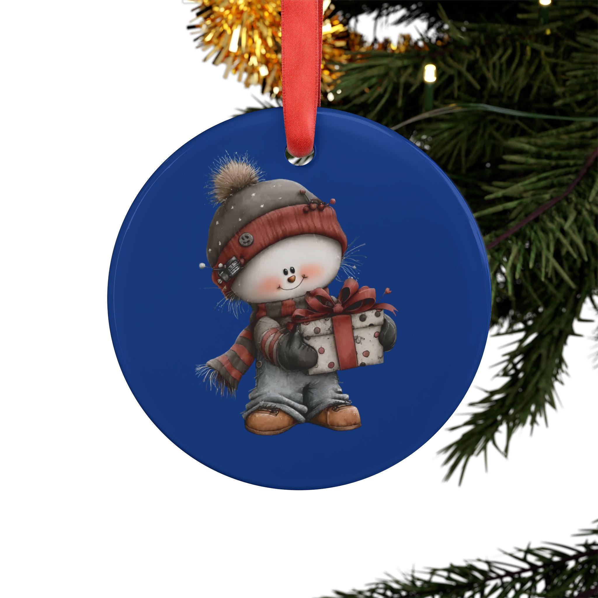 A glossy round acrylic ornament that catches the eye and tugs at warm holiday memories. The bright, all-over printed design is protected beneath a durable acrylic casing, preserving crisp, vibrant colors season after season. A cheerful snow-child illustration sits against a deep blue field, and a cheerful red satin ribbon is included for hanging on branches, door knobs, or as a keepsake tag. Lightweight but sturdy, it feels substantial in hand and resists fading and scratches — made to be taken out every year and passed along with stories and smiles.