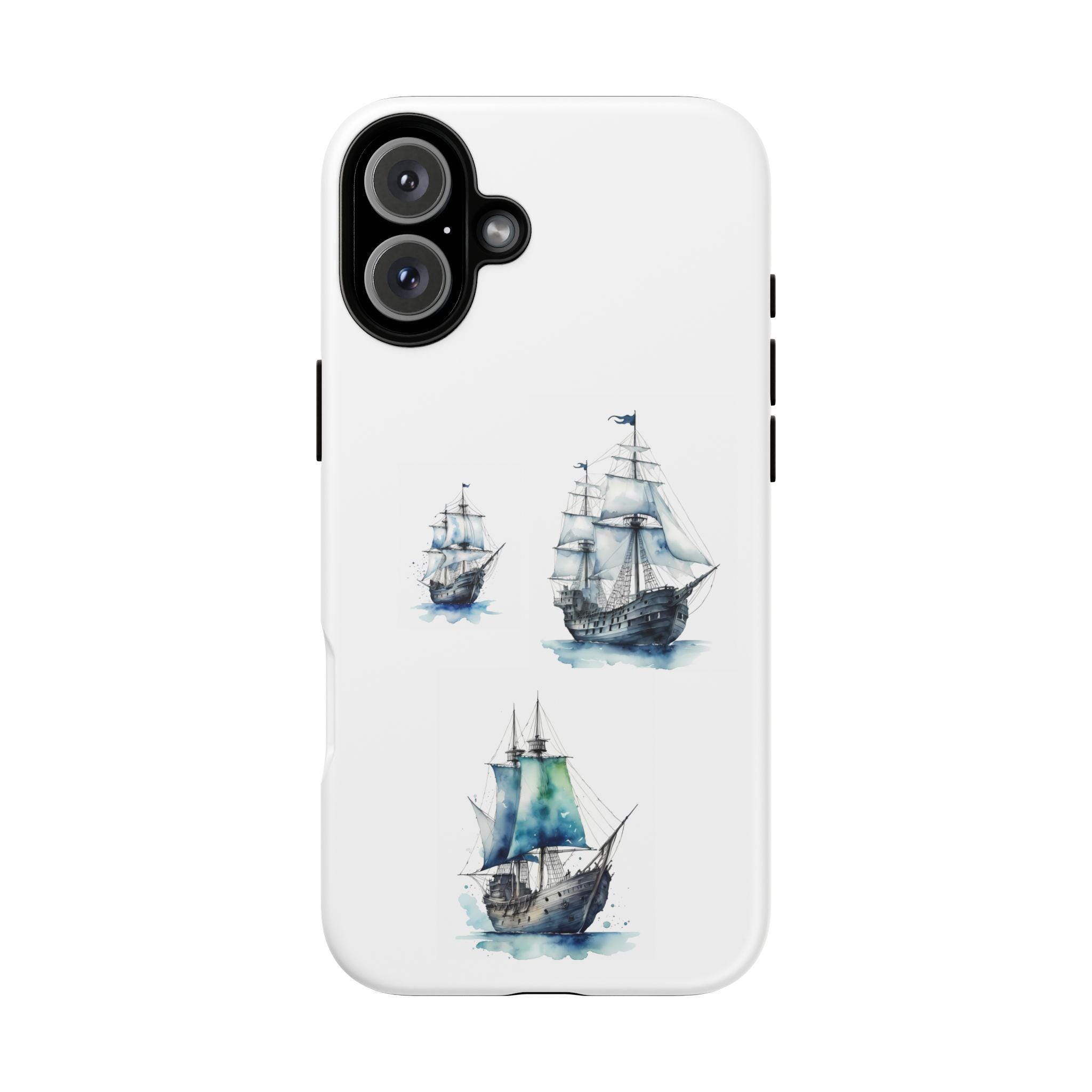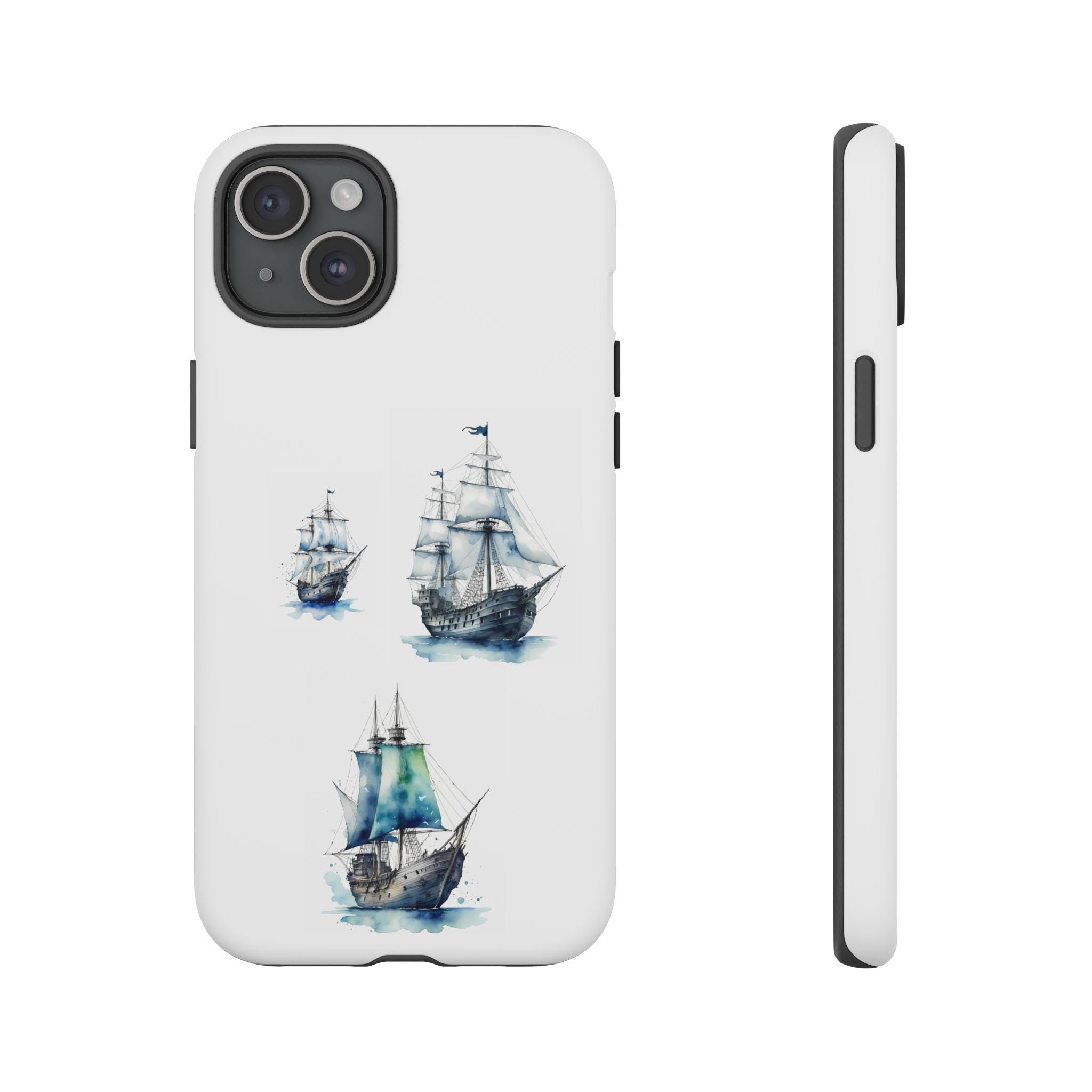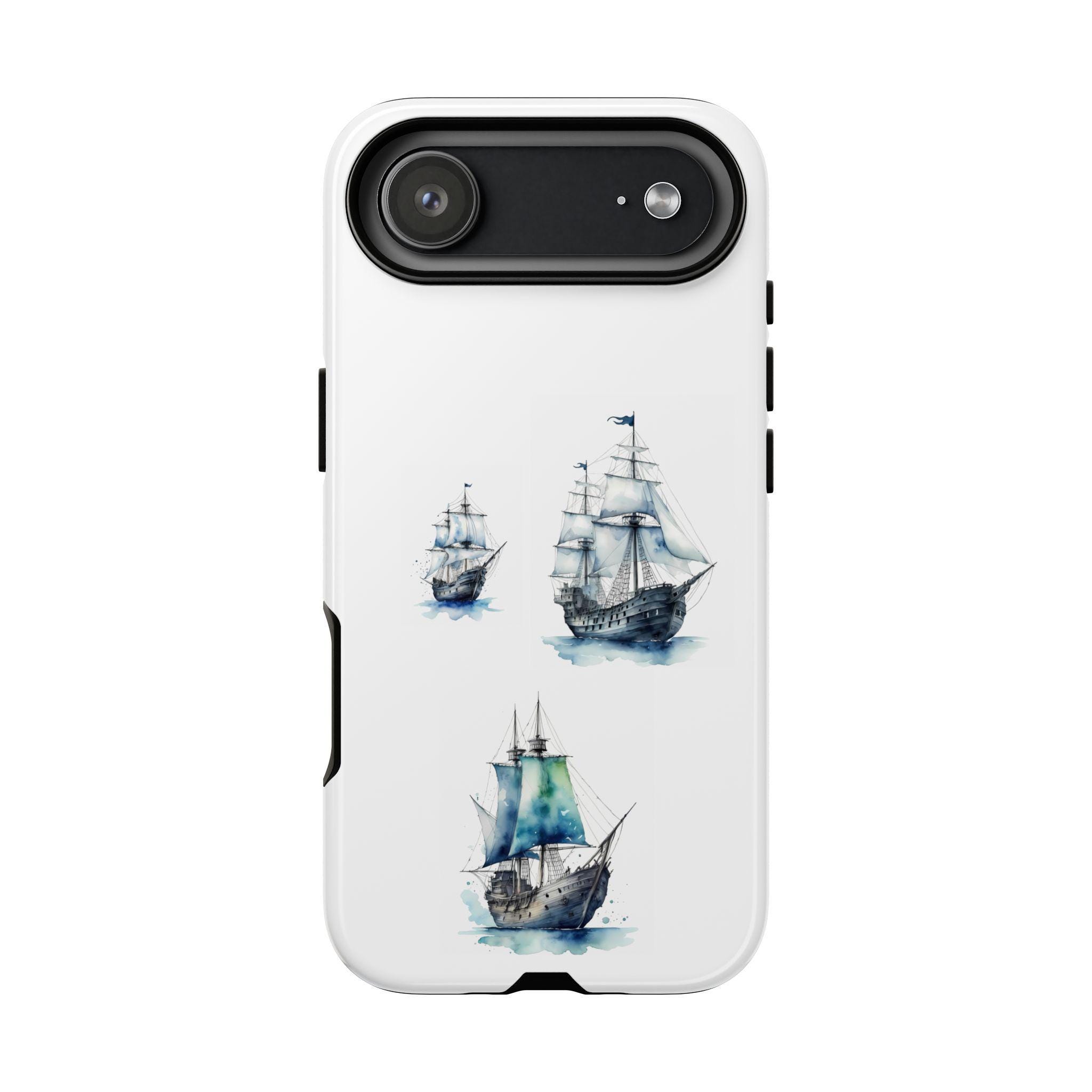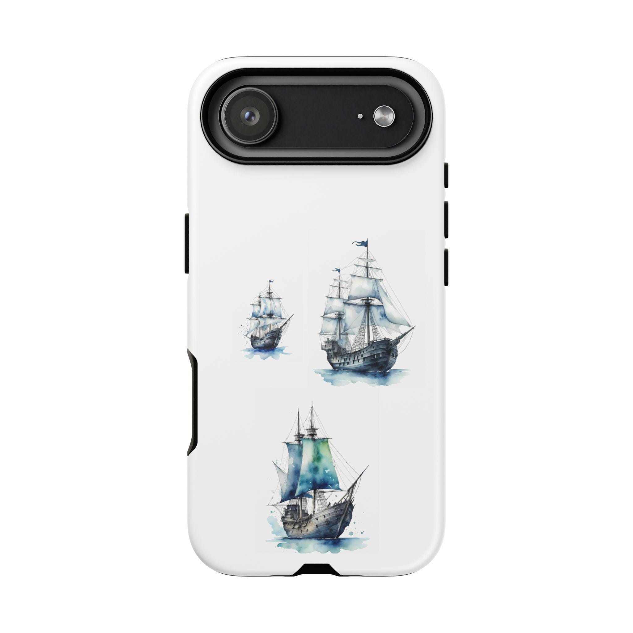 A slim, dual-layer protective phone case decorated with three watercolor sailing ships. The artwork’s soft blues and gentle brushstrokes give the case a quietly maritime feel — like a pocket-sized seascape that travels with you. The rigid polycarbonate shell and TPU silicone liner combine for shock absorption and edge protection, while the 3D wrap print keeps the image vibrant across the surface. Finished options in glossy or matte, clear port openings, and wireless-charging compatibility make this both functional and artful for everyday use.