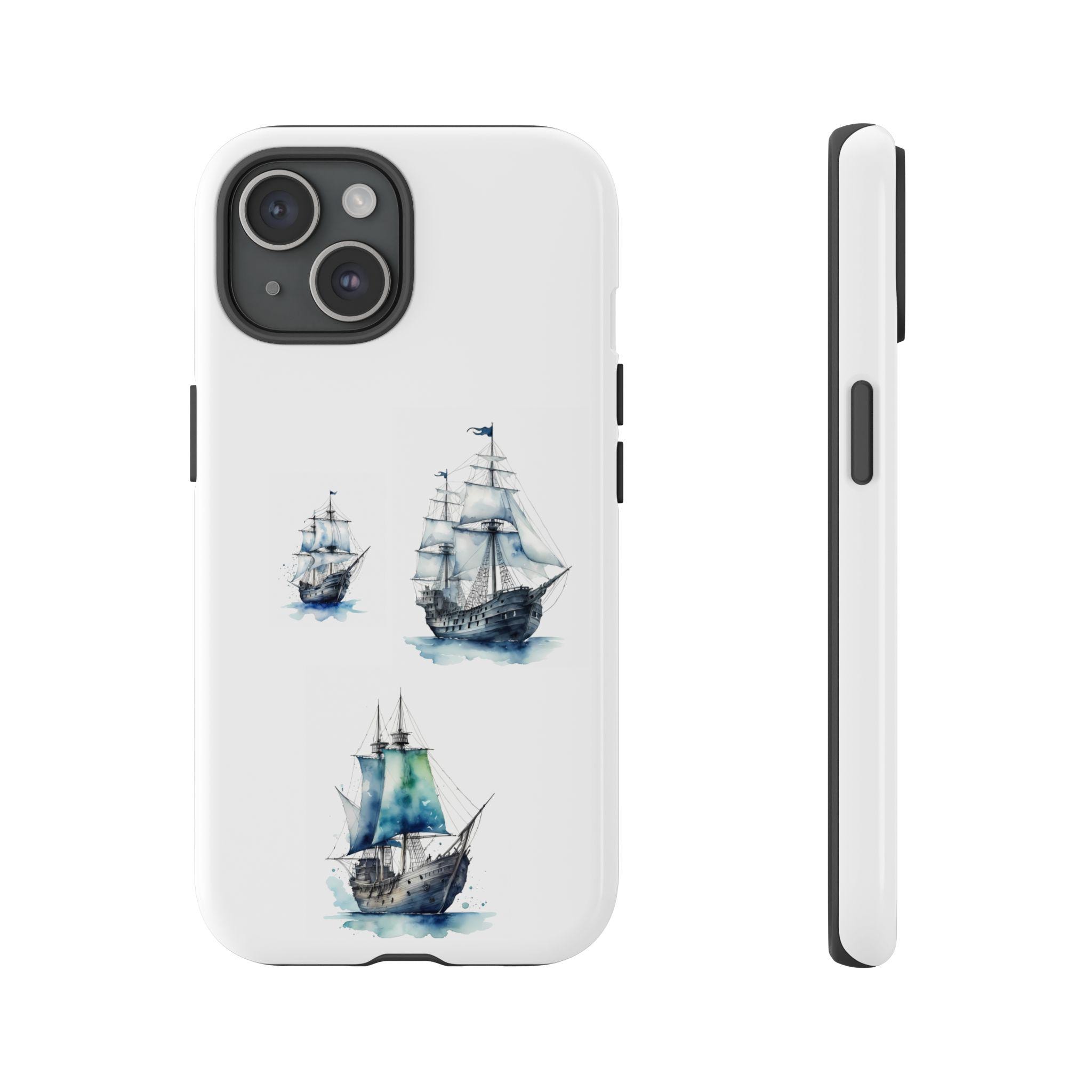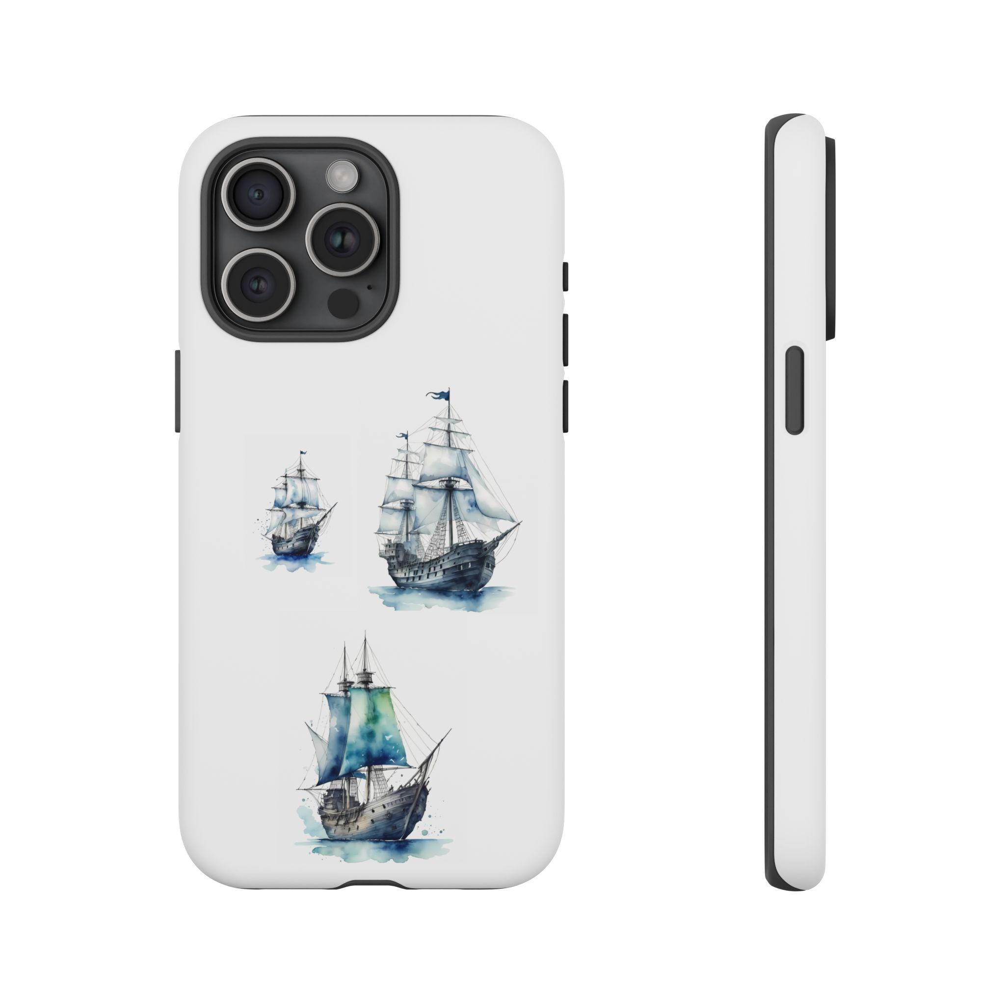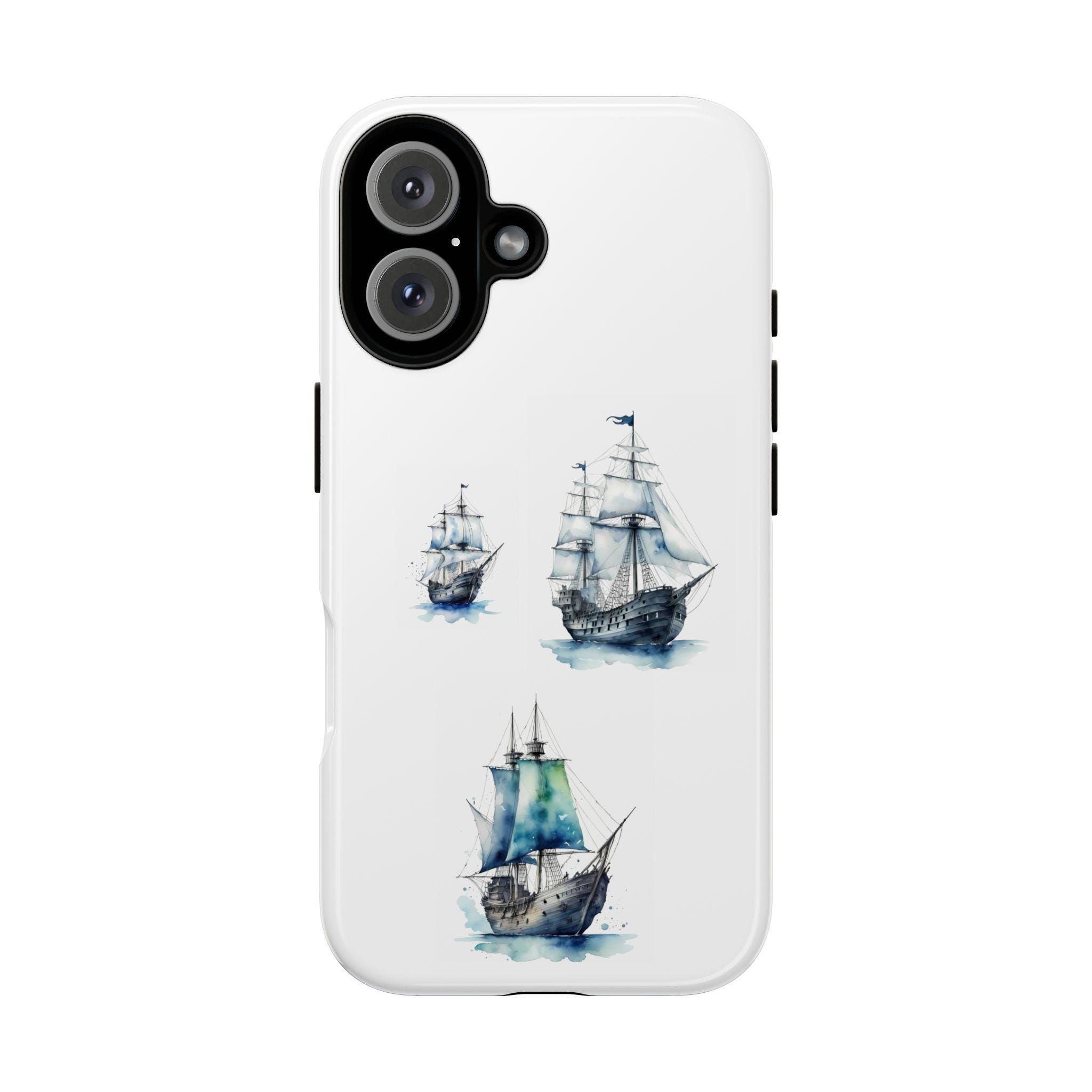 A slim, dual-layer protective phone case decorated with three watercolor sailing ships. The artwork’s soft blues and gentle brushstrokes give the case a quietly maritime feel — like a pocket-sized seascape that travels with you. The rigid polycarbonate shell and TPU silicone liner combine for shock absorption and edge protection, while the 3D wrap print keeps the image vibrant across the surface. Finished options in glossy or matte, clear port openings, and wireless-charging compatibility make this both functional and artful for everyday use.