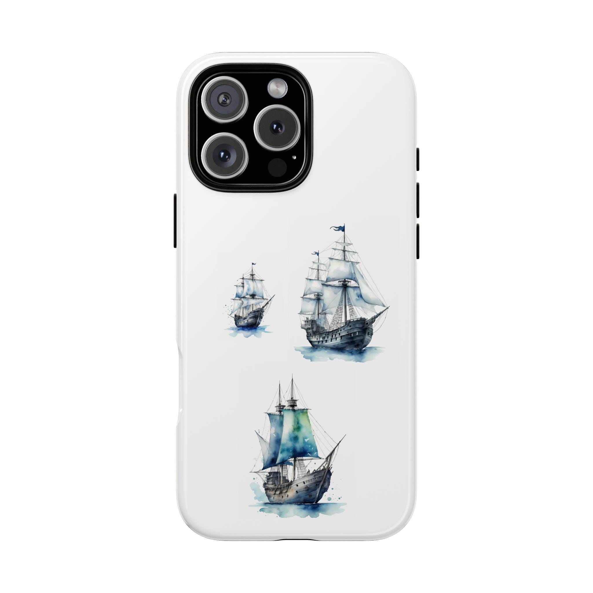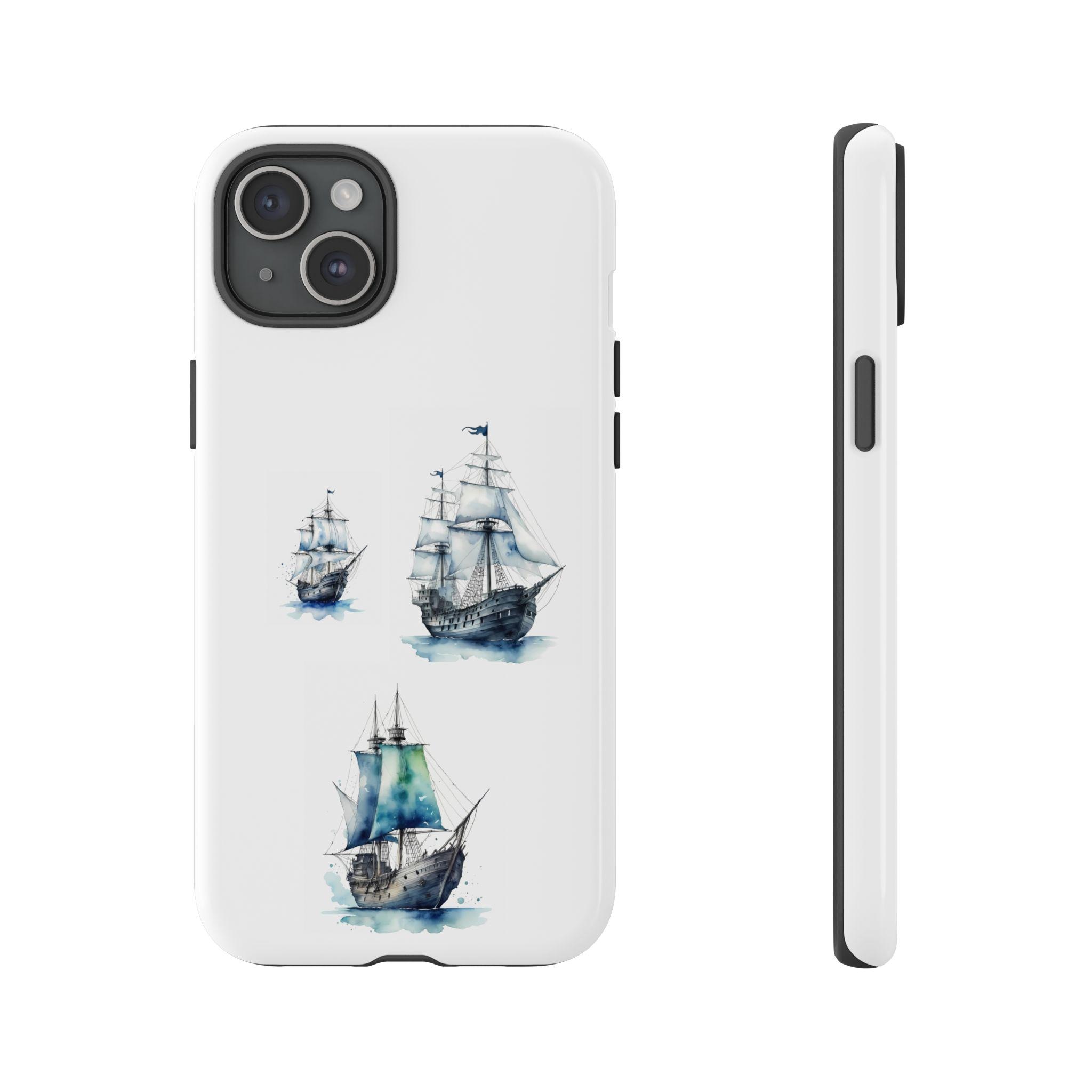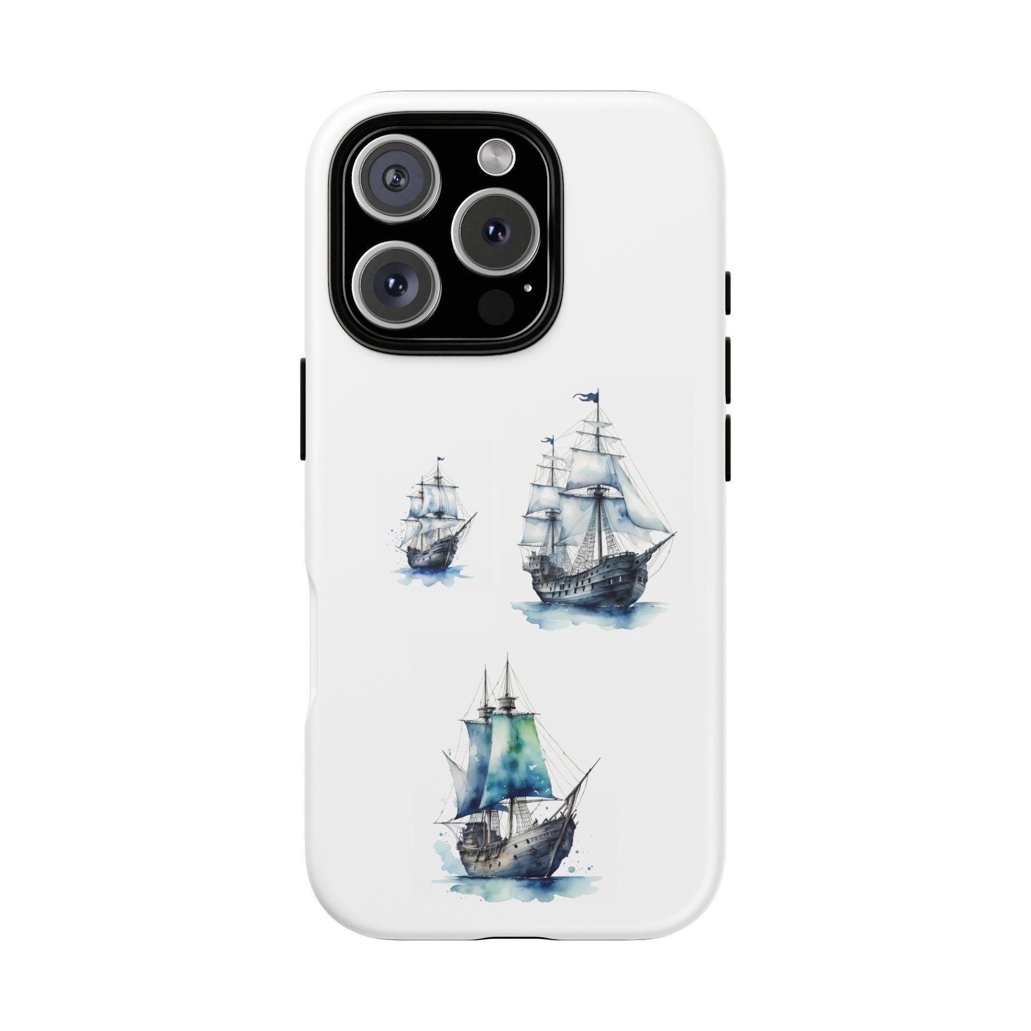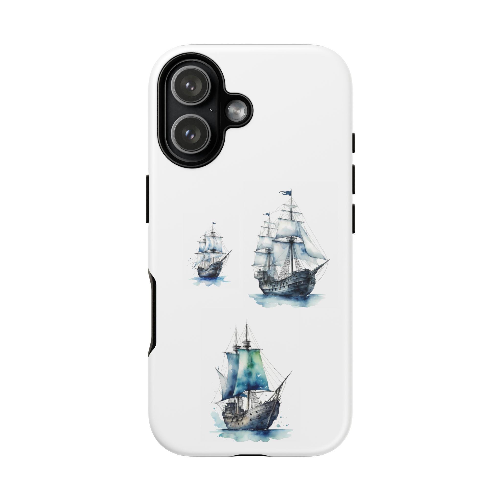 A slim, dual-layer protective phone case decorated with three watercolor sailing ships. The artwork’s soft blues and gentle brushstrokes give the case a quietly maritime feel — like a pocket-sized seascape that travels with you. The rigid polycarbonate shell and TPU silicone liner combine for shock absorption and edge protection, while the 3D wrap print keeps the image vibrant across the surface. Finished options in glossy or matte, clear port openings, and wireless-charging compatibility make this both functional and artful for everyday use.