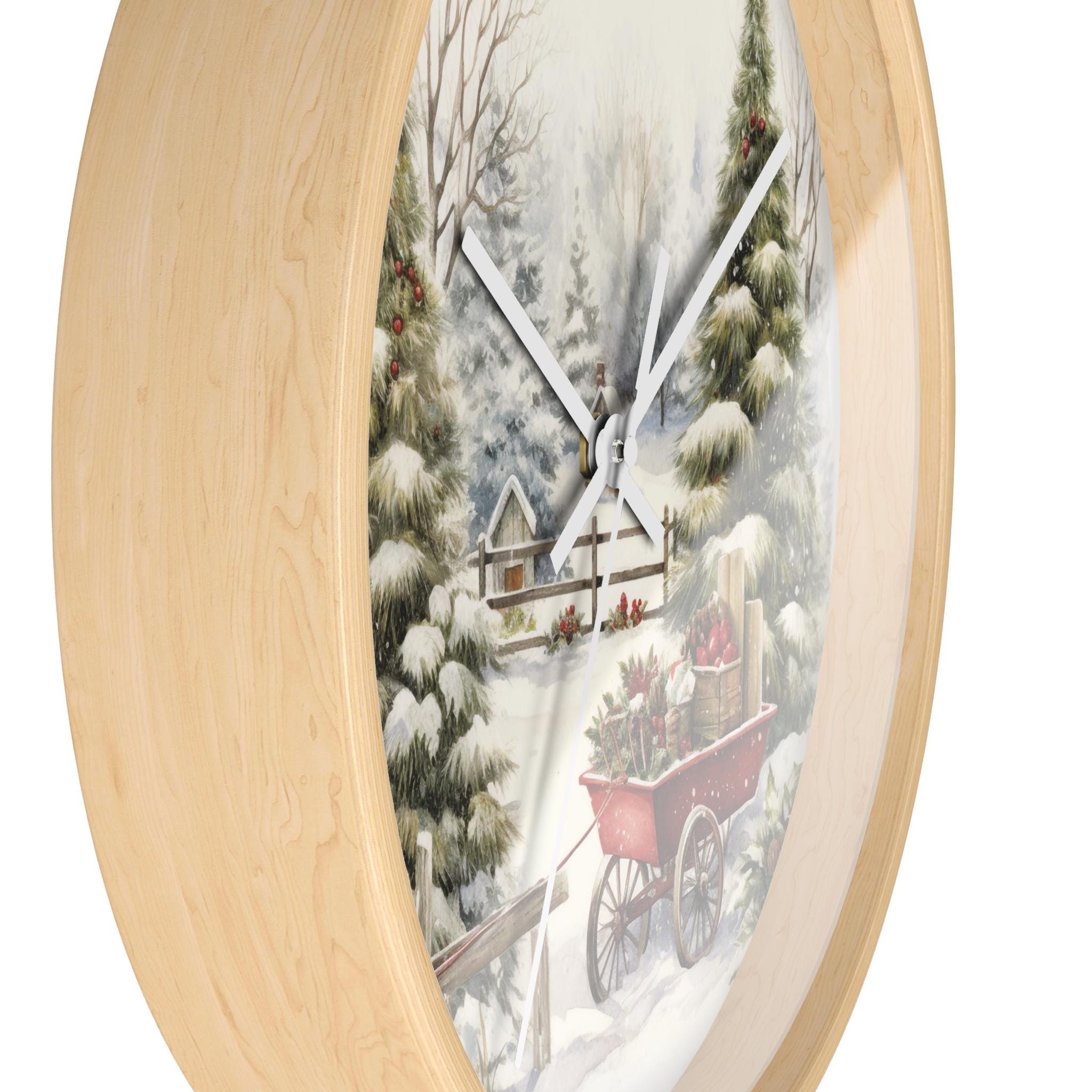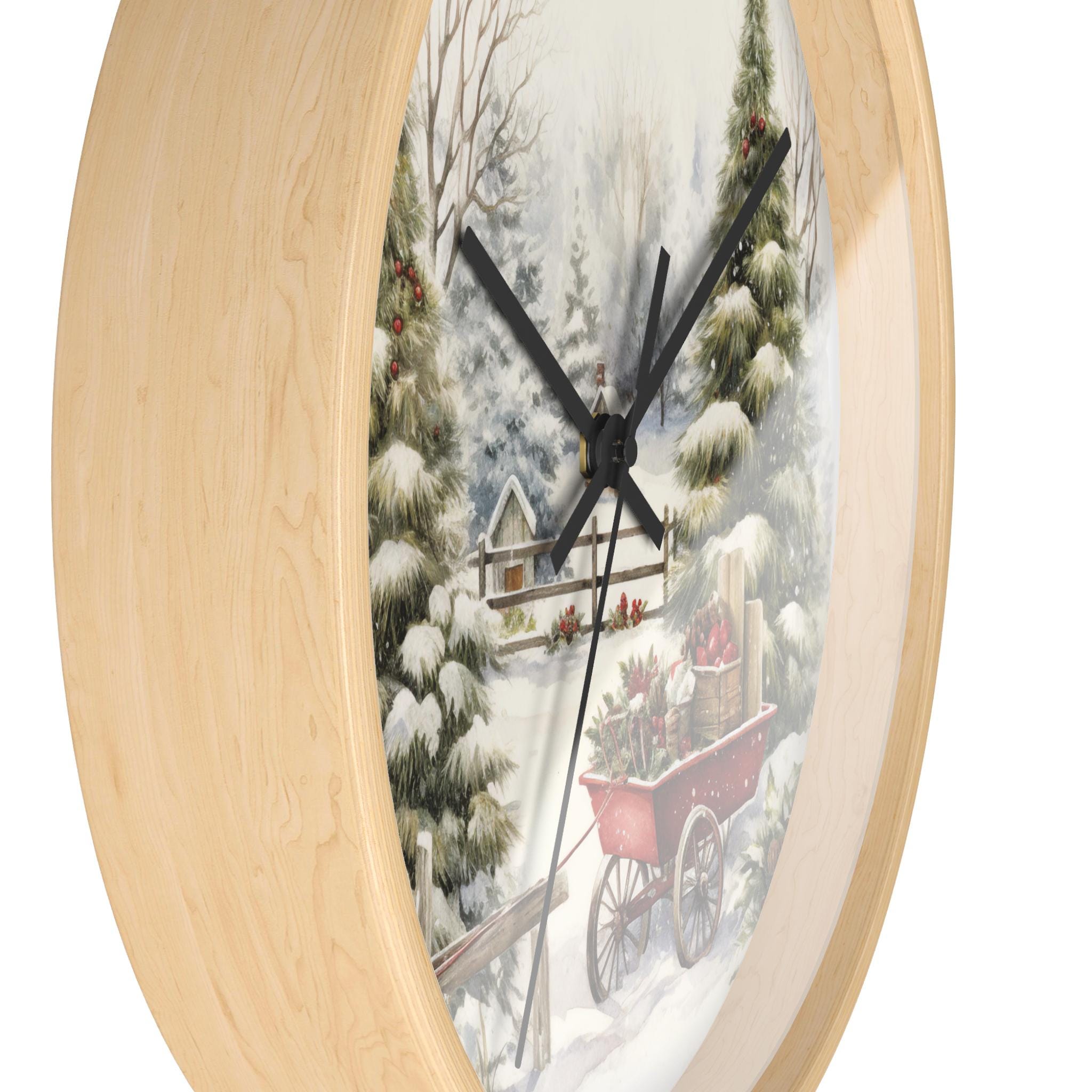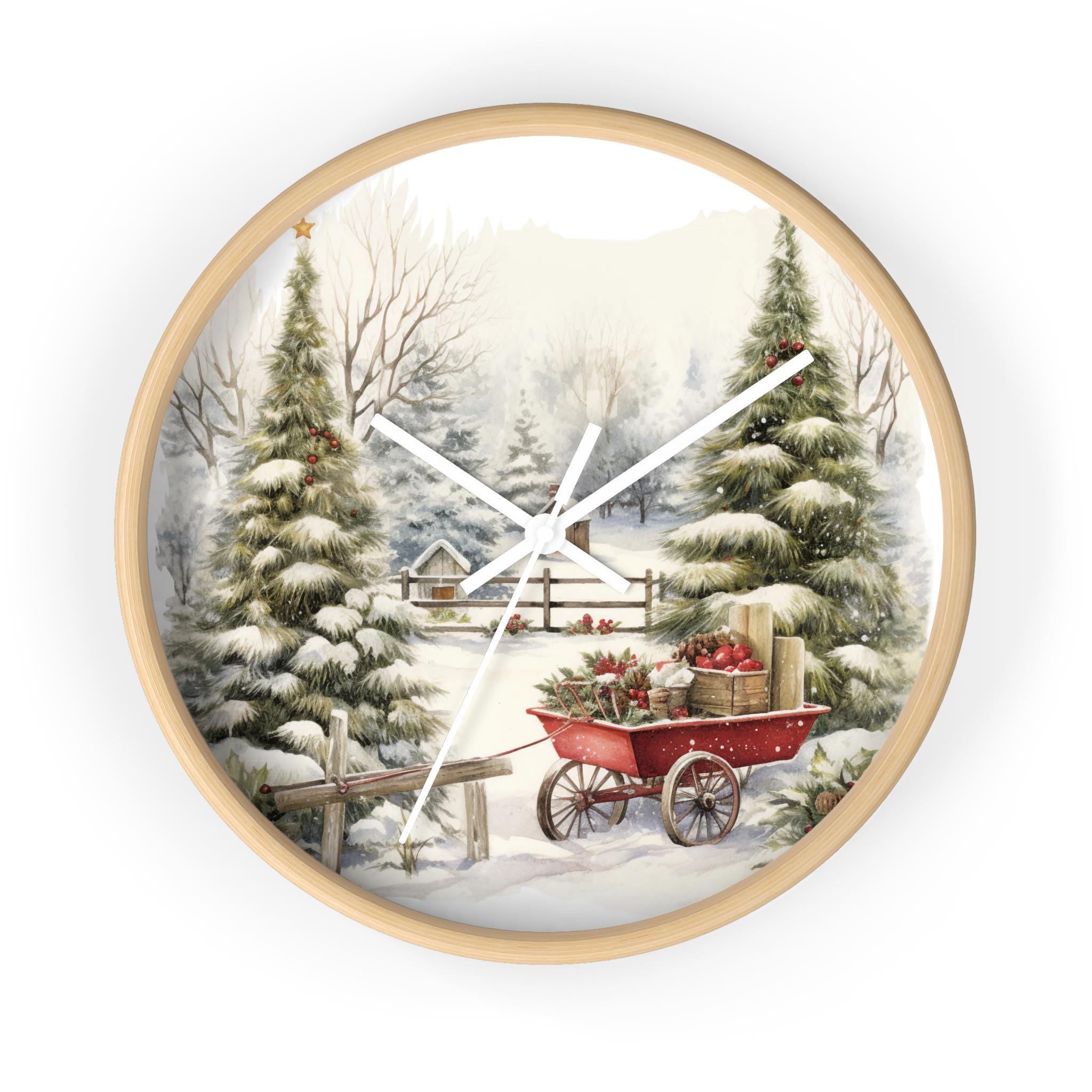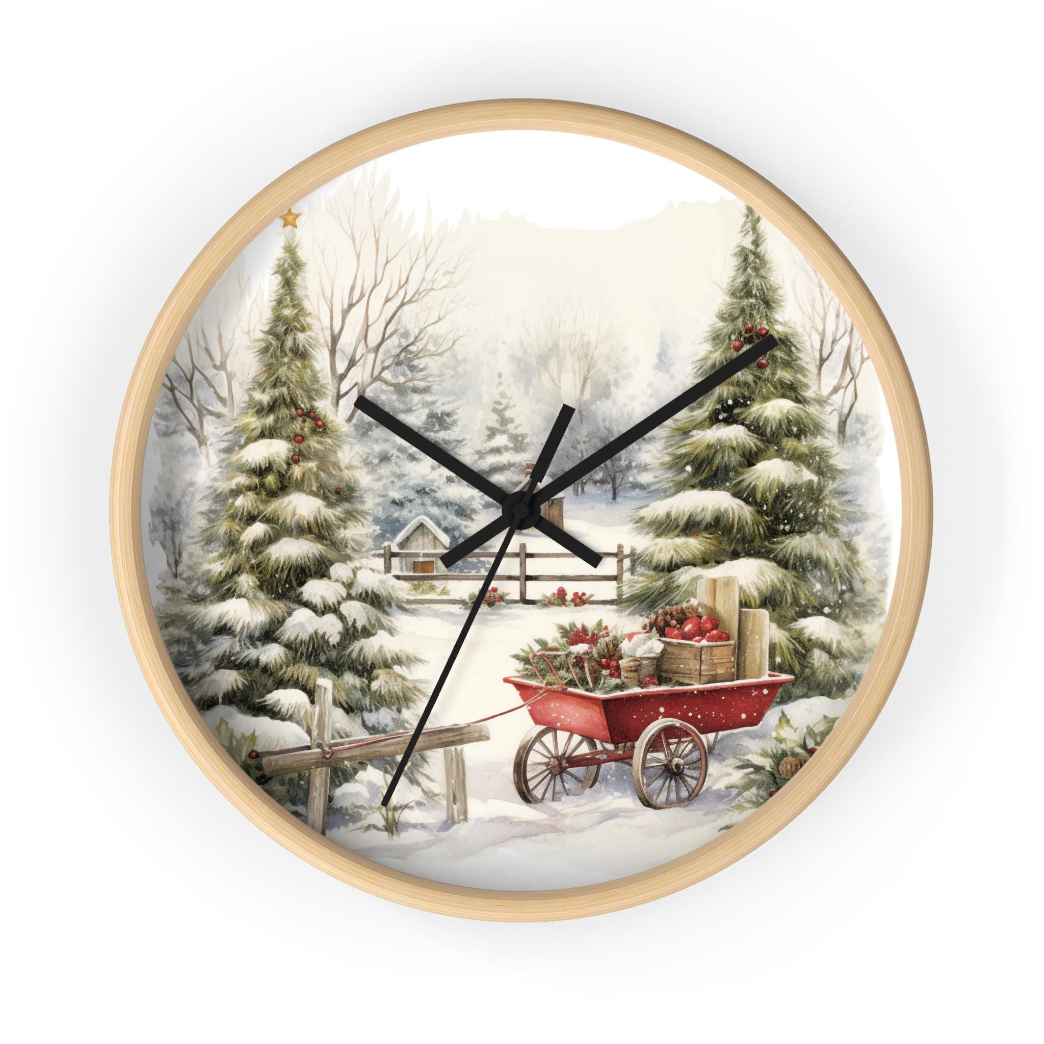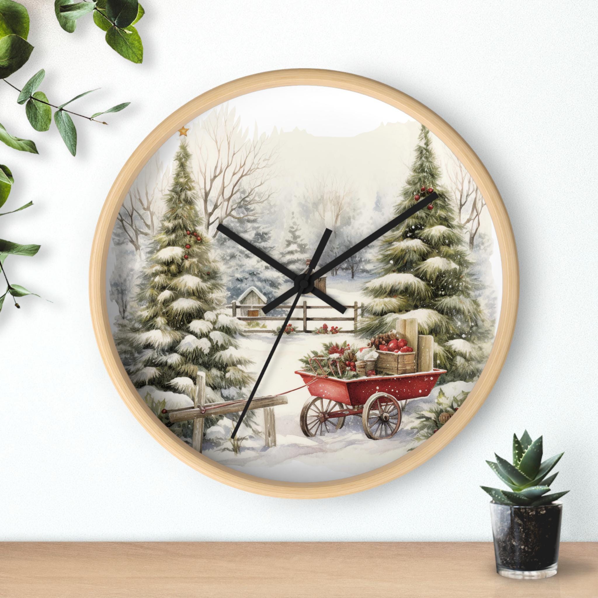 Soft snow muffles the yard as a red wagon sits brimful with evergreens and berries — a quiet slice of winter captured on a warm wooden clock face. This 10" wall clock brings that gentle, nostalgic scene into cozy kitchens, entryways, or cottage nooks. The natural wood frame and clear plexiglass face let the painterly details breathe, while a silent mechanism keeps ticking hushed during slow mornings and holiday gatherings. Hang it easily with the pre-installed hook and add a steady, comforting presence that feels like a familiar snowfall and a stroll down a tree-lined lane.