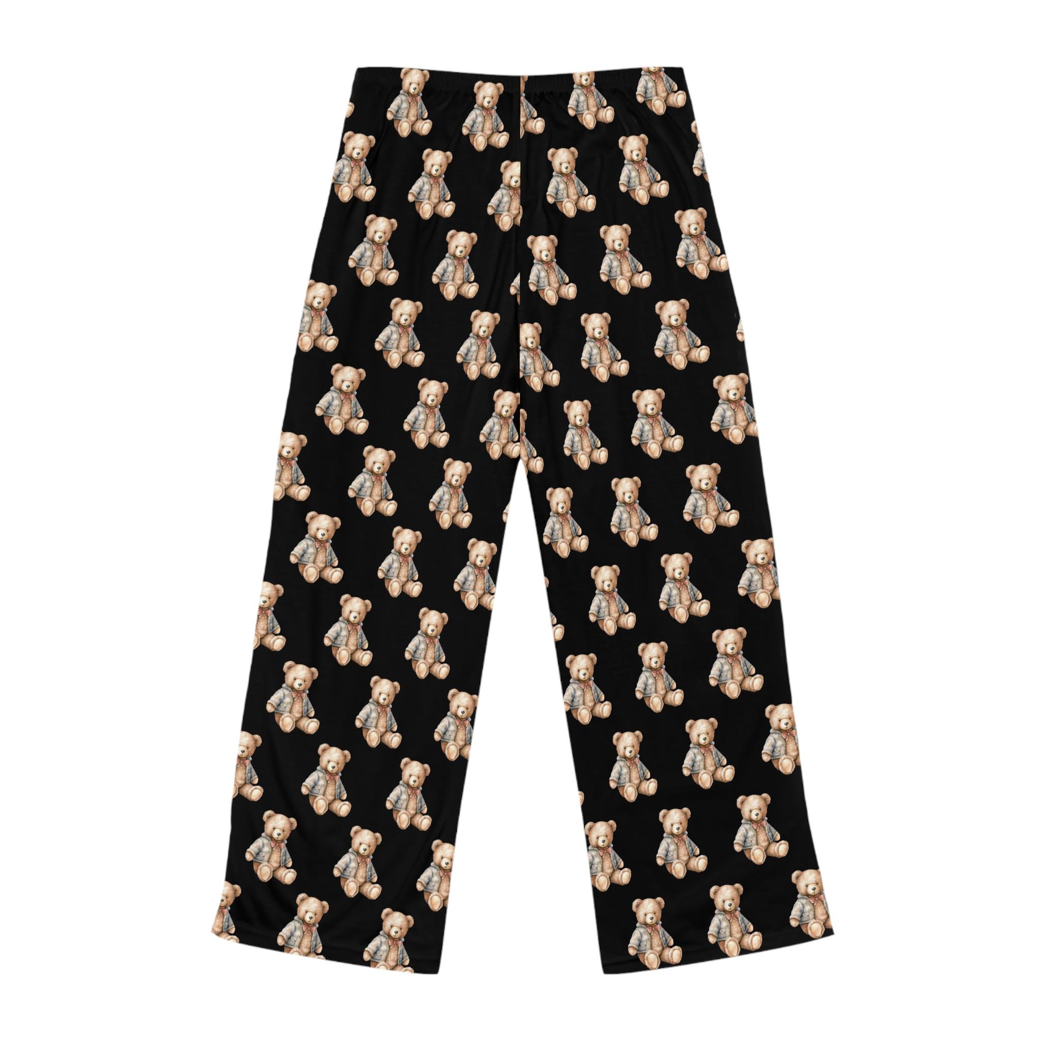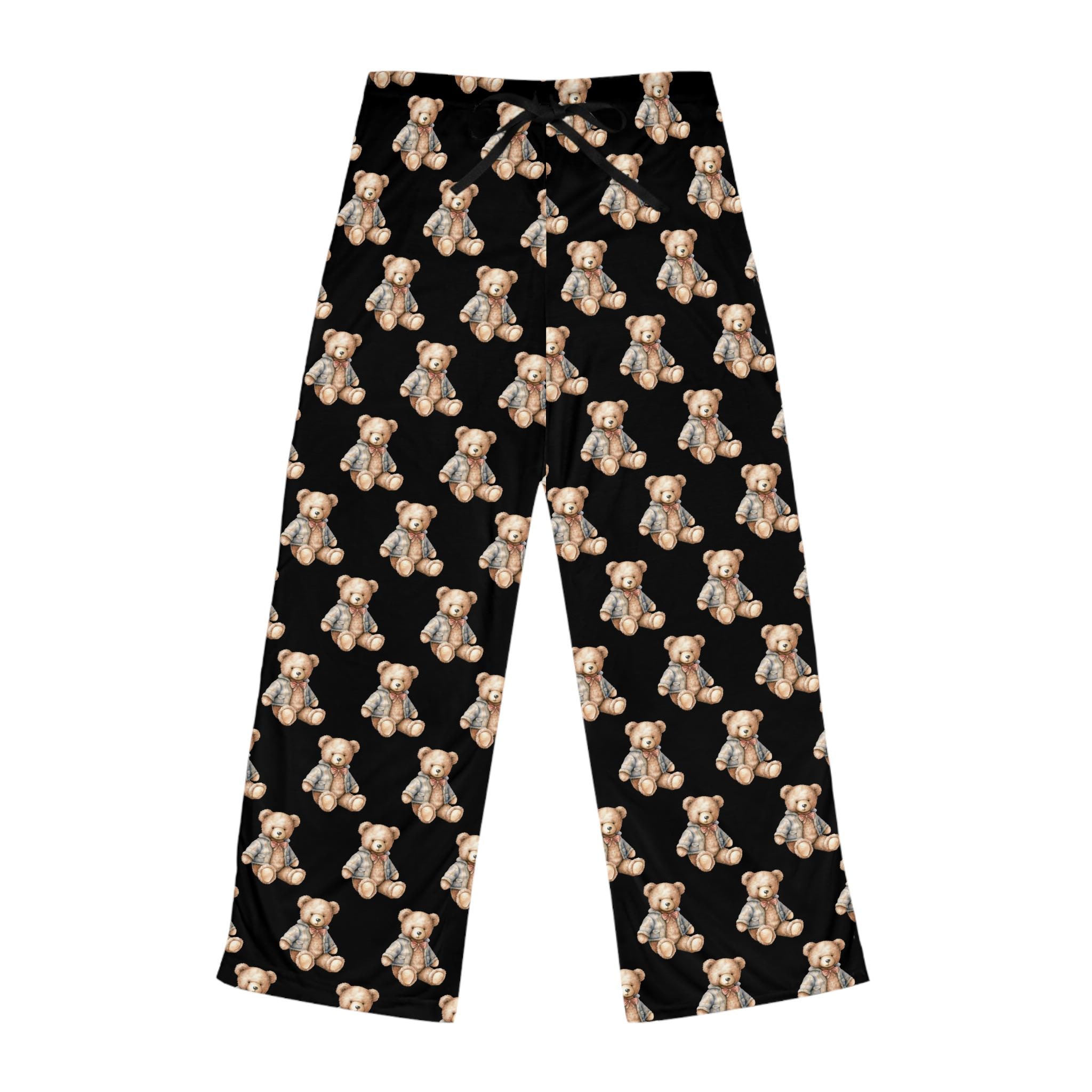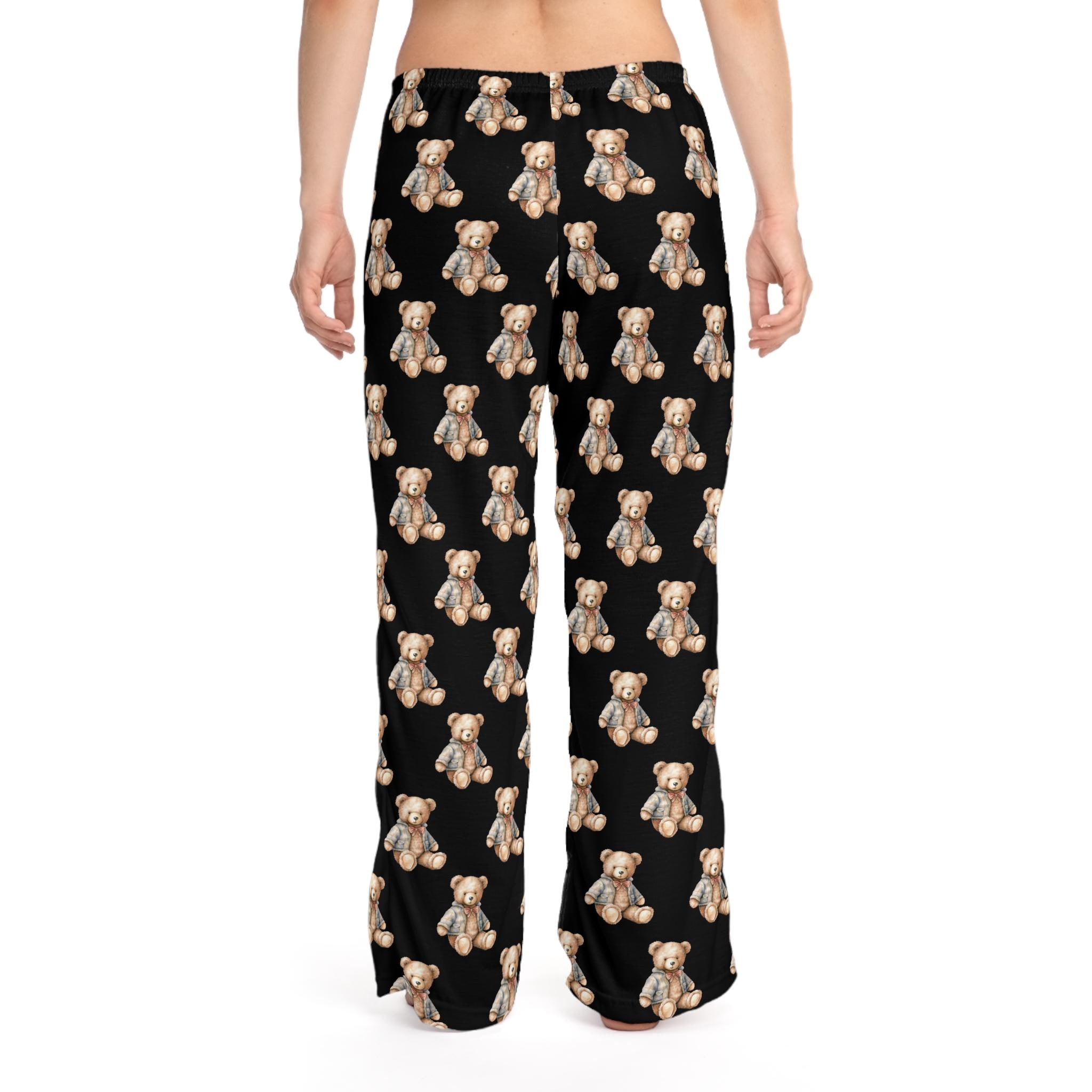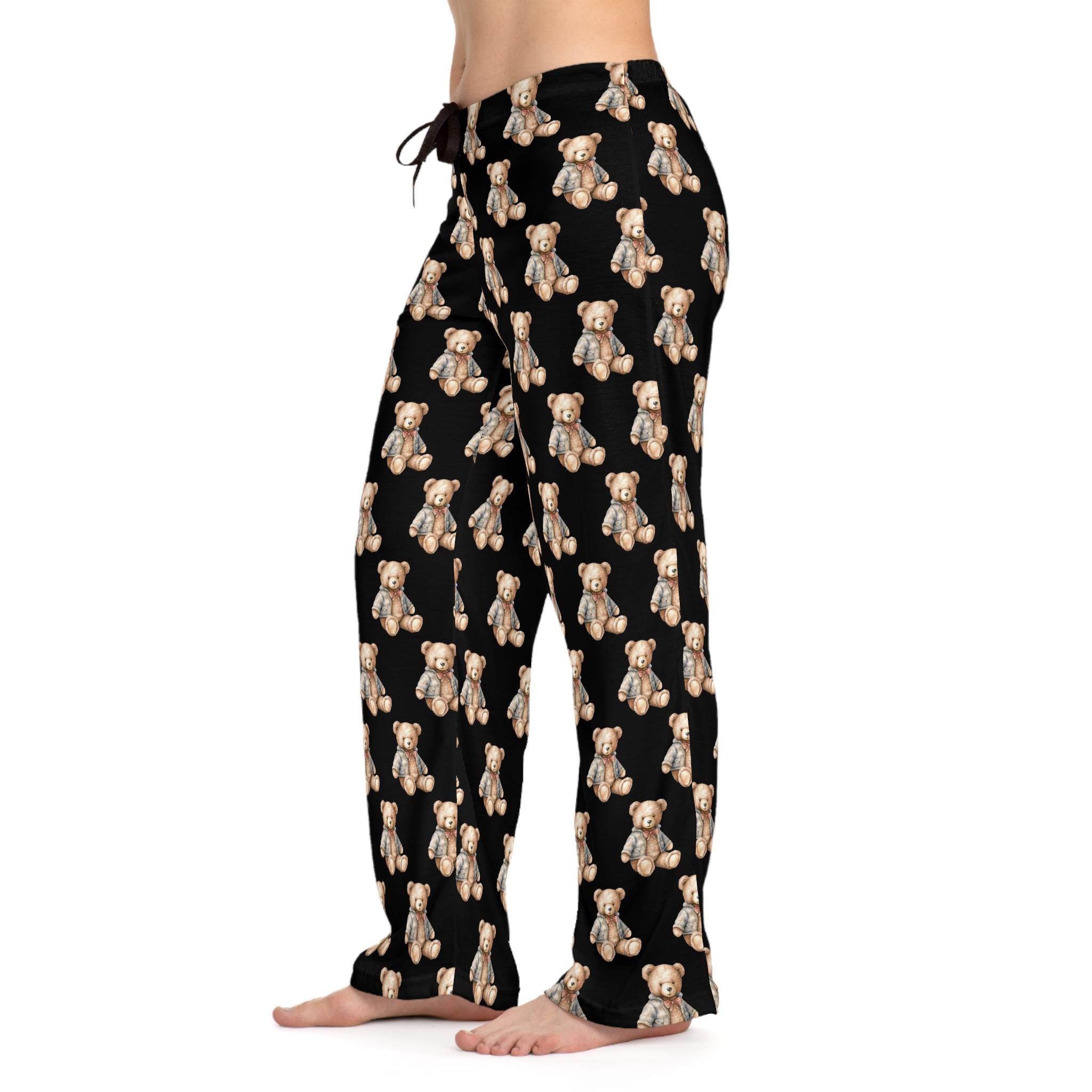 These cozy Women's Pajama Pants feature a cute Teddy Bear Pattern in a black all-over print. Made from soft 100% polyester jersey, they provide a relaxed comfort fit perfect for lounging or sleeping. The drawstring waist allows for adjustable sizing, and the double needle stitching ensures durability. Ideal for women who love cute and comfy loungewear, these pants are great for pajama parties, sleepovers, and cozy nights in.