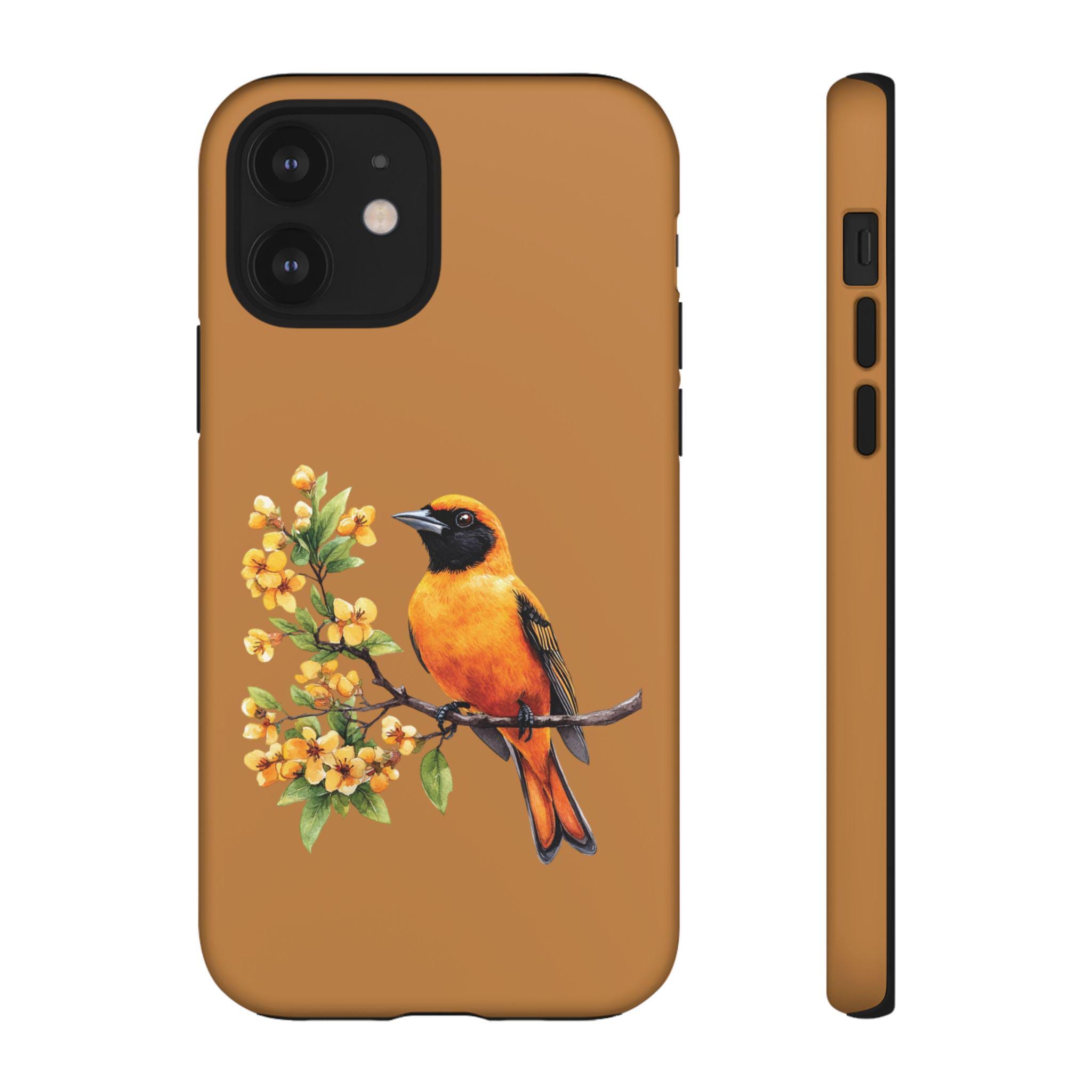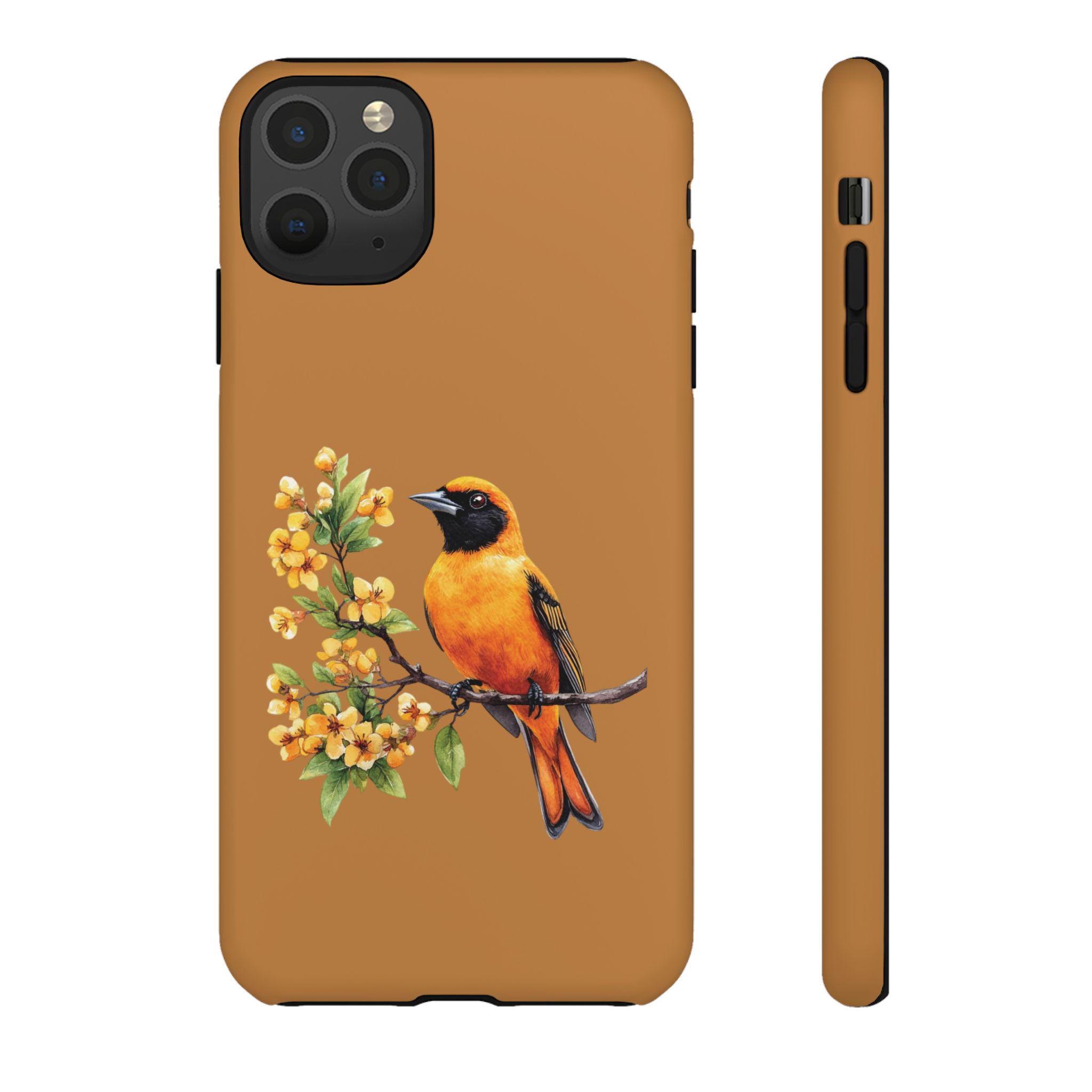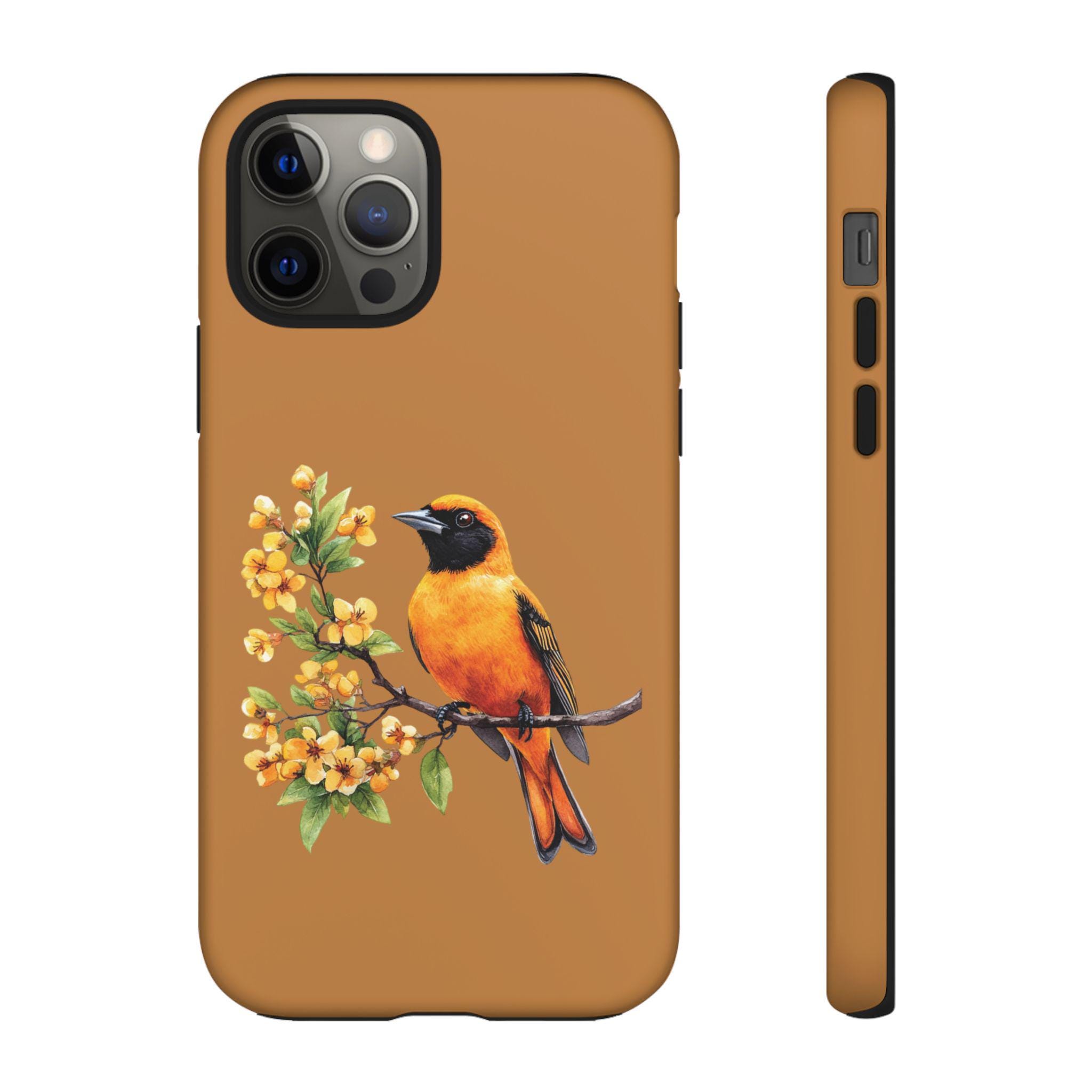 A slim, protective phone case that brings a warm, natural mood to your daily carry. The rich camel background frames a hand-painted style oriole perched on a flowering branch, giving a quiet nod to early-morning gardens and slow coffee rituals. The dual-layer construction cushions shocks while a glossy or matte surface keeps the artwork vivid; clear port openings and wireless charging compatibility let you use your phone without removing the case. Small care steps—avoid high-alcohol liquids, heavy sun exposure, and lotions—help the print stay true over time.