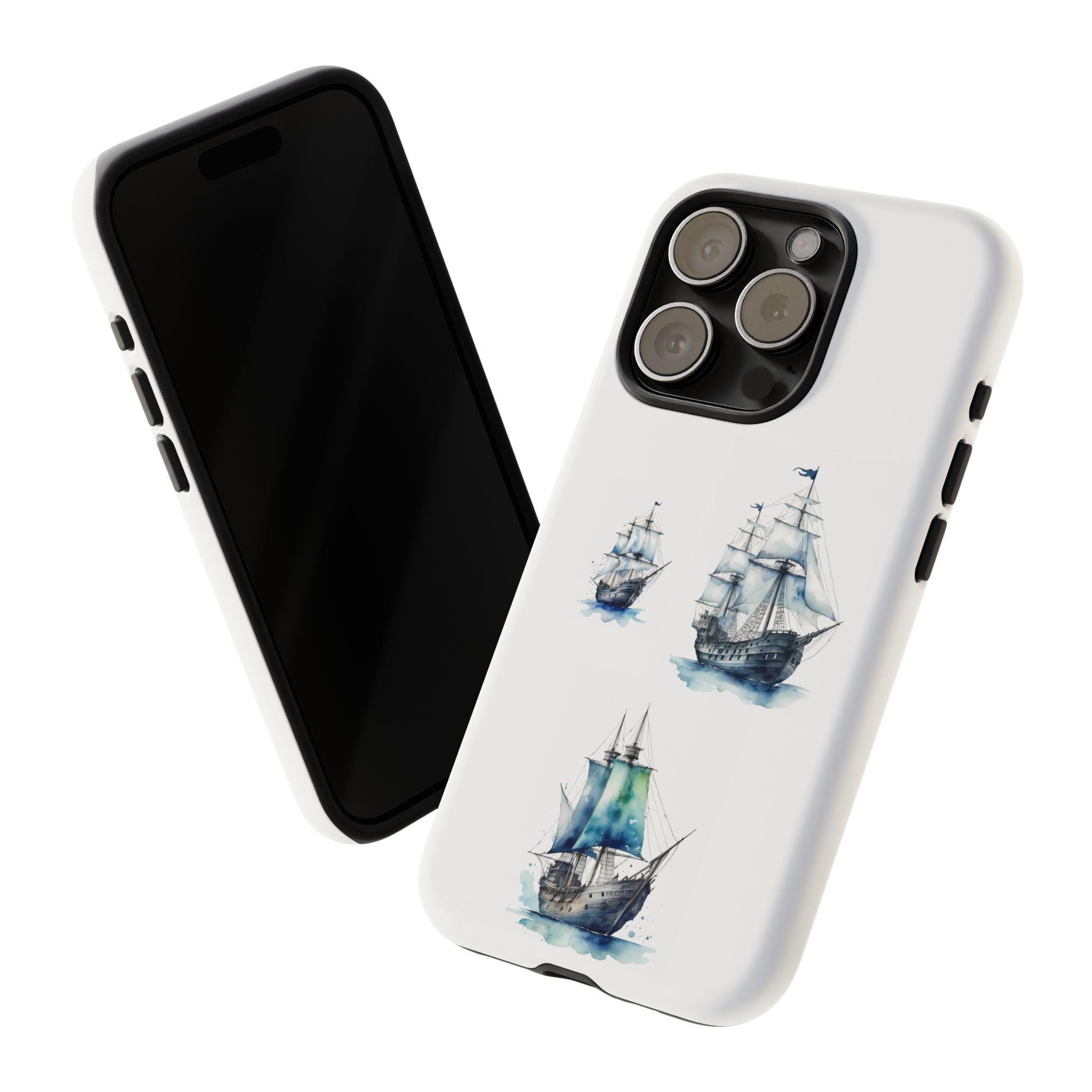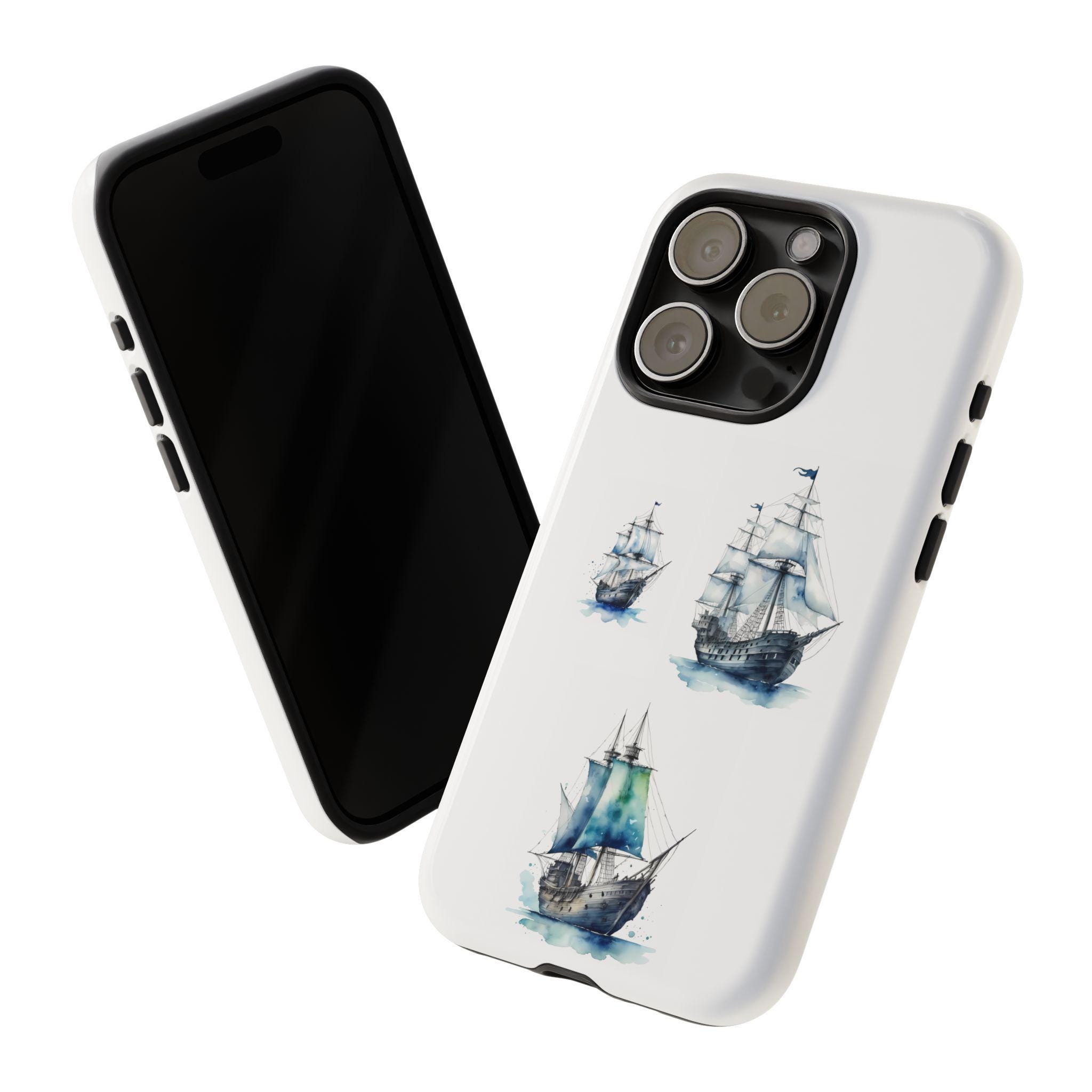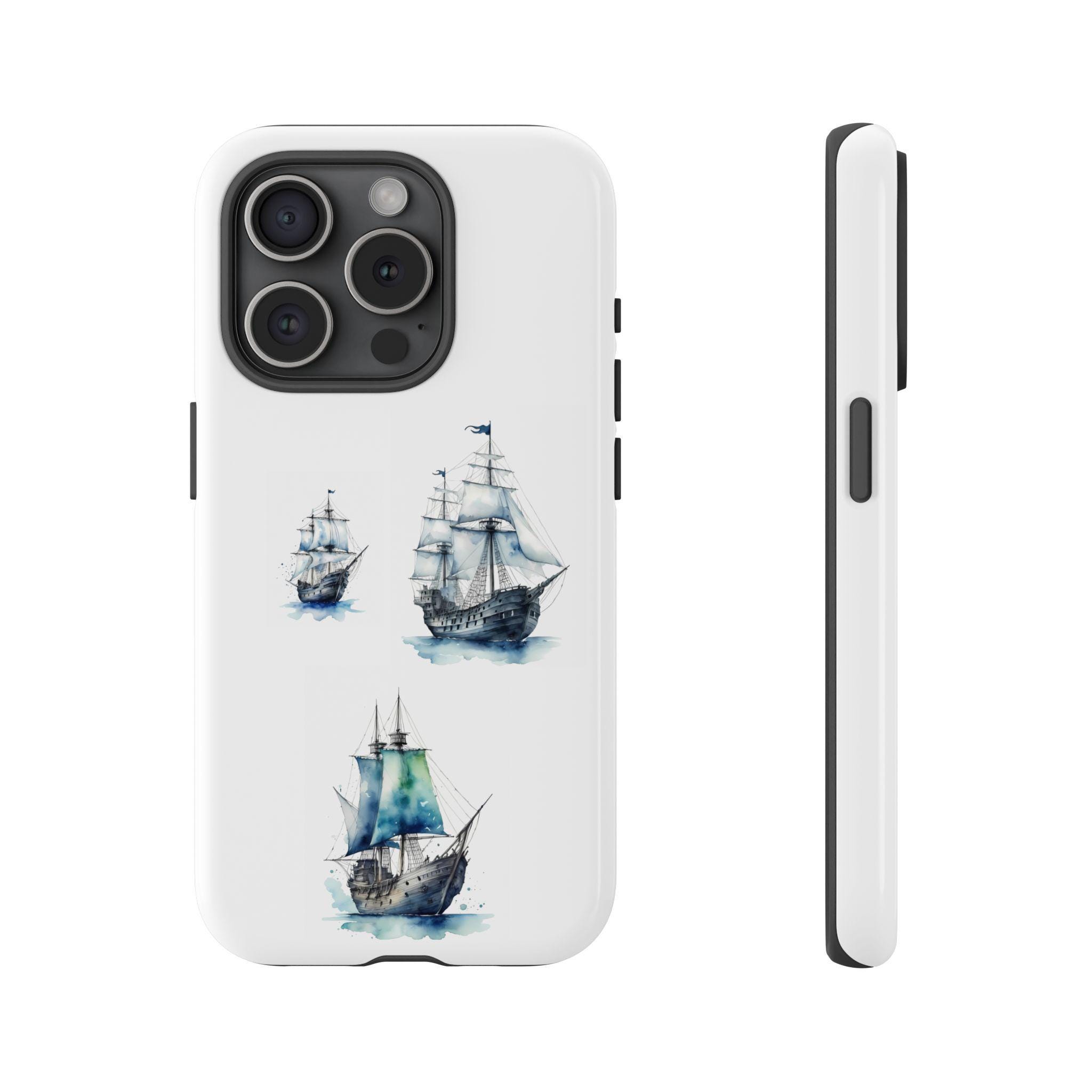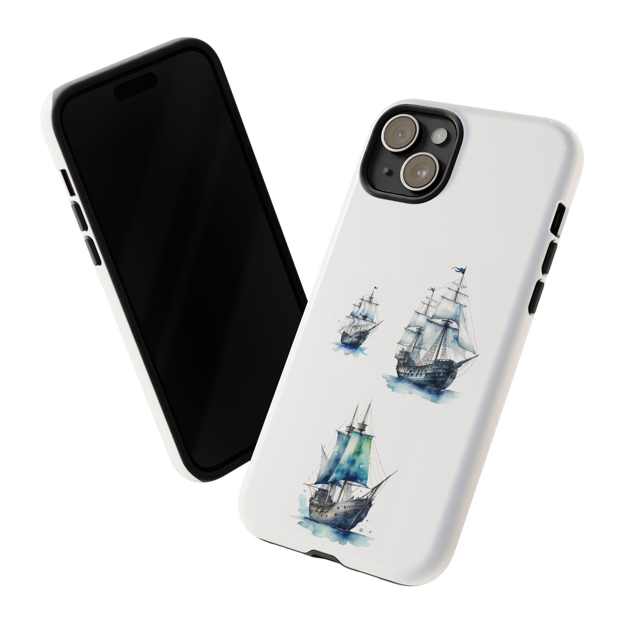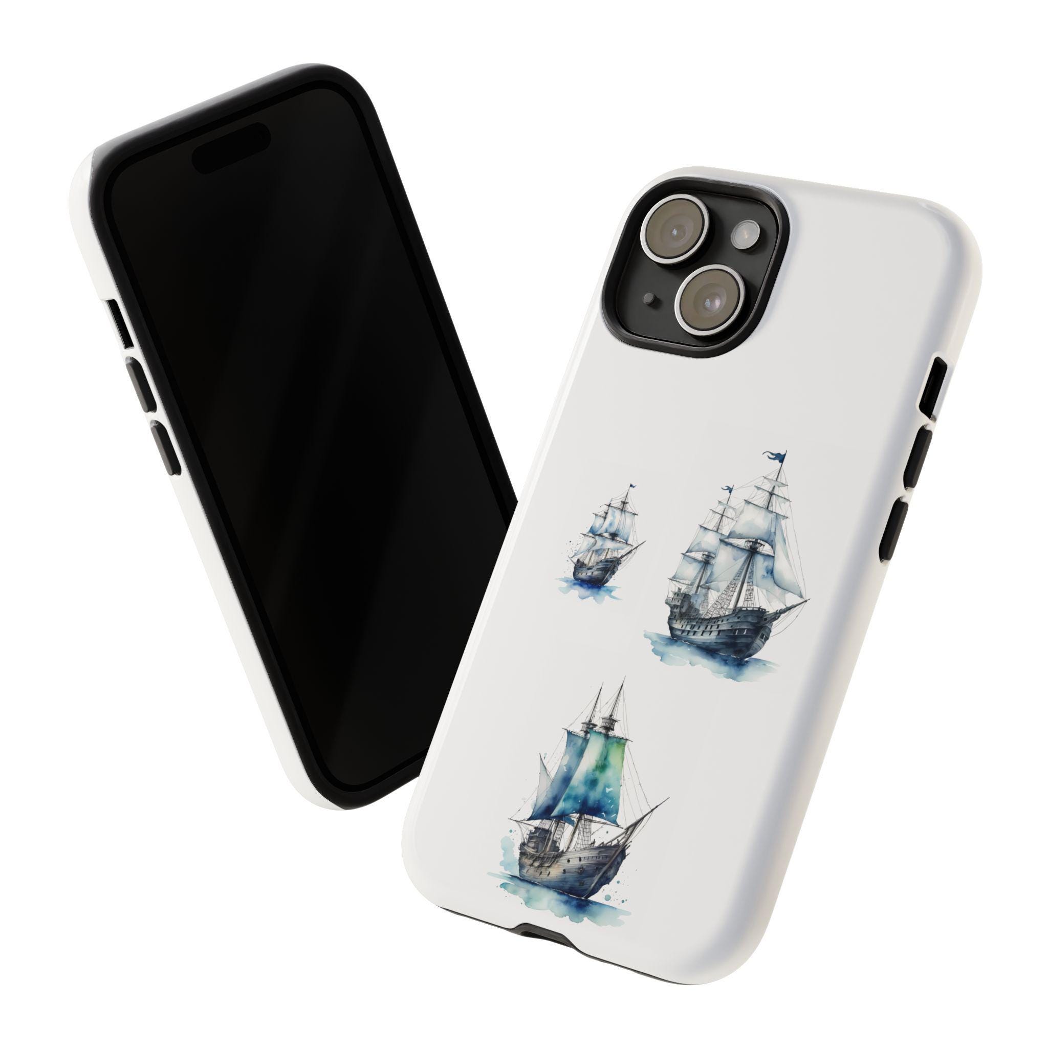 A slim, dual-layer protective phone case decorated with three watercolor sailing ships. The artwork’s soft blues and gentle brushstrokes give the case a quietly maritime feel — like a pocket-sized seascape that travels with you. The rigid polycarbonate shell and TPU silicone liner combine for shock absorption and edge protection, while the 3D wrap print keeps the image vibrant across the surface. Finished options in glossy or matte, clear port openings, and wireless-charging compatibility make this both functional and artful for everyday use.