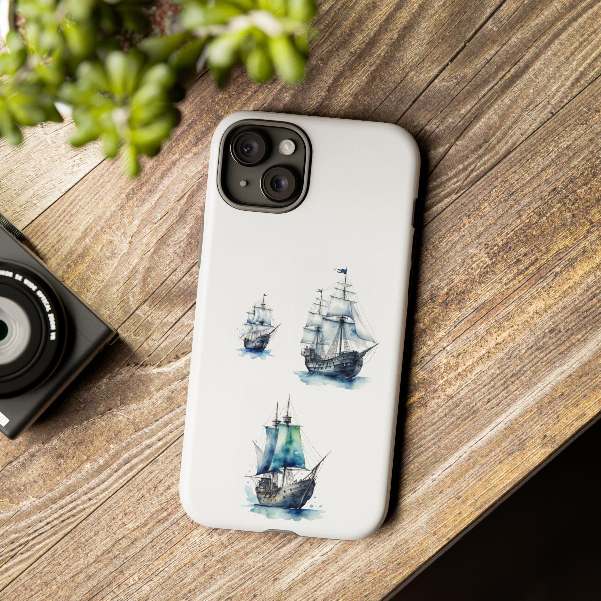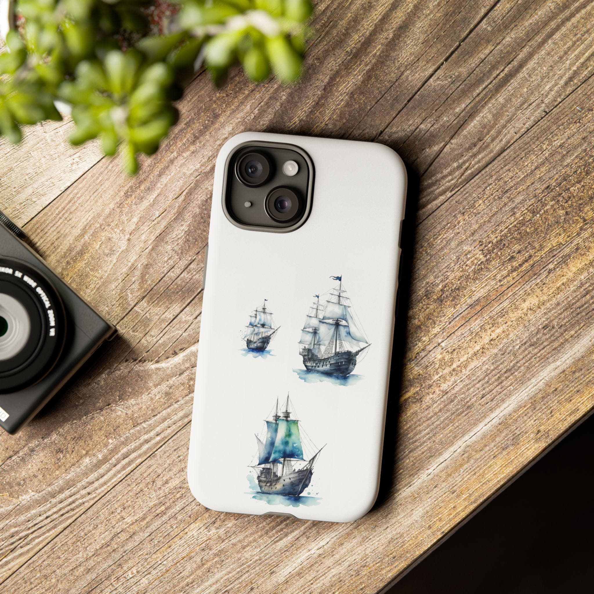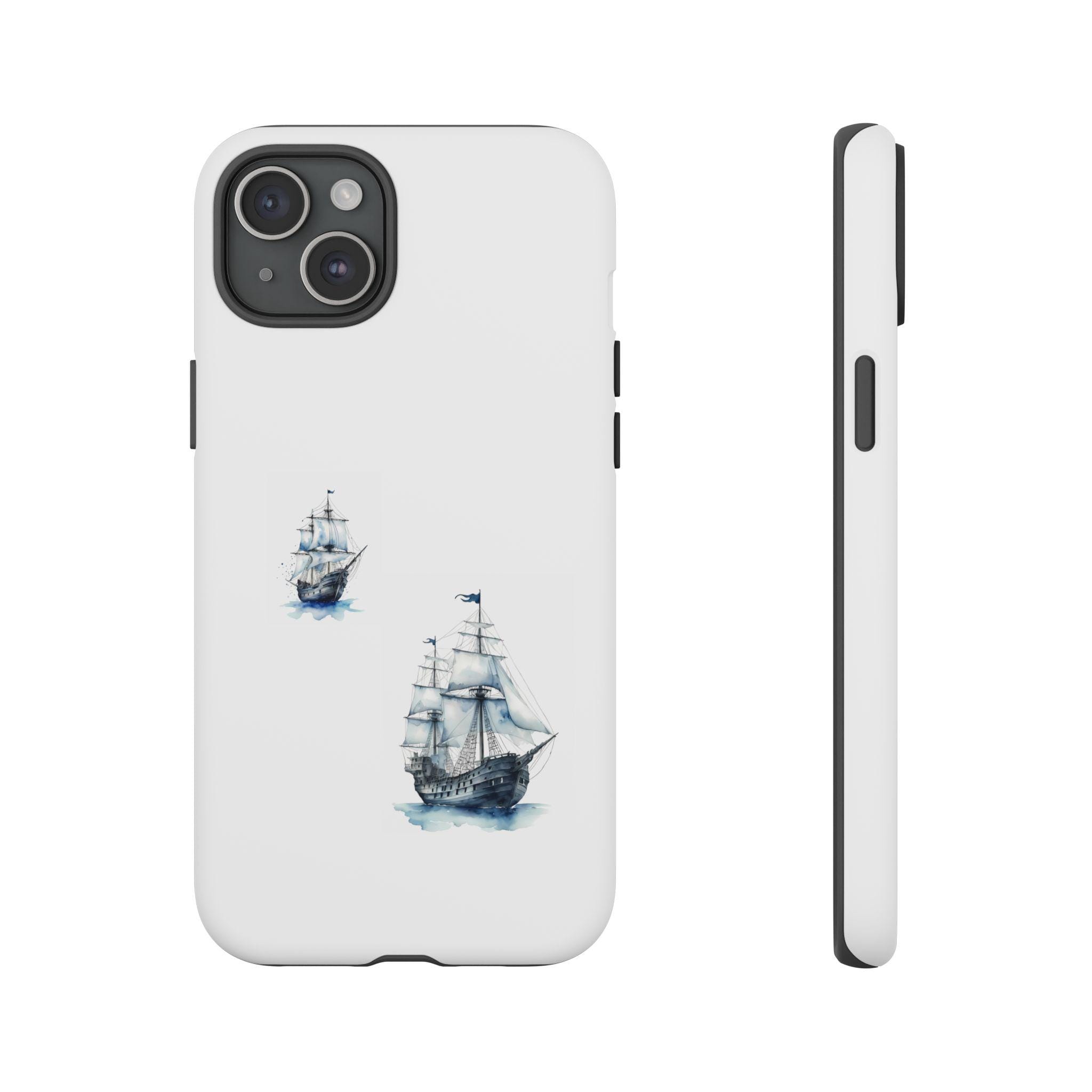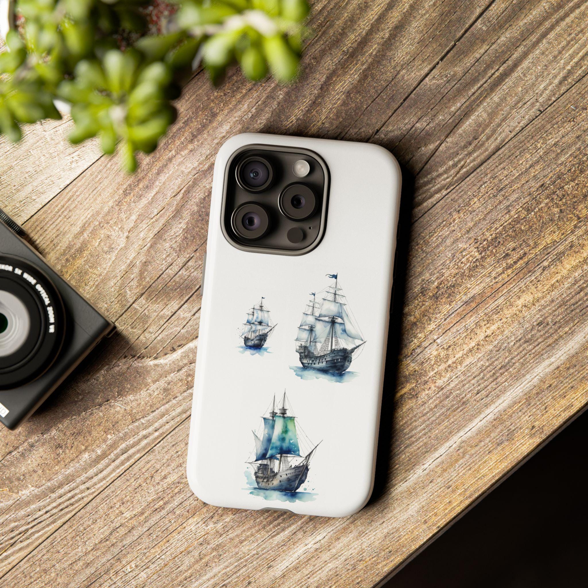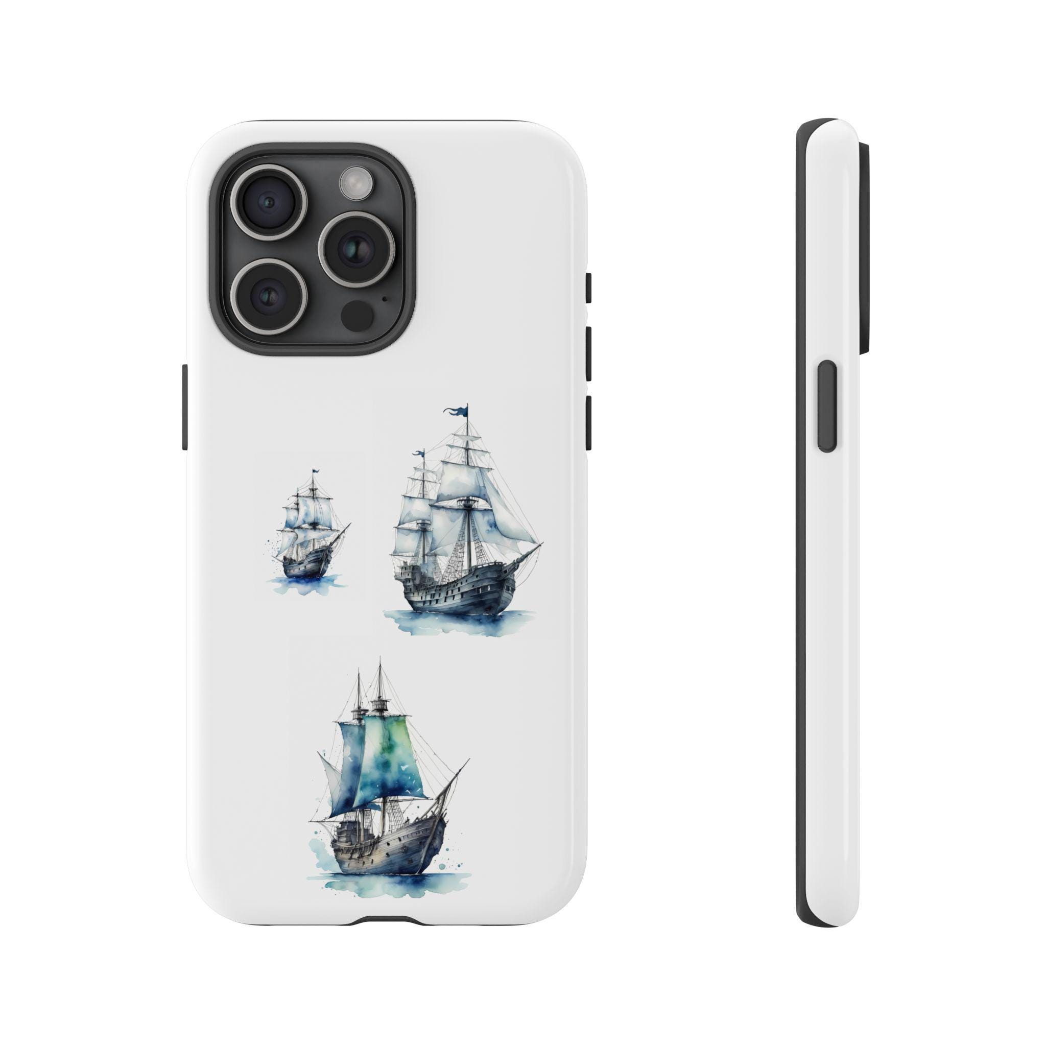 A slim, dual-layer protective phone case decorated with three watercolor sailing ships. The artwork’s soft blues and gentle brushstrokes give the case a quietly maritime feel — like a pocket-sized seascape that travels with you. The rigid polycarbonate shell and TPU silicone liner combine for shock absorption and edge protection, while the 3D wrap print keeps the image vibrant across the surface. Finished options in glossy or matte, clear port openings, and wireless-charging compatibility make this both functional and artful for everyday use.