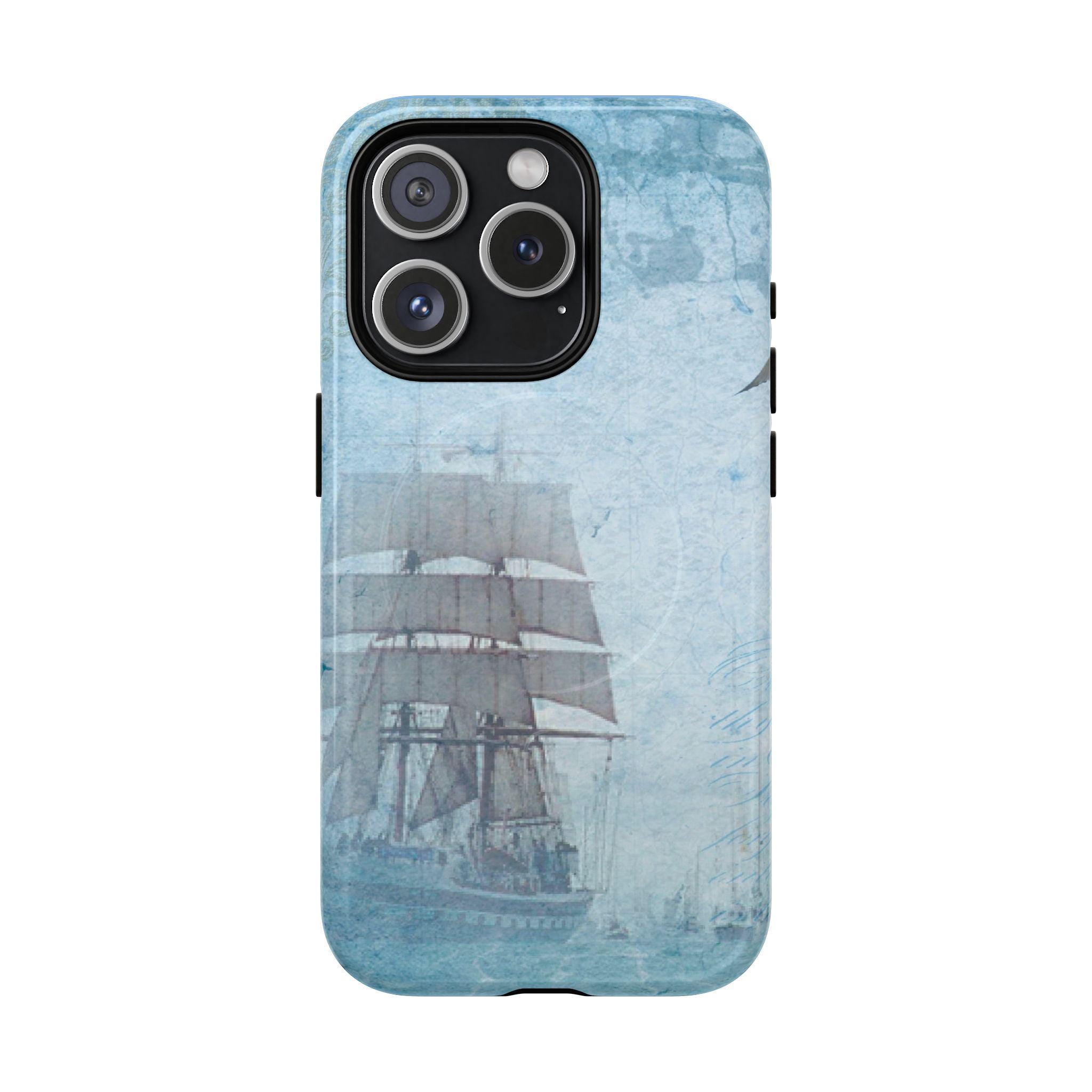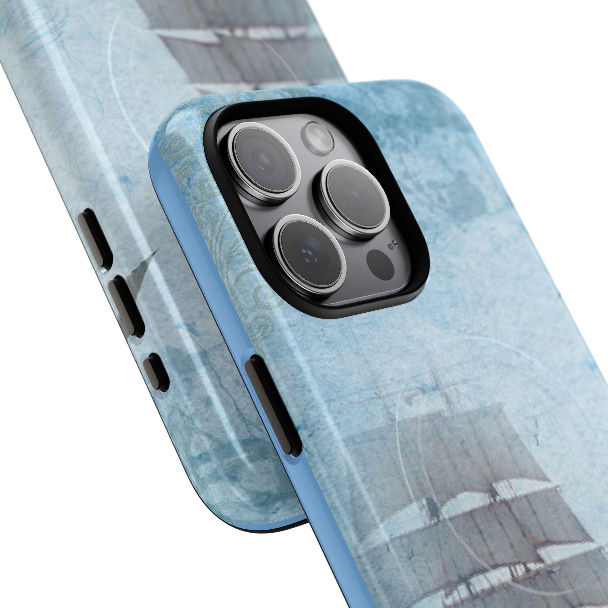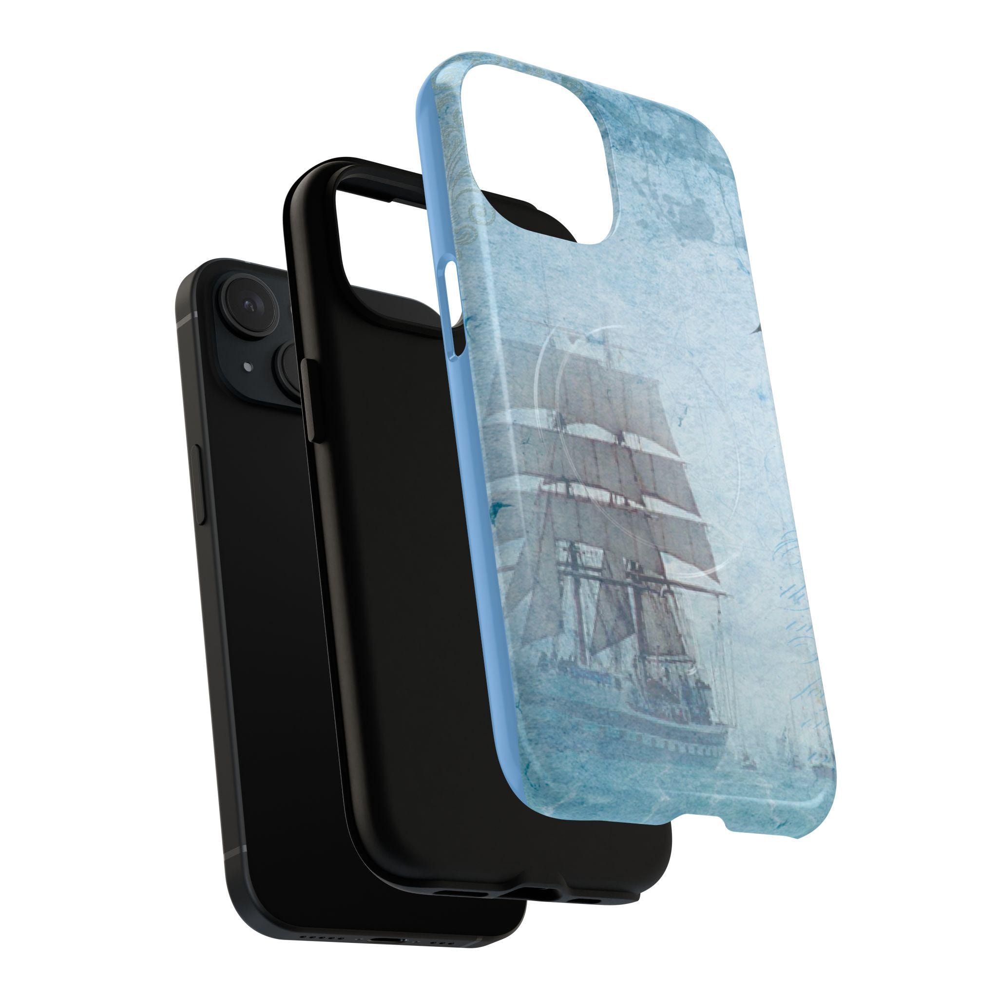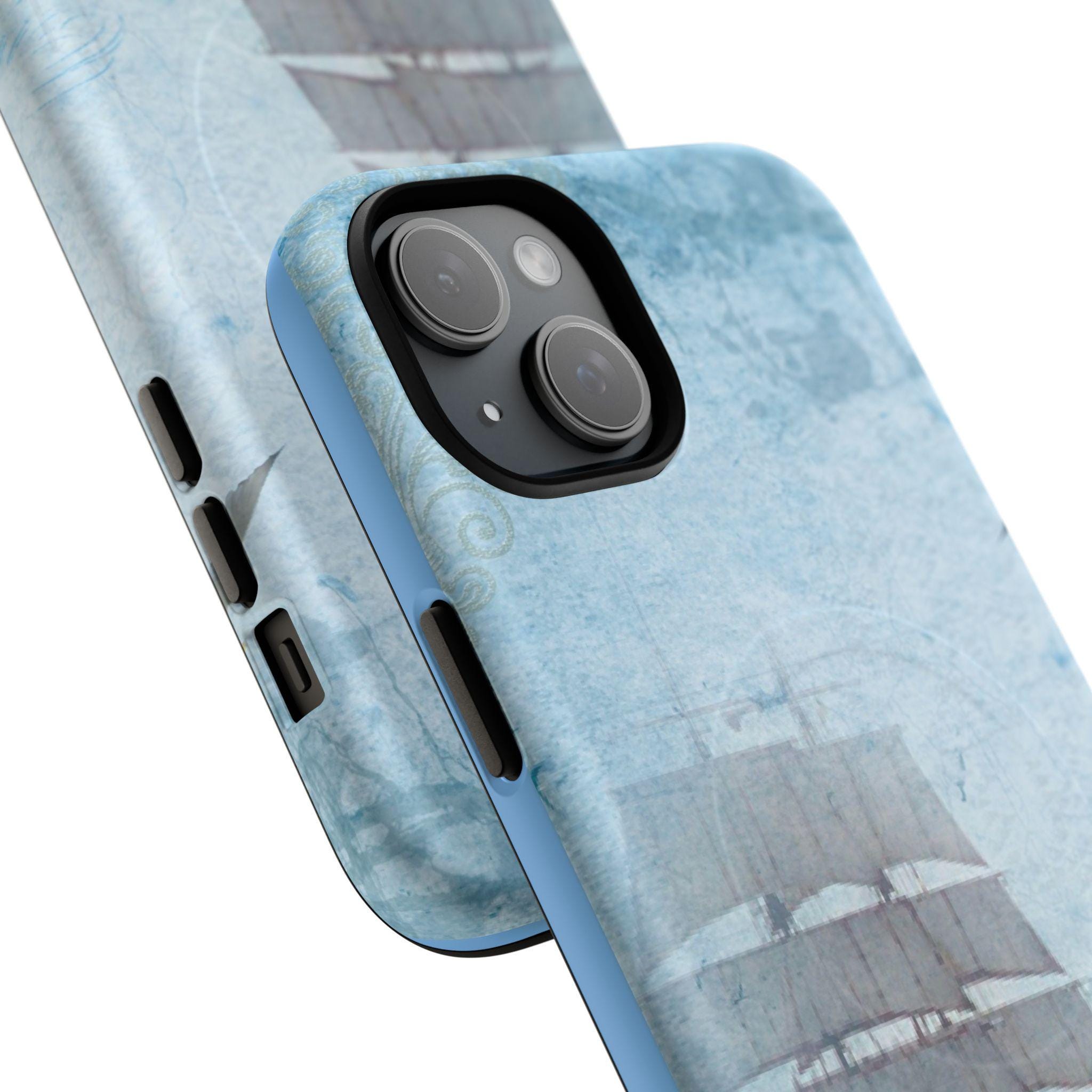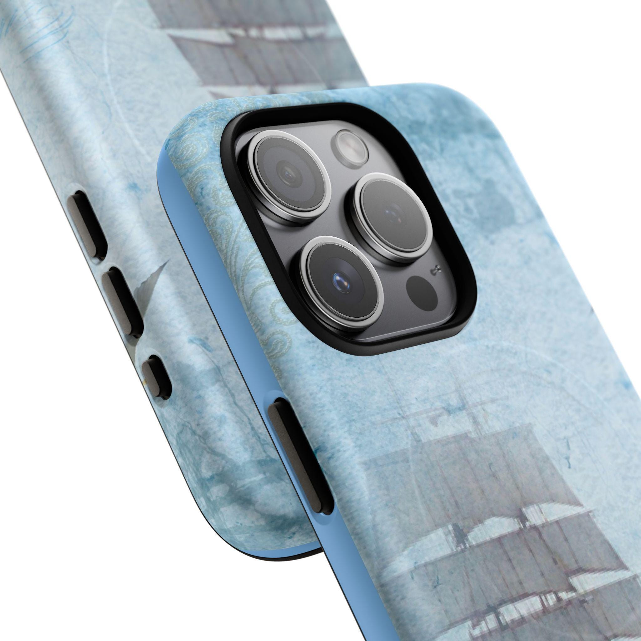 A slim, protective phone case that carries a soft, seafaring mood. The full-wrap printed artwork blends sea-blue textures with a ghosted tall ship, giving your phone a vintage-mariner look without adding bulk. Inside, a premium TPU silicone liner cushions drops while the tough polycarbonate shell resists impacts and daily wear. MagSafe-compatible magnets sit neatly inside the dual-layer build for secure accessory pairing. Choose glossy for a luminous sheen or matte for a muted, worn-paper feel — both keep ports open and camera cutouts precise. This case slips into a commuter’s routine and into moments when you want your device to feel like a small piece of travel-worn nostalgia.