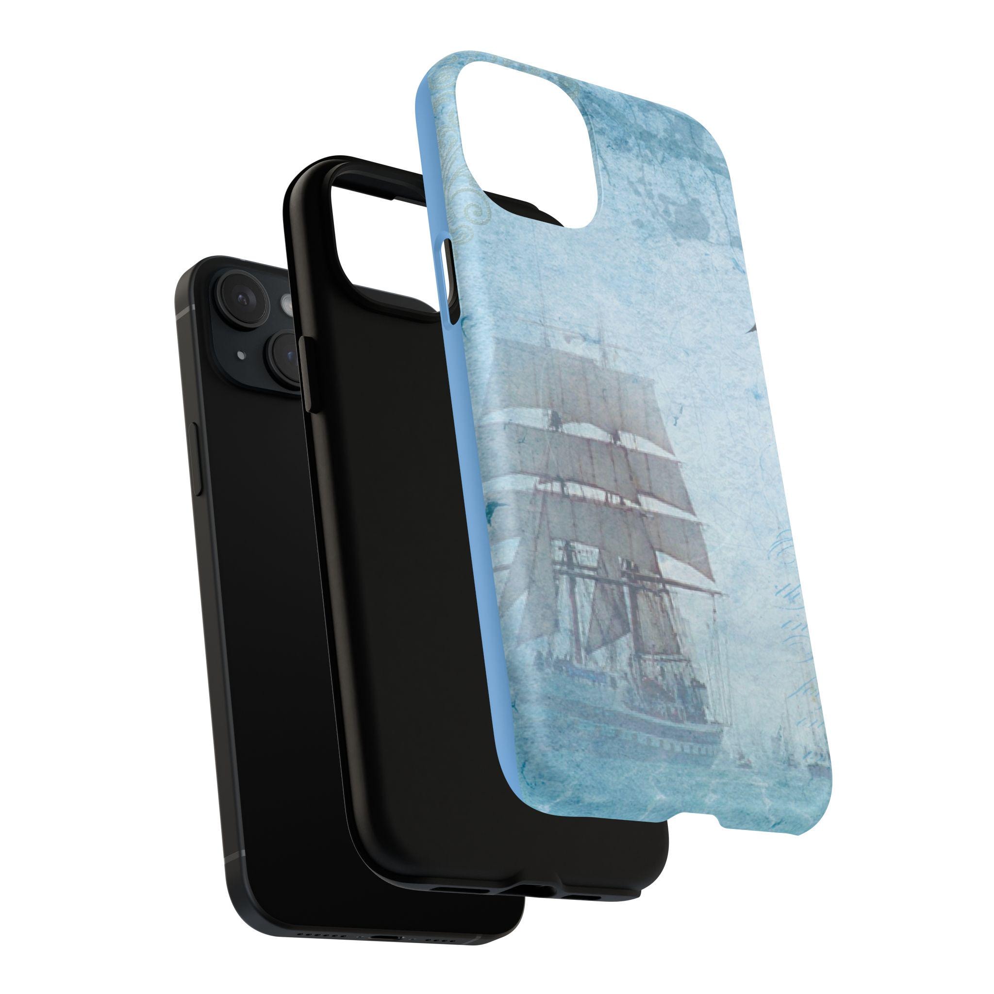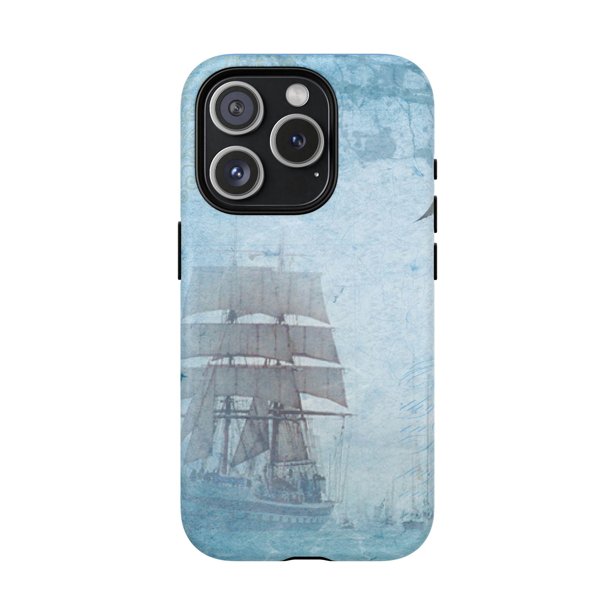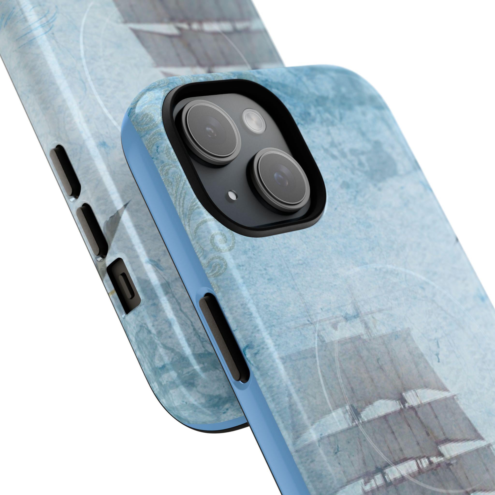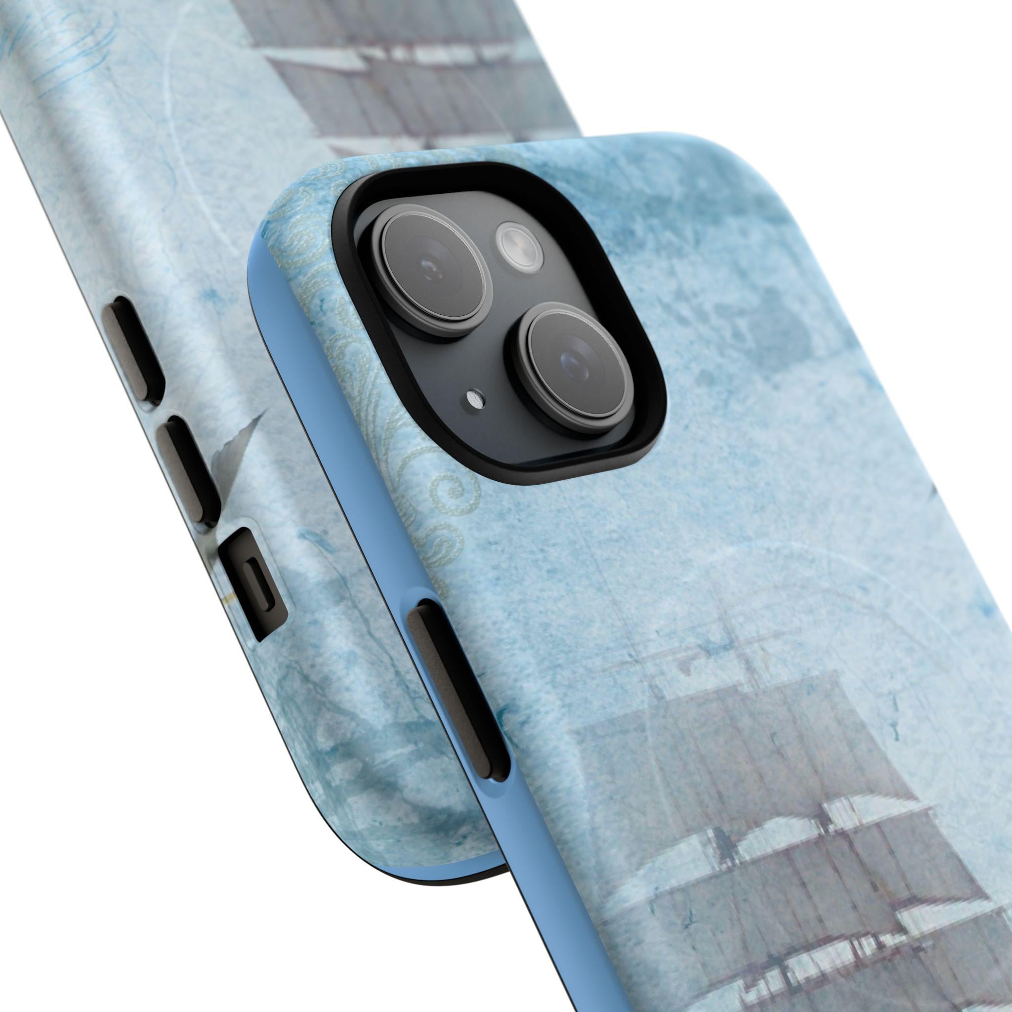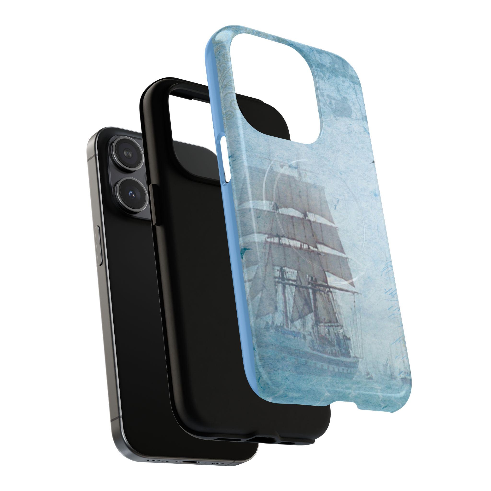 A slim, protective phone case that carries a soft, seafaring mood. The full-wrap printed artwork blends sea-blue textures with a ghosted tall ship, giving your phone a vintage-mariner look without adding bulk. Inside, a premium TPU silicone liner cushions drops while the tough polycarbonate shell resists impacts and daily wear. MagSafe-compatible magnets sit neatly inside the dual-layer build for secure accessory pairing. Choose glossy for a luminous sheen or matte for a muted, worn-paper feel — both keep ports open and camera cutouts precise. This case slips into a commuter’s routine and into moments when you want your device to feel like a small piece of travel-worn nostalgia.