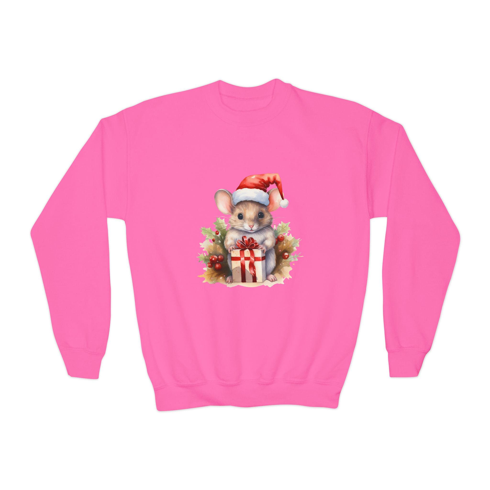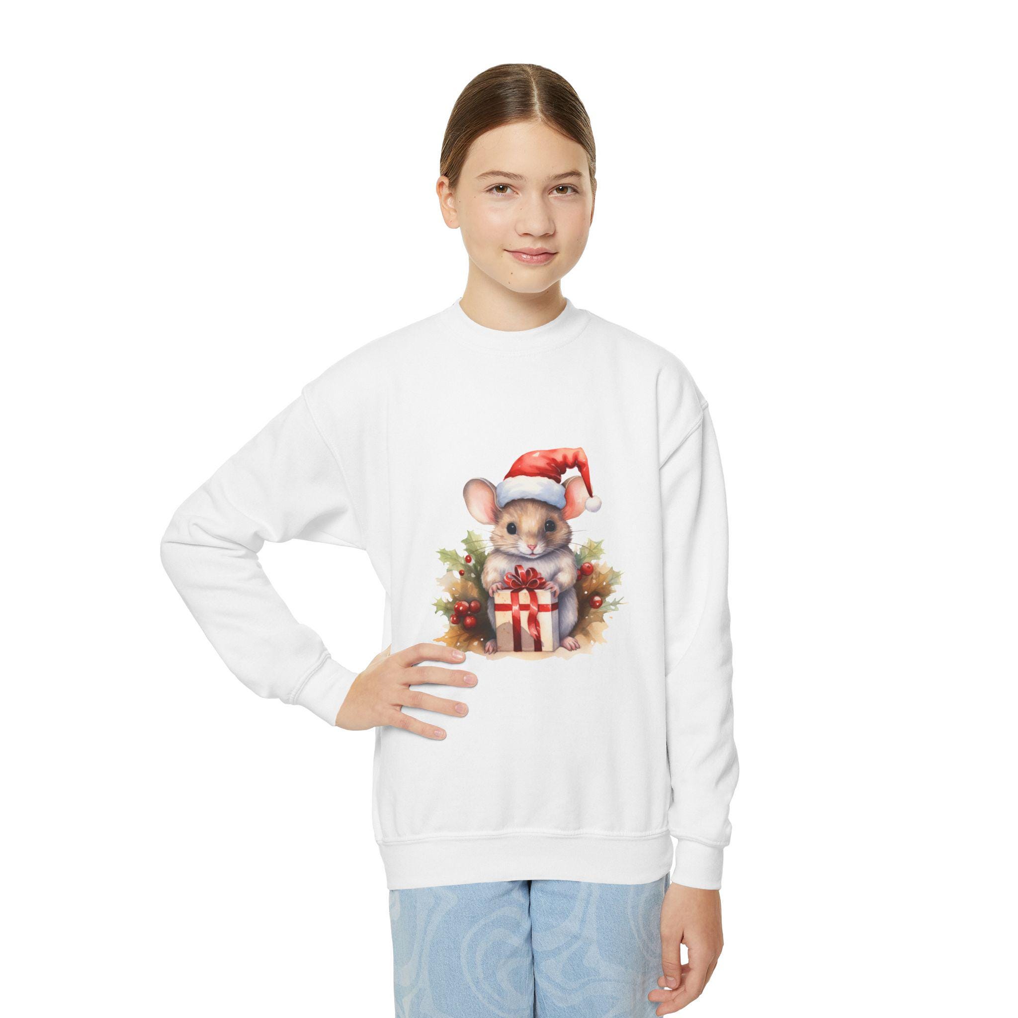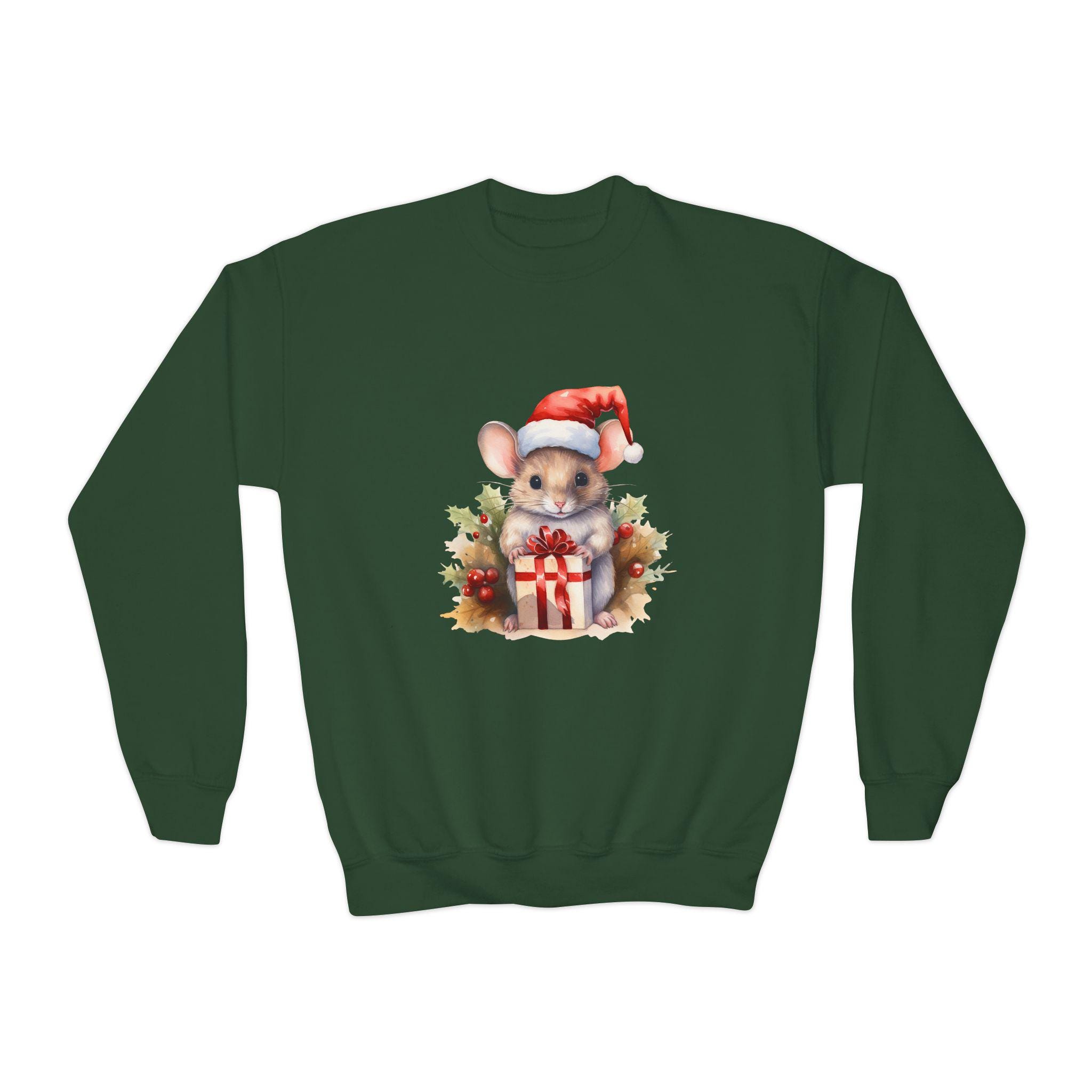 Soft, cozy and quietly festive — this youth crewneck brings a gentle holiday moment to a child’s wardrobe. A watercolor-style mouse in a Santa hat peeks out from behind a tiny gift, framed by sprigs of evergreen and warm baubles. The sweatshirt’s relaxed, loose fit and medium-heavy knit give it a comforting, worn-in feel that kids can move and play in. It layers easily over tees for chilly mornings and tucks into sledding days, bedtime story nights, and slow-paced family visits. The print sits neatly on the chest so the design reads clearly without overwhelming the garment. Durable cotton-poly fabrication and ribbed collar keep shape through washes, while the tear-away label reduces irritation for sensitive necks. Available with optional left- or center-chest embroidery for a personalized touch.
