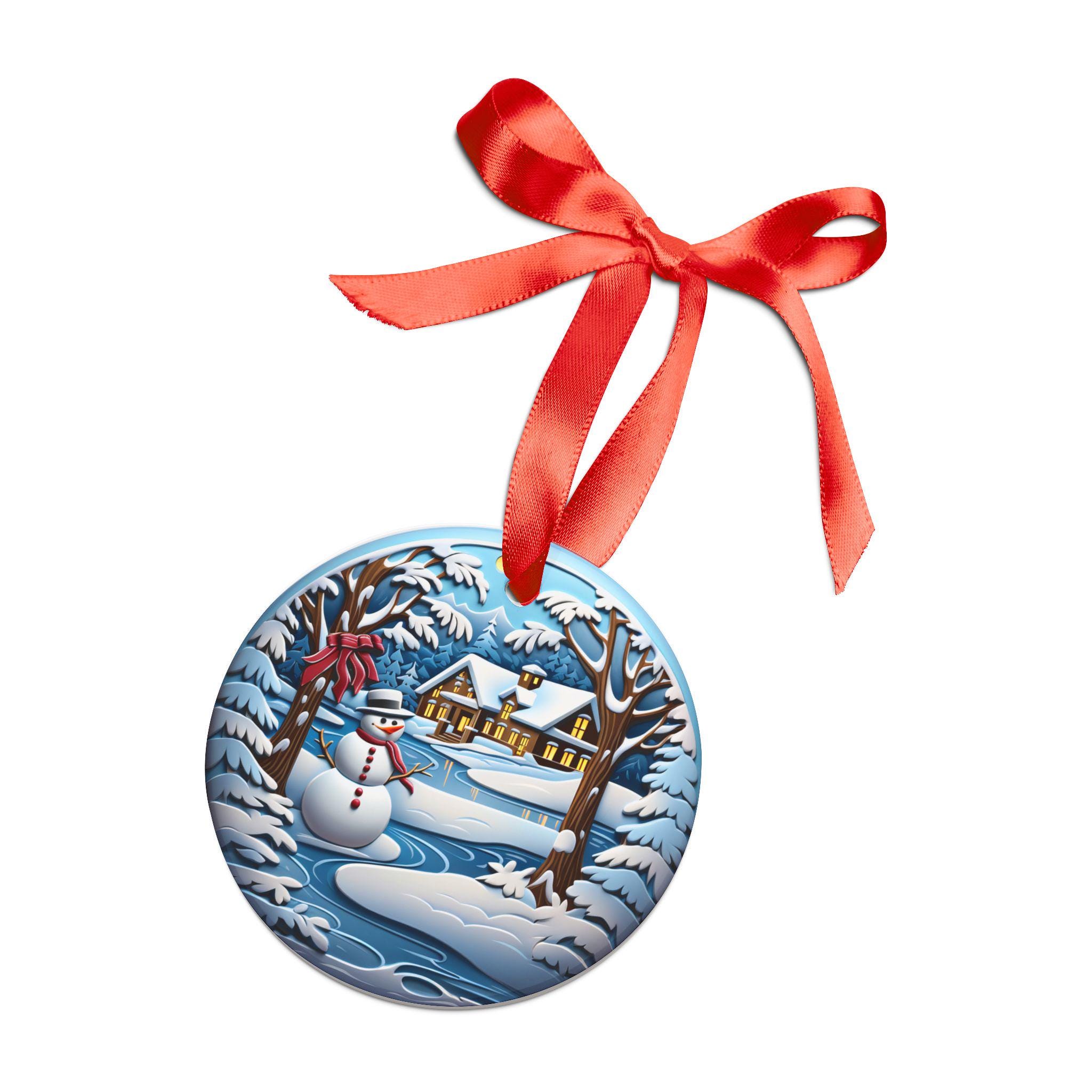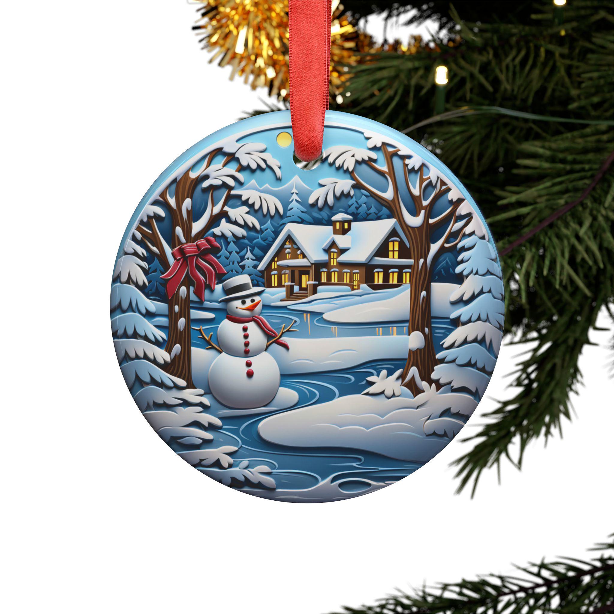 A glossy acrylic ornament that captures a cozy winter evening—snow-laden trees, a cheerful snowman, and a warmly lit cottage beyond the frozen stream. The design’s vivid colors and high-resolution printing pop under holiday lights, while the clear acrylic encasing gives depth and lasting protection. A red satin ribbon is included for immediate hanging on a tree or in a window, adding a classic festive touch. This ornament feels like a quiet stroll through a familiar winter scene, bringing a slice of nostalgic comfort to holiday displays and seasonal décor.