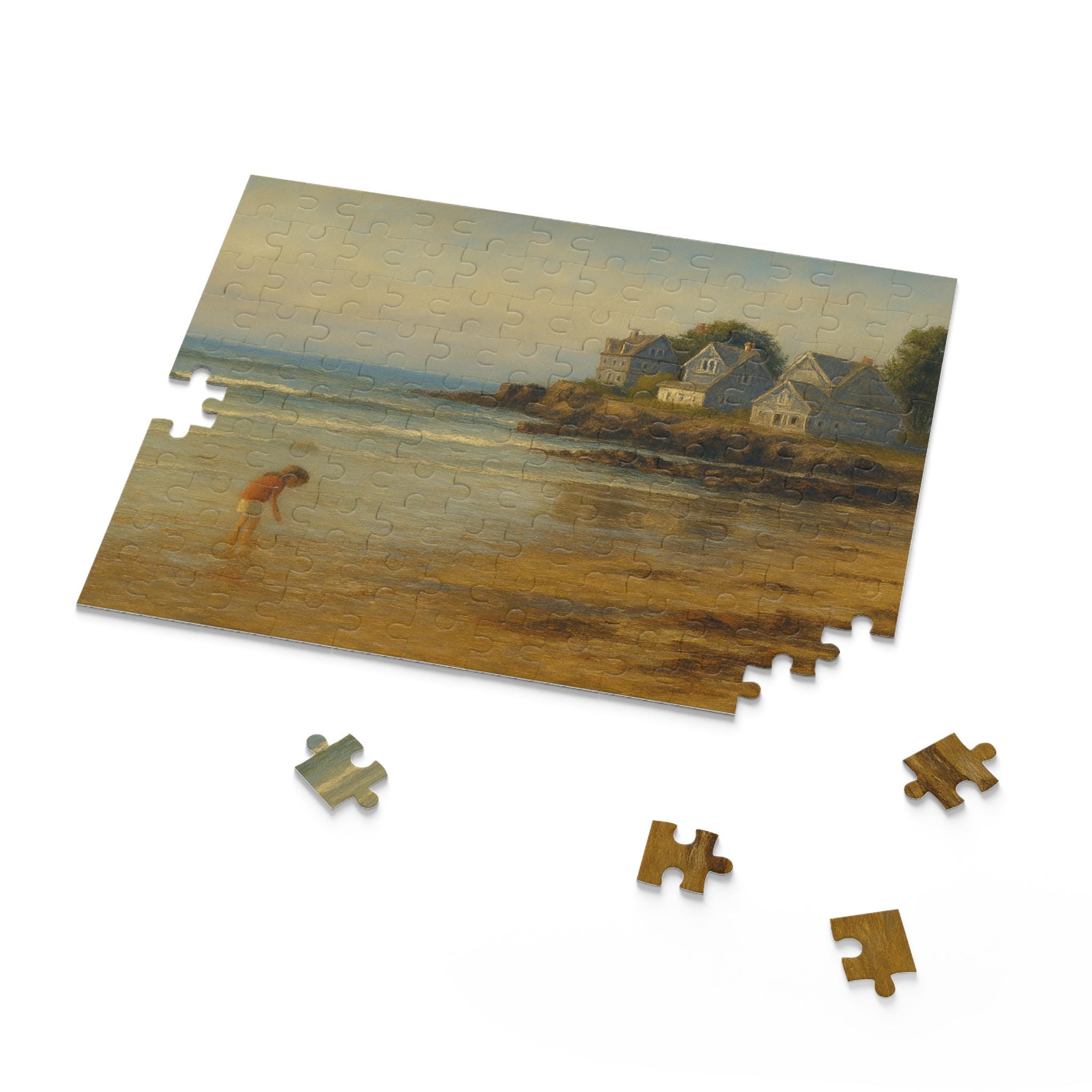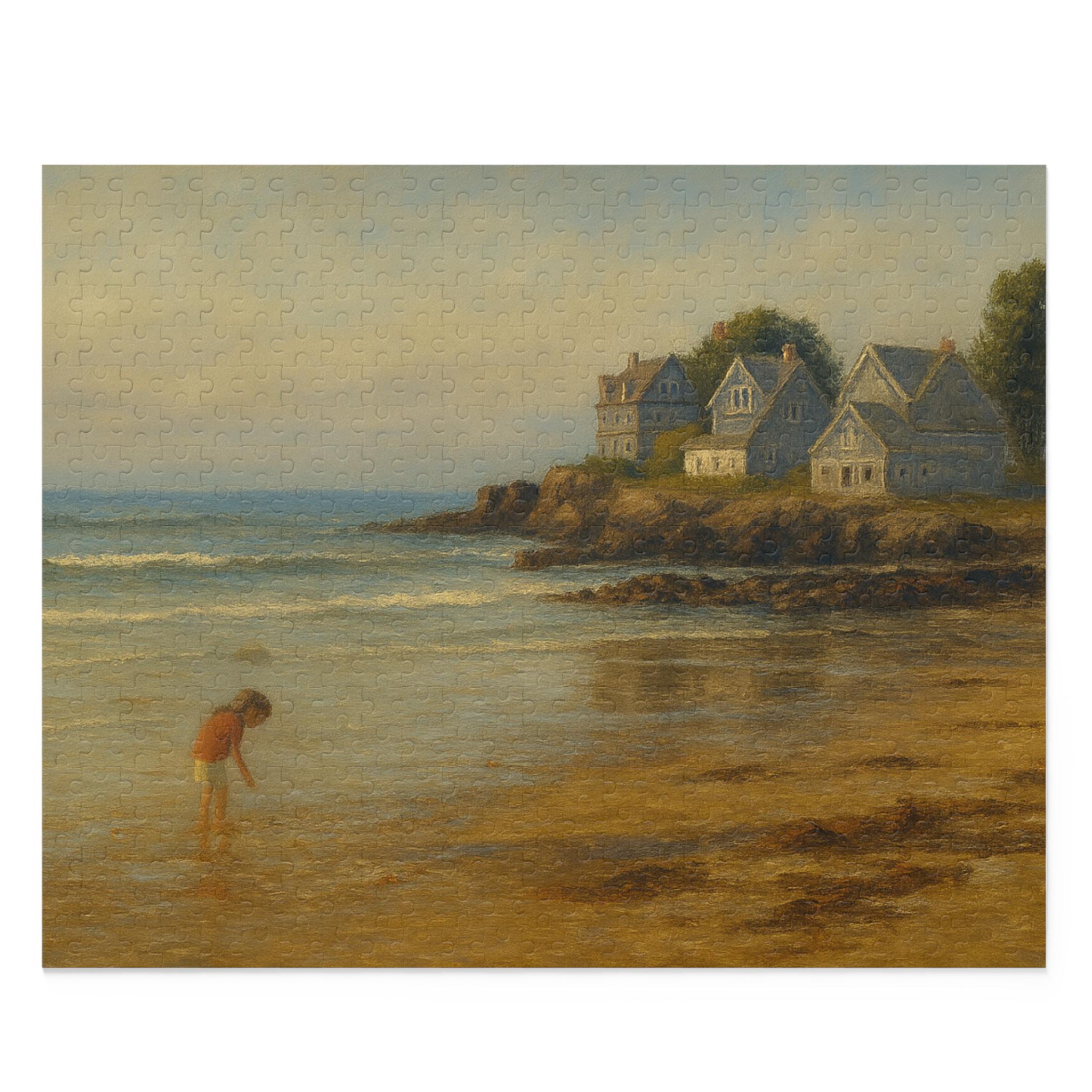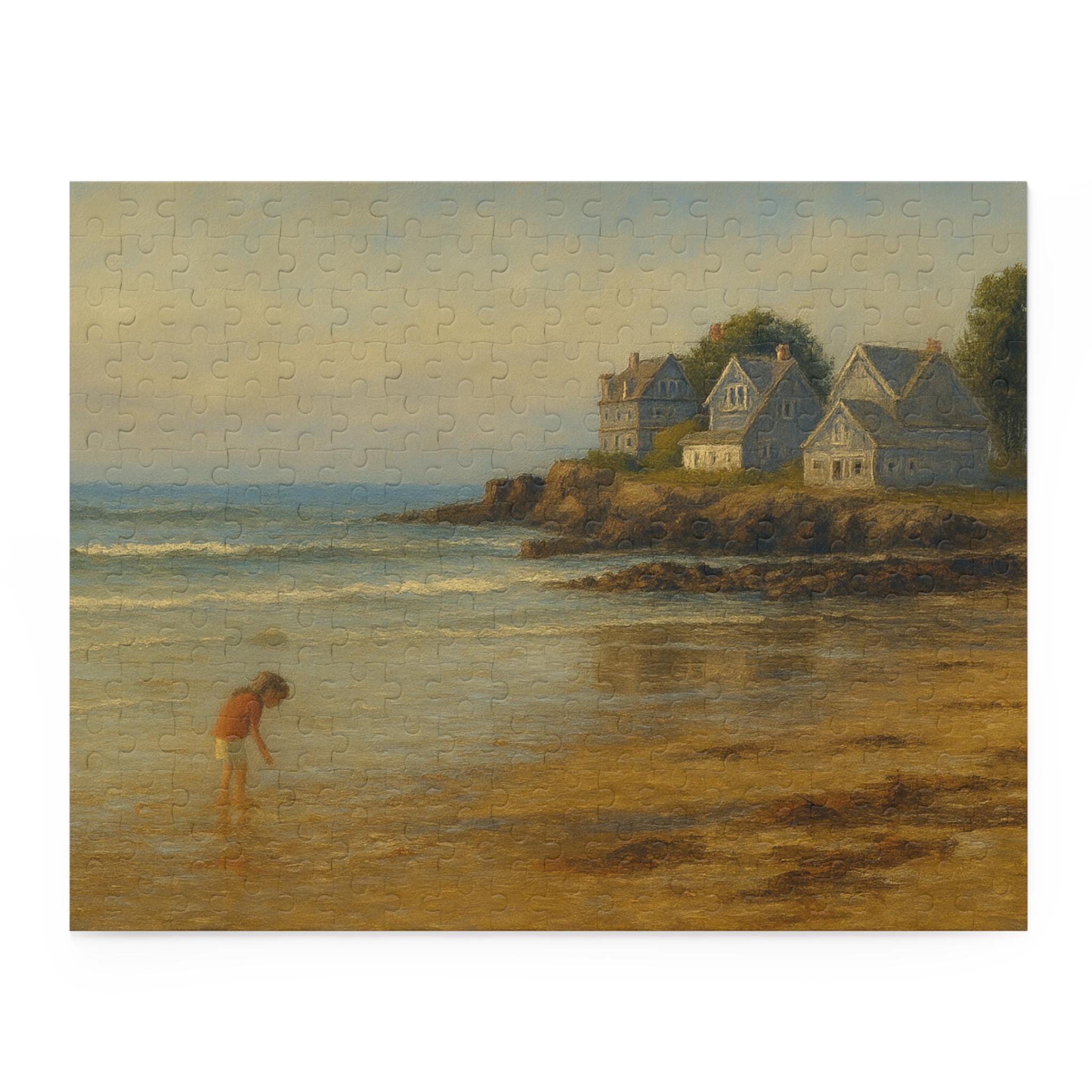 Sunlight spills across weathered clapboard and salt-streaked windows in this coastal cottage scene of Lorda Point, Kennebunk, Maine. This puzzle invites quiet afternoons — the shuffle of pieces, the slow satisfaction as shoreline and sky lock into place. It’s for folks who collect small coastal moments: those who savor low-tide walks, porch conversations, and the hush of a late-summer breeze. Lay it out on the kitchen table during a rainy weekend, bring it to a seaside rental for evening company, or stretch it across a living-room coffee table while tea steams nearby. The glossy finish and bright colors make waves and shingles pop, and the finished image framed on the included box shows exactly what you’ve pieced together — a little harbor of calm to return to again and again.