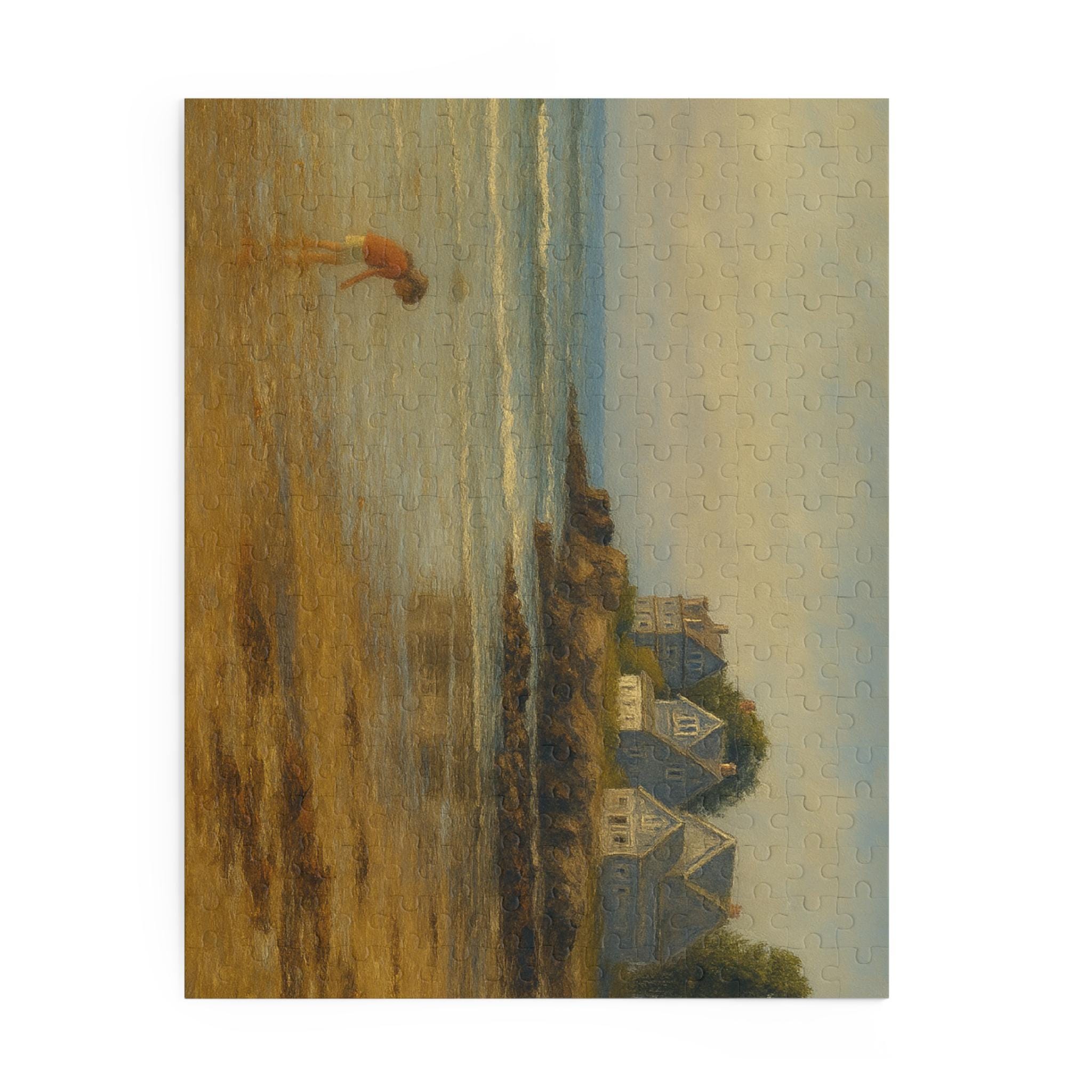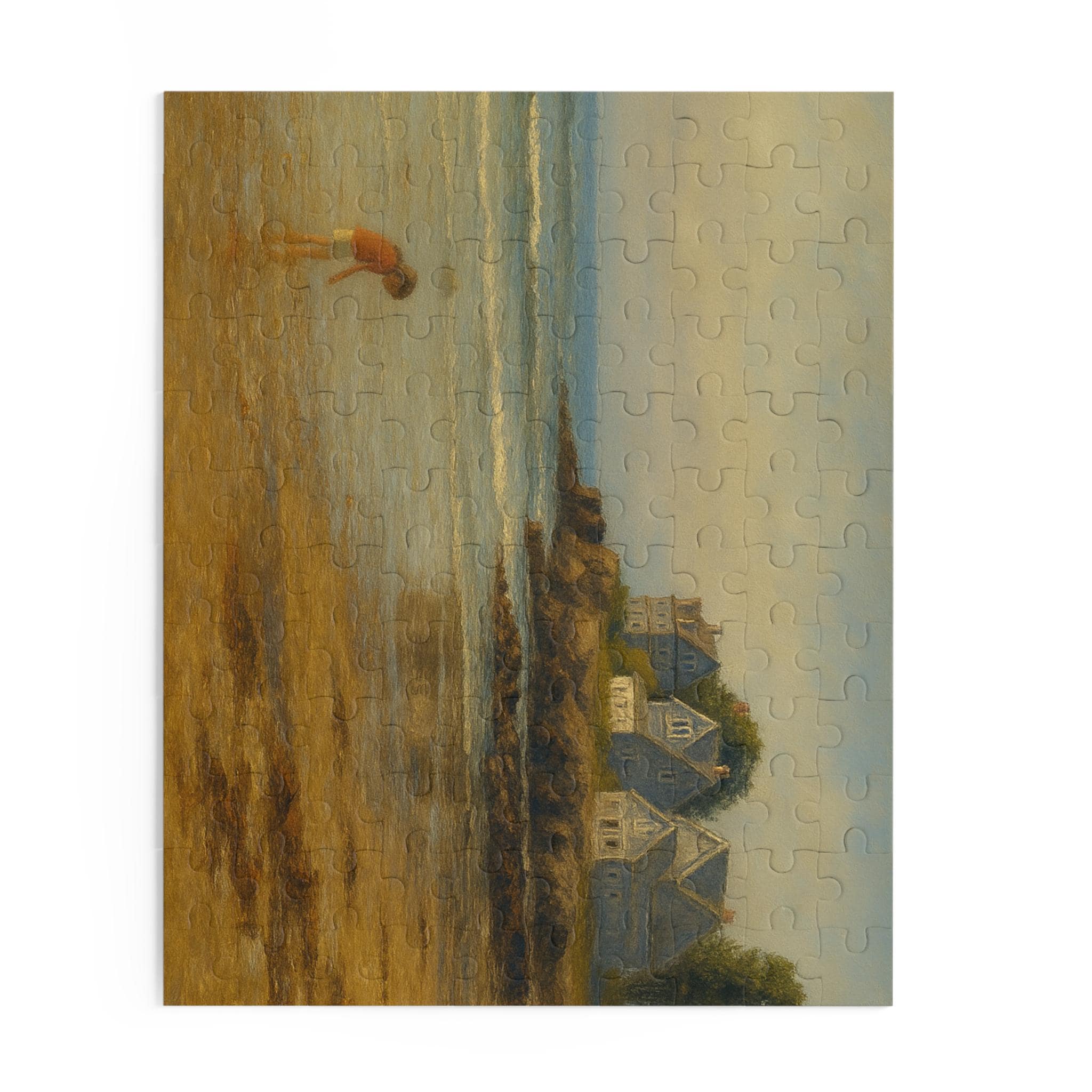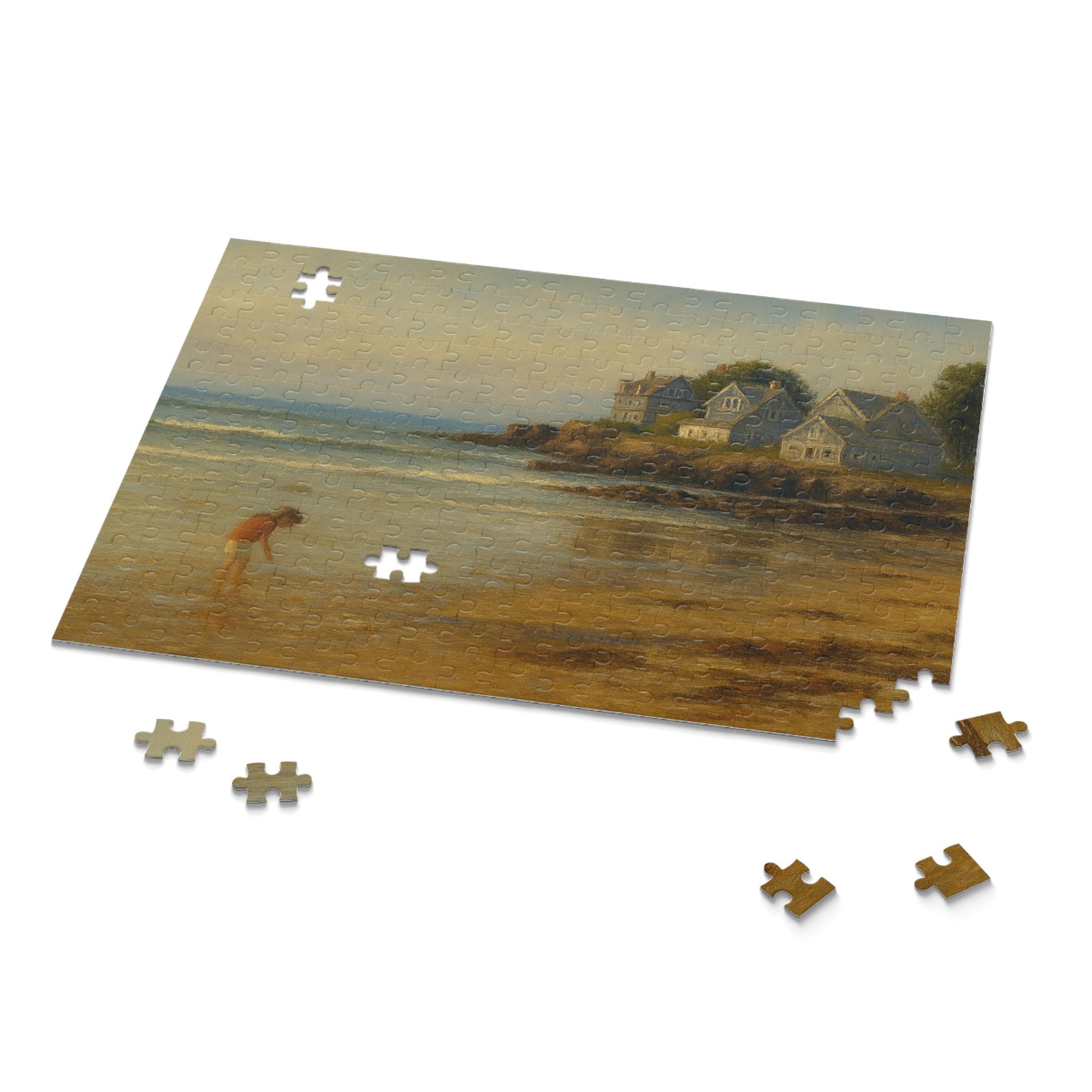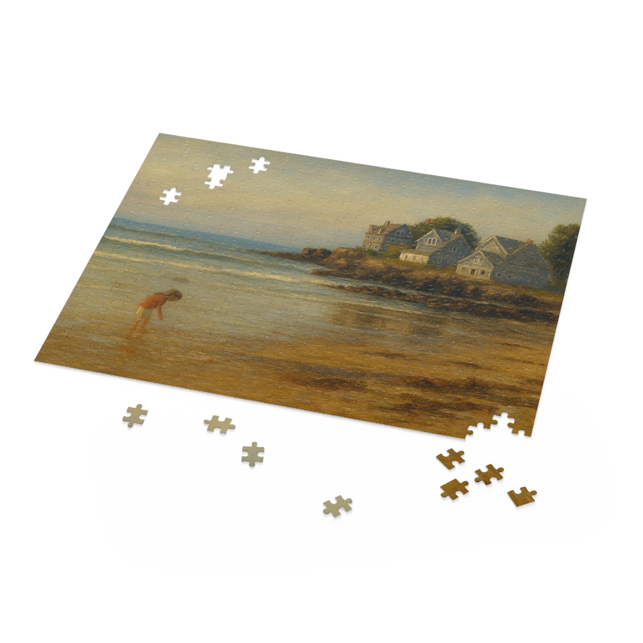 Sunlight spills across weathered clapboard and salt-streaked windows in this coastal cottage scene of Lorda Point, Kennebunk, Maine. This puzzle invites quiet afternoons — the shuffle of pieces, the slow satisfaction as shoreline and sky lock into place. It’s for folks who collect small coastal moments: those who savor low-tide walks, porch conversations, and the hush of a late-summer breeze. Lay it out on the kitchen table during a rainy weekend, bring it to a seaside rental for evening company, or stretch it across a living-room coffee table while tea steams nearby. The glossy finish and bright colors make waves and shingles pop, and the finished image framed on the included box shows exactly what you’ve pieced together — a little harbor of calm to return to again and again.
