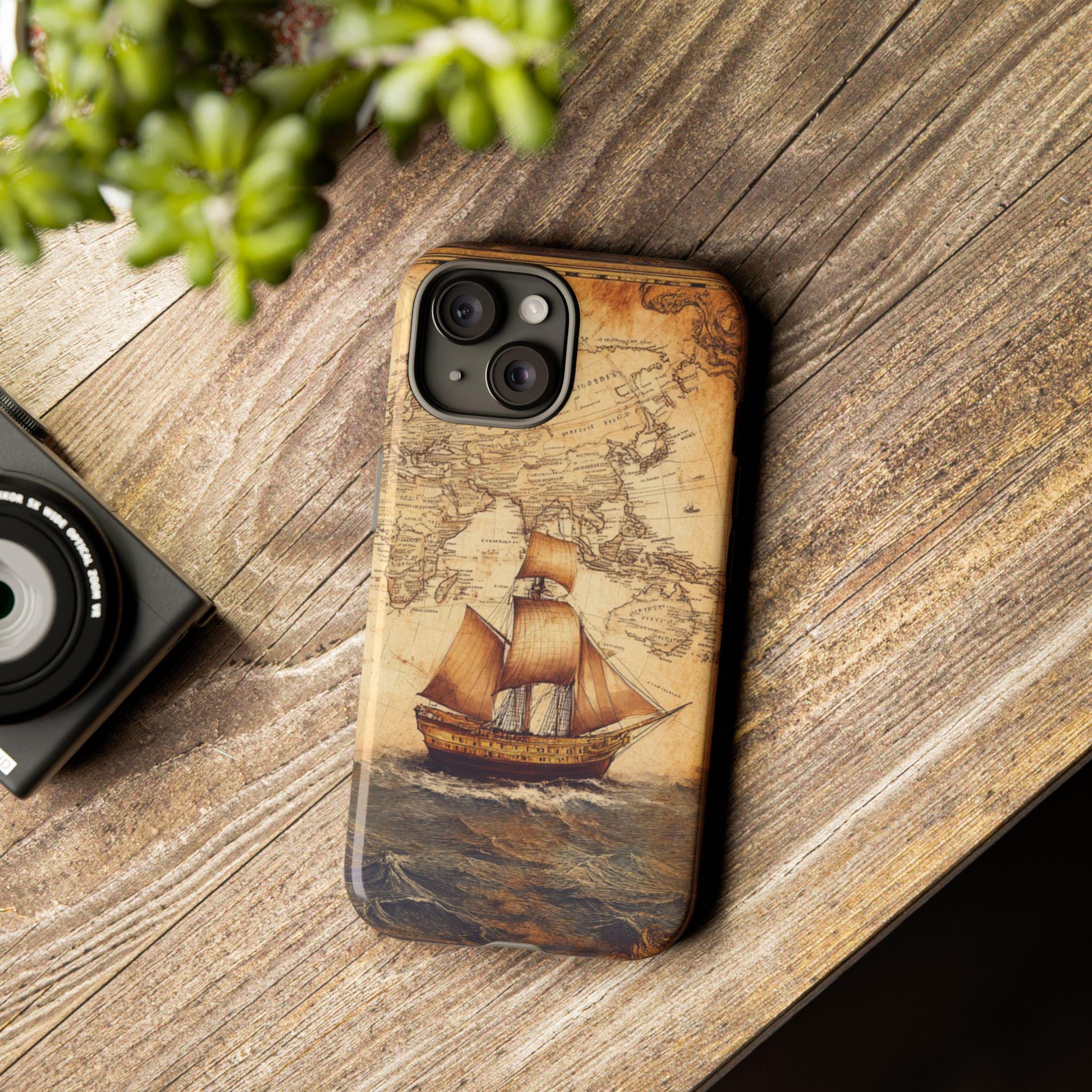 This protective phone case brings a touch of old-world seafaring to your everyday carry. A vintage map and a weathered sailing ship glide across a high-gloss or matte finish, while a dual-layer build — rigid polycarbonate shell with a TPU silicone liner — cushions against drops and knocks. The 3D wrap printing keeps the design continuous around the edges, and UV protection helps maintain color and contrast outdoors. Clear port openings and wireless charging compatibility mean function stays simple. It wears like a piece of maritime history, built for adults who appreciate rugged reliability and a timeless aesthetic.