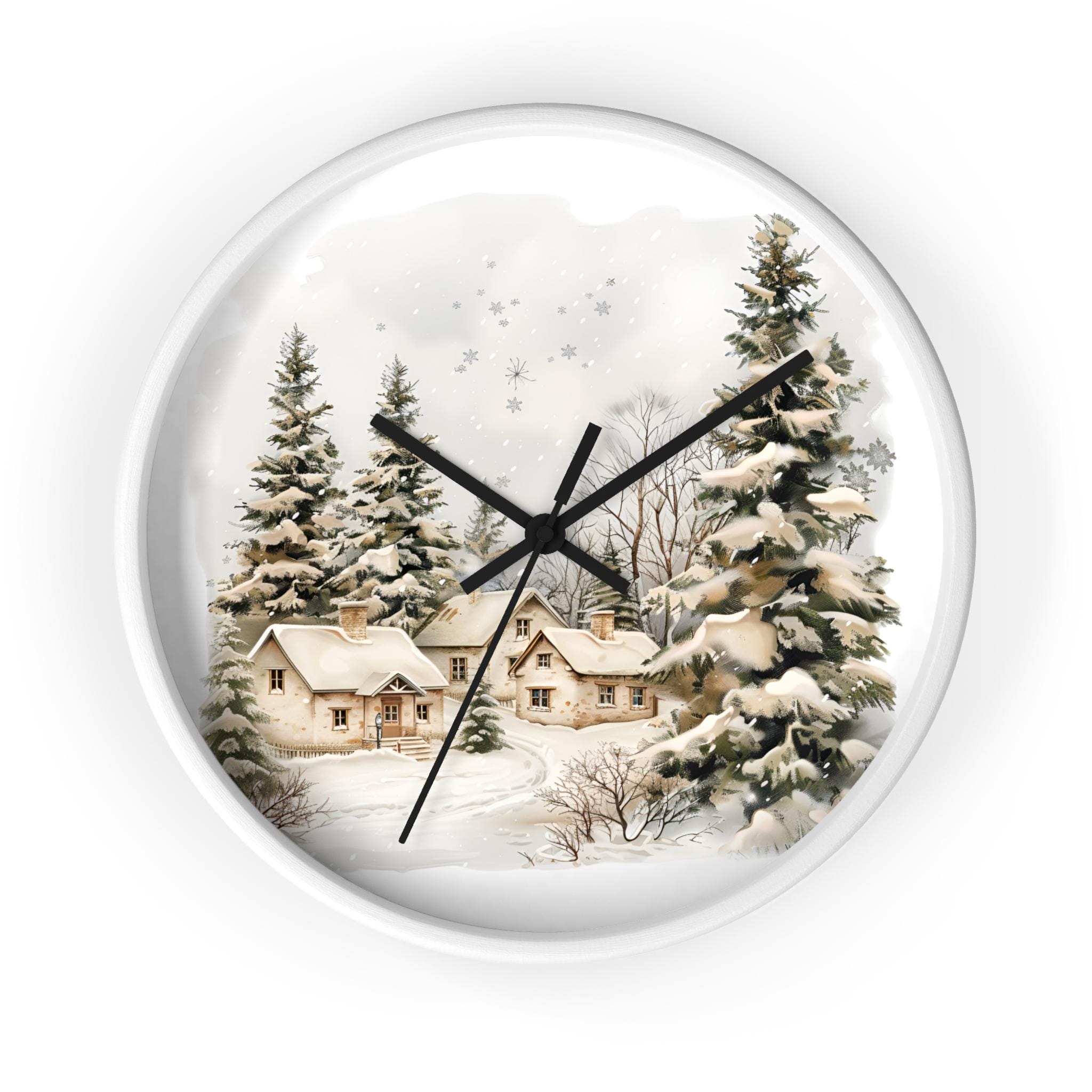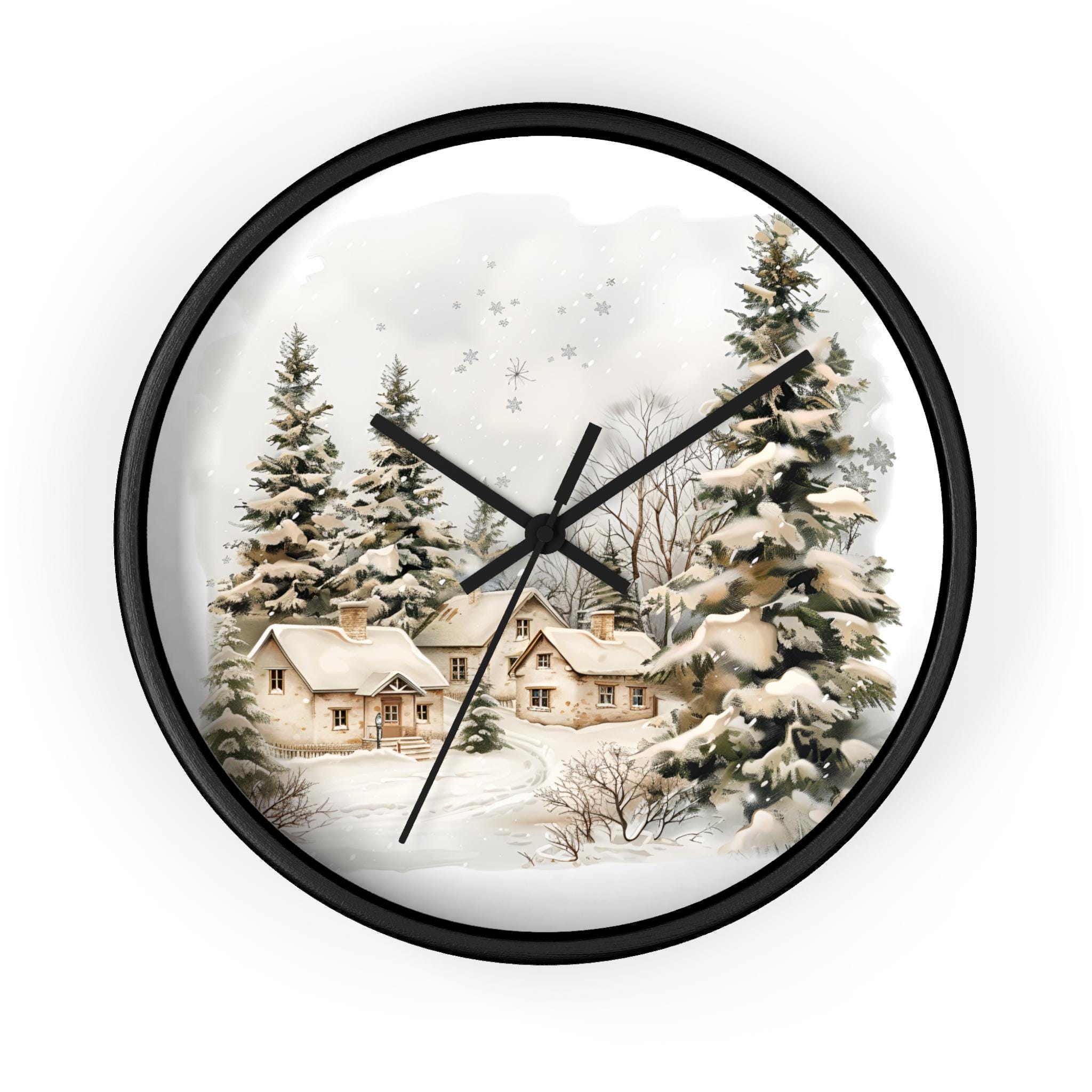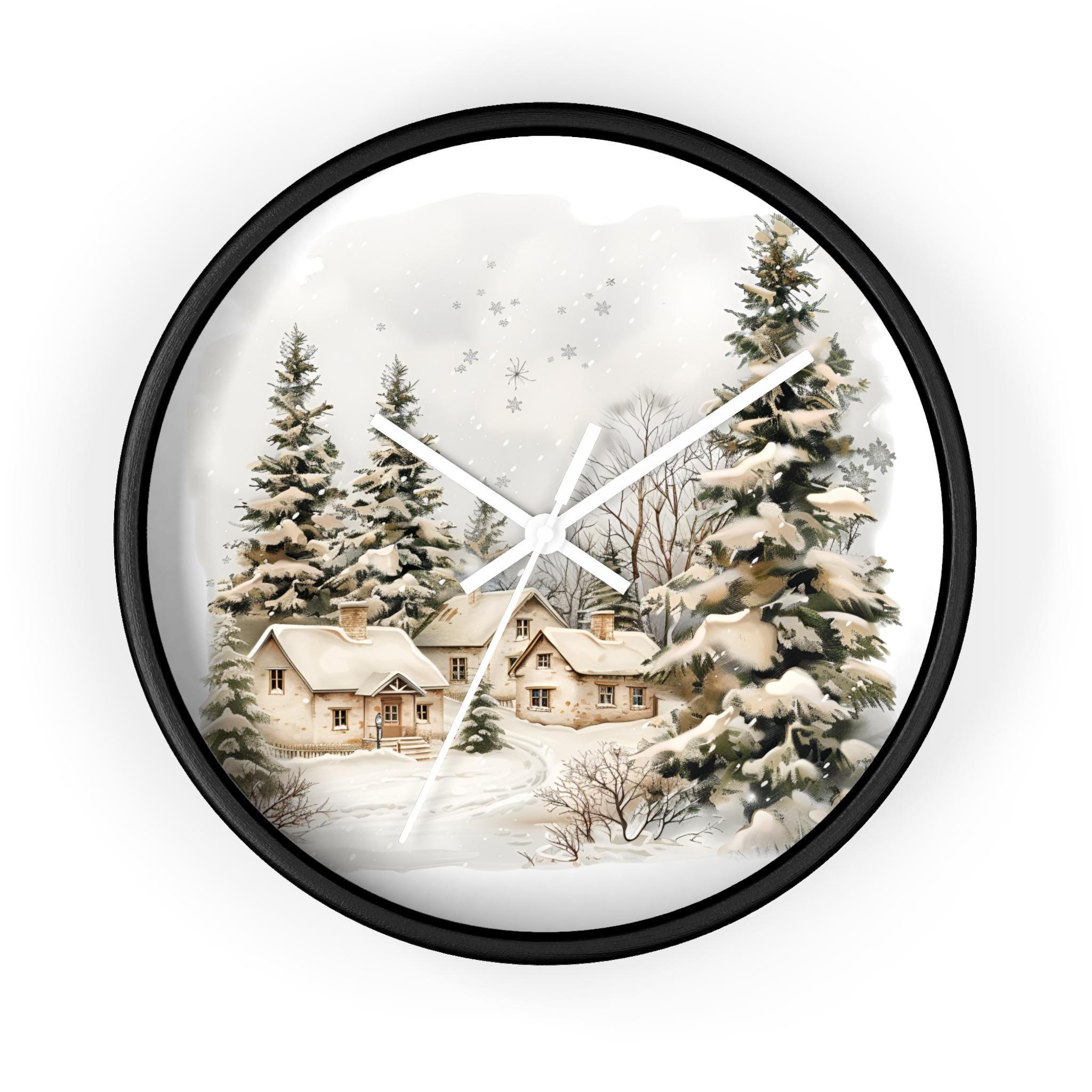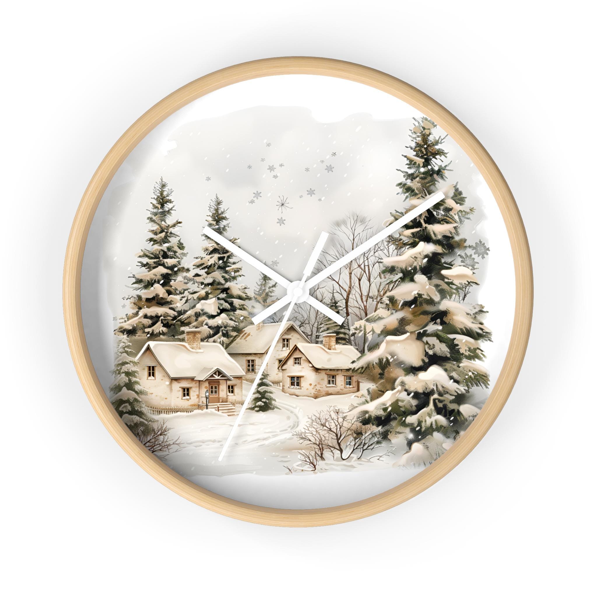 A hand-drawn winter scene captured on a wooden wall clock — soft snow falling over a row of cozy cabins, tall evergreens dusted in white, and a quiet path leading into the trees. The warm wood frame and clear plexiglass face give the illustration a gentle, homey glow. This clock brings a calm, seasonal mood to an entryway, kitchen, or living room, where the hush of snowfall feels like an invitation to slow down and savor small moments. The silent mechanism keeps time without ticking, so the scene remains peaceful while the day moves along.