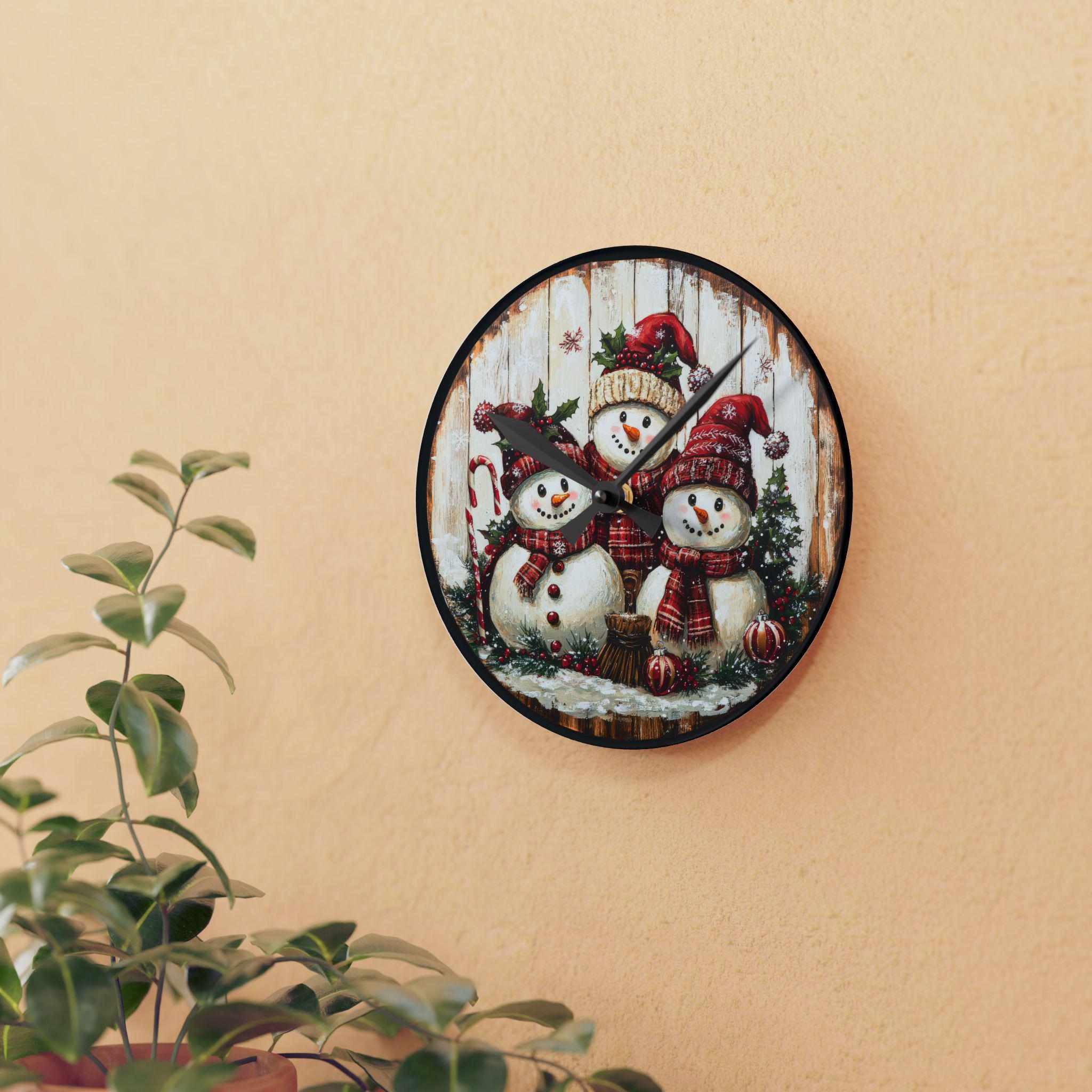 Bring a quiet snowfall indoors with this acrylic wall clock that captures a trio of cheerful snowmen standing together under soft holiday lights. The slim, glossy face keeps the artwork vivid while the whisper-quiet movement lets the scene stay calm and cozy. Hang it above a mantel, in an entryway, or on a kitchen wall to add a playful, wintry note that settles into everyday life — a small reminder of steaming cocoa, mittened hands, and the hush between snowflakes. The built-in keyhole hanger makes placement simple, and two size and shape options let you pick the fit that feels right for your space.
