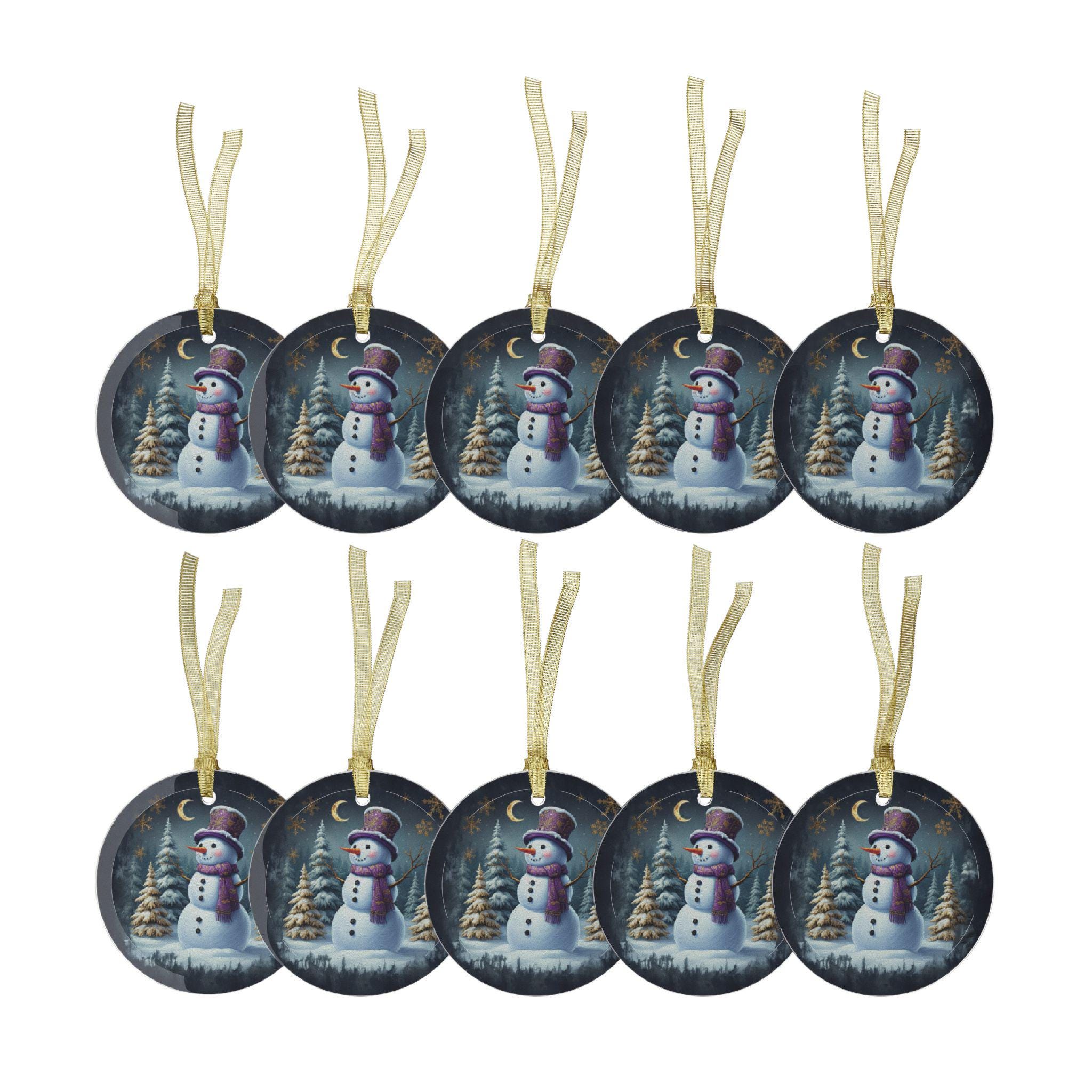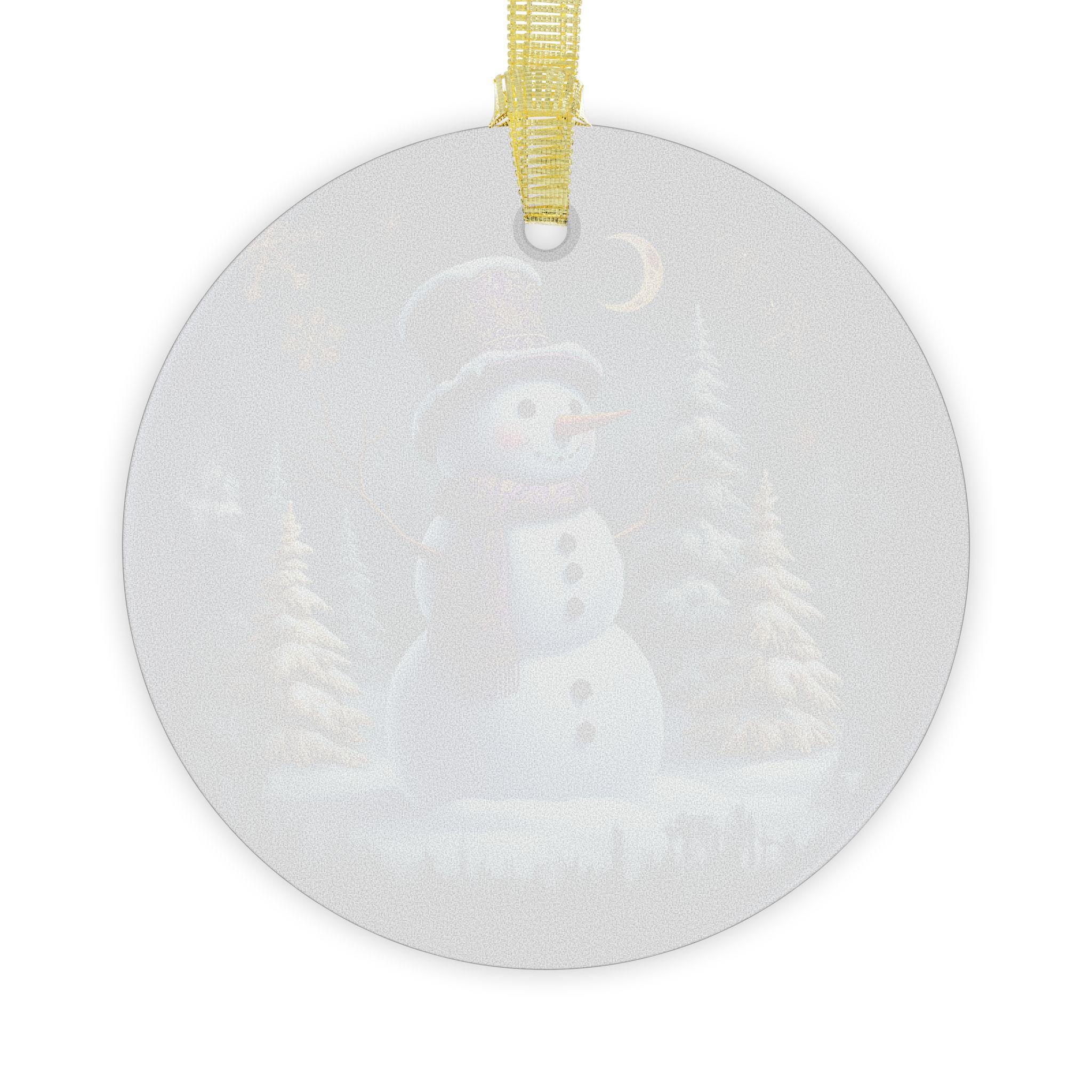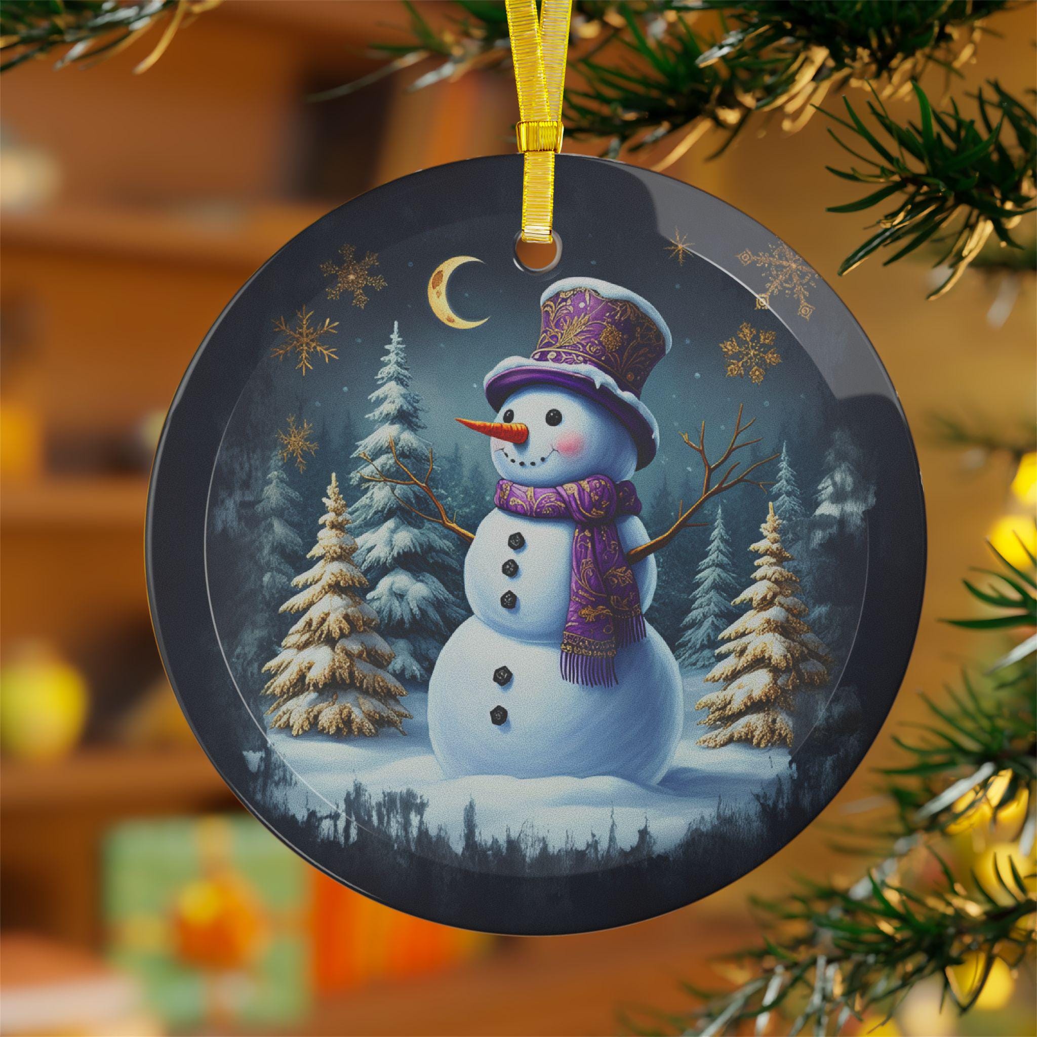 A delicate glass ornament that brings a quiet snowfall to your tree. Hand-finished with bright, crisp printing, each snowman scene feels like a tiny winter window—soft flurries, frosted trees, and that hush that follows the first snowfall. The slim, beveled glass catches the tree lights and throws a gentle glow across the room. Hang one on the family tree, tuck a few into a holiday bundle for a neighbor exchange, or use them to dress a winter mantel. The included gold ribbon and elegant gift box make each piece feel considered and ready to share, while the solid one-piece construction keeps the image clear year after year.