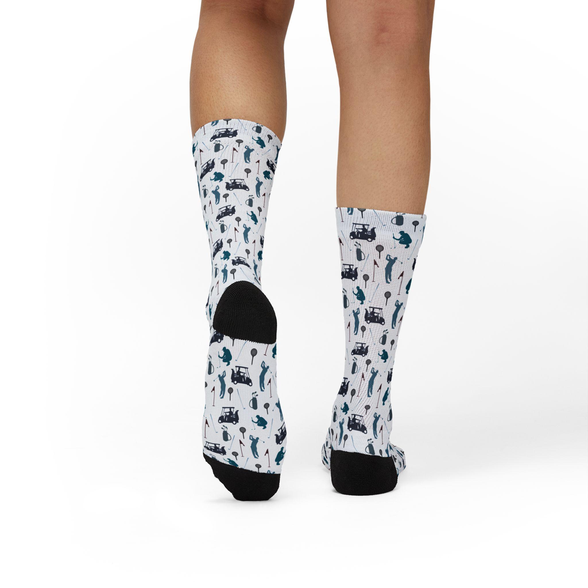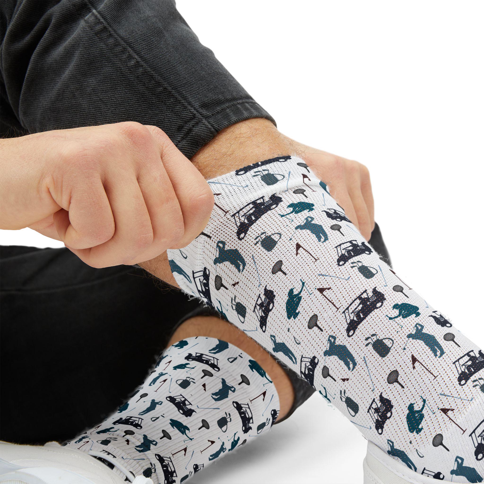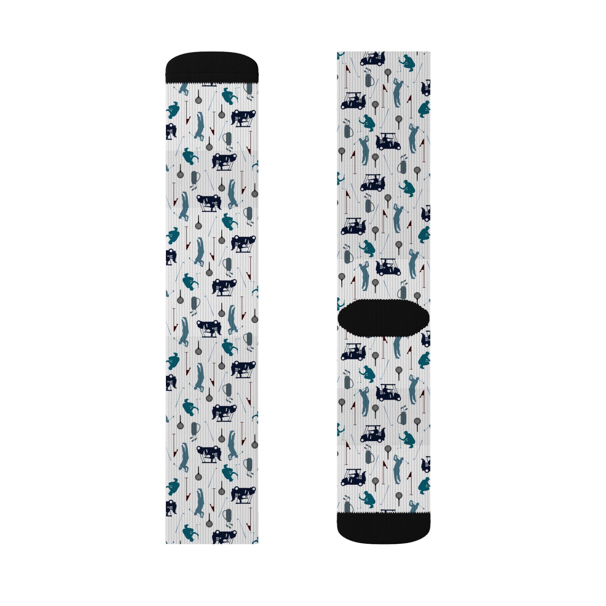 These golf-pattern crew socks bring the course to your feet. Soft fleece cushioning underfoot keeps walks between holes quiet and warm, while the crew length protects calves from early-morning chill and stray grass. The all-over print wraps the entire sock in a lively 18-hole motif, so your socks read like a miniature scorecard when you cross the fairway. Built from a stretchy polyester blend with ribbed tubes and cushioned bottoms, they move with your swing and stay put through every step. Sizes come in three options and the unisex regular fit makes them easy to share with your playing partners.