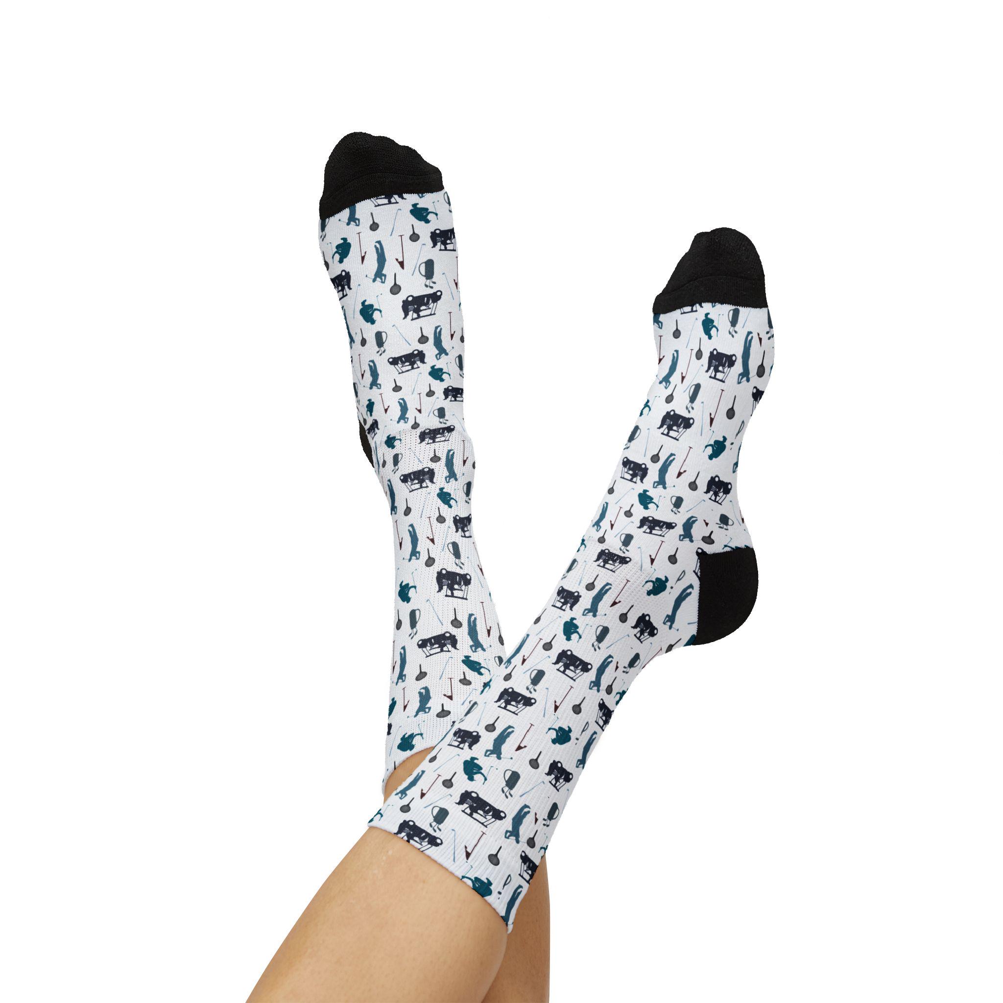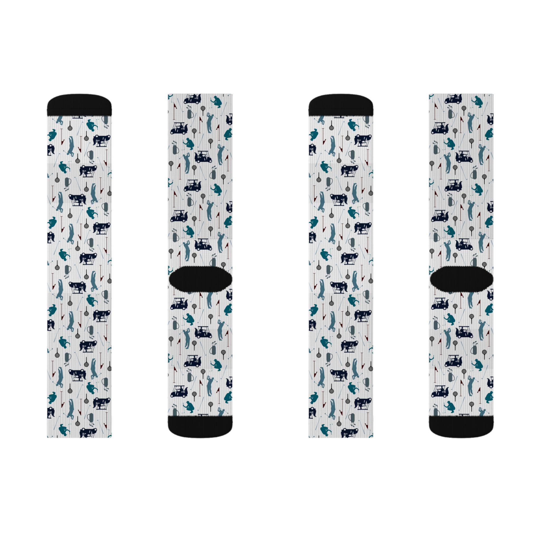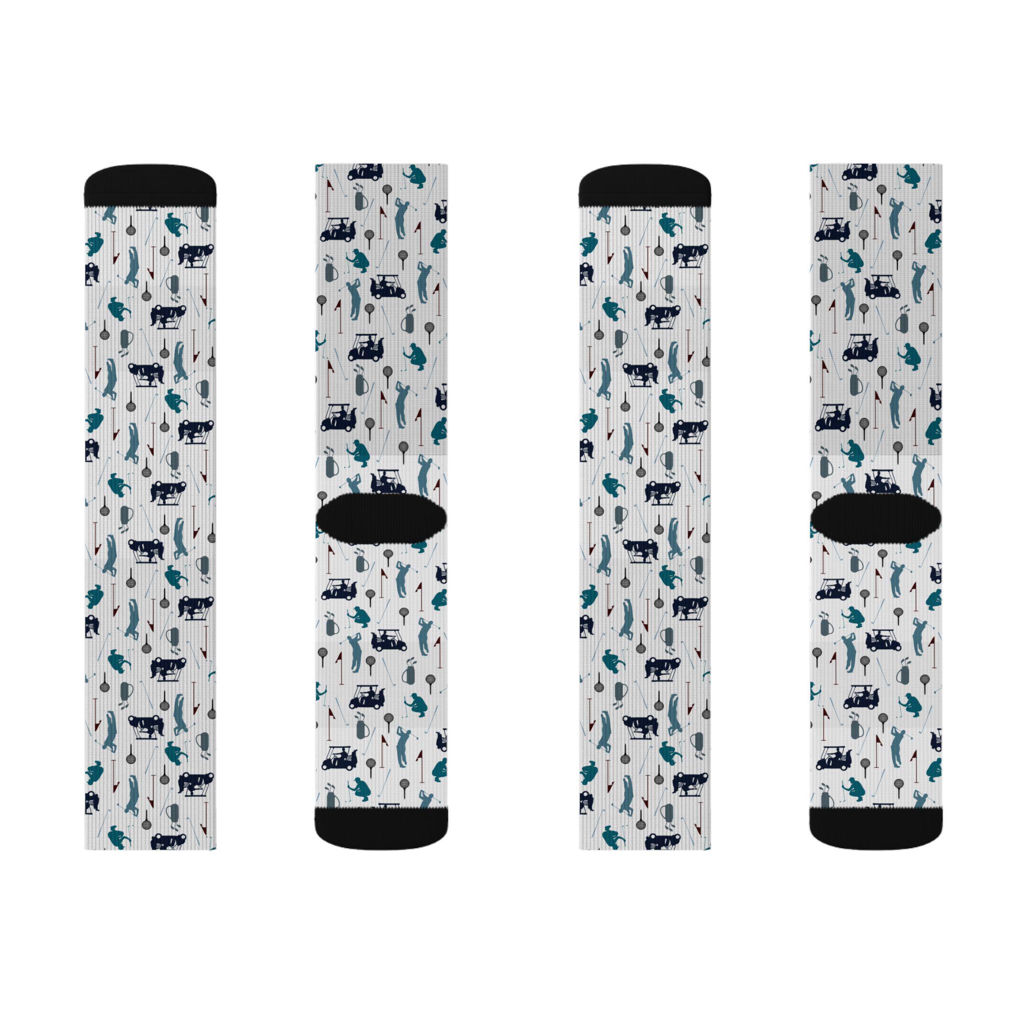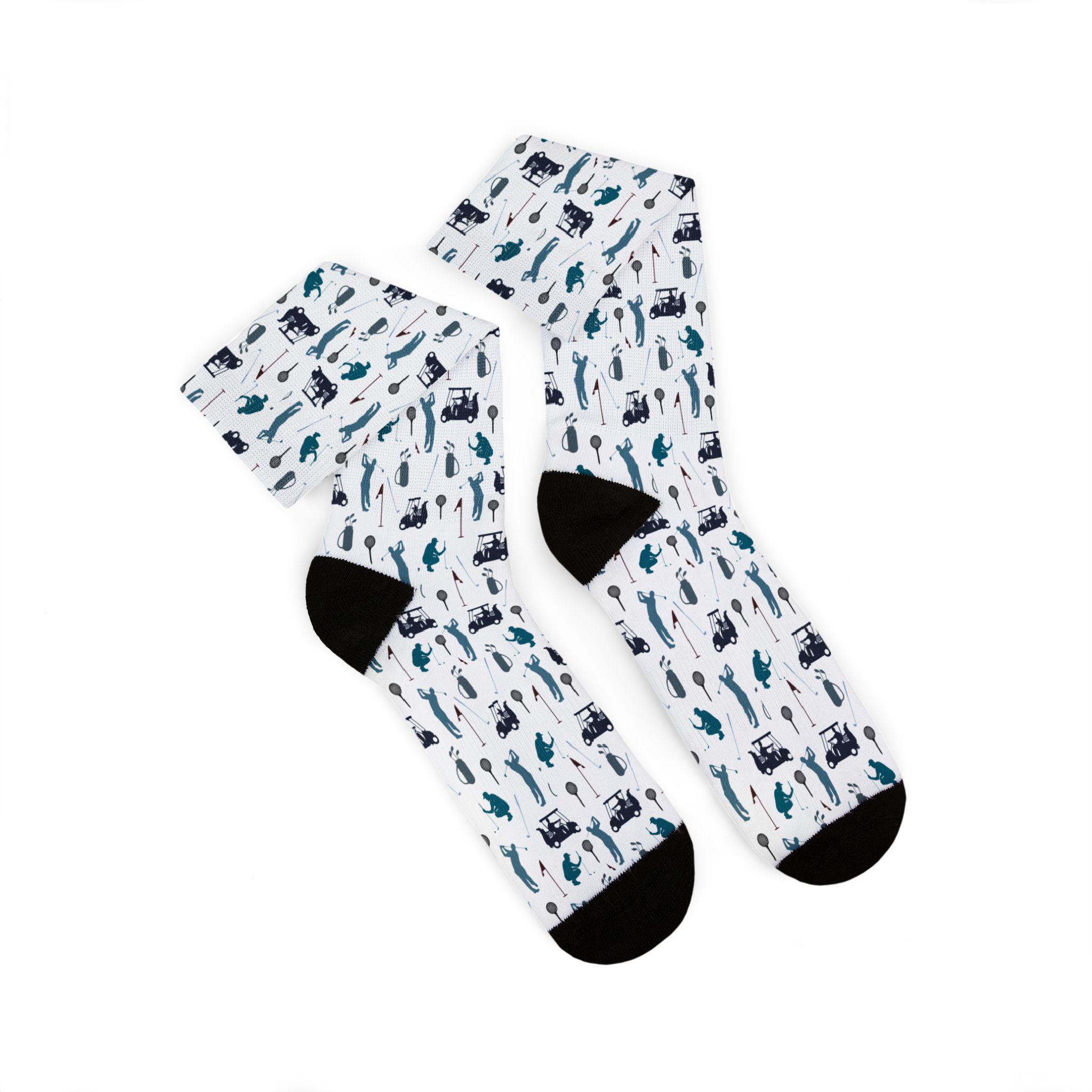 These golf-pattern crew socks bring the course to your feet. Soft fleece cushioning underfoot keeps walks between holes quiet and warm, while the crew length protects calves from early-morning chill and stray grass. The all-over print wraps the entire sock in a lively 18-hole motif, so your socks read like a miniature scorecard when you cross the fairway. Built from a stretchy polyester blend with ribbed tubes and cushioned bottoms, they move with your swing and stay put through every step. Sizes come in three options and the unisex regular fit makes them easy to share with your playing partners.