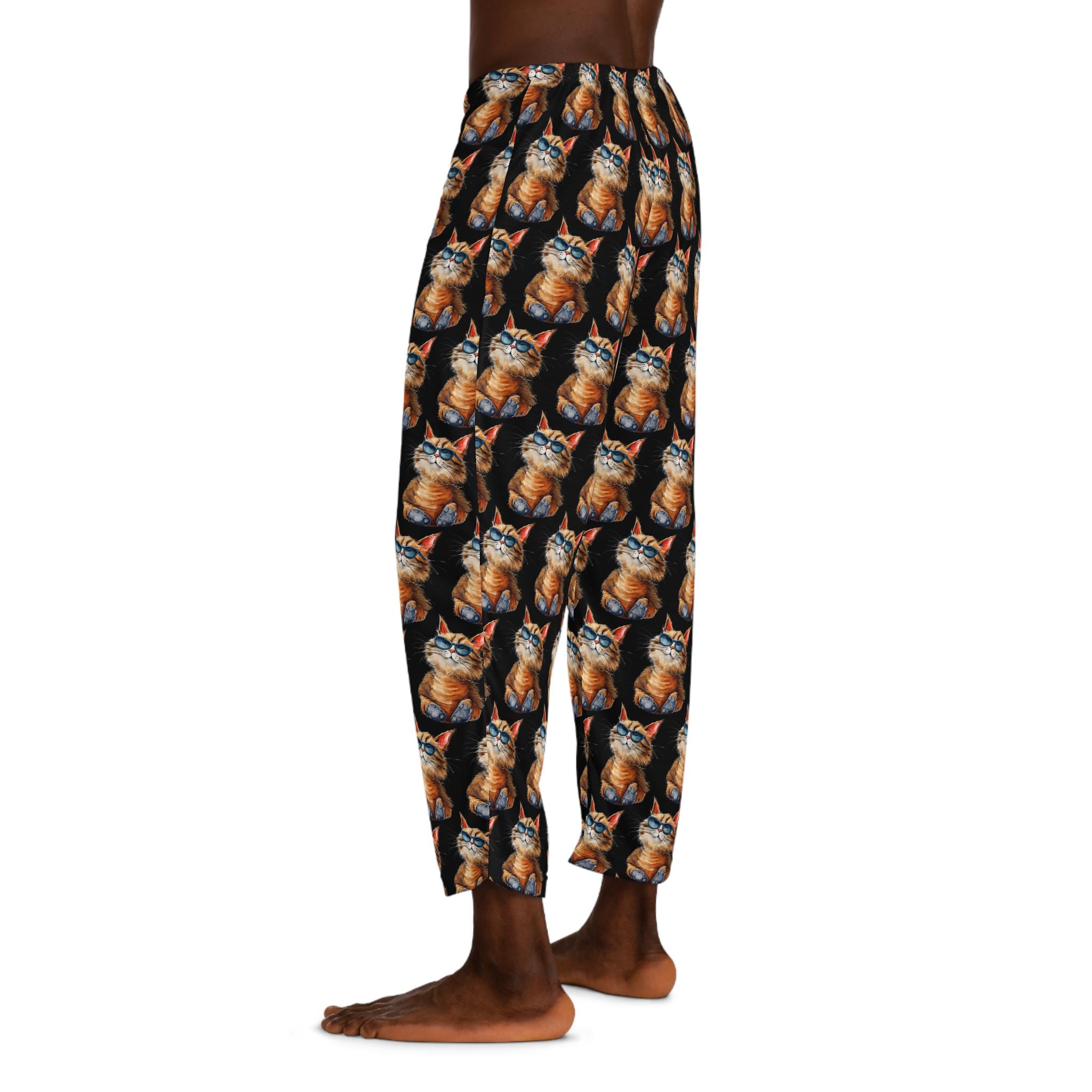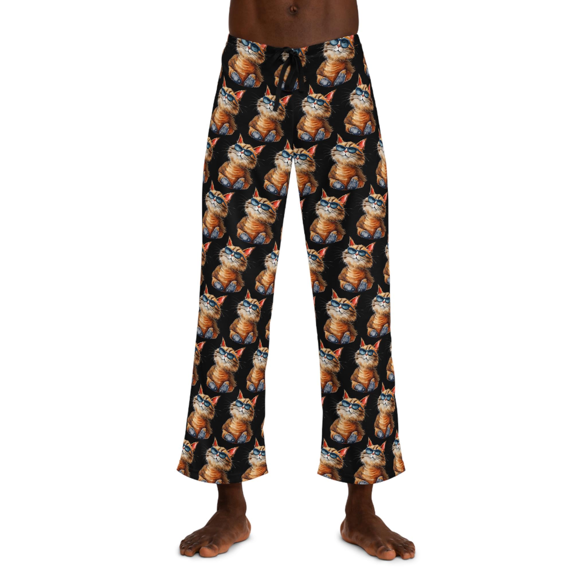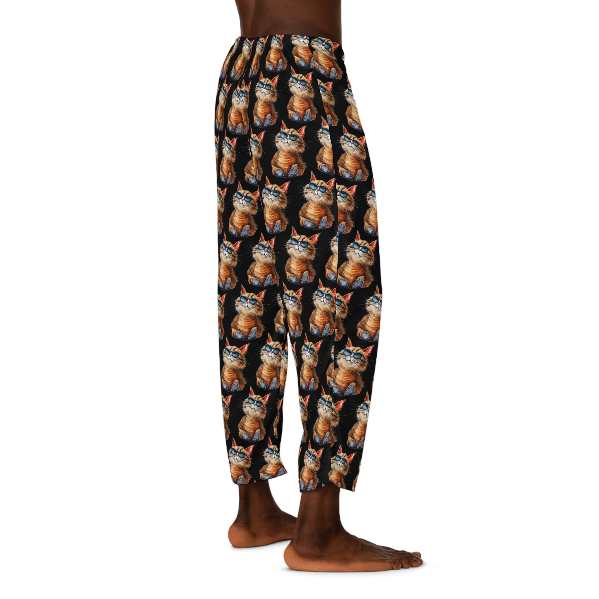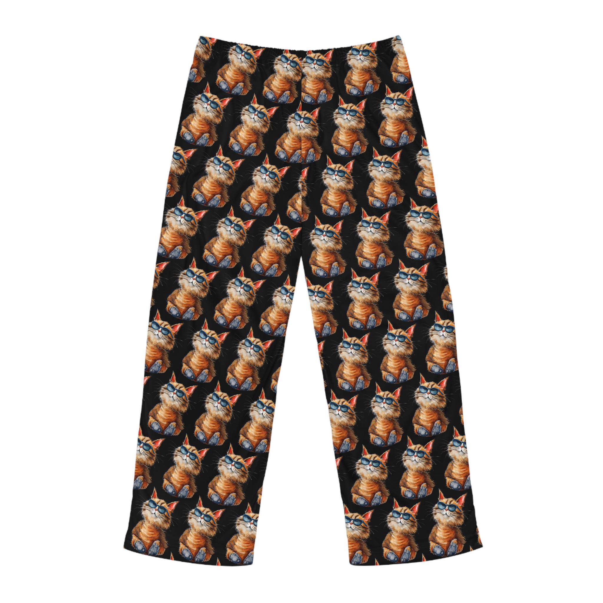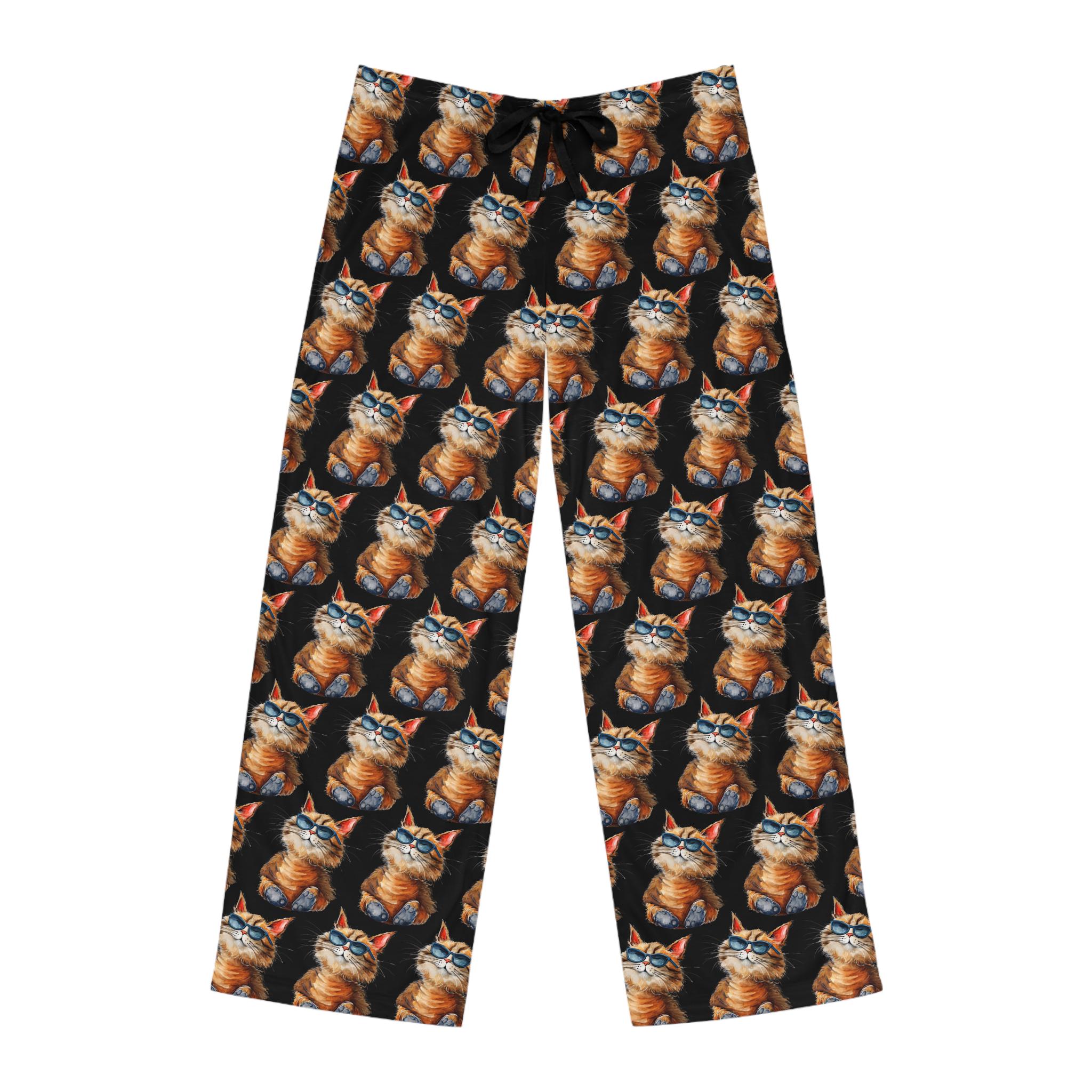 These lightweight pajama pants are a cozy nod to anyone who loves lounging with a side of whimsy. The all-over print features a confident, chubby cat motif on a deep black ground that makes the playful artwork pop. Cut for a relaxed fit with a back elastic and adjustable black drawstring, they sit easy around the waist and move with you through slow mornings, late-night reading, or binge-watching marathons. The polyester jersey keeps colors vivid and prints crisp, while double-needle stitching and thoughtful construction mean these pants hold up to repeated wear and washings. Slip them on after a long day and let the familiar, cheeky feline pattern set a lighthearted mood.