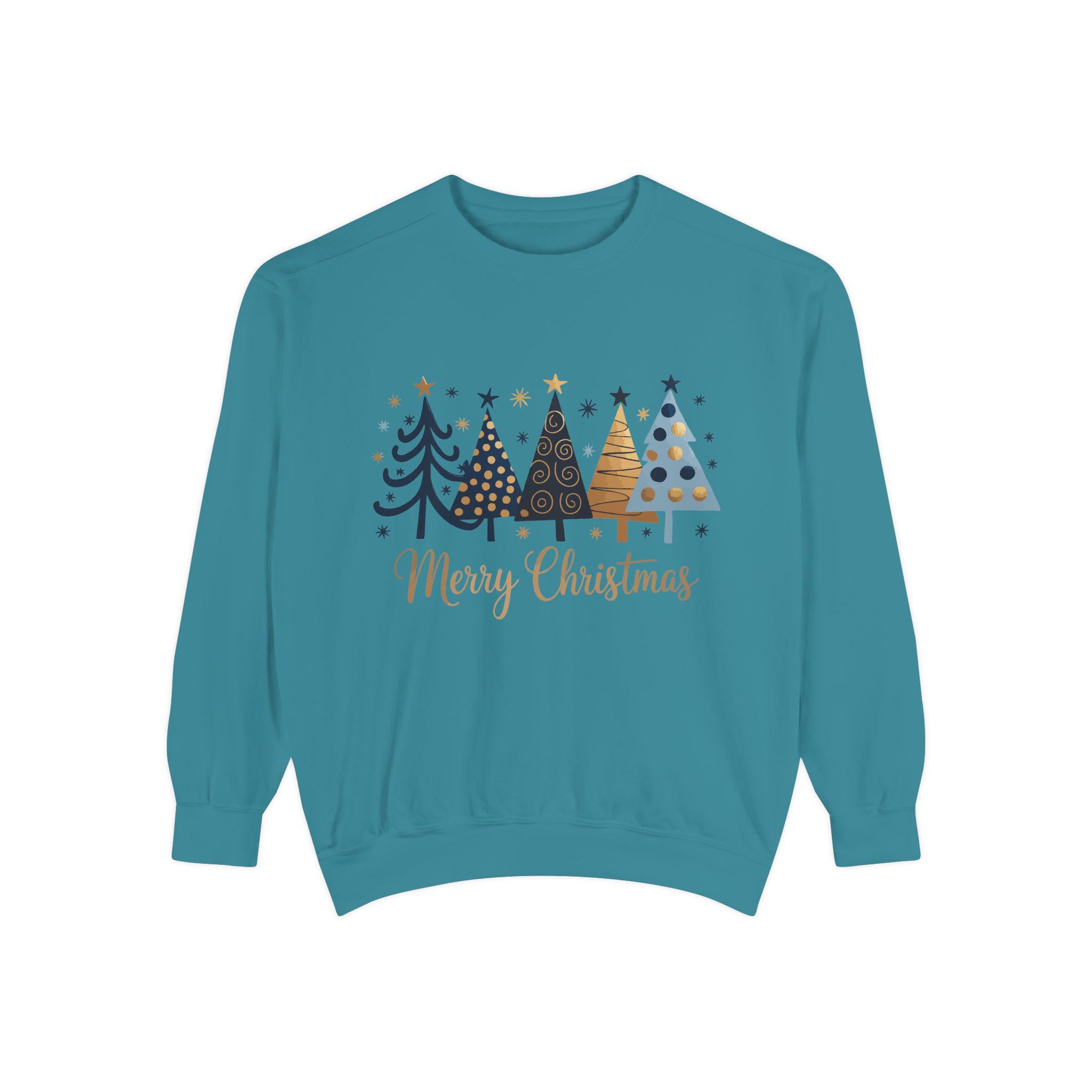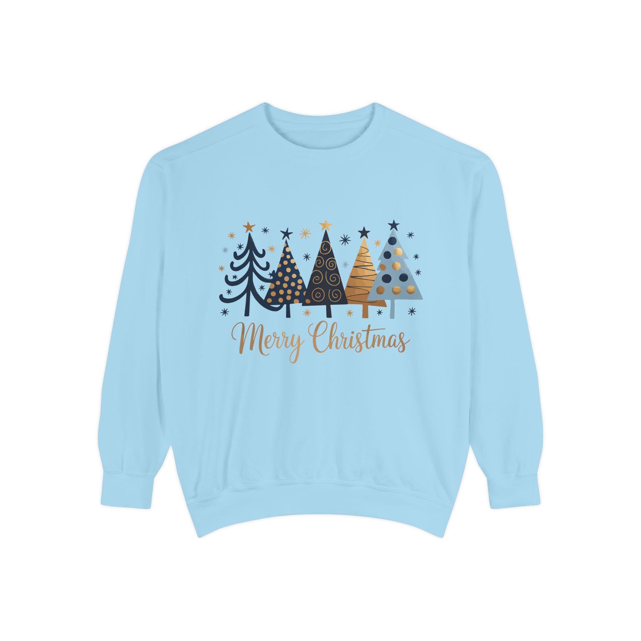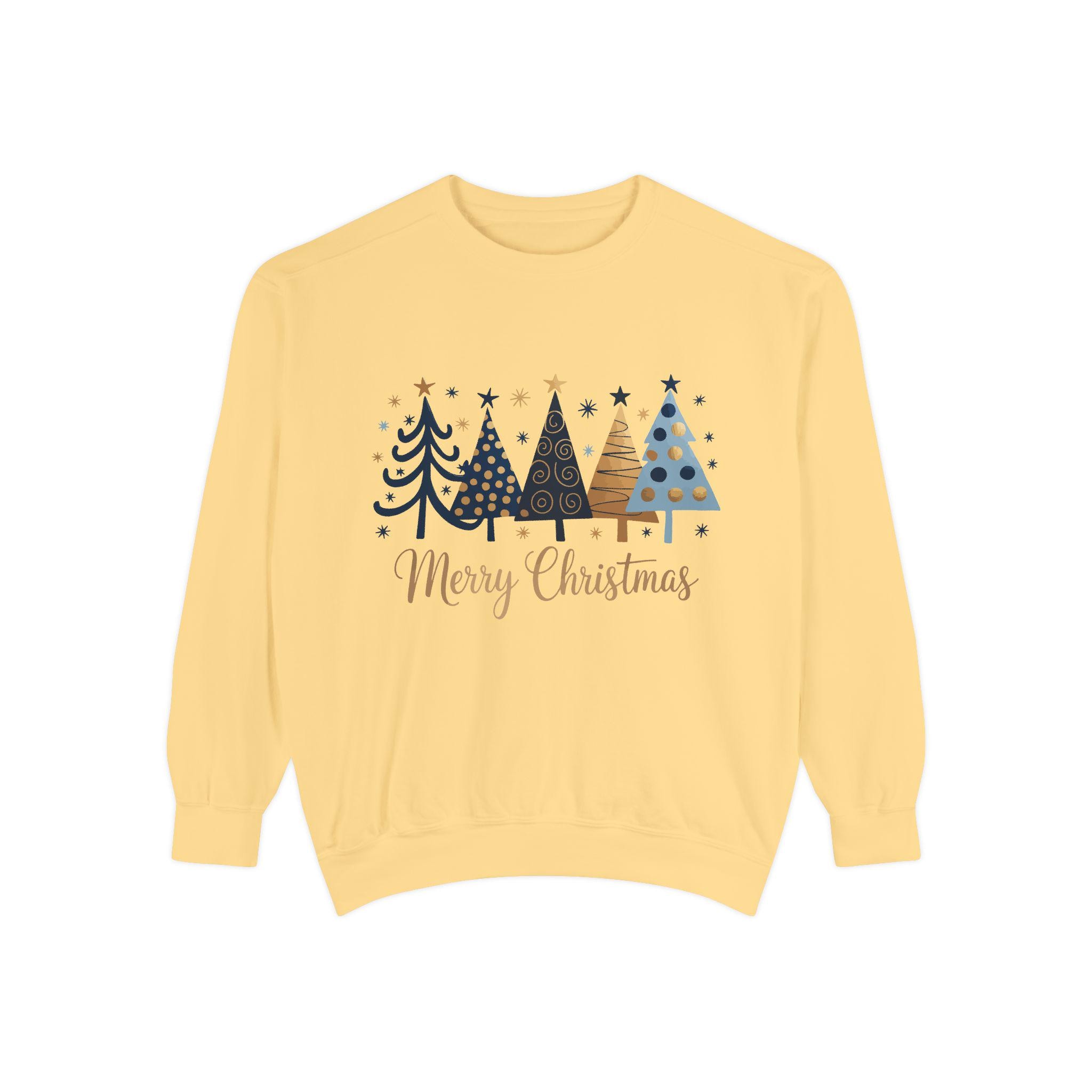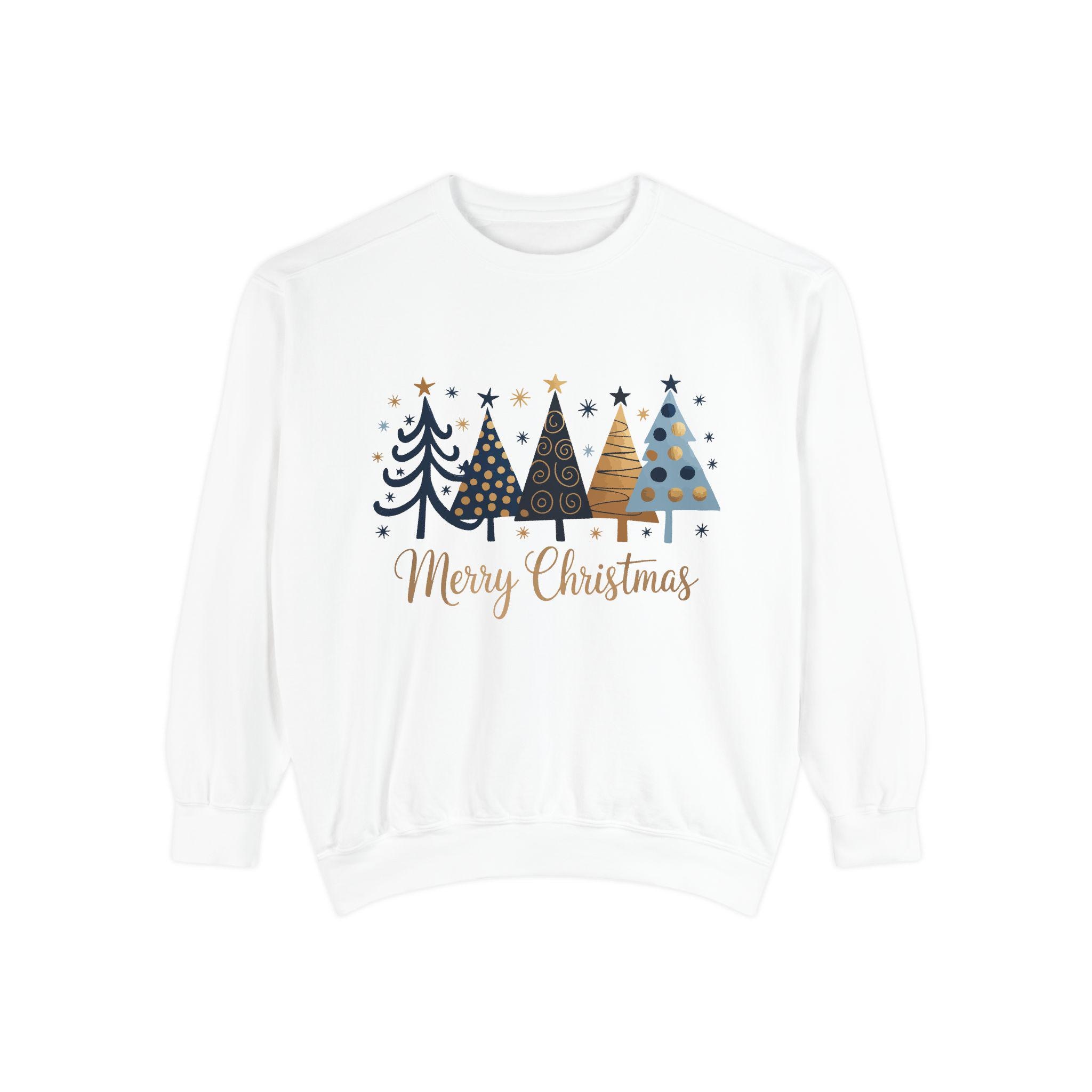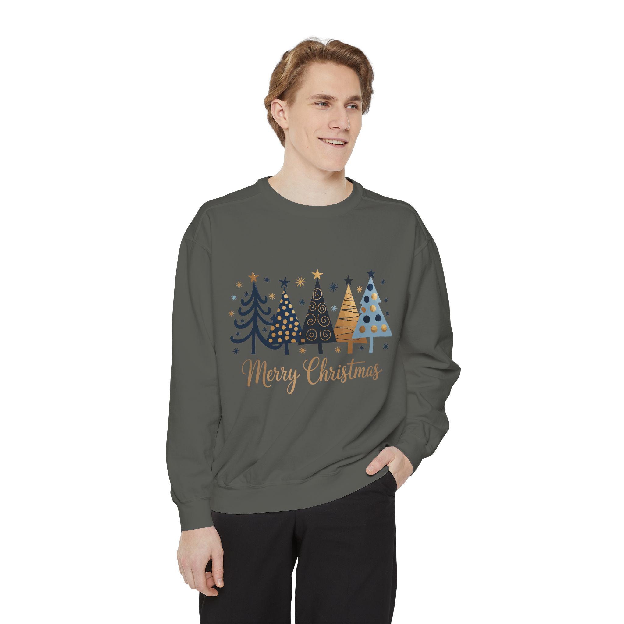 Soft, neutral, and quietly festive — this garment brings a modern holiday mood without shouting. Imagine a calm winter street: low light, a row of simple Christmas trees outlined against neutral fabric. The sweatshirt settles in like a familiar scarf, warm and slightly lived-in. It pairs with jeans or cozy leggings for errands, late-night porch cocoa, or a low-key family evening where comfort matters more than fuss. Subtle embroidered tree details add texture and a handcrafted touch that feels personal, not flashy. The relaxed fit and medium-heavy weight hug you just enough while letting you move freely. This is for people who prefer understated holiday style and want pieces that blend into everyday life while carrying a quiet seasonal spirit.