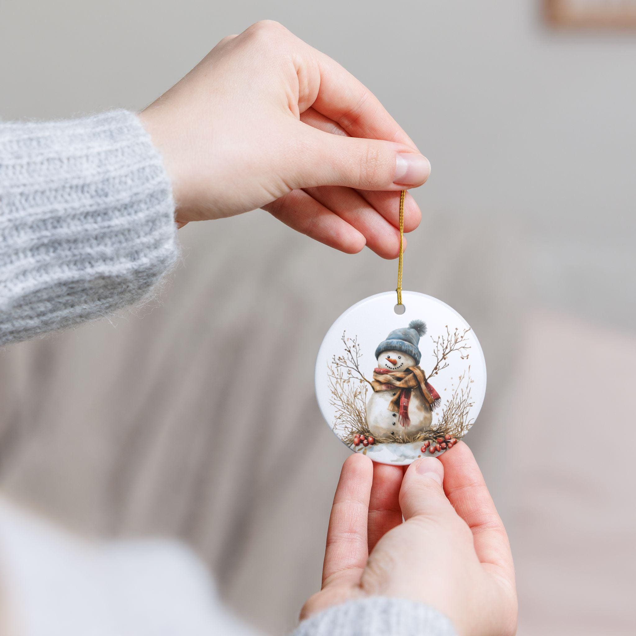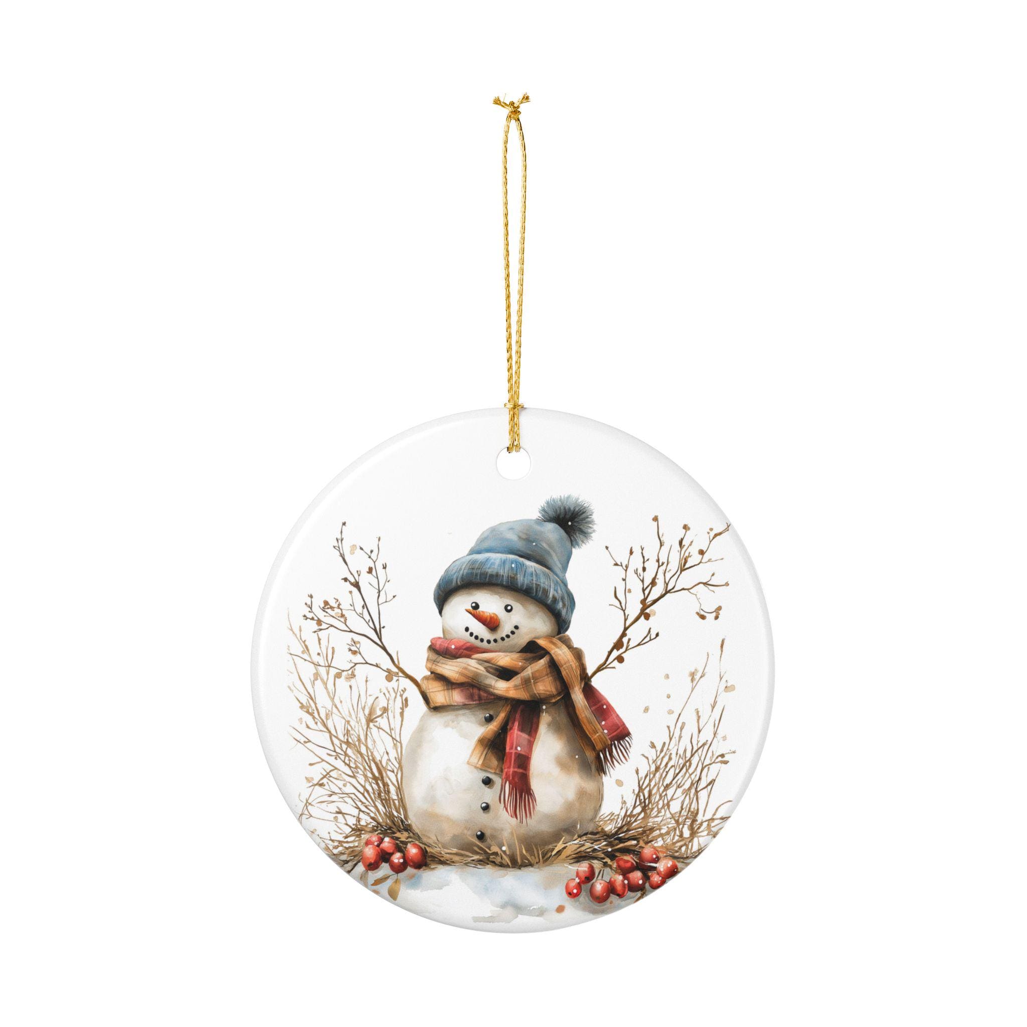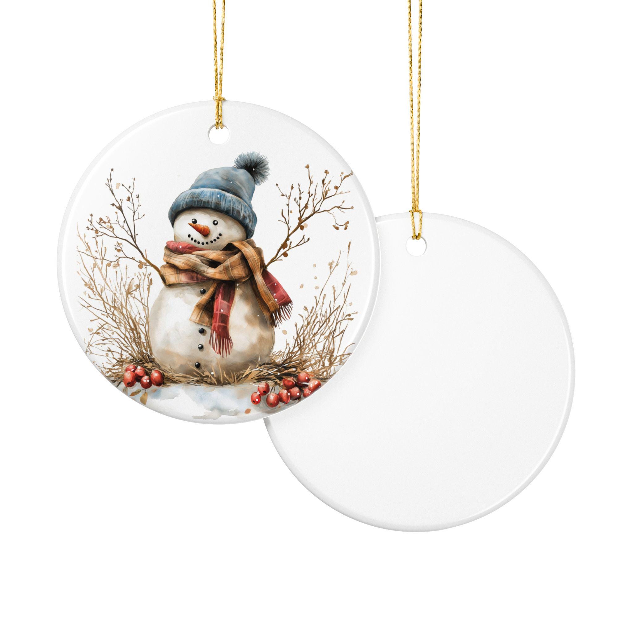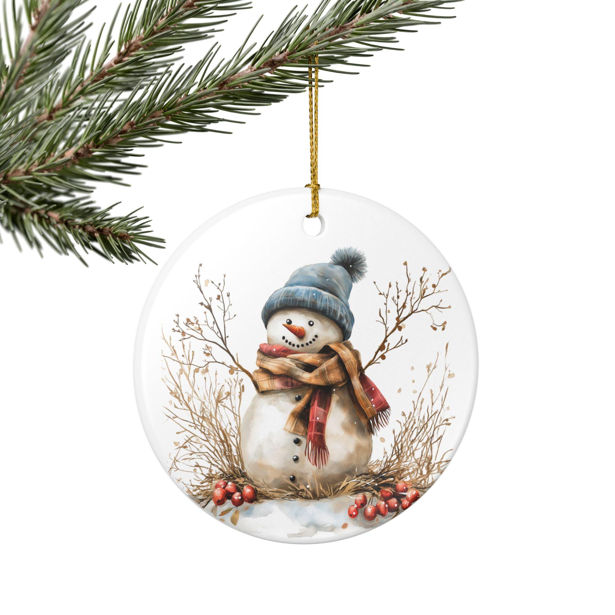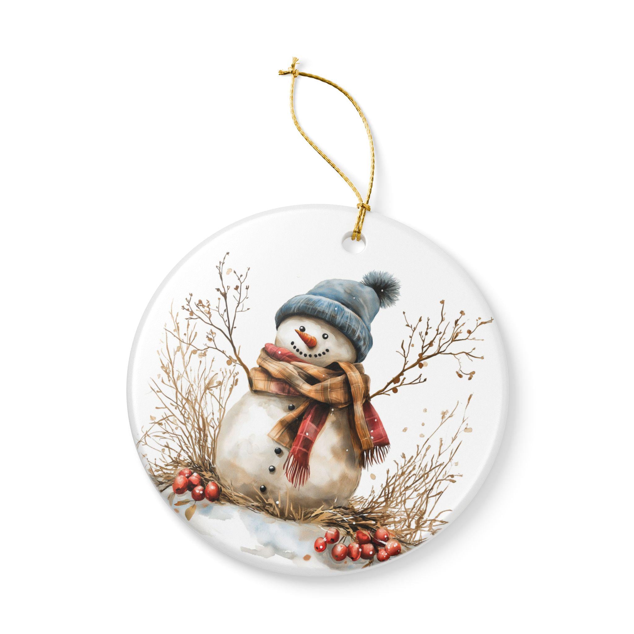 A small ceramic snowman ornament that brings quiet winter charm to your home. Hand-finished in glossy white ceramic with a soft matte print, the friendly snowman illustration feels like a page from a cozy holiday sketchbook. Hang it from the included golden string on a tree branch, mantle hook, or tucked into a wreath. It catches the light and holds a simple, warm presence — a gentle nod to evenings with hot drinks, low lights, and the hush after the first snowfall. Because it’s made from durable ceramic and decorated with a UV-stable print, it stays bright year after year, ready to return to the same spot on your holiday shelf or gift bundle. Each piece is sold individually and may show slight, charming variations in the hole placement, underscoring its handcrafted character.