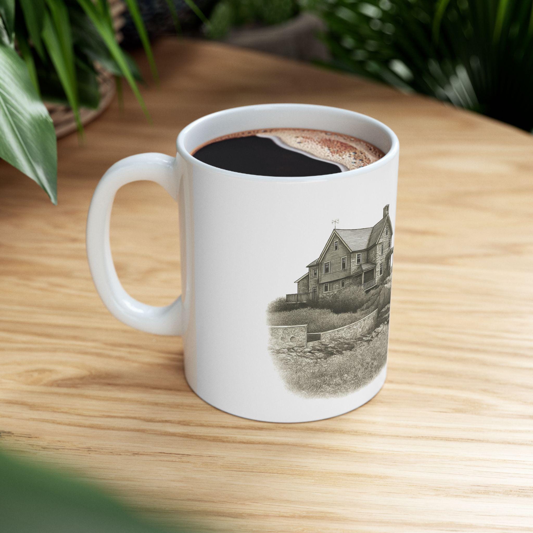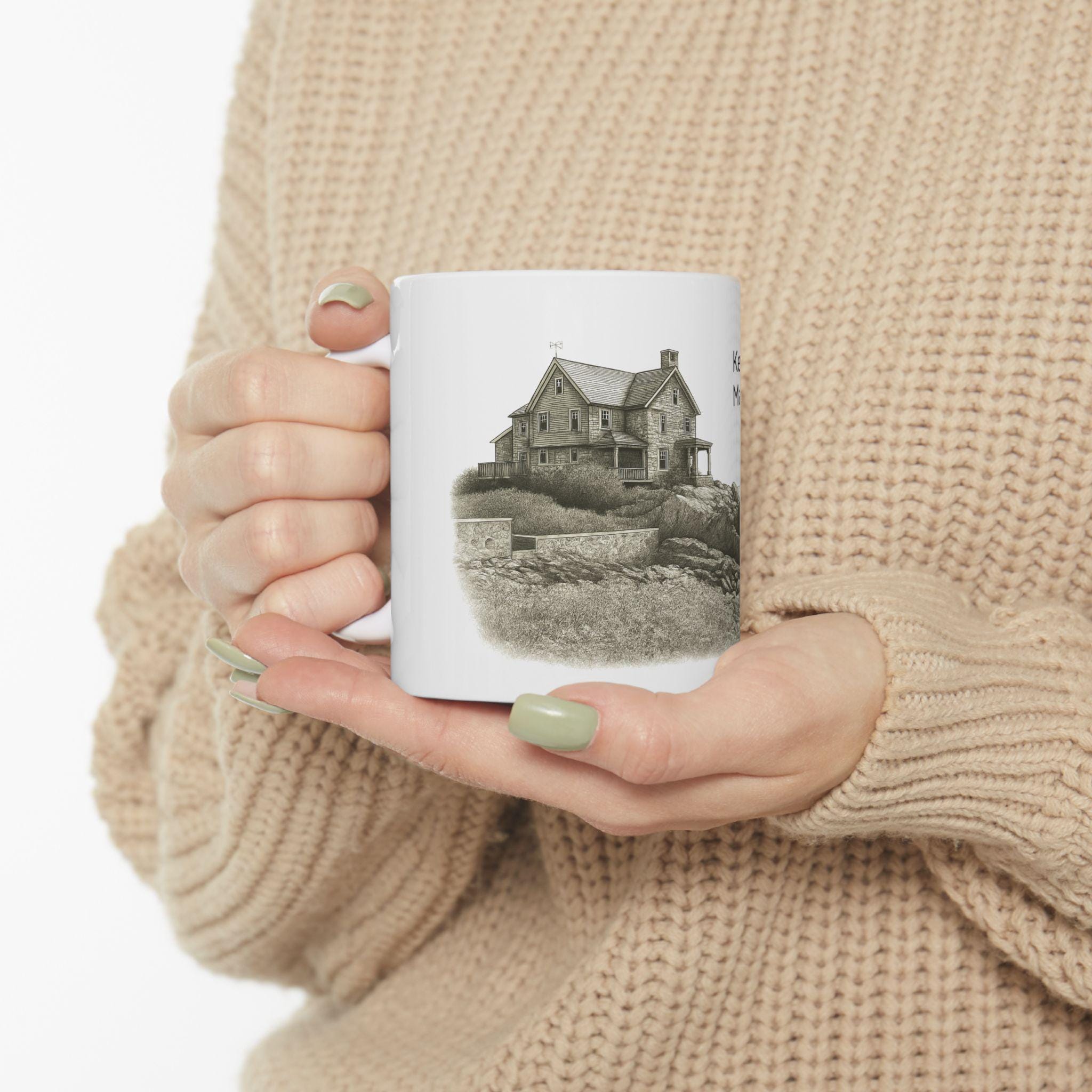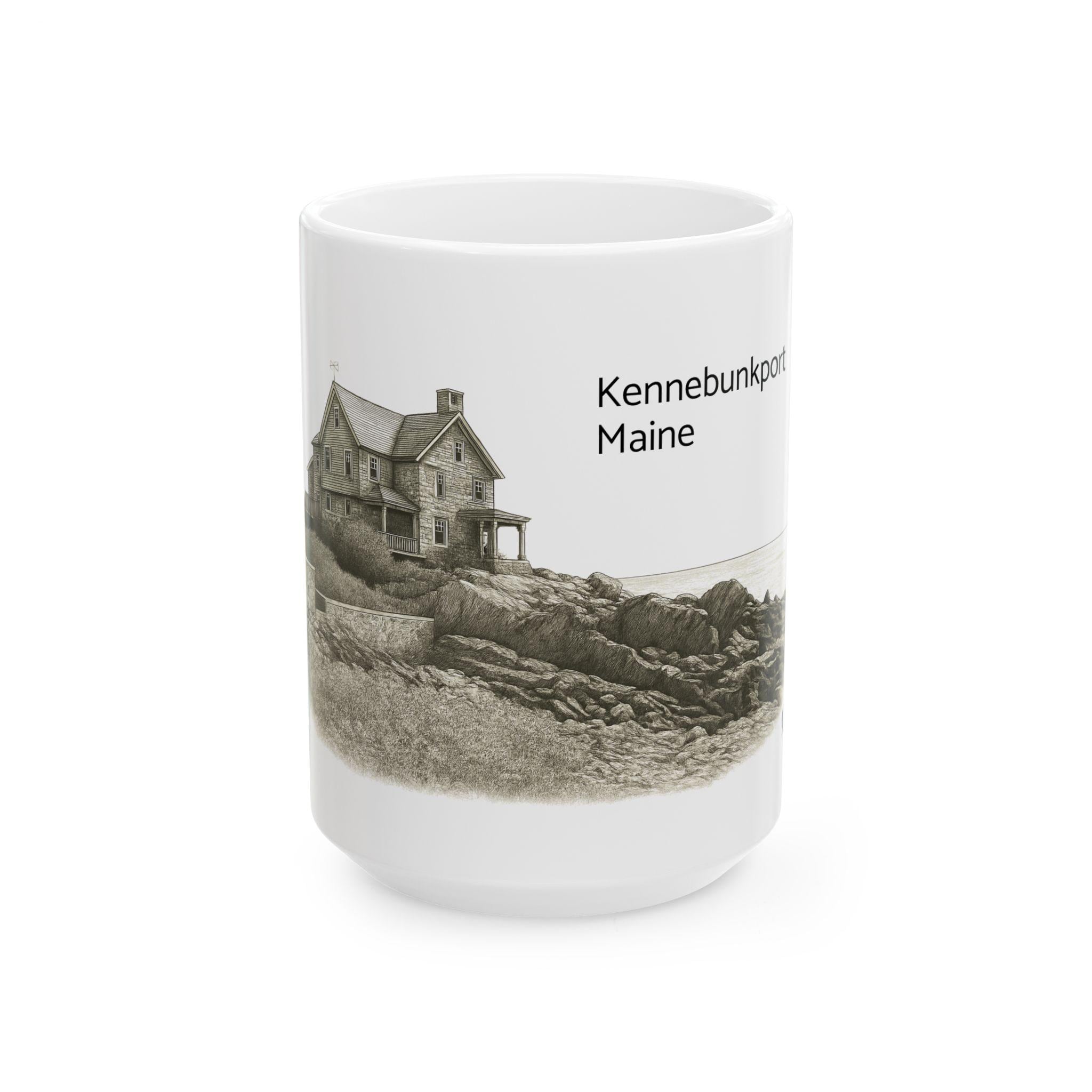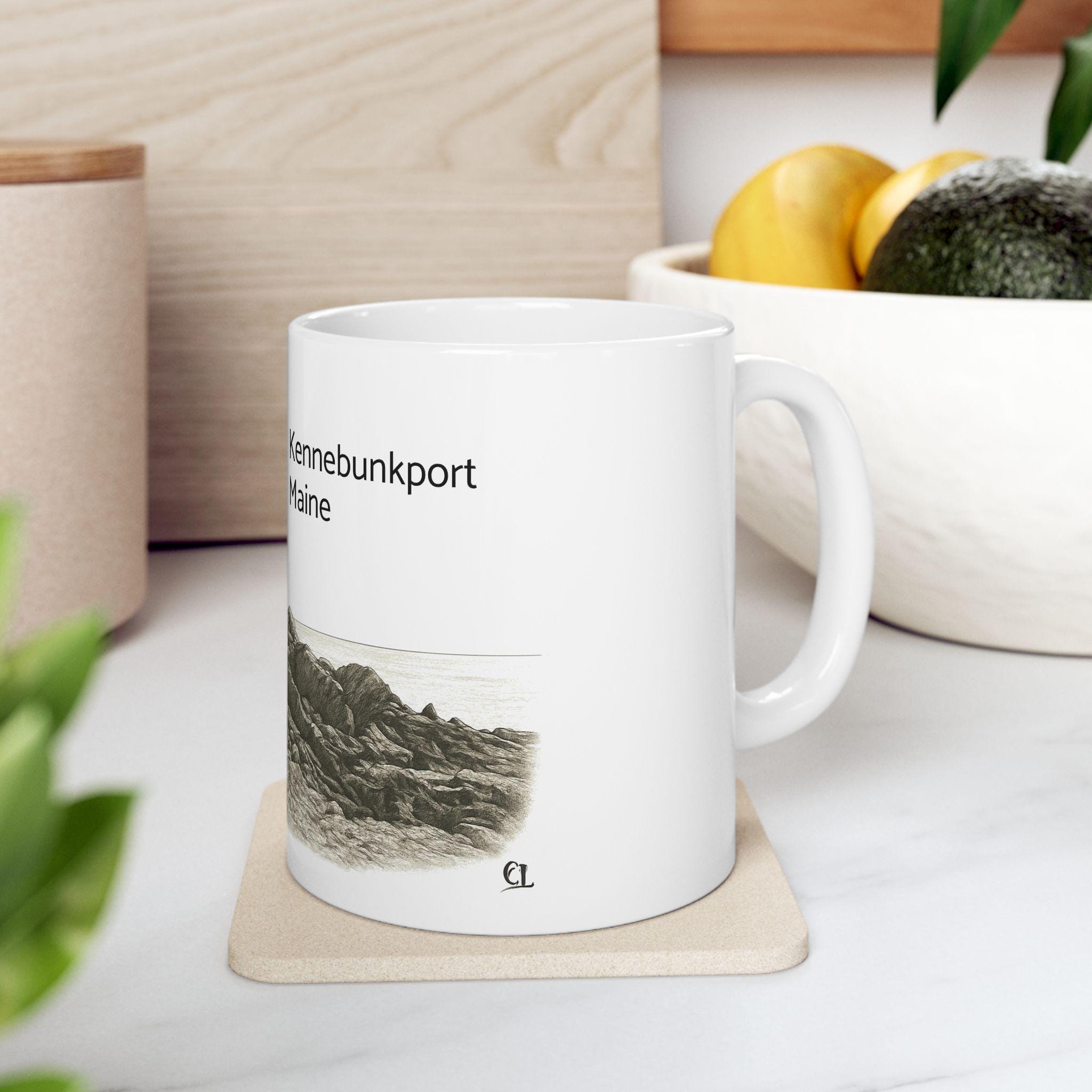 A crisp, coastal mug that carries the quiet charm of rocky shores and classic New England architecture. The white glossy ceramic showcases a detailed sepia-toned illustration of a clapboard house perched on windswept rocks with the simple label “Kennebunkport, Maine.” Each sip becomes a small trip back to foggy mornings, salt air, and slow conversation. Sturdy yet elegant, this mug sits naturally in hands that appreciate timeless scenes and subtle nostalgia — a daily companion for coffee, tea, or hot cocoa while you remember a place or plan the next coastal escape.
