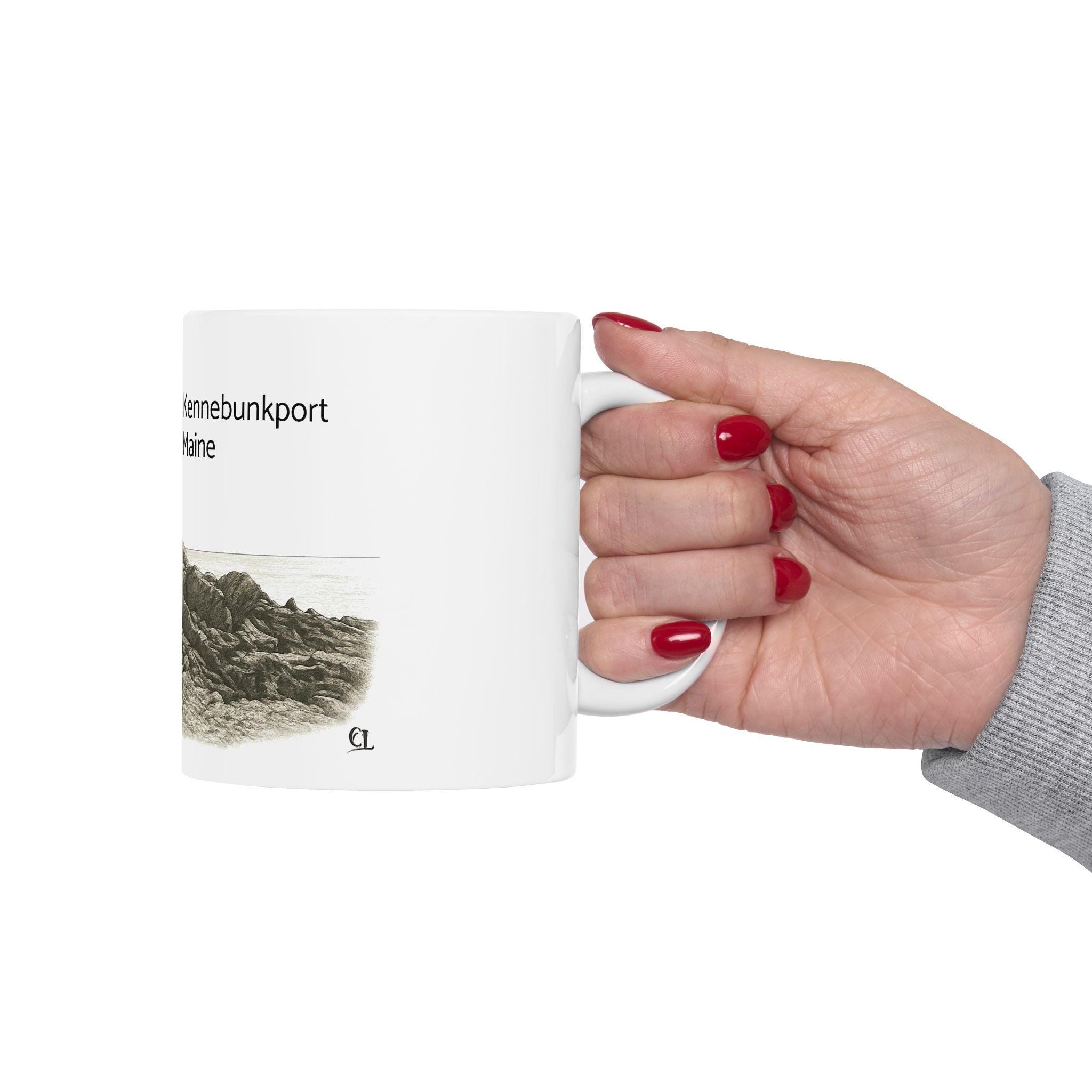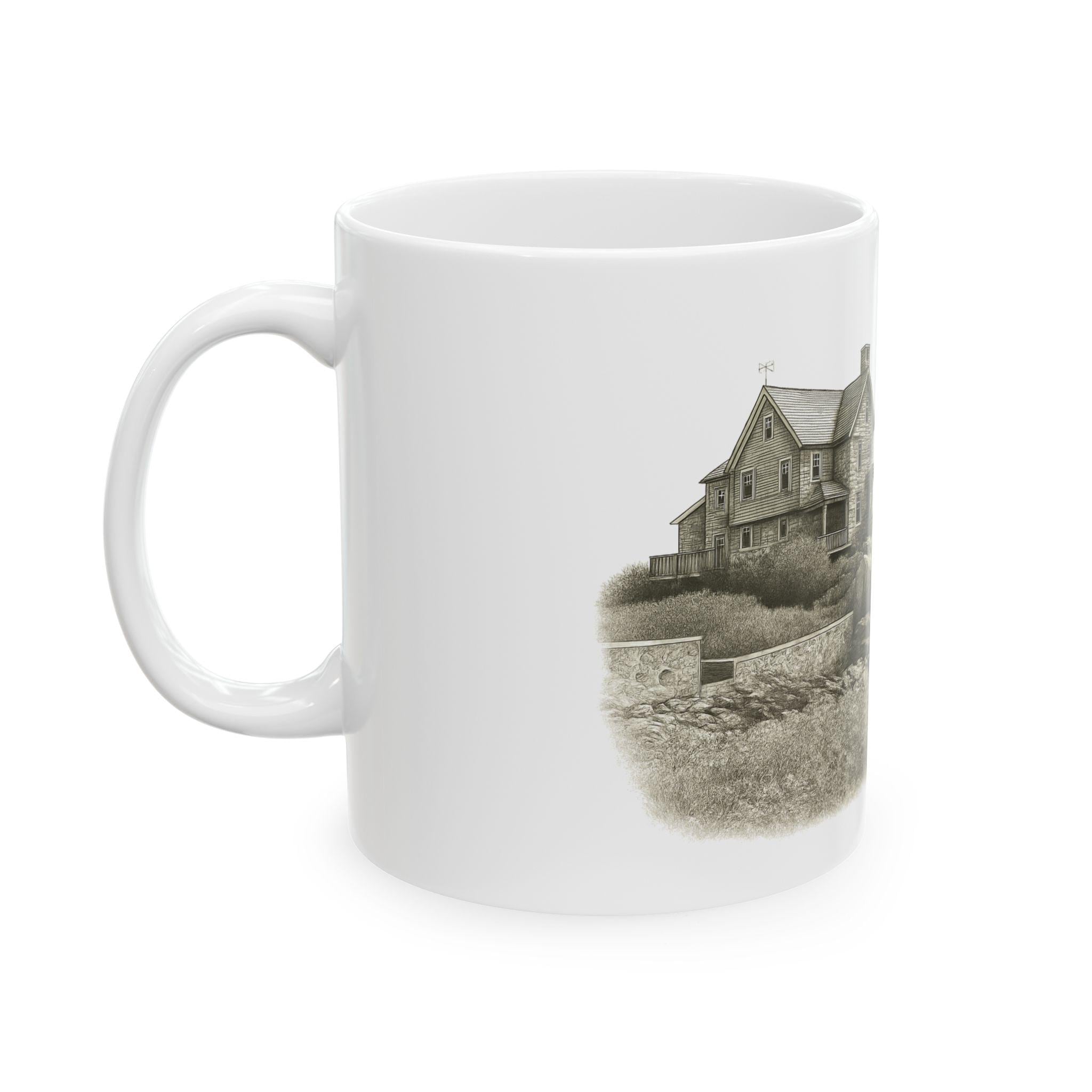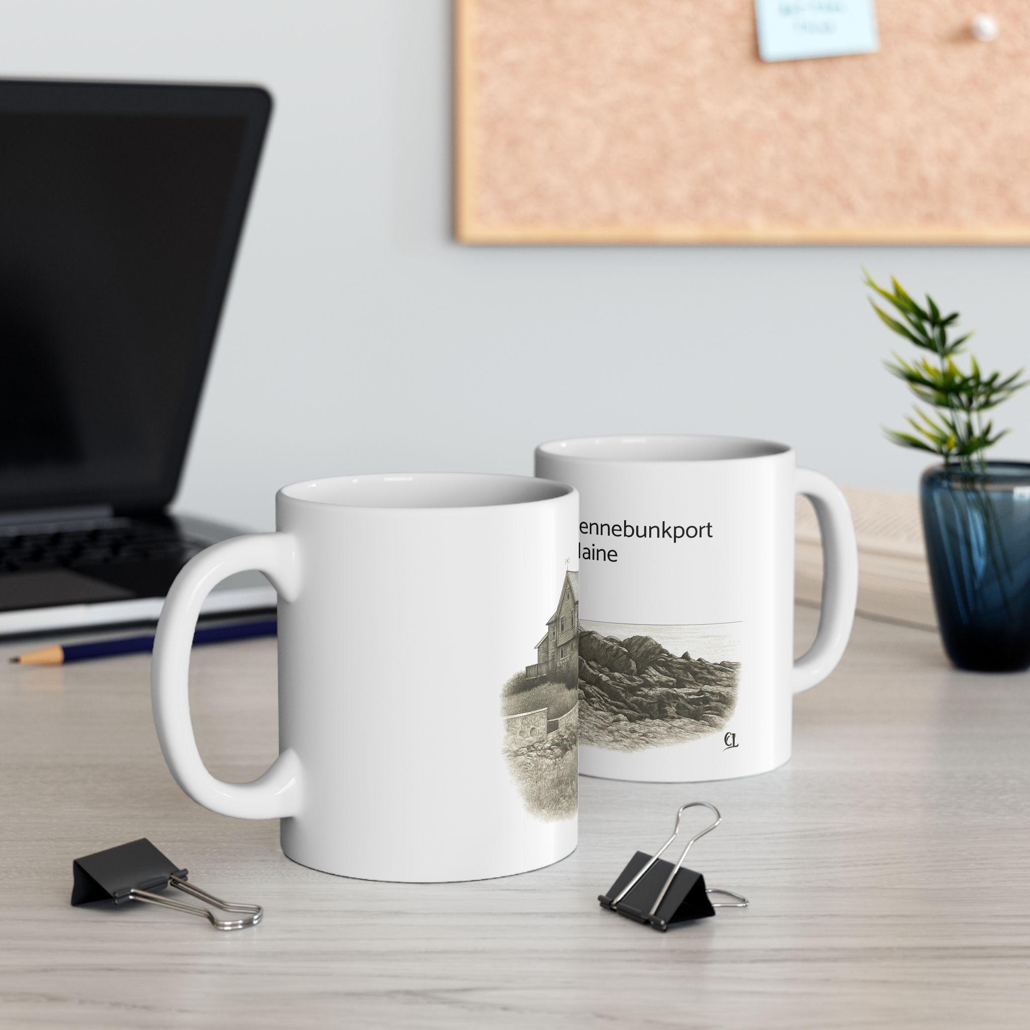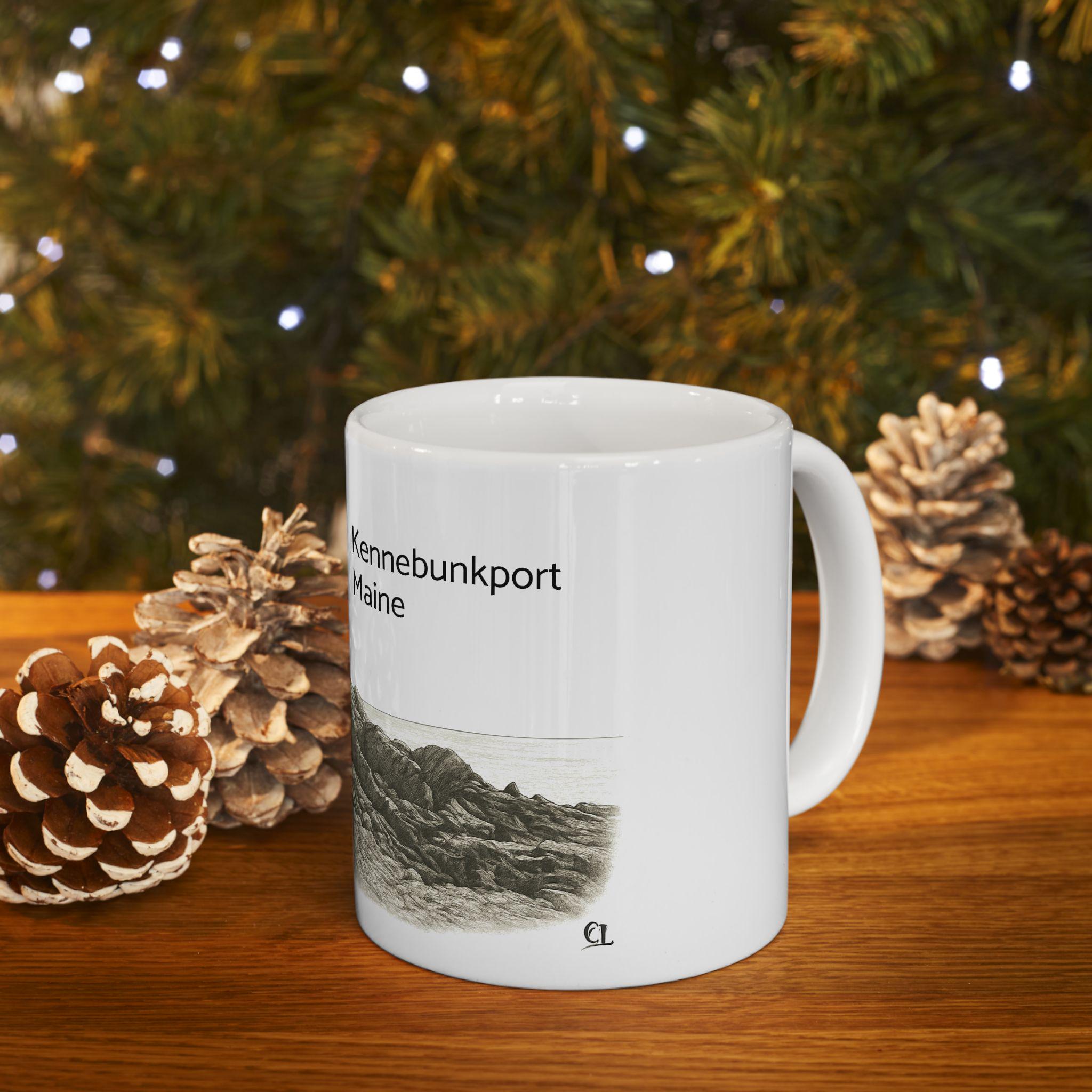 A crisp, coastal mug that carries the quiet charm of rocky shores and classic New England architecture. The white glossy ceramic showcases a detailed sepia-toned illustration of a clapboard house perched on windswept rocks with the simple label “Kennebunkport, Maine.” Each sip becomes a small trip back to foggy mornings, salt air, and slow conversation. Sturdy yet elegant, this mug sits naturally in hands that appreciate timeless scenes and subtle nostalgia — a daily companion for coffee, tea, or hot cocoa while you remember a place or plan the next coastal escape.