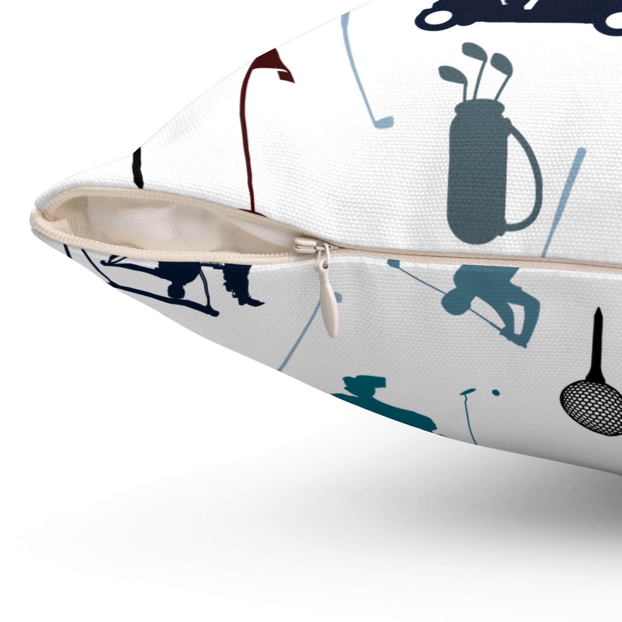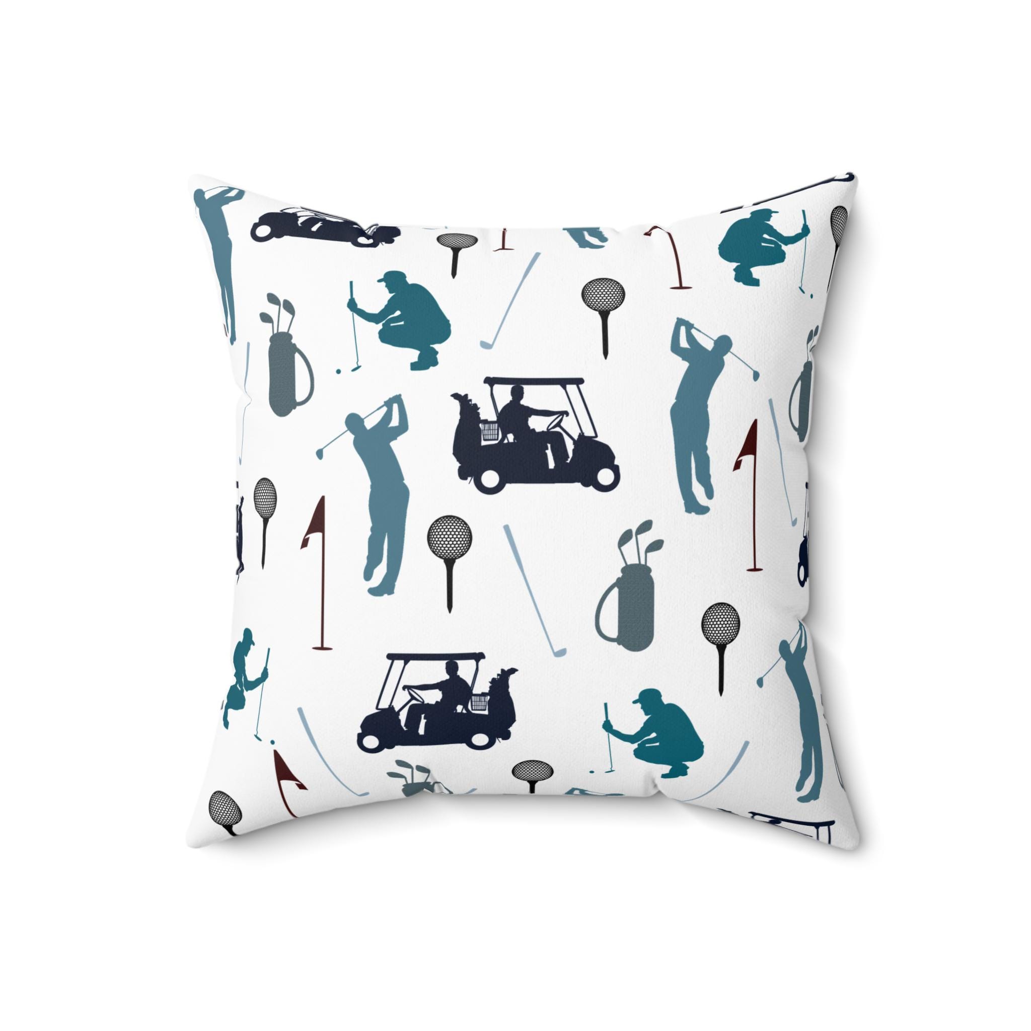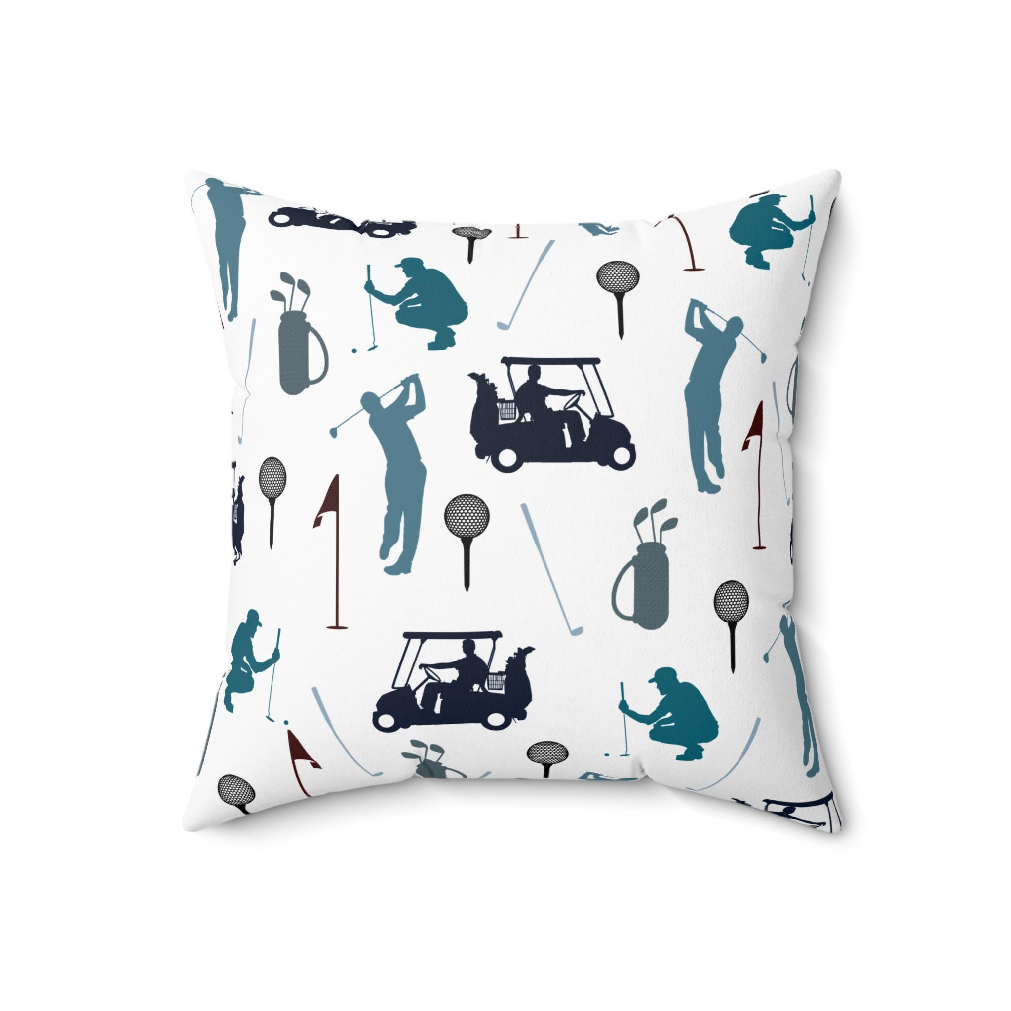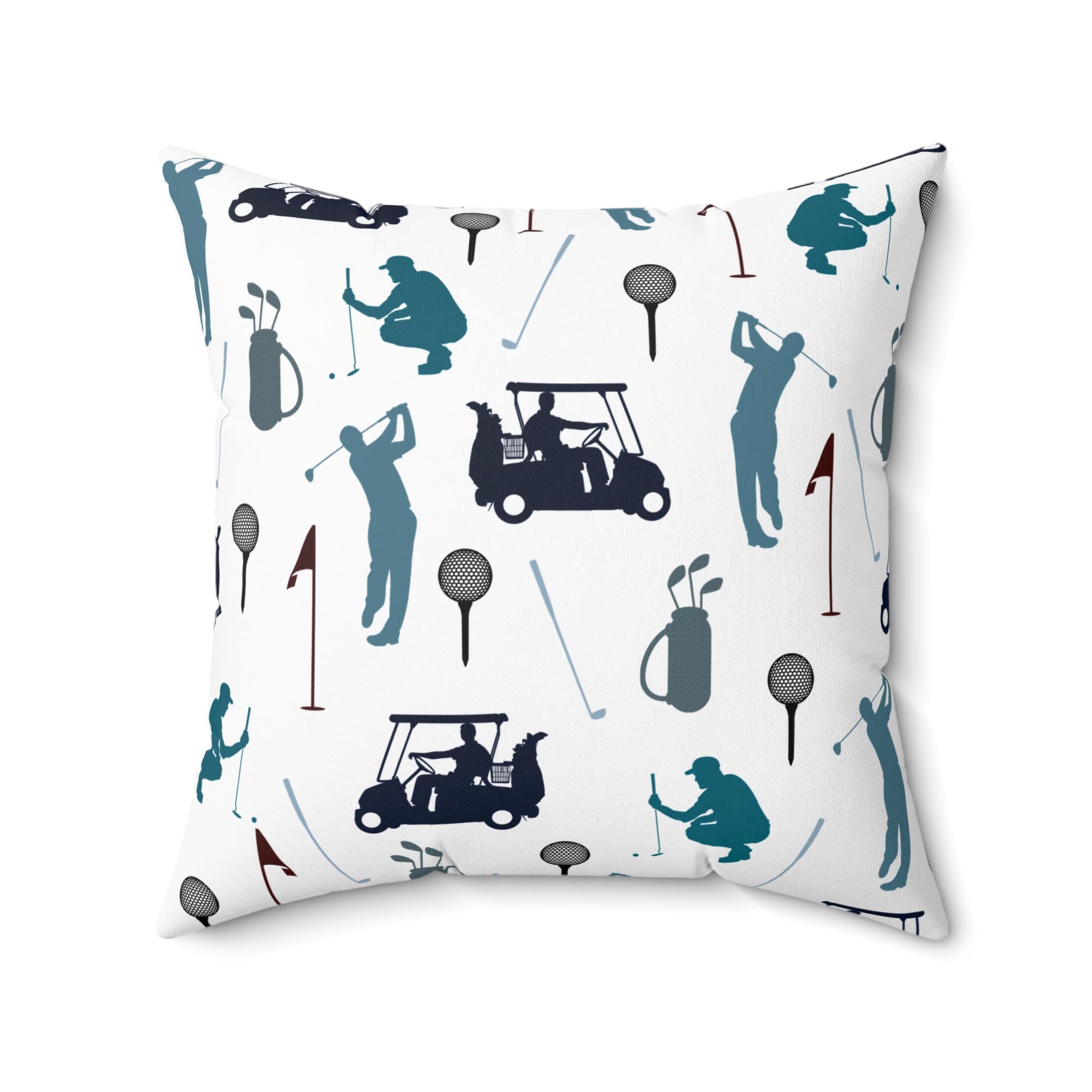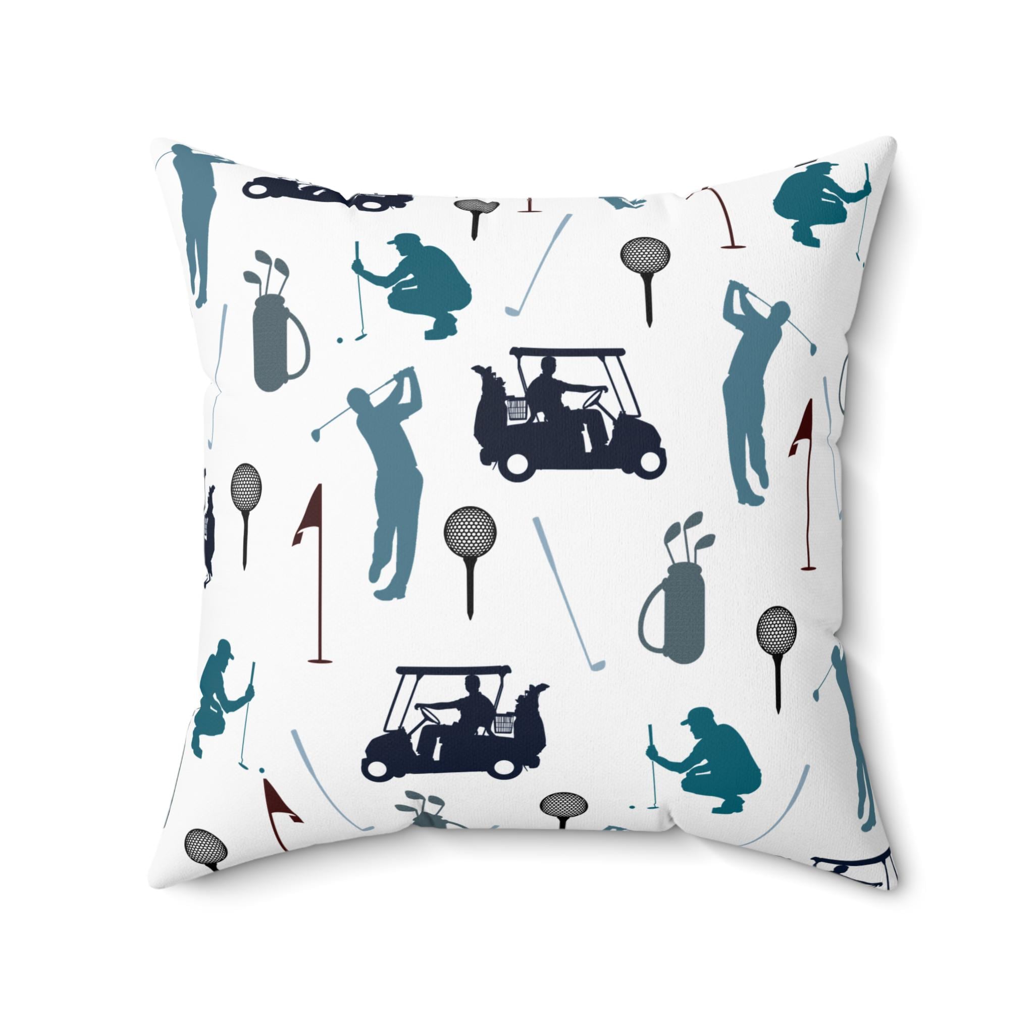 Soft, clean, and quietly playful — this square pillow brings a golfer’s world into any living space. Lightweight spun polyester keeps the cover smooth and wrinkle-free, while the recycled polyester insert is intentionally oversized so the cushion fills out plump and springy when you assemble it. The double-sided print shows silhouetted golfers, carts, clubs, tees, and flags in a calm, muted palette that reads modern yet familiar. Tuck it on a sofa, line the bench in your entryway, or lay it on a sunlit porch where post-round conversations and slow afternoons happen. It pairs especially well with neutral linens and cottage or clubhouse-inspired decor, adding a subtle sporty note without shouting for attention.