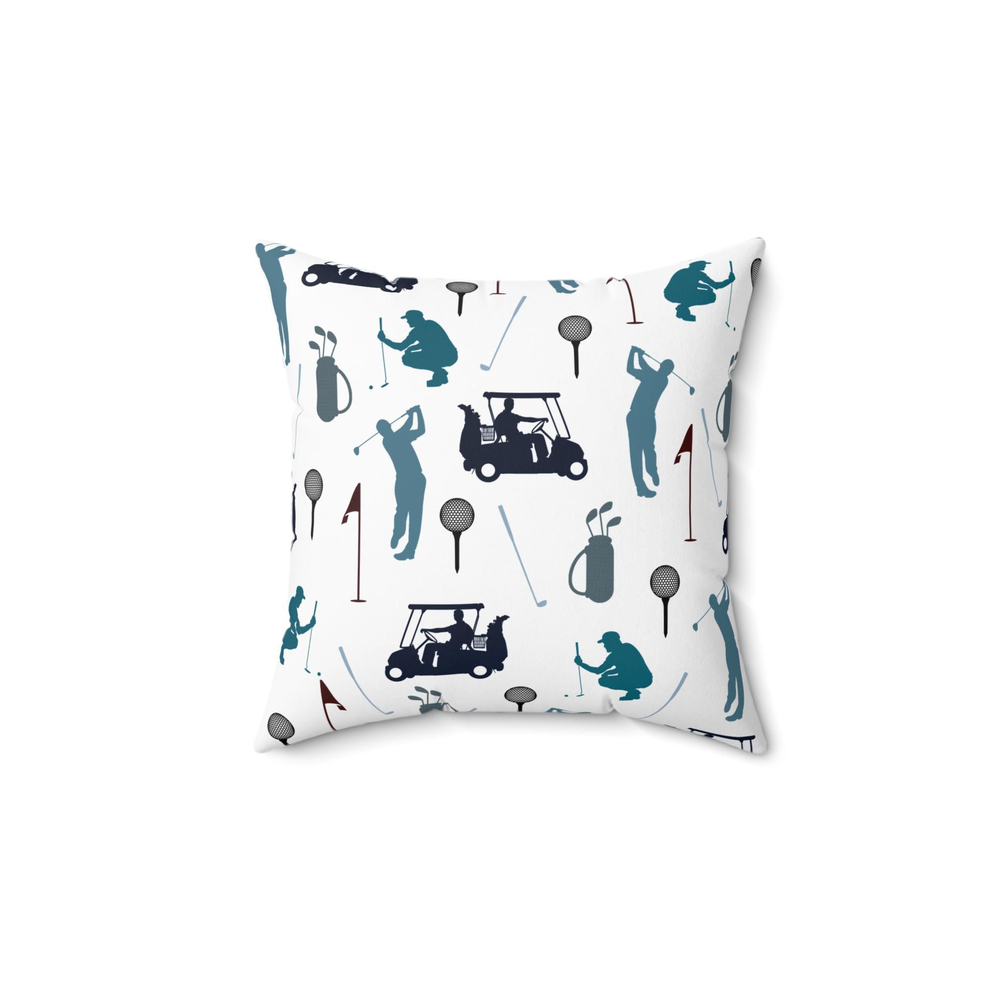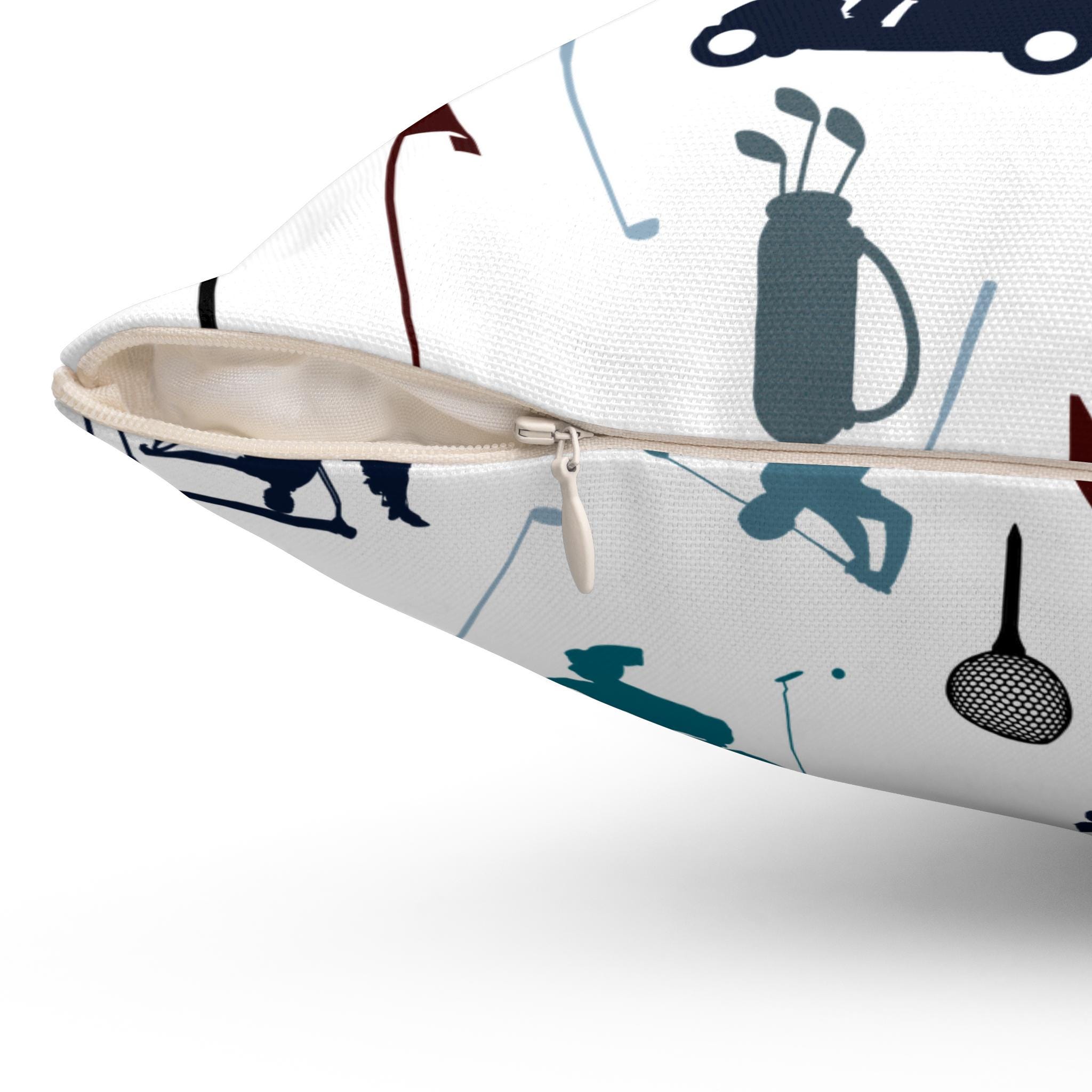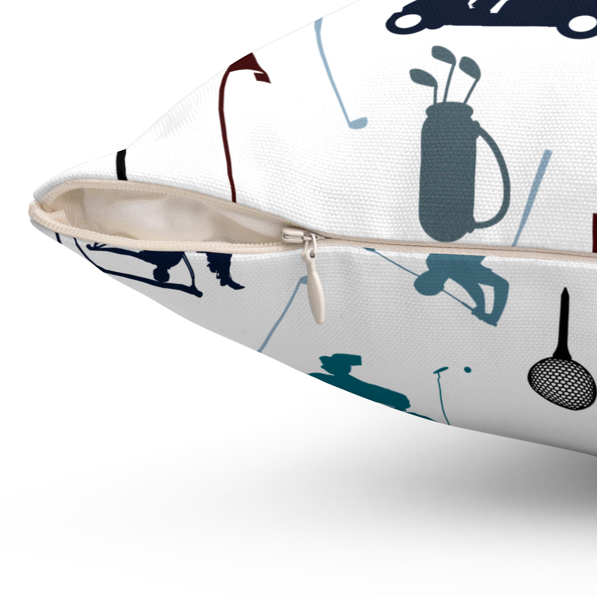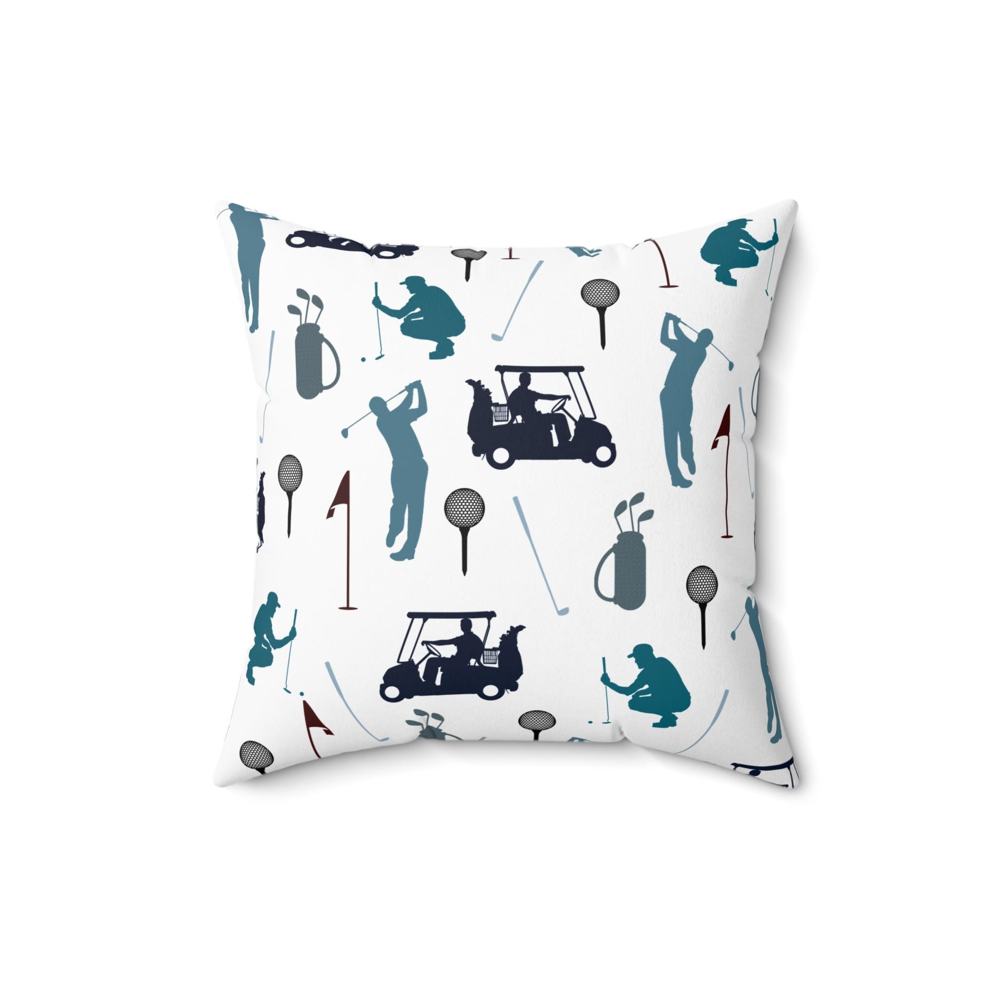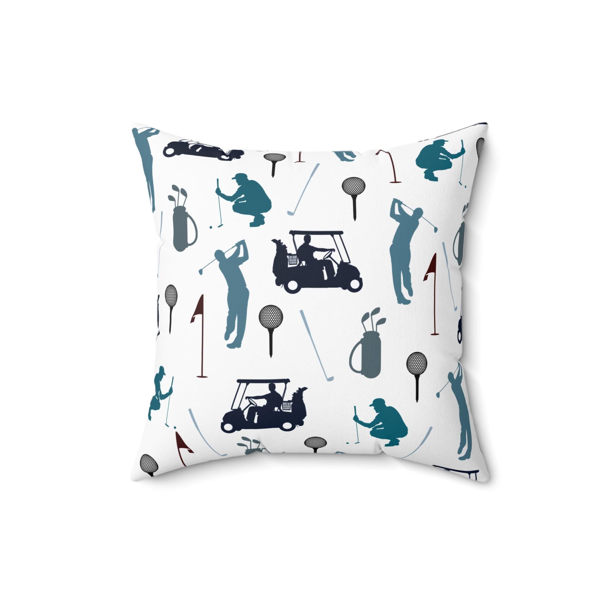 Soft, clean, and quietly playful — this square pillow brings a golfer’s world into any living space. Lightweight spun polyester keeps the cover smooth and wrinkle-free, while the recycled polyester insert is intentionally oversized so the cushion fills out plump and springy when you assemble it. The double-sided print shows silhouetted golfers, carts, clubs, tees, and flags in a calm, muted palette that reads modern yet familiar. Tuck it on a sofa, line the bench in your entryway, or lay it on a sunlit porch where post-round conversations and slow afternoons happen. It pairs especially well with neutral linens and cottage or clubhouse-inspired decor, adding a subtle sporty note without shouting for attention.