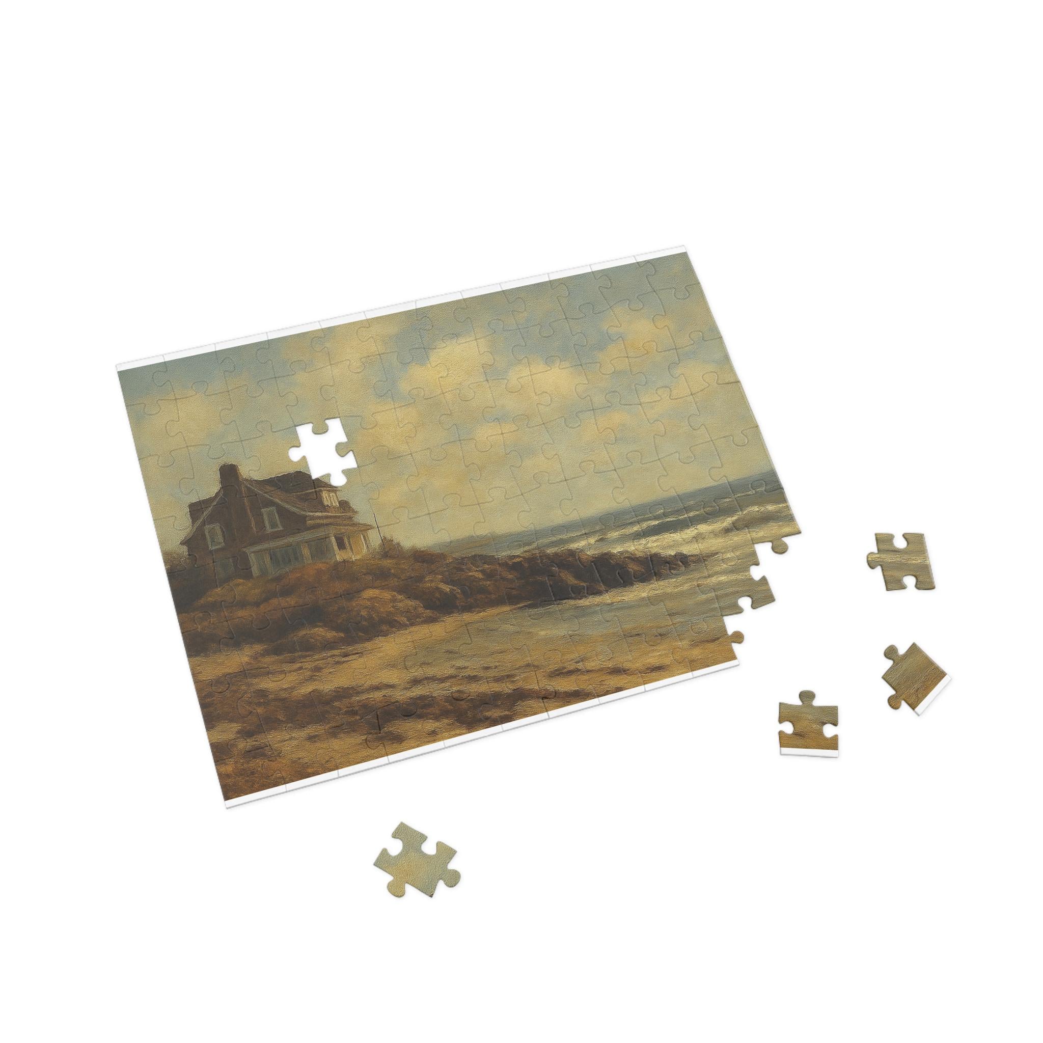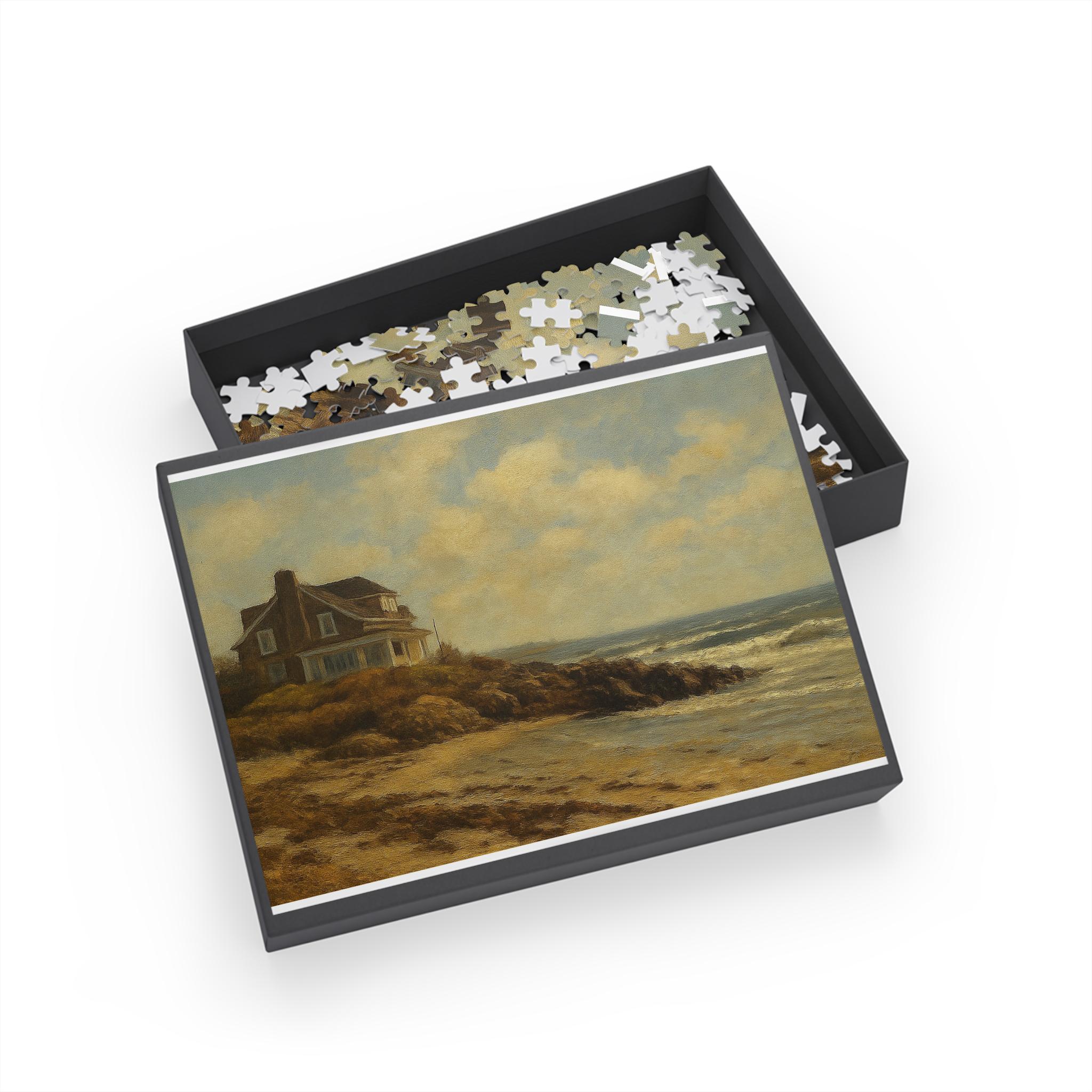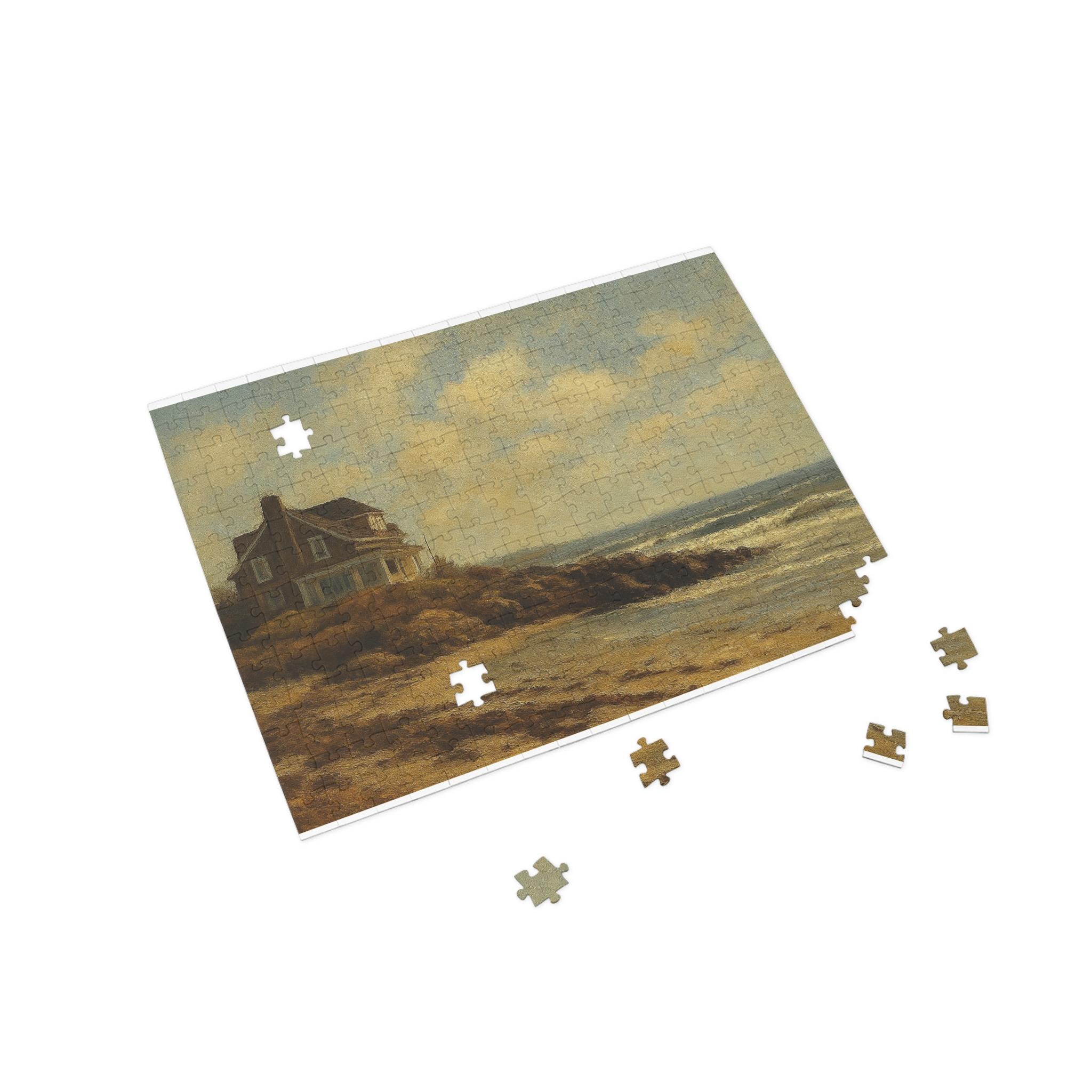 Settle into a quiet afternoon with this coastal cottage scene from Lords Point Mothers Beach, Kennebunk, Maine. Each piece reveals a sun-washed clapboard house, weathered boardwalks, and the subtle shimmer of the Atlantic. The slow, satisfying rhythm of fitting the shoreline together brings back salt air, gull calls, and the gentle sway of summer light. Lay it out on a table, pour a mug of something warm, and let the view grow until the whole seascape is there — calm, familiar, and true to place. This puzzle belongs with people who love shoreline memories, summer cottages, and the small, specific comforts of coastal life. It resonates during long weekends, rainy afternoons at the beach house, or when you want to revisit a beloved Maine stretch from anywhere in the world.