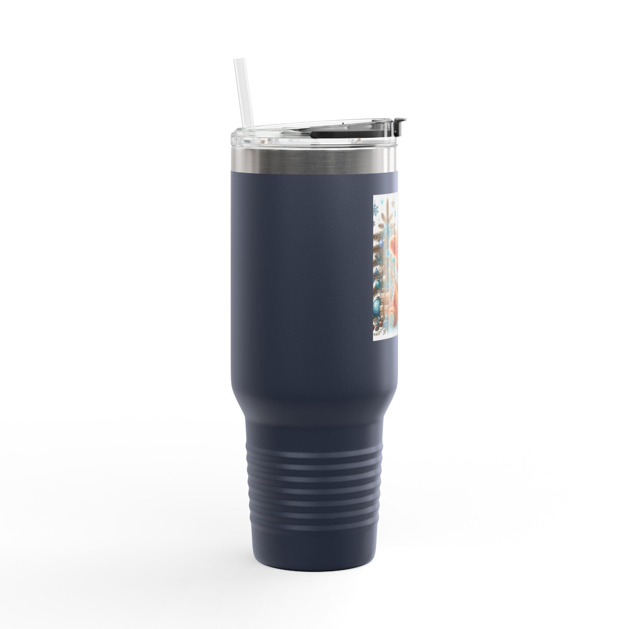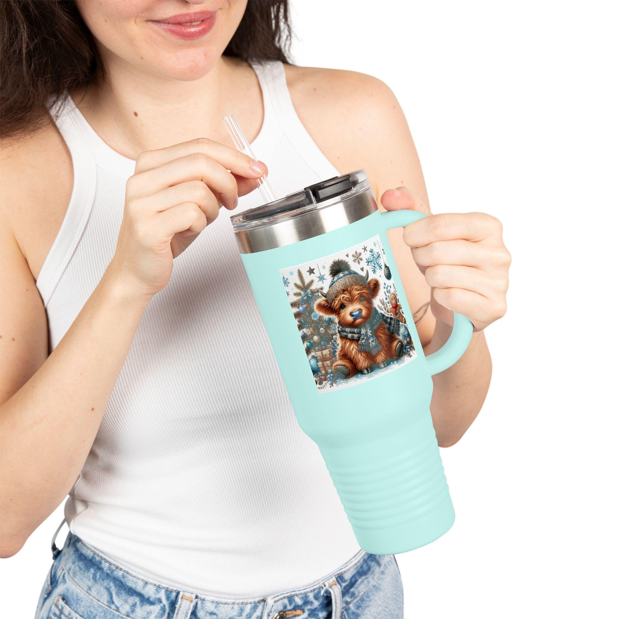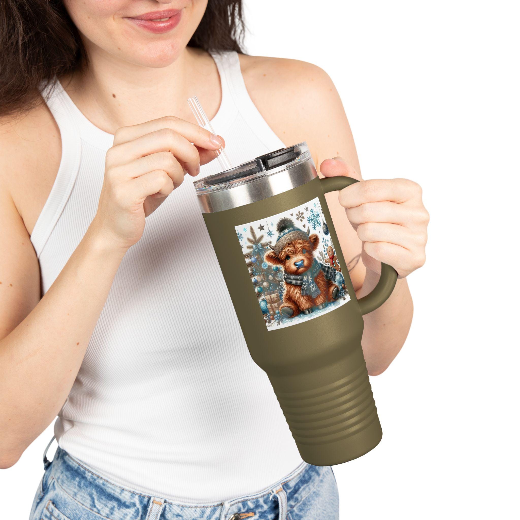 This 40oz insulated travel mug brings cozy charm to long drives, chilly hikes, and busy mornings. The powder-coated stainless steel body holds a generous amount so you can carry a full thermos of coffee, tea, or a cold refresher, while double-wall insulation preserves the temperature for hours. An ergonomic handle and leak-resistant lid with included straw make sipping on the move comfortable and spill-safe. The printed seasonal artwork adds a warm, whimsical touch—think soft mittens, frosty pines, and a smiling bear tucked into a winter scene—so the mug feels like a little companion on cold-weather outings. Lightweight enough to tote, rugged enough for the outdoors, and finished in a choice of colors, this tumbler lives in the cup holder, the campsite, and the desk mug drawer alike.