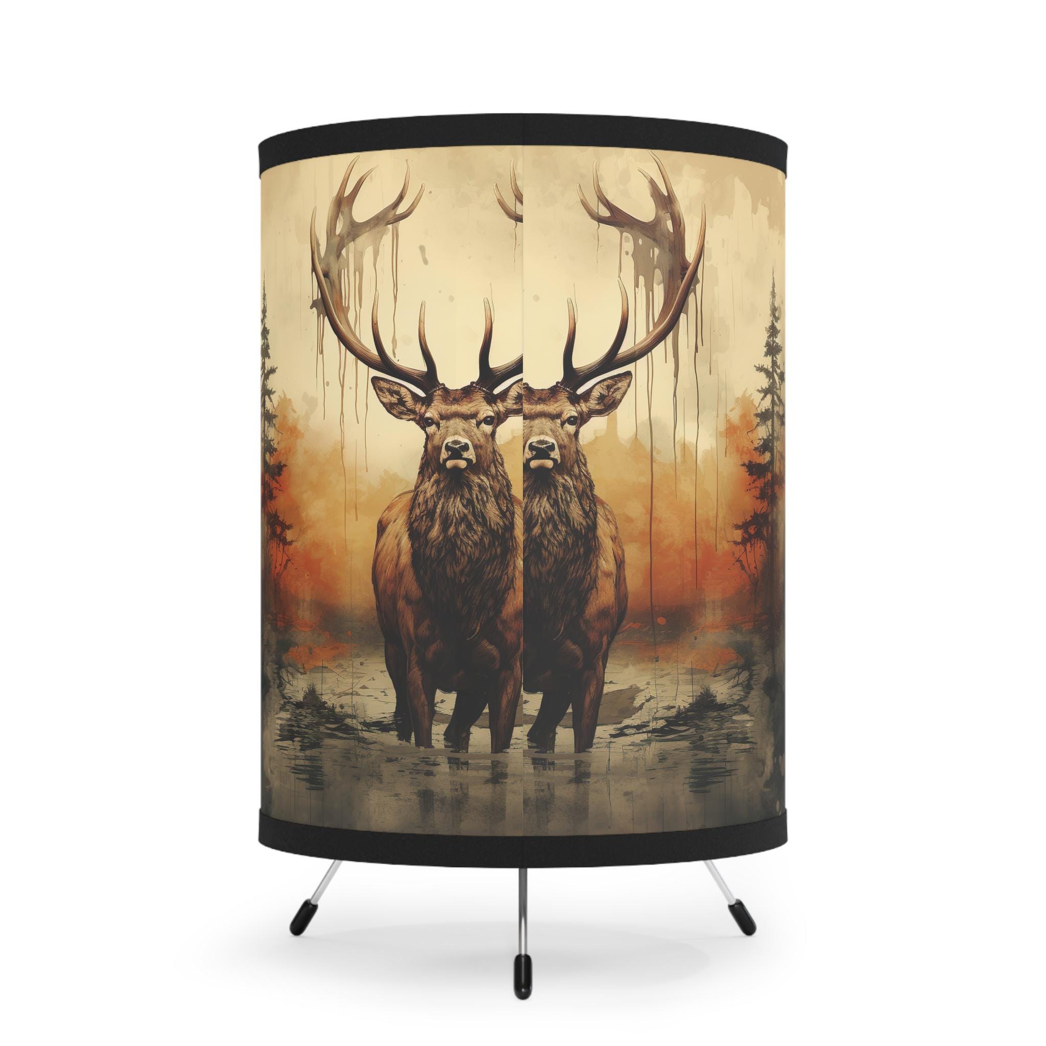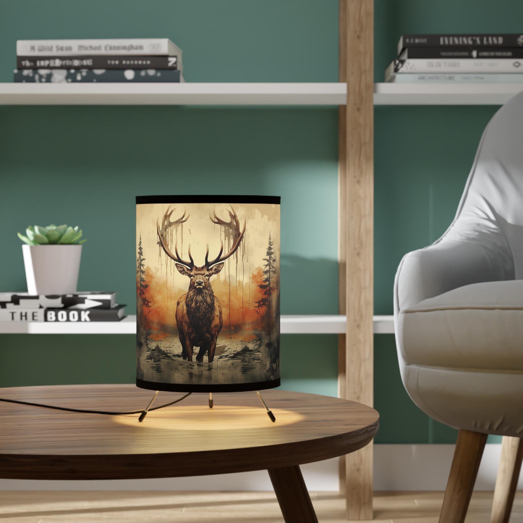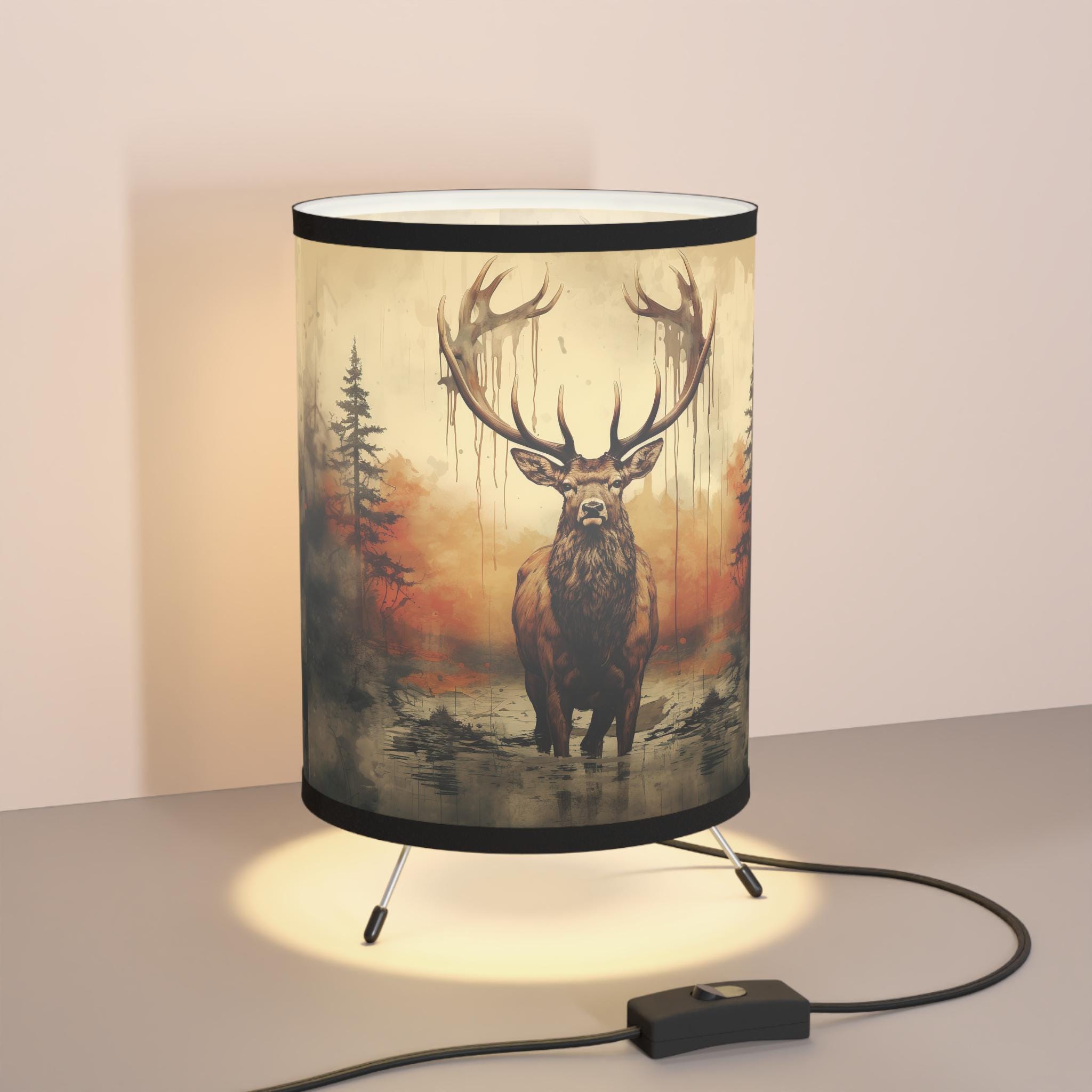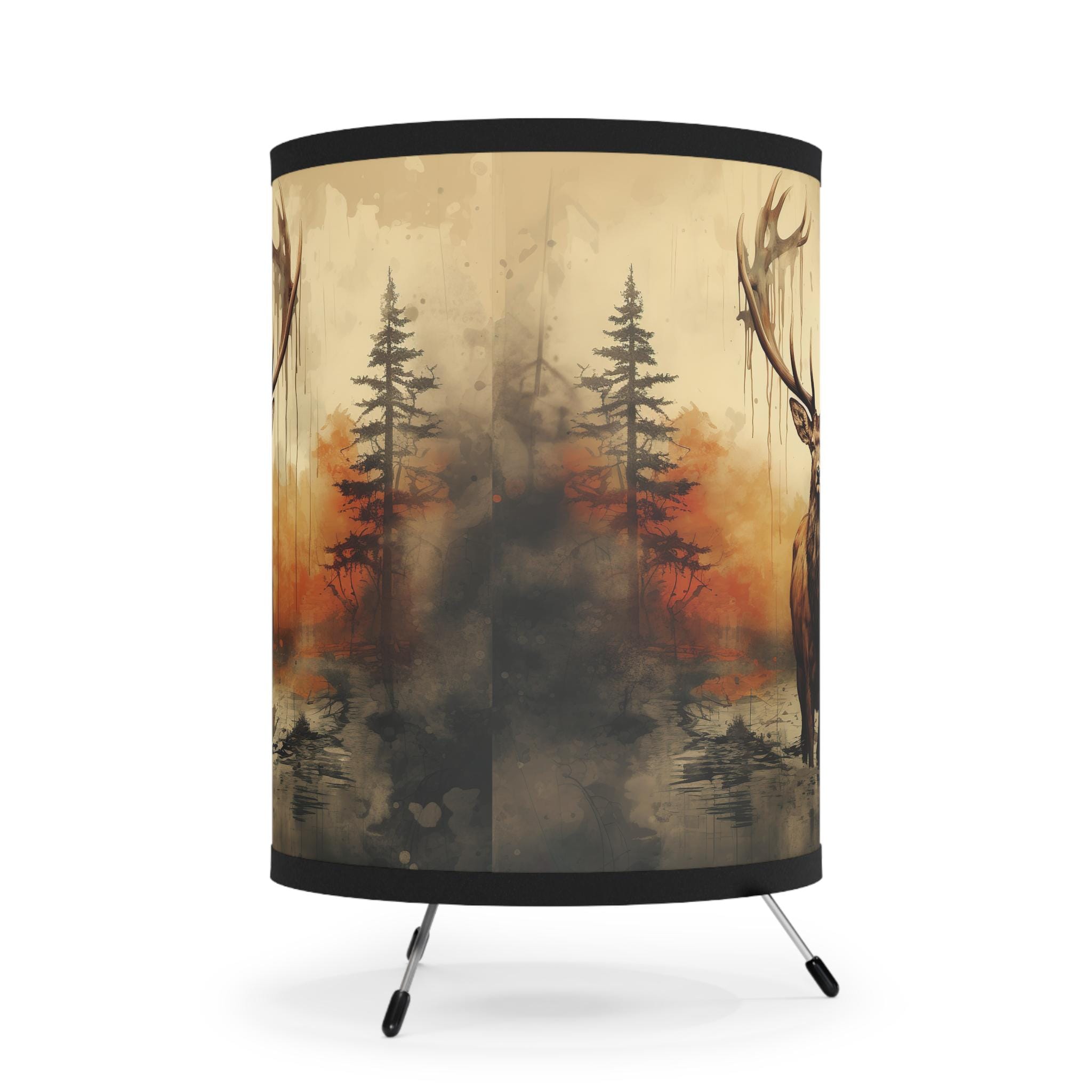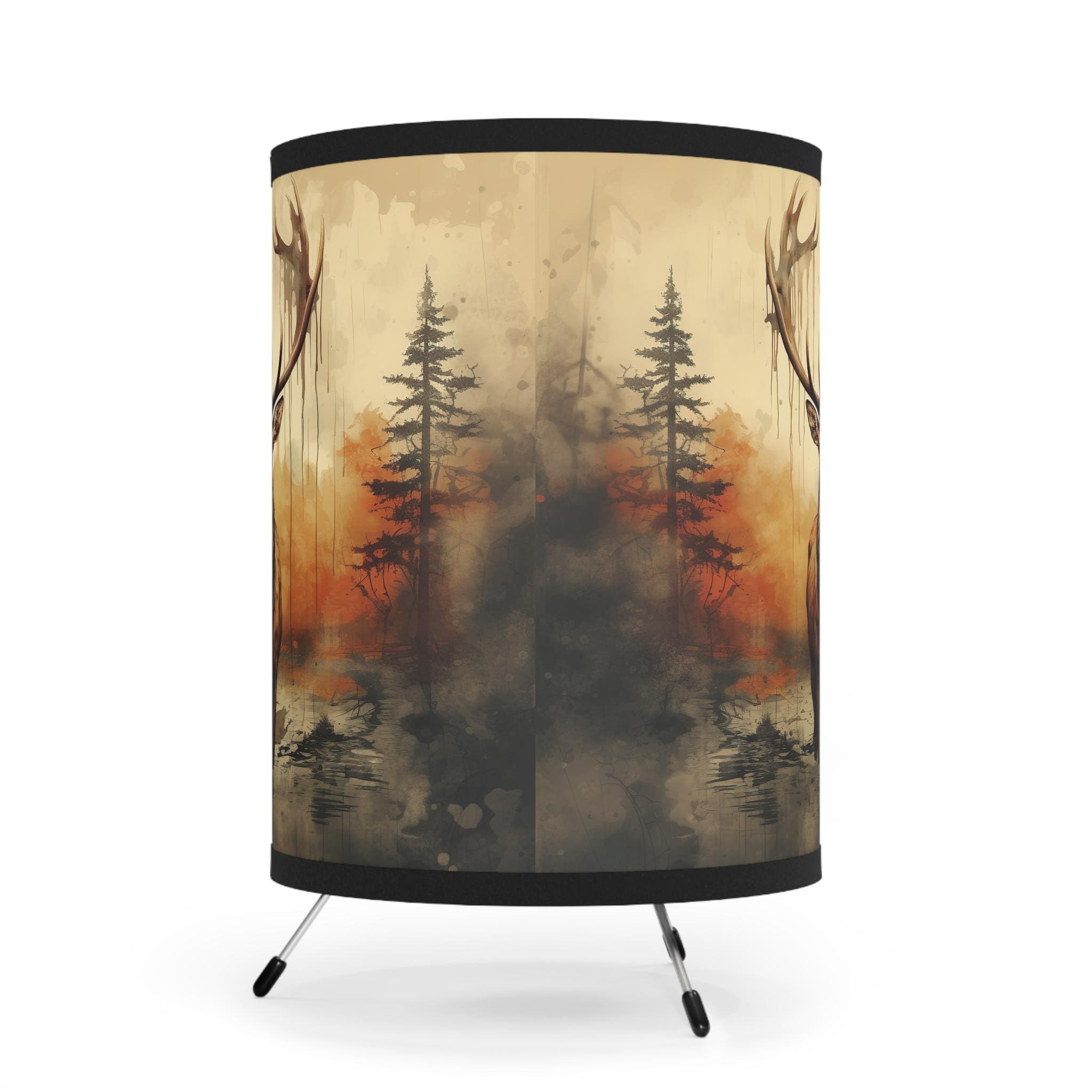A warm, woodsy tripod lamp that brings quiet forest evenings into your room. The high-resolution polyester shade features a majestic stag framed by misty pines and amber light, giving off a soft, cozy glow when lit. Its galvanized steel tripod base adds a touch of industrial sturdiness while keeping the lamp visually light and sculptural. Slip it beside a reading chair, on a bedside table, or in a cabin-style nook to add layered atmosphere and a subtle nature-inspired focal point. The shade prints all around so the scene wraps the space, and the warm tone of the light makes rooms feel calmer and lived-in.