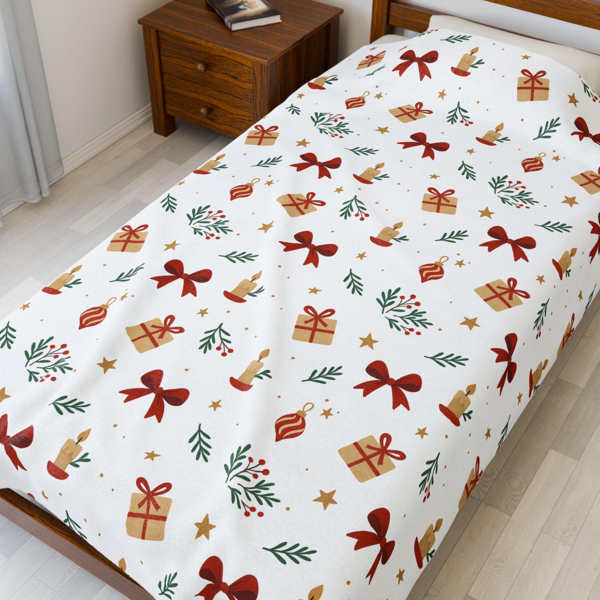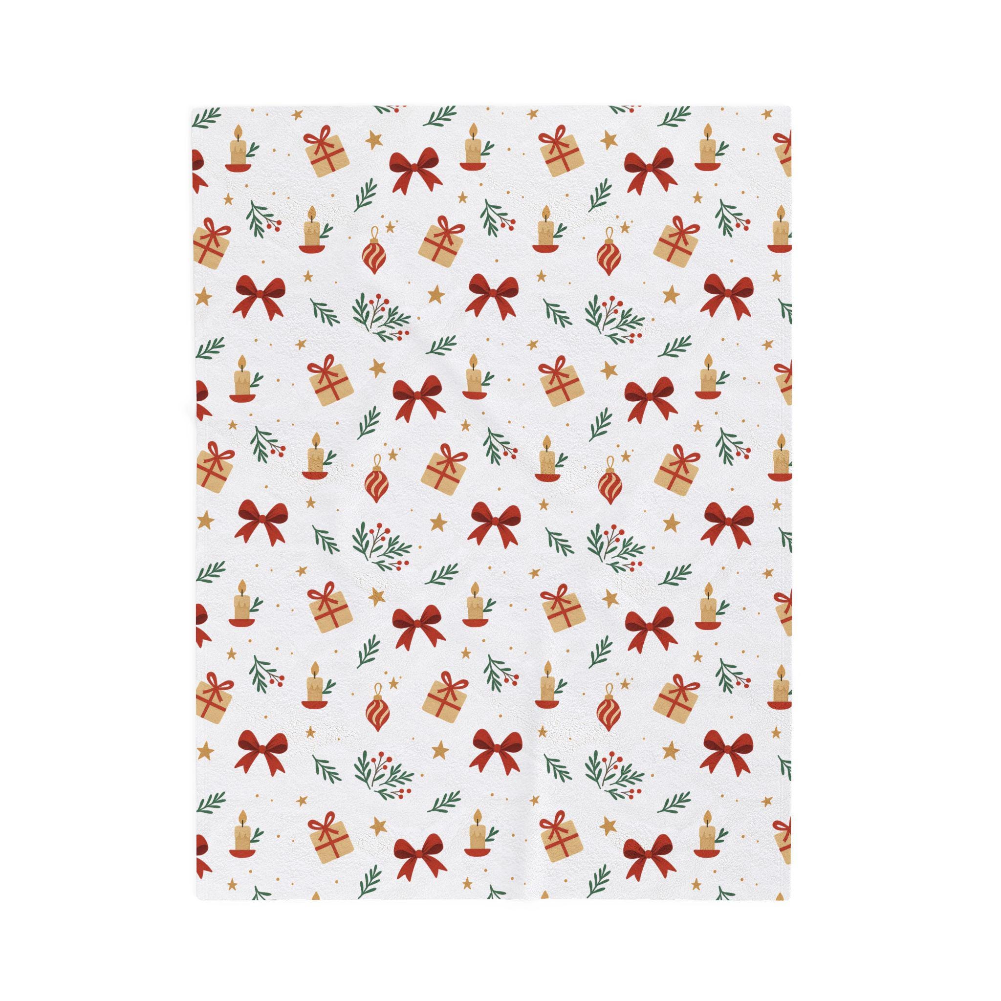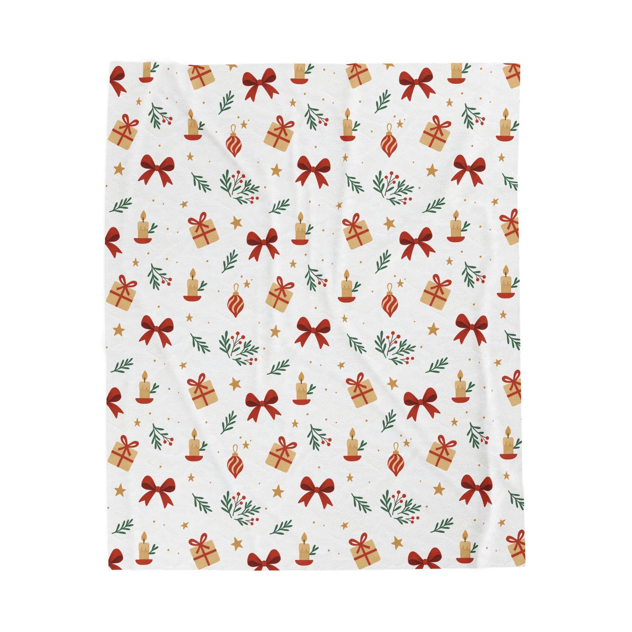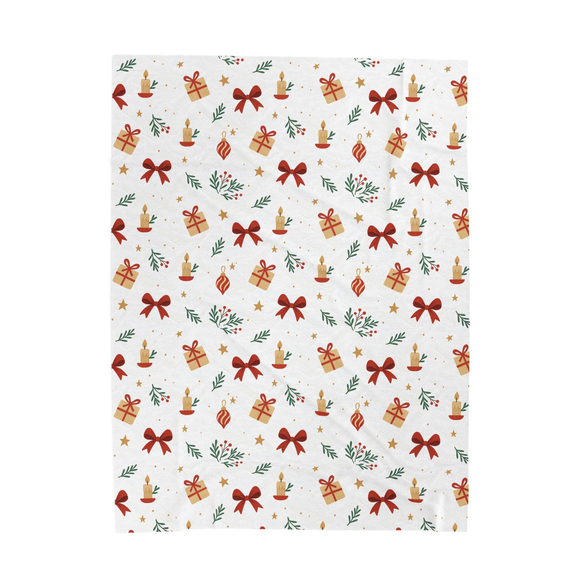 A velvety, medium-weight plush blanket printed with a warm, festive pattern of bows, wrapped gifts, candles, and sprigs of greenery. The soft polyester face holds vivid color and crisp detail on one side, while the reverse stays cozy and smooth against skin. It drapes easily over a couch or armchair and becomes the kind of comforting layer you reach for during quiet winter evenings, holiday movie nights, or when friends gather for a cozy game night. Tailored stitching around the edges keeps the blanket looking neat and durable after many washes. This blanket brings a gentle, handcrafted holiday vibe to small apartments, cabins, or family living rooms — the kind of piece that blends seasonal cheer with everyday comfort.