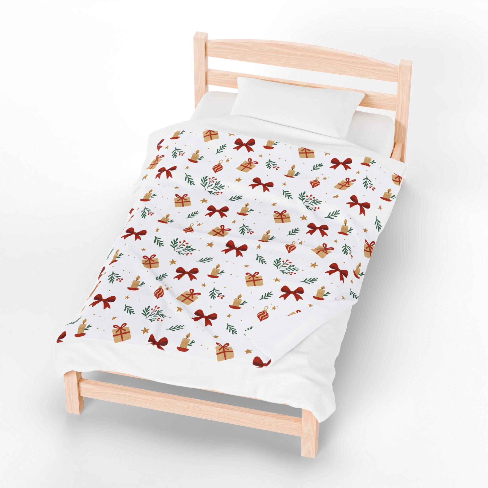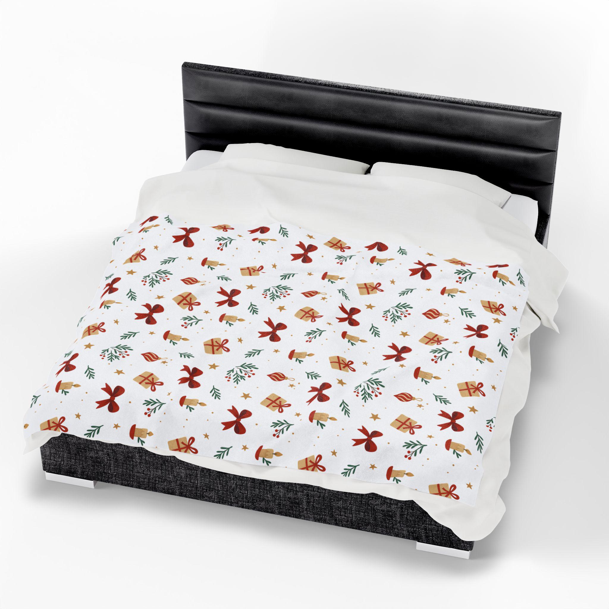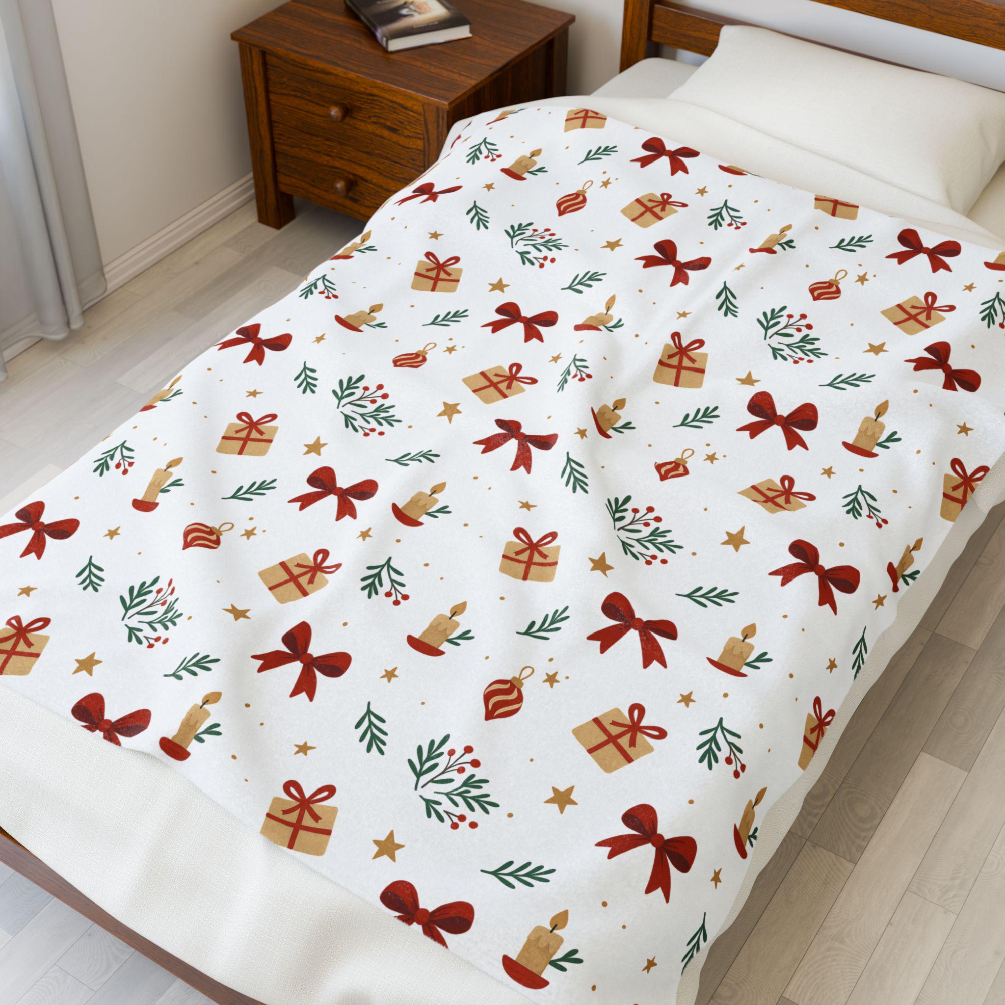A velvety, medium-weight plush blanket printed with a warm, festive pattern of bows, wrapped gifts, candles, and sprigs of greenery. The soft polyester face holds vivid color and crisp detail on one side, while the reverse stays cozy and smooth against skin. It drapes easily over a couch or armchair and becomes the kind of comforting layer you reach for during quiet winter evenings, holiday movie nights, or when friends gather for a cozy game night. Tailored stitching around the edges keeps the blanket looking neat and durable after many washes. This blanket brings a gentle, handcrafted holiday vibe to small apartments, cabins, or family living rooms — the kind of piece that blends seasonal cheer with everyday comfort.