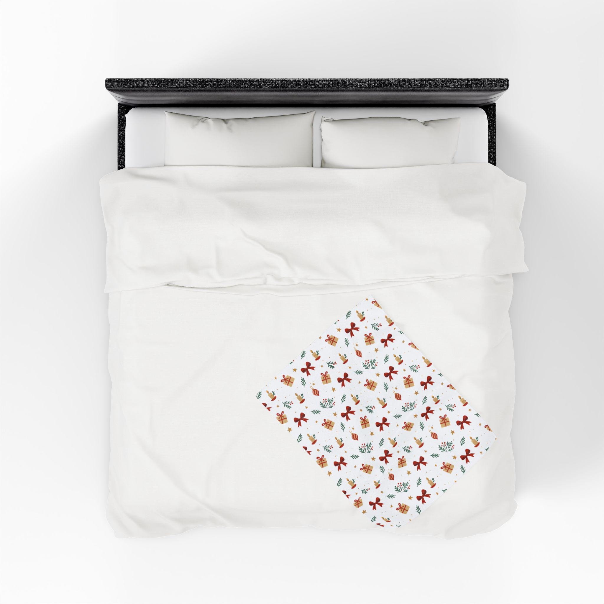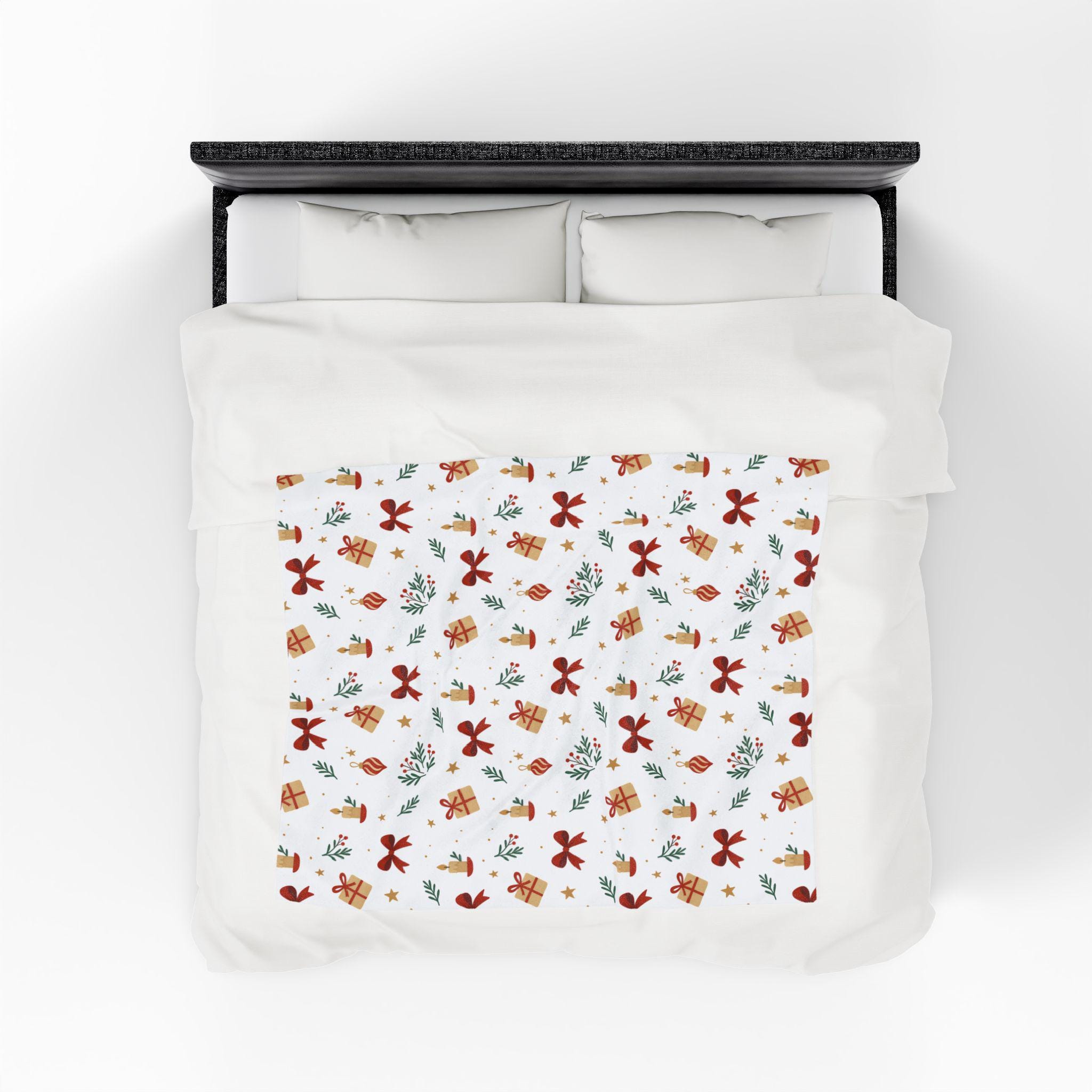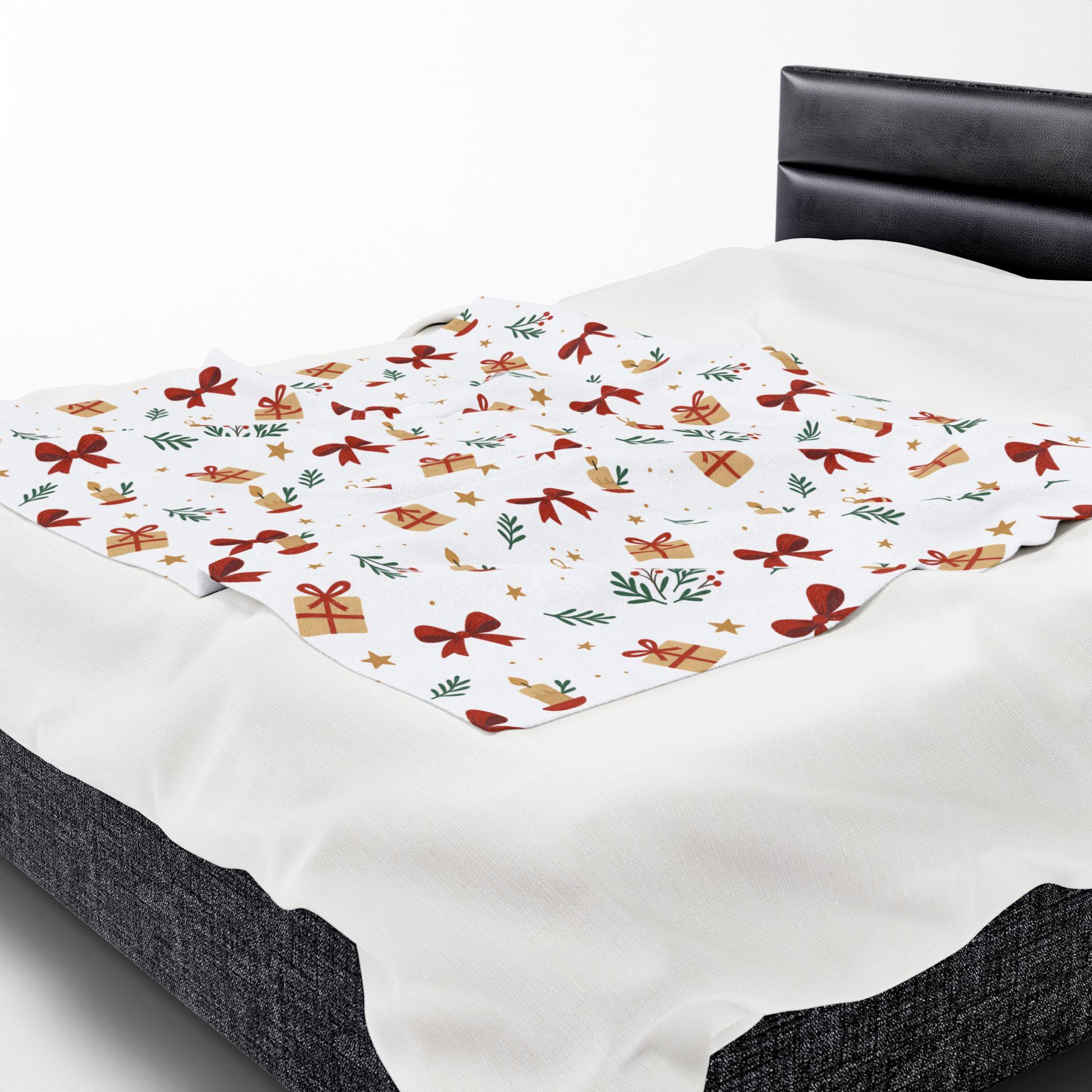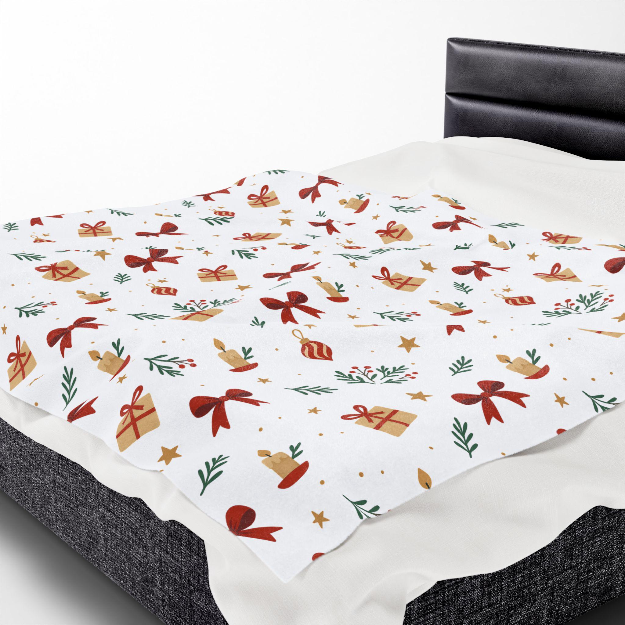 A velvety, medium-weight plush blanket printed with a warm, festive pattern of bows, wrapped gifts, candles, and sprigs of greenery. The soft polyester face holds vivid color and crisp detail on one side, while the reverse stays cozy and smooth against skin. It drapes easily over a couch or armchair and becomes the kind of comforting layer you reach for during quiet winter evenings, holiday movie nights, or when friends gather for a cozy game night. Tailored stitching around the edges keeps the blanket looking neat and durable after many washes. This blanket brings a gentle, handcrafted holiday vibe to small apartments, cabins, or family living rooms — the kind of piece that blends seasonal cheer with everyday comfort.