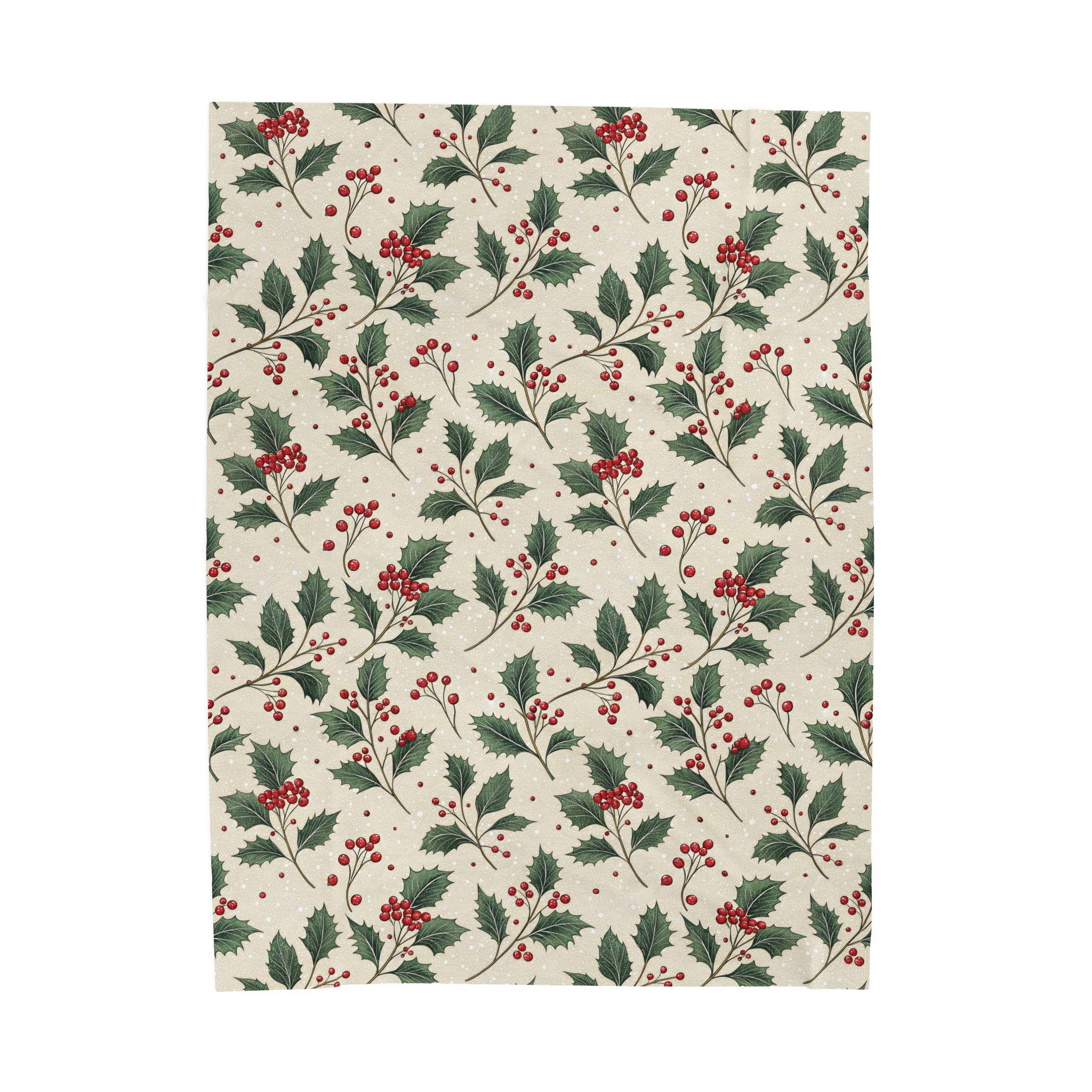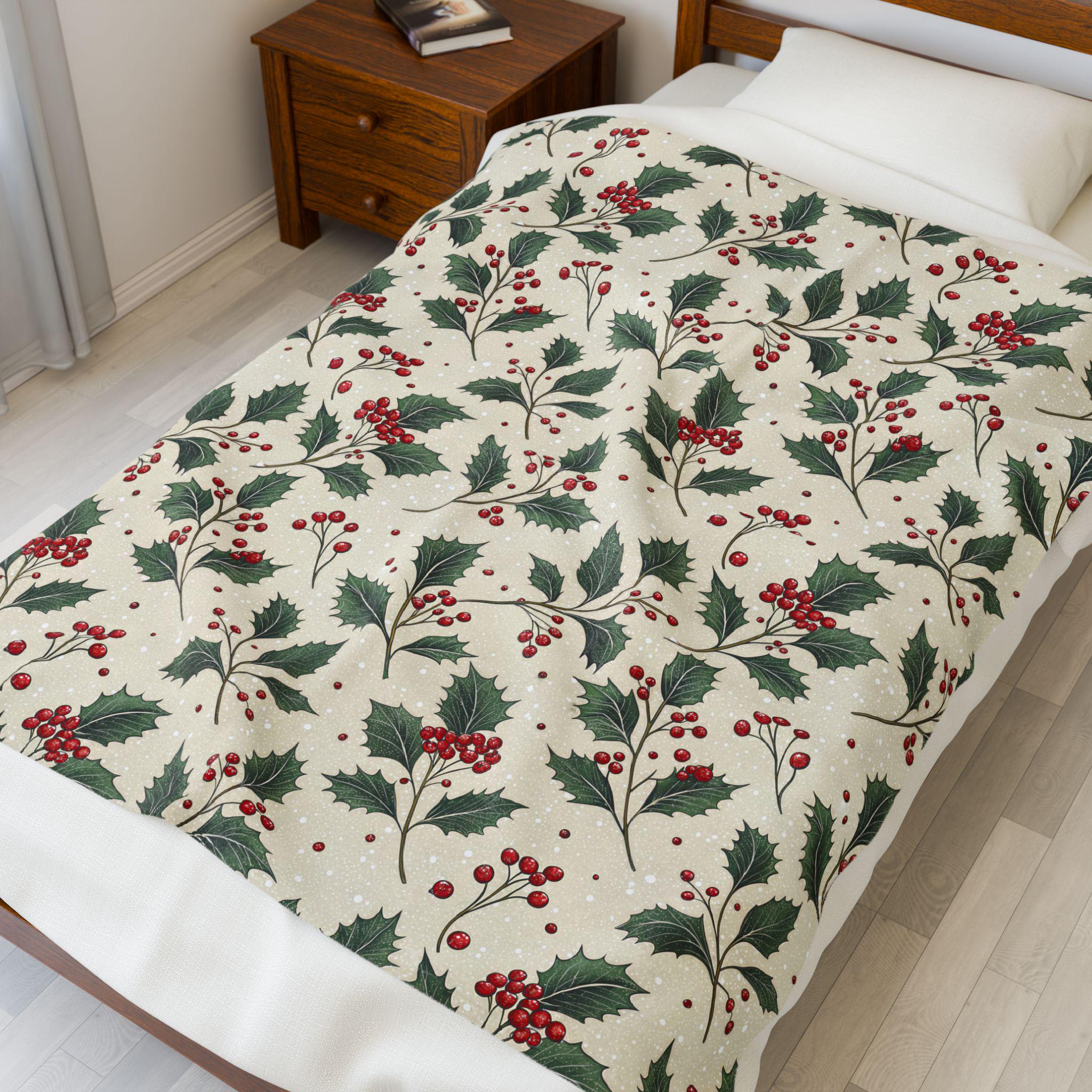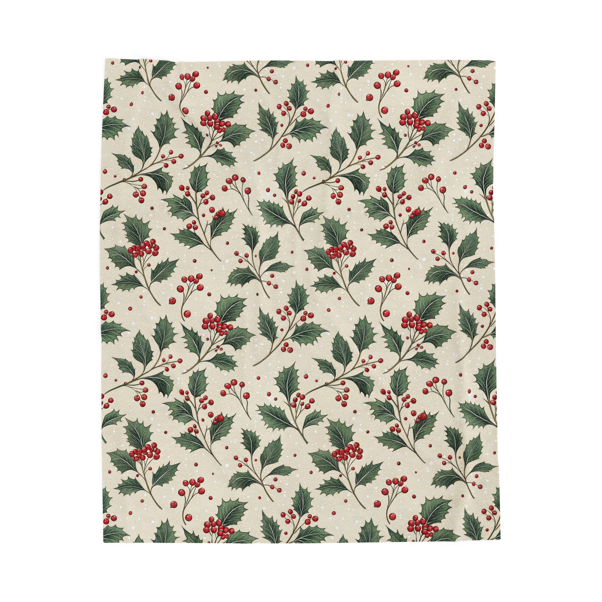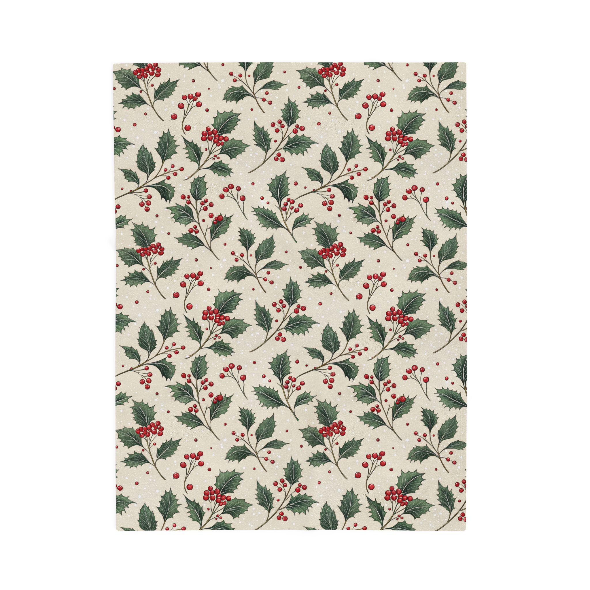 Quiet, cozy evenings curled up with a holiday story come alive — this plush velveteen blanket wraps you in a soft, medium-weight hug. A vintage-inspired holly pattern in deep greens and warm crimson berries drifts across a cream background, bringing a gentle, timeless charm to a reading nook or sofa. The print is vivid on one side with a velvety hand that invites lingering; the reverse is a soft, neutral backing that keeps the look versatile. Thoughtfully stitched with double-needle seams for durability and made from quick-drying polyester, it holds its shape and color through repeated use. Bring it out for winter evenings, a slow morning with coffee, or to layer over a couch during holiday gatherings — it settles into home life like an old friend.