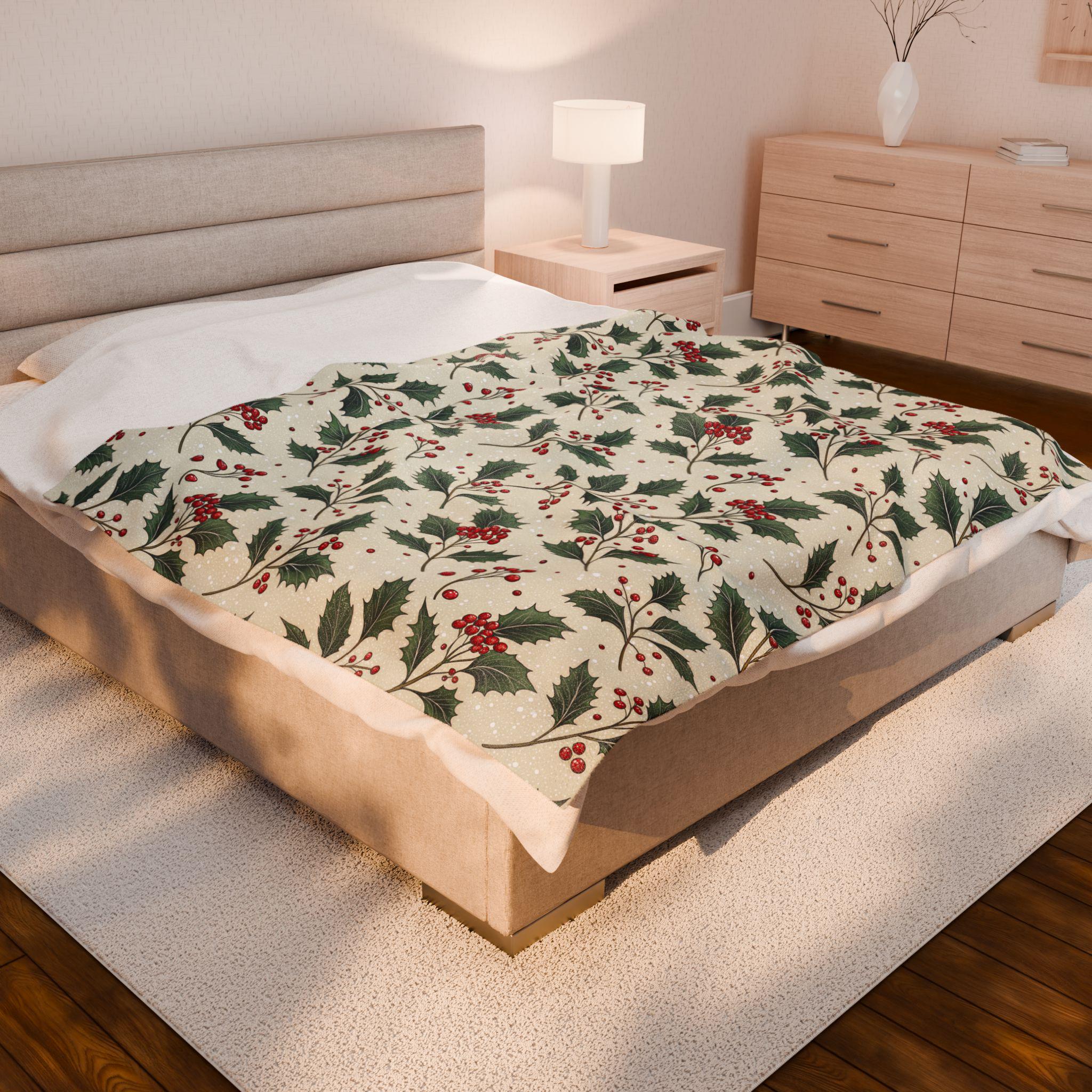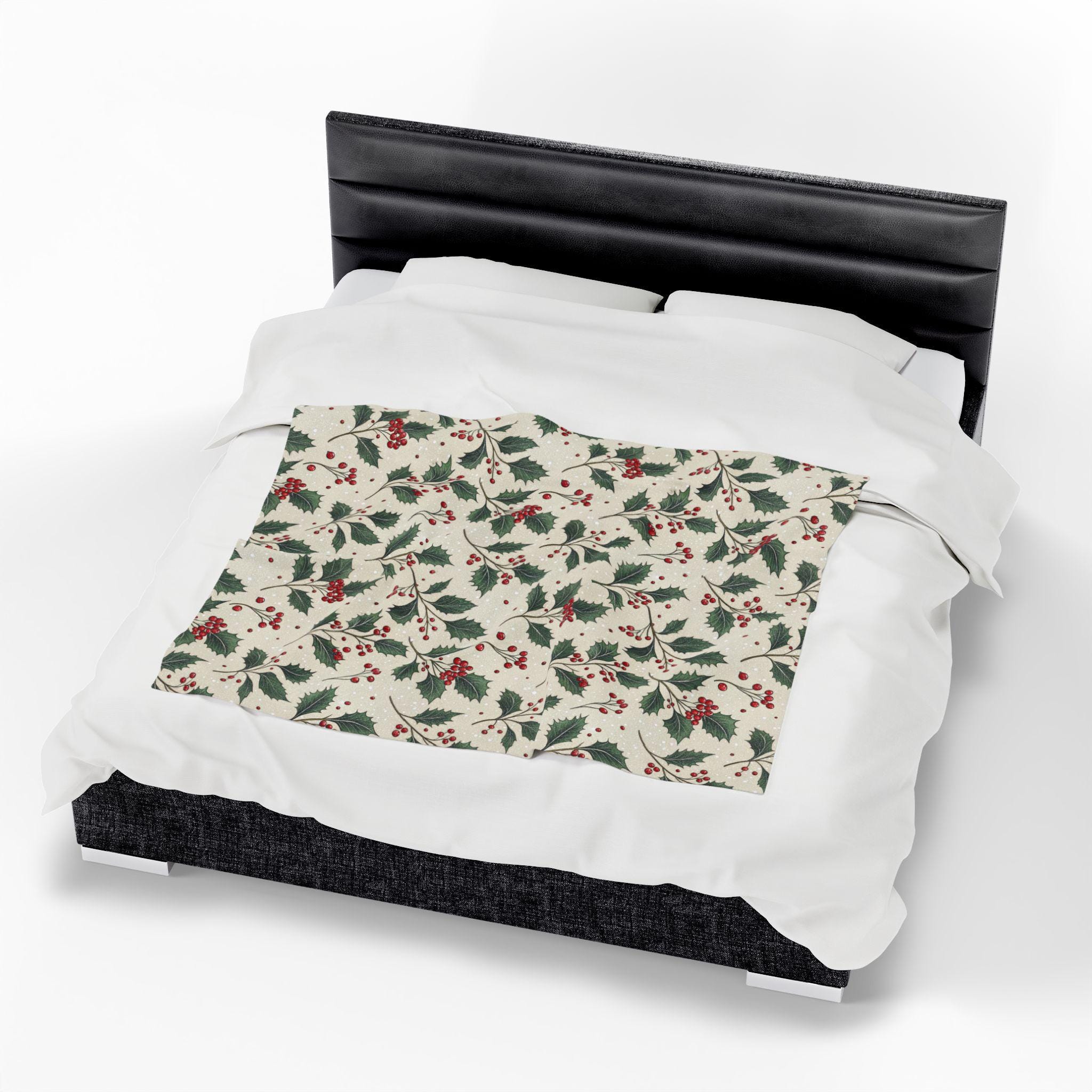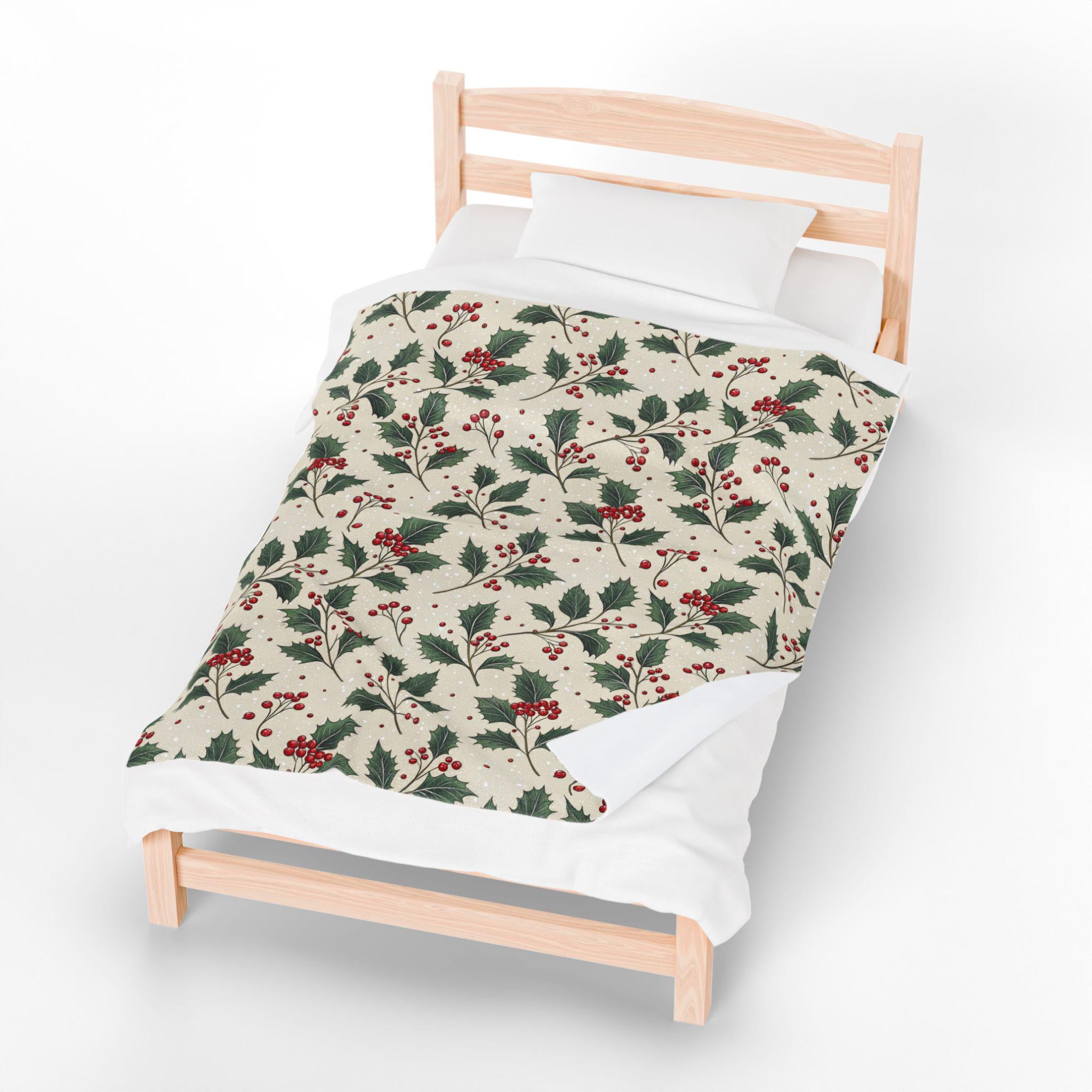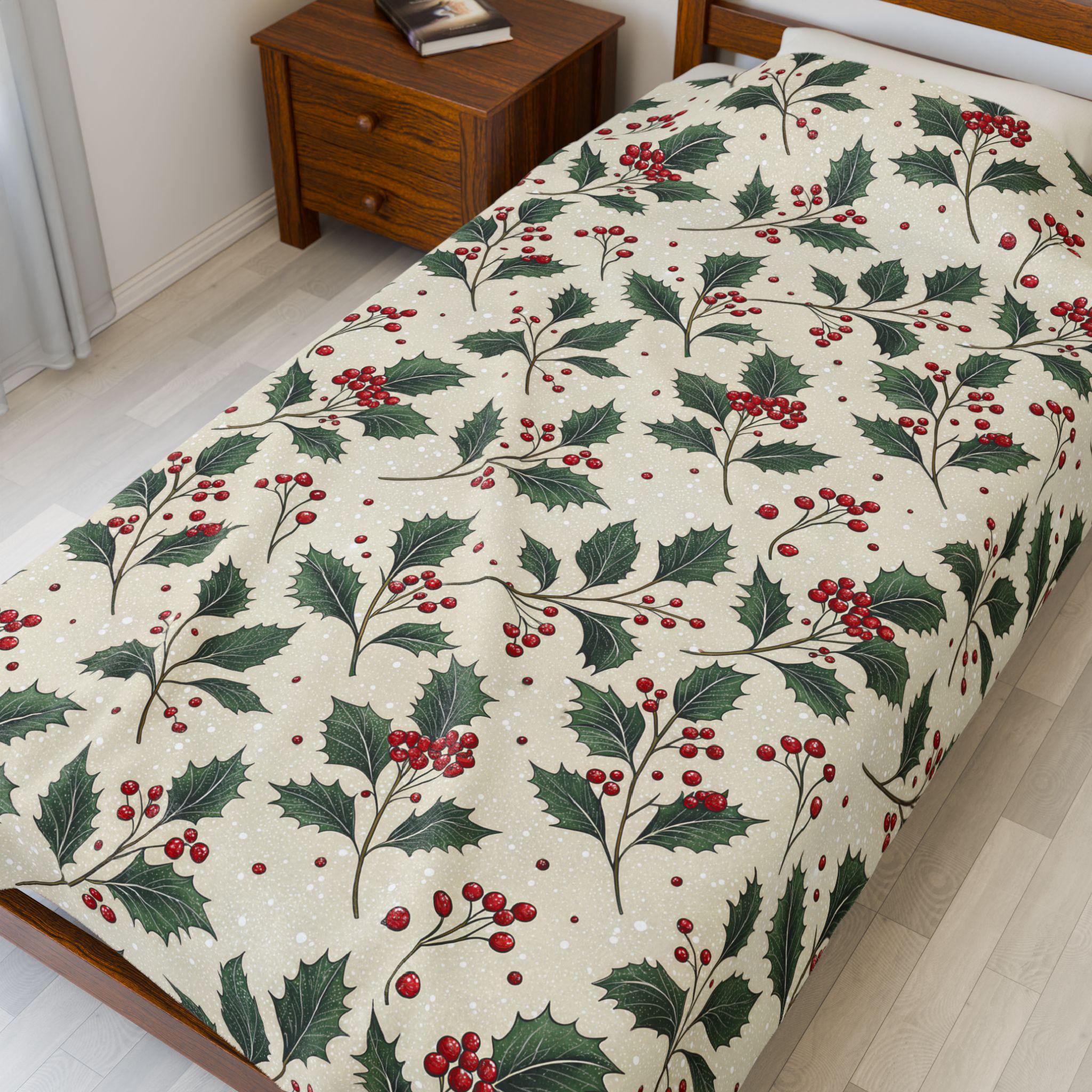 Quiet, cozy evenings curled up with a holiday story come alive — this plush velveteen blanket wraps you in a soft, medium-weight hug. A vintage-inspired holly pattern in deep greens and warm crimson berries drifts across a cream background, bringing a gentle, timeless charm to a reading nook or sofa. The print is vivid on one side with a velvety hand that invites lingering; the reverse is a soft, neutral backing that keeps the look versatile. Thoughtfully stitched with double-needle seams for durability and made from quick-drying polyester, it holds its shape and color through repeated use. Bring it out for winter evenings, a slow morning with coffee, or to layer over a couch during holiday gatherings — it settles into home life like an old friend.
