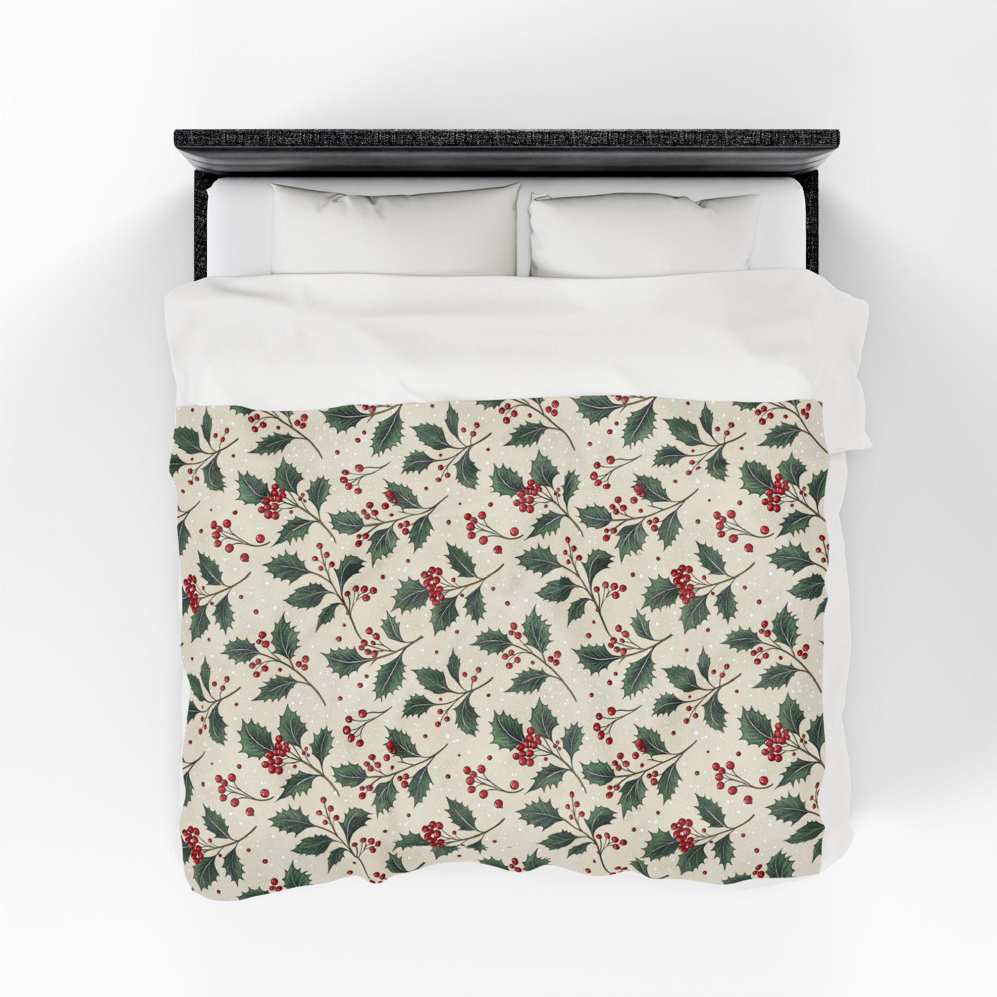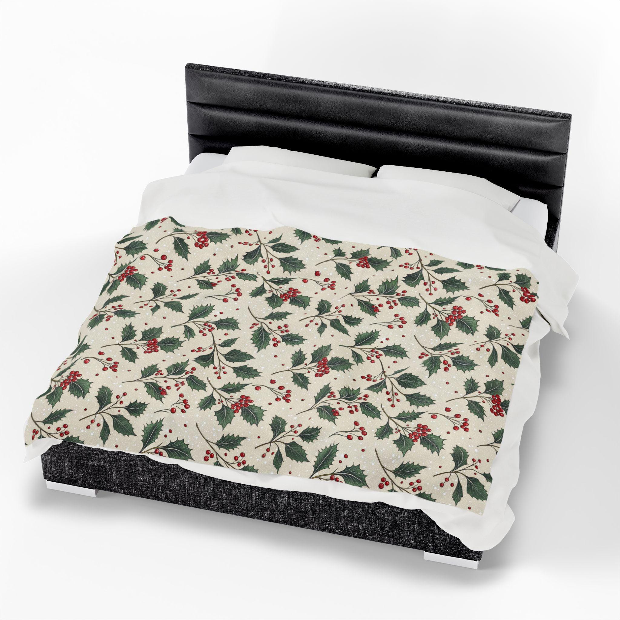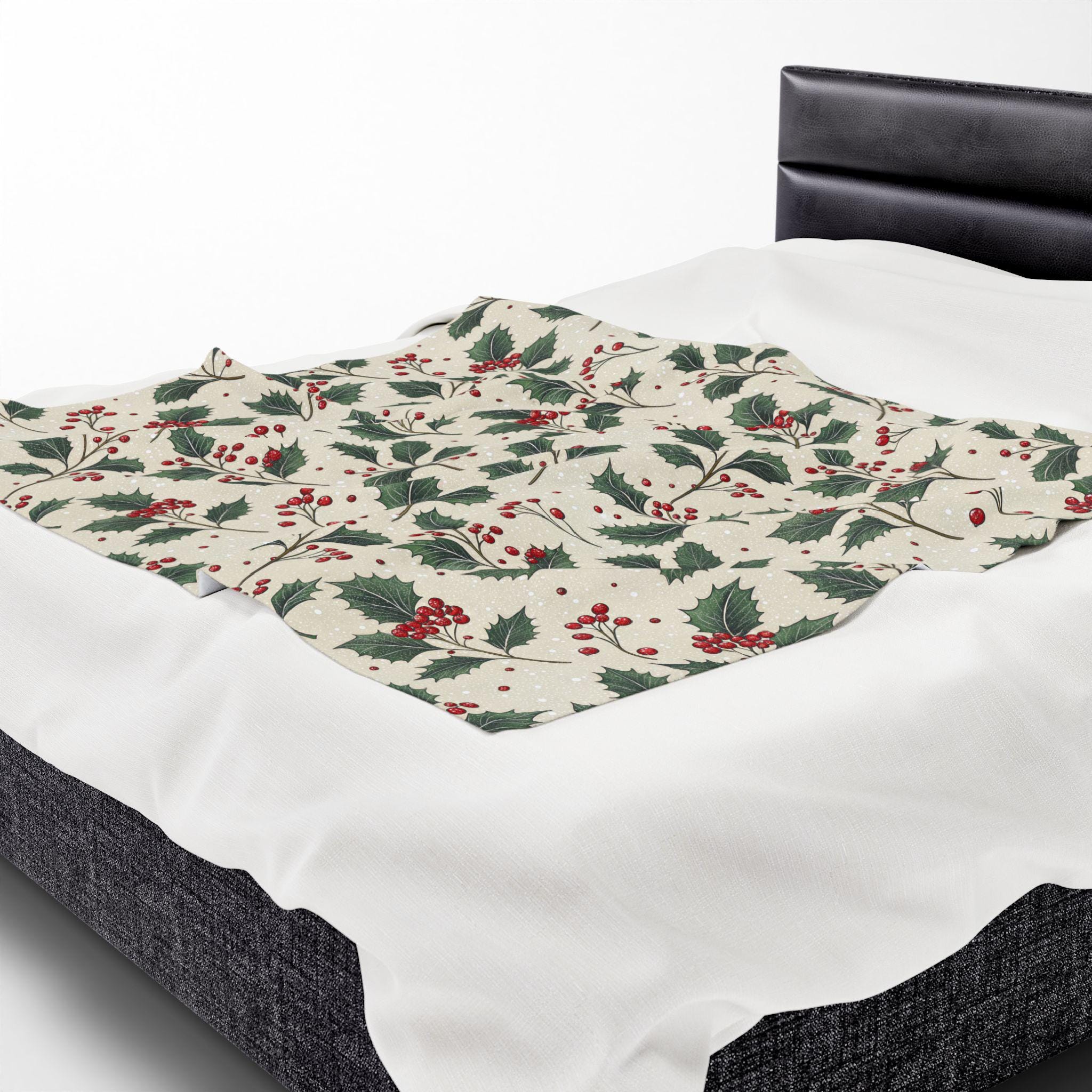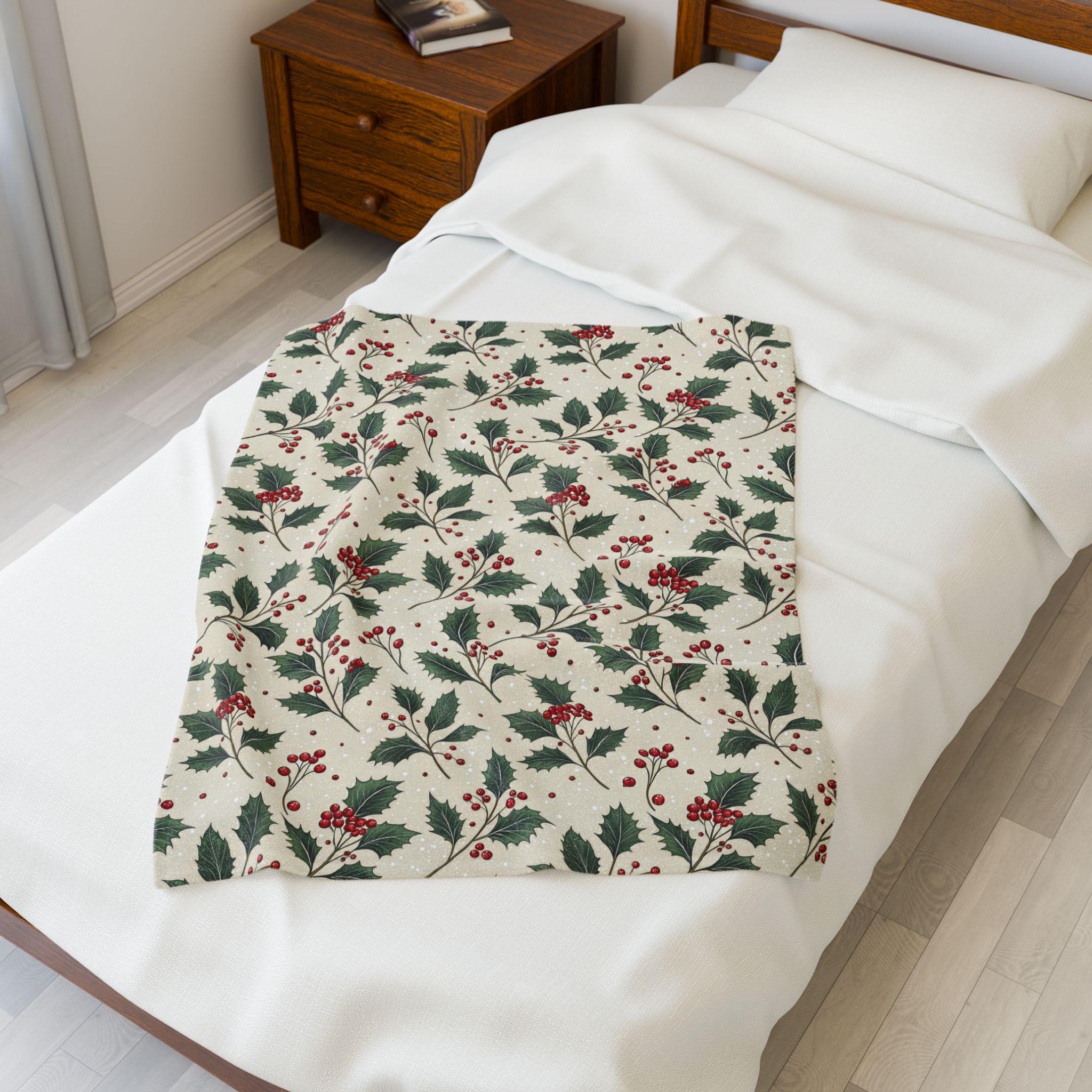 Quiet, cozy evenings curled up with a holiday story come alive — this plush velveteen blanket wraps you in a soft, medium-weight hug. A vintage-inspired holly pattern in deep greens and warm crimson berries drifts across a cream background, bringing a gentle, timeless charm to a reading nook or sofa. The print is vivid on one side with a velvety hand that invites lingering; the reverse is a soft, neutral backing that keeps the look versatile. Thoughtfully stitched with double-needle seams for durability and made from quick-drying polyester, it holds its shape and color through repeated use. Bring it out for winter evenings, a slow morning with coffee, or to layer over a couch during holiday gatherings — it settles into home life like an old friend.