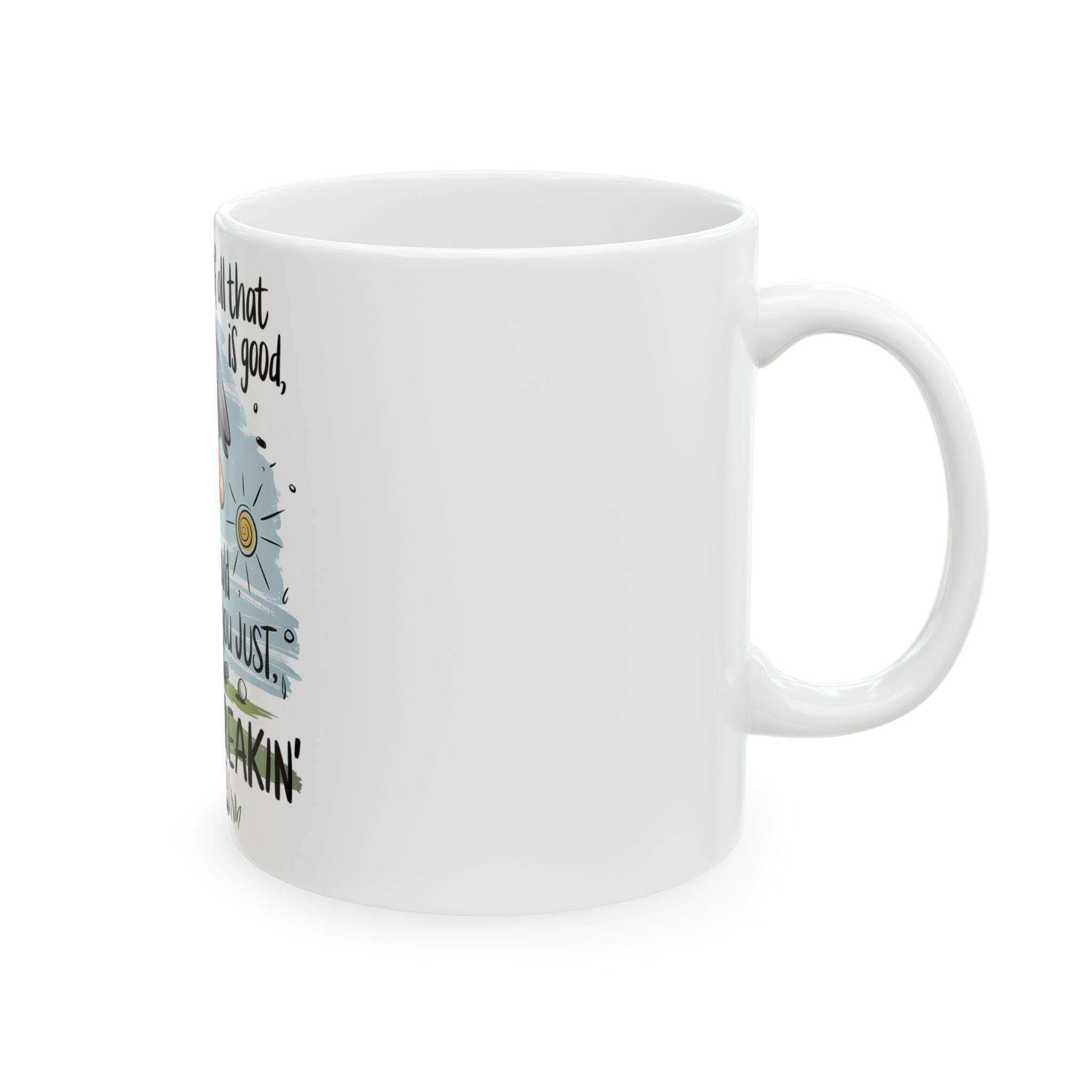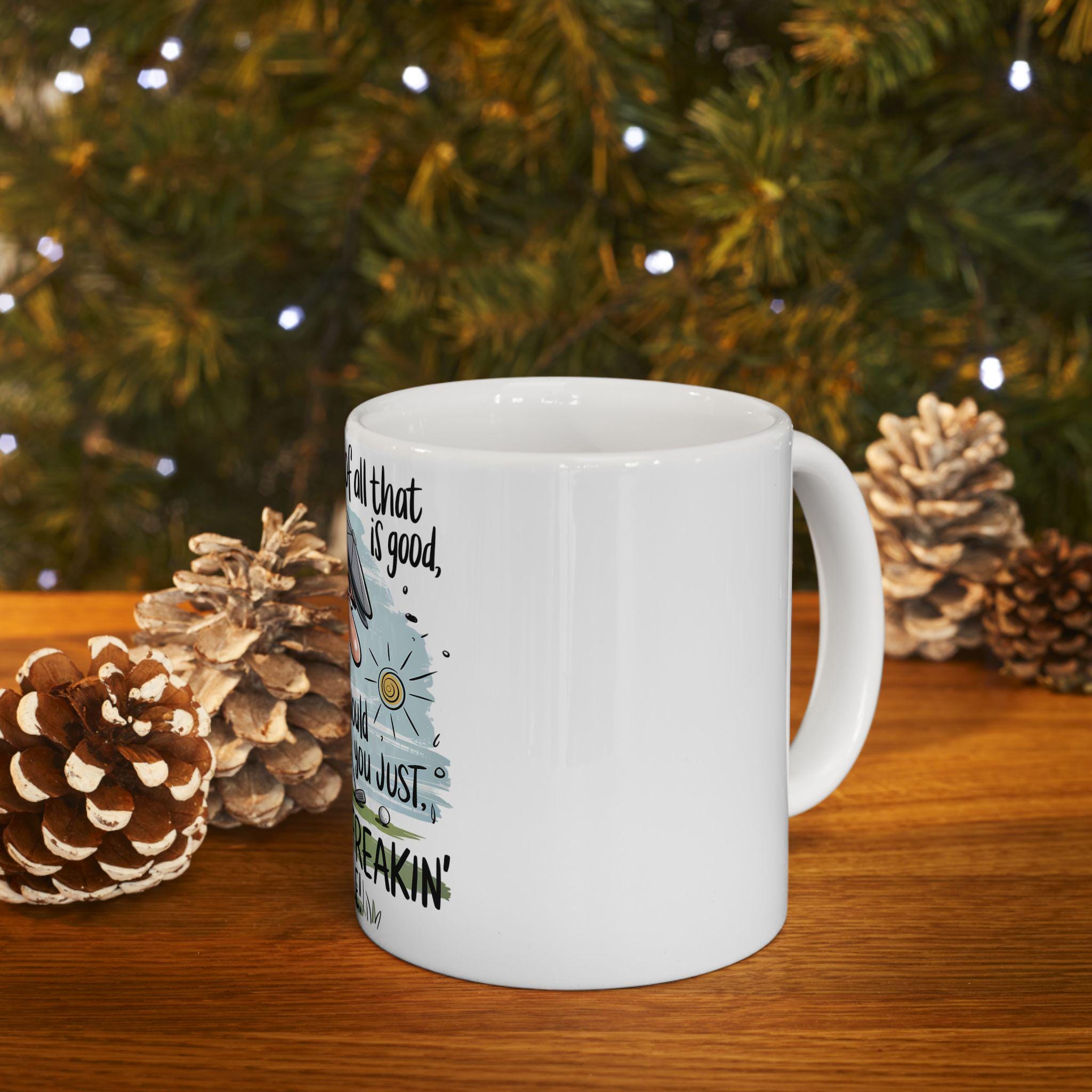 Bring a little golf-course sass to every morning coffee. This glossy ceramic mug shows a frustrated golfer on the green with the cheeky line: “For the love of all that is good, would you just get in the freakin’ hole!” It feels like a wink from a teammate after a flubbed putt — warm, humorous, and a touch irreverent. Use it during early rounds of caffeine-fueled practice, on lazy weekend mornings flipping through scorecards, or as the go-to cup for post-game debriefs. The crisp, vibrant print stands out against the clean white ceramic, so the joke reads loud and clear from across the table. It’s small moments like shared laughs and groans over a missed birdie that this mug is built for.