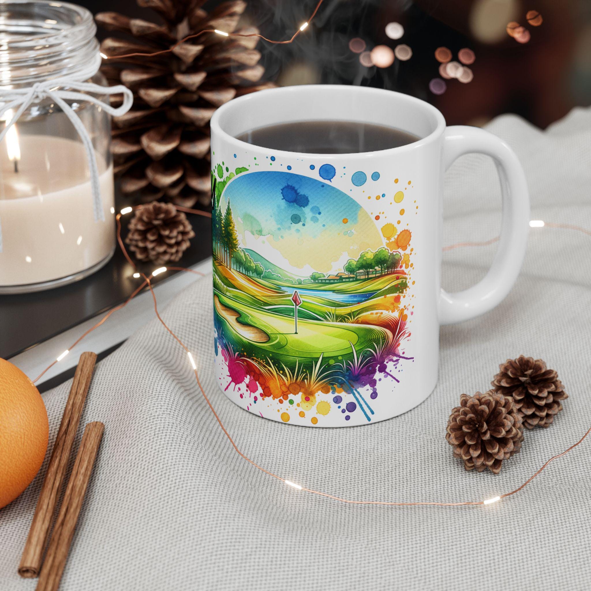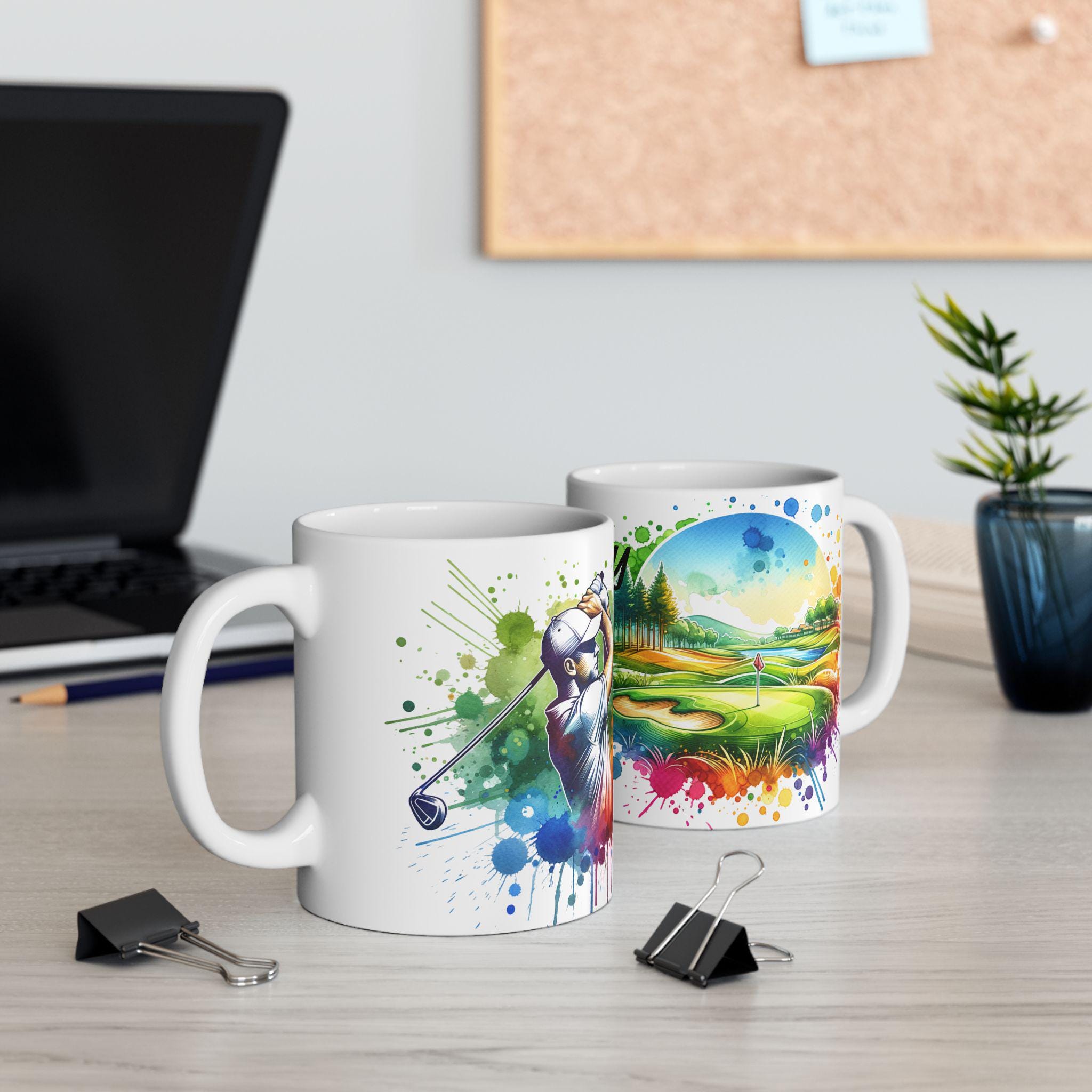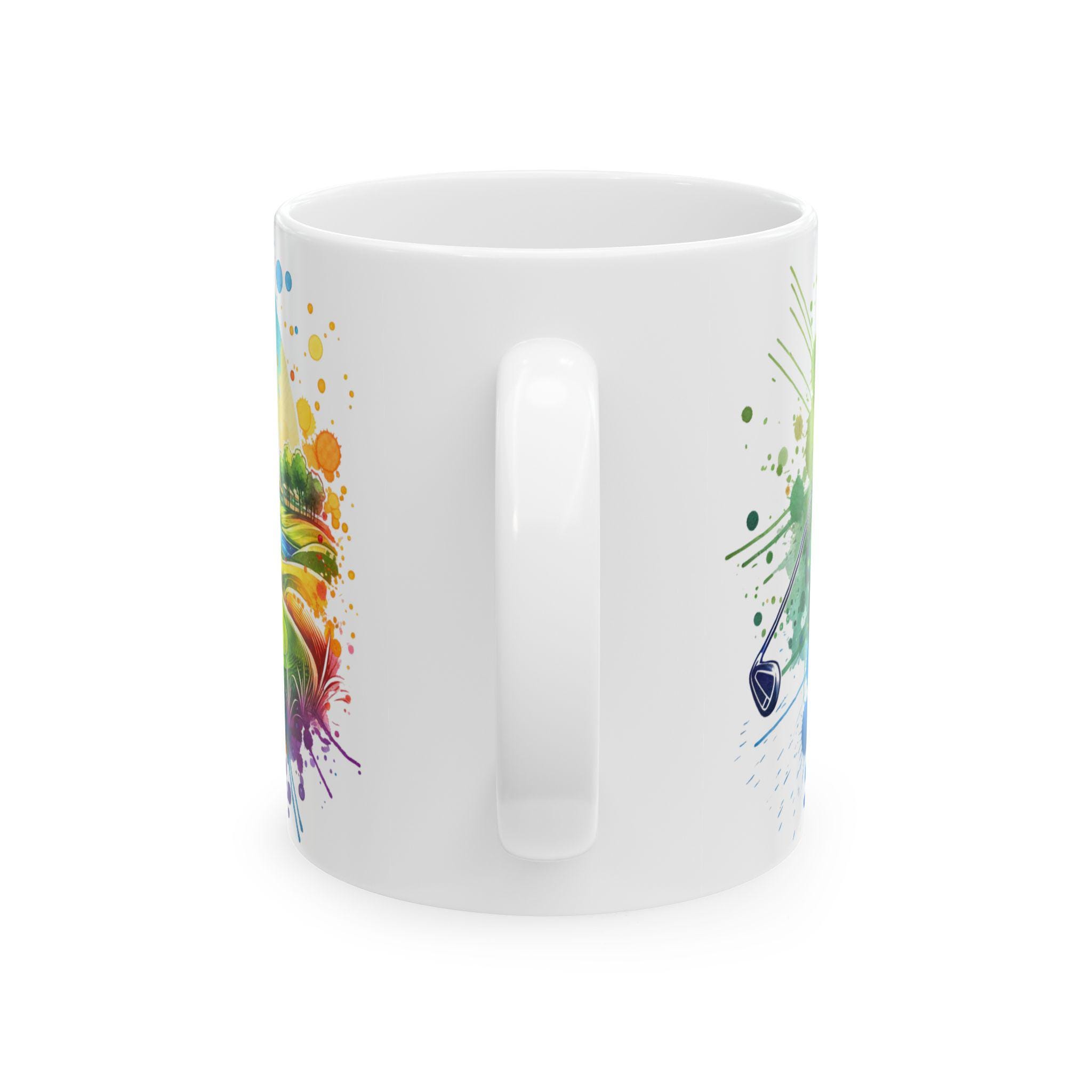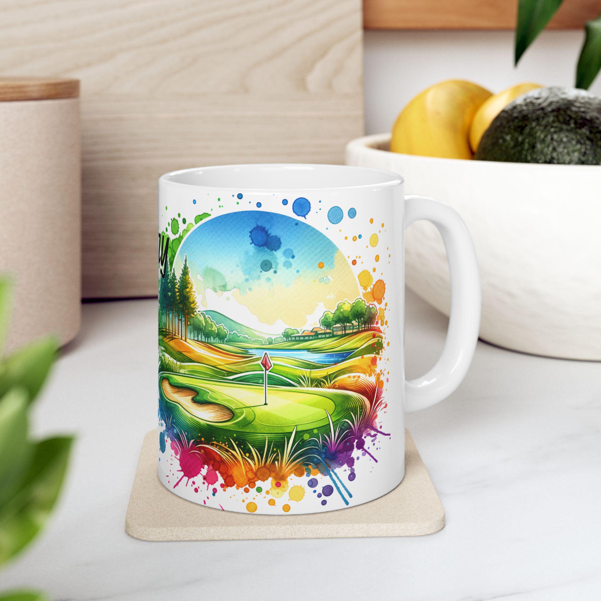 Wake up with a splash of color and a clear invitation to play. This ceramic mug wraps a vibrant golf scene — swinging player, sunlit fairway, and paint-splatter accents — around a clean white canvas. It brings the breezy energy of a morning round into quiet kitchen moments, fueling pre-game rituals or slow weekend coffee breaks. The glossy finish makes the artwork pop, while the comfortable C-handle and two size options adapt to whoever’s holding it: early-bird golfers, weekend warriors, or anyone who lives for that perfect drive down the fairway. Durable, safe, and bright, it’s the kind of everyday piece that sparks a smile and a little nostalgia for green grass and open skies.