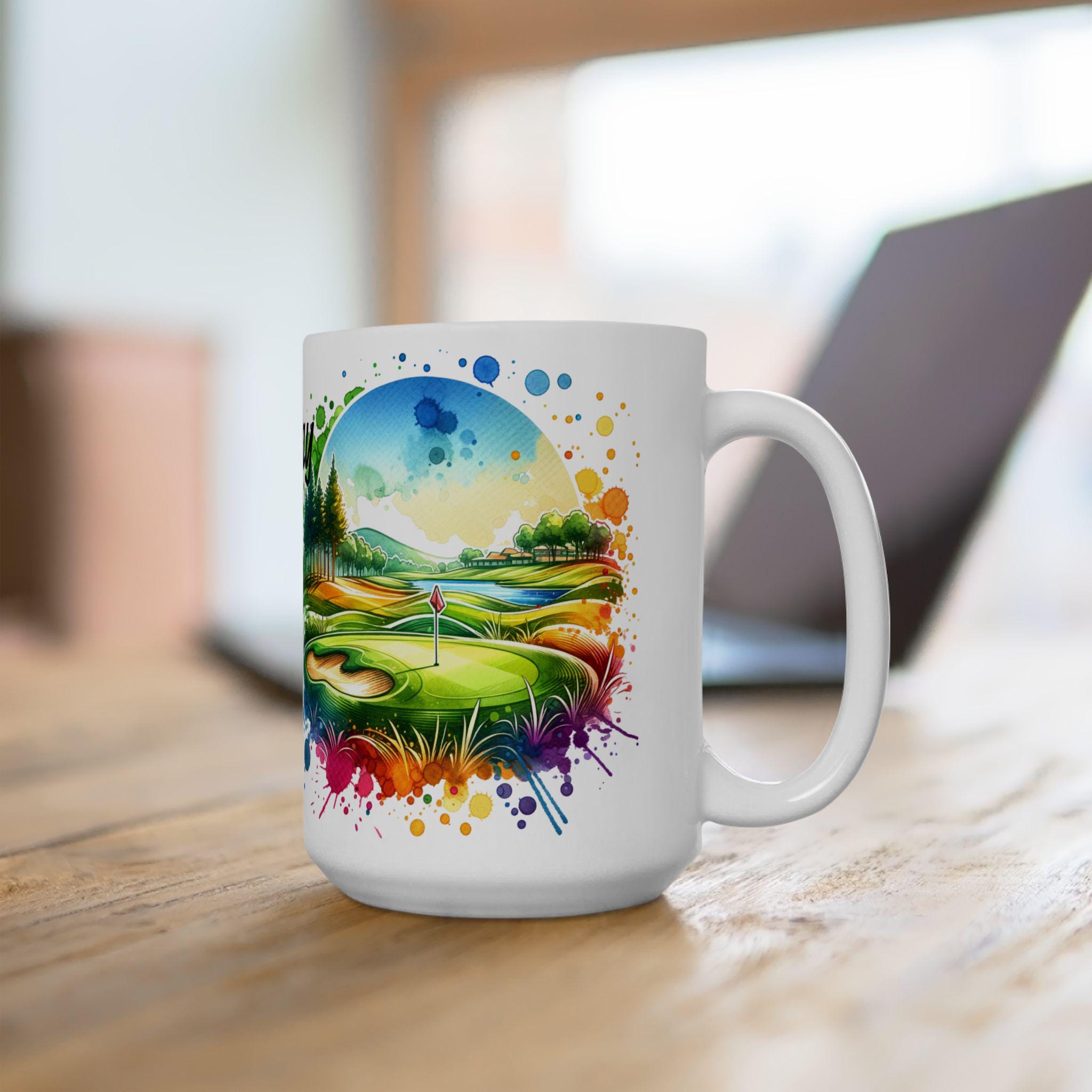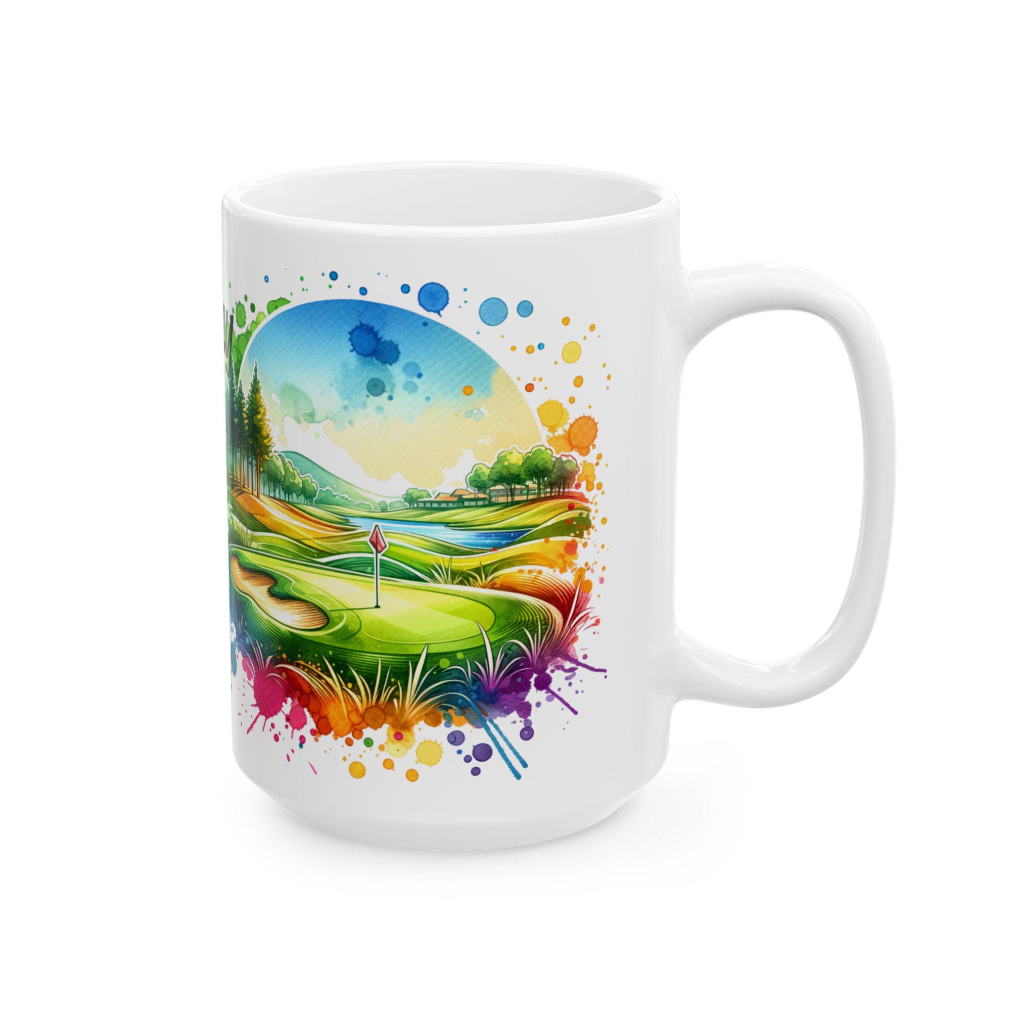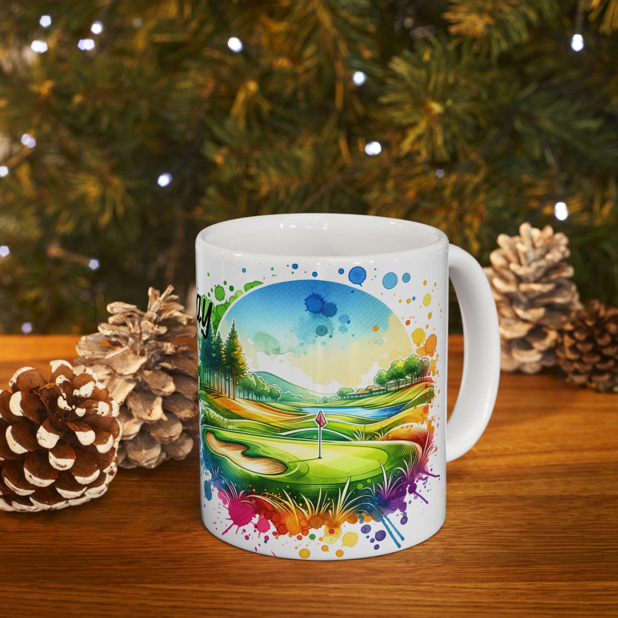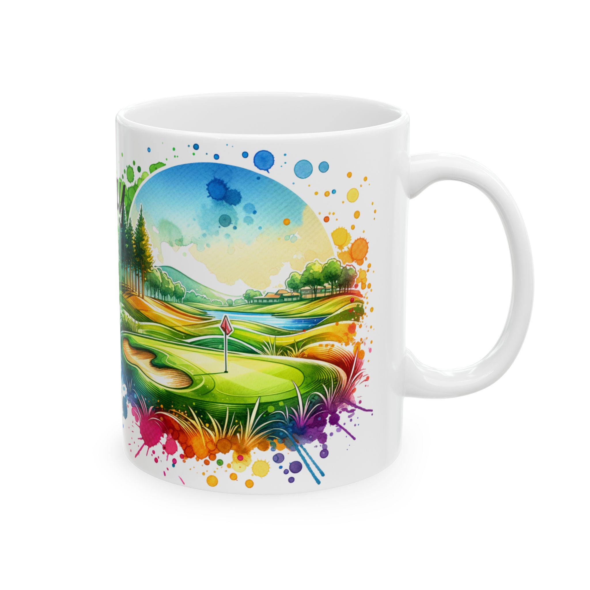 Wake up with a splash of color and a clear invitation to play. This ceramic mug wraps a vibrant golf scene — swinging player, sunlit fairway, and paint-splatter accents — around a clean white canvas. It brings the breezy energy of a morning round into quiet kitchen moments, fueling pre-game rituals or slow weekend coffee breaks. The glossy finish makes the artwork pop, while the comfortable C-handle and two size options adapt to whoever’s holding it: early-bird golfers, weekend warriors, or anyone who lives for that perfect drive down the fairway. Durable, safe, and bright, it’s the kind of everyday piece that sparks a smile and a little nostalgia for green grass and open skies.