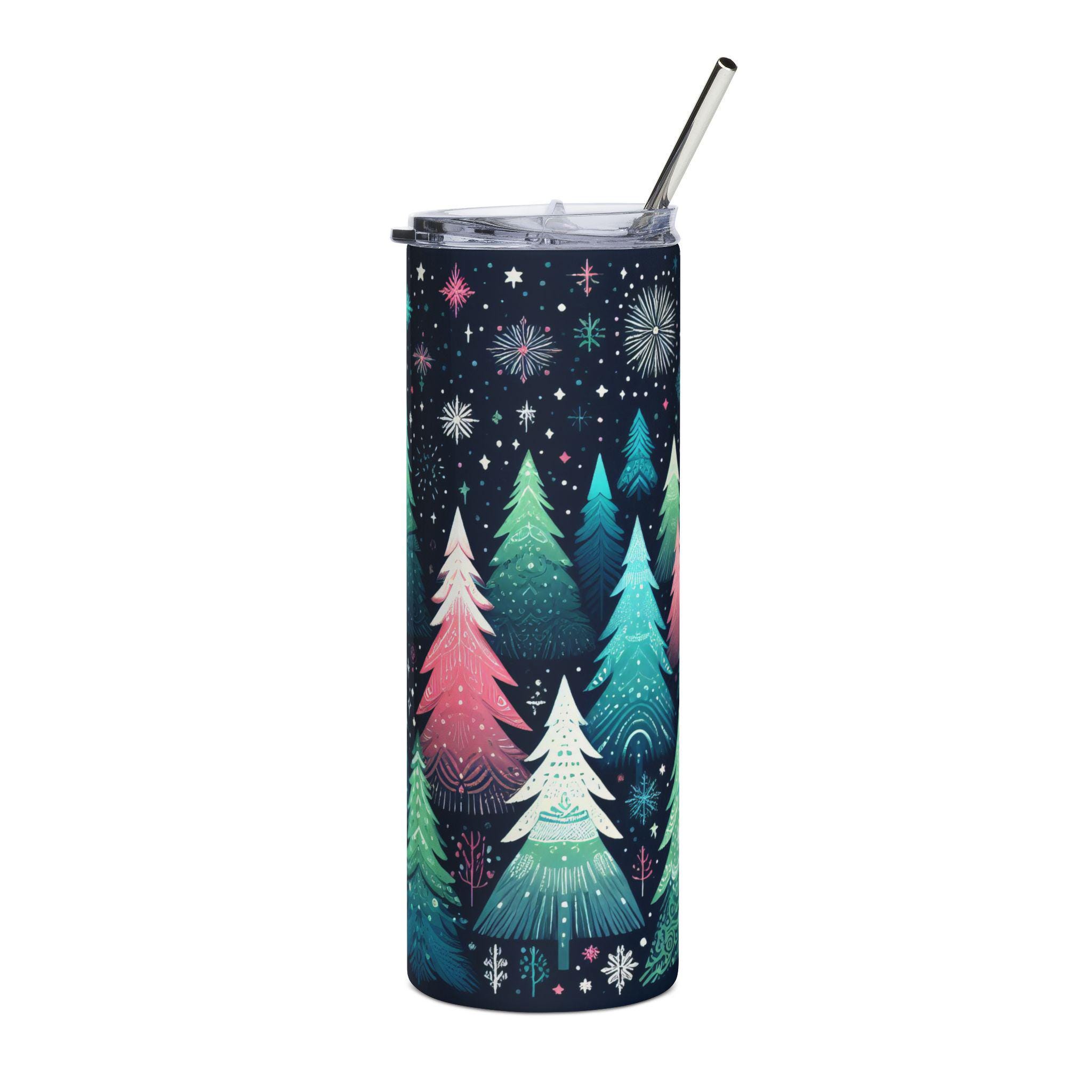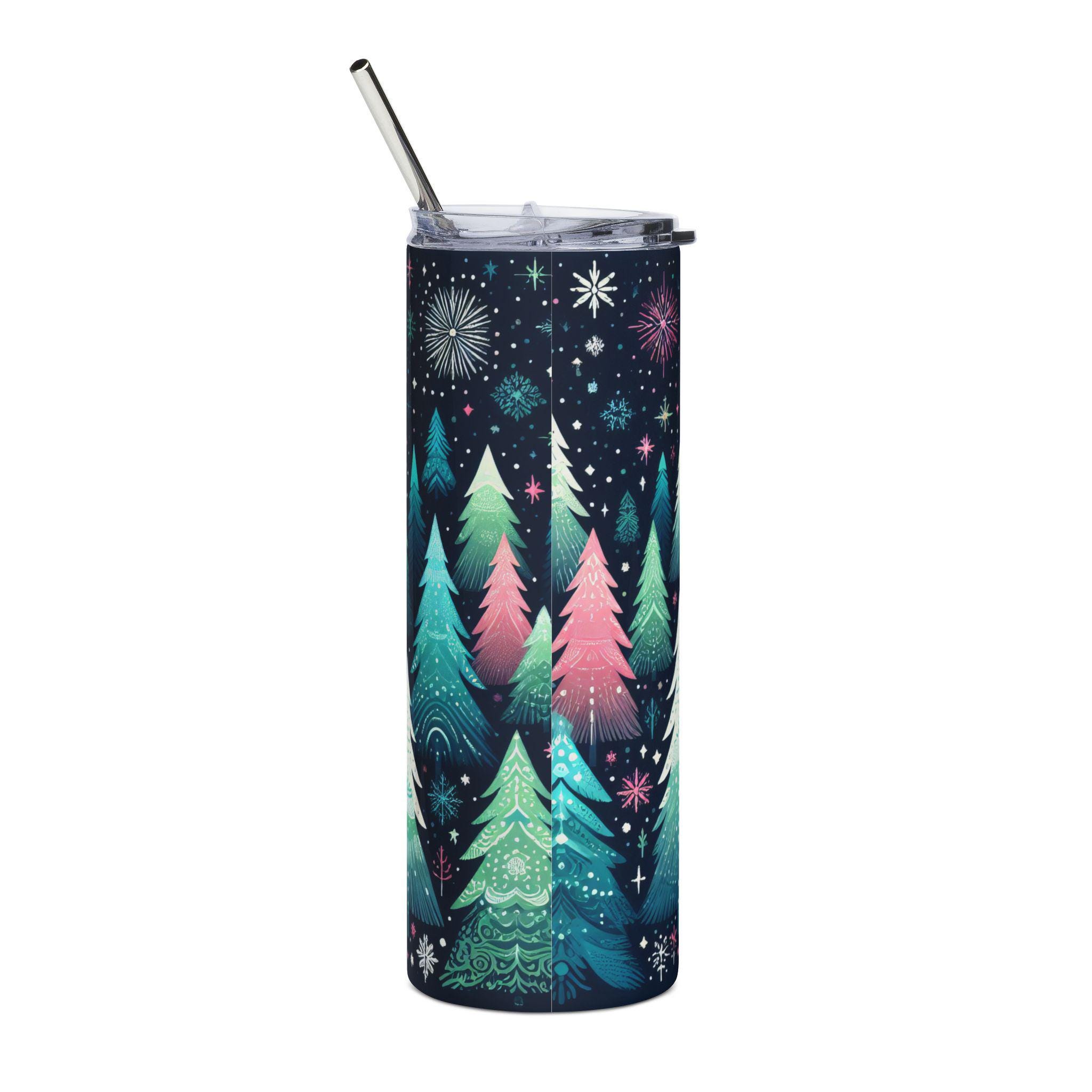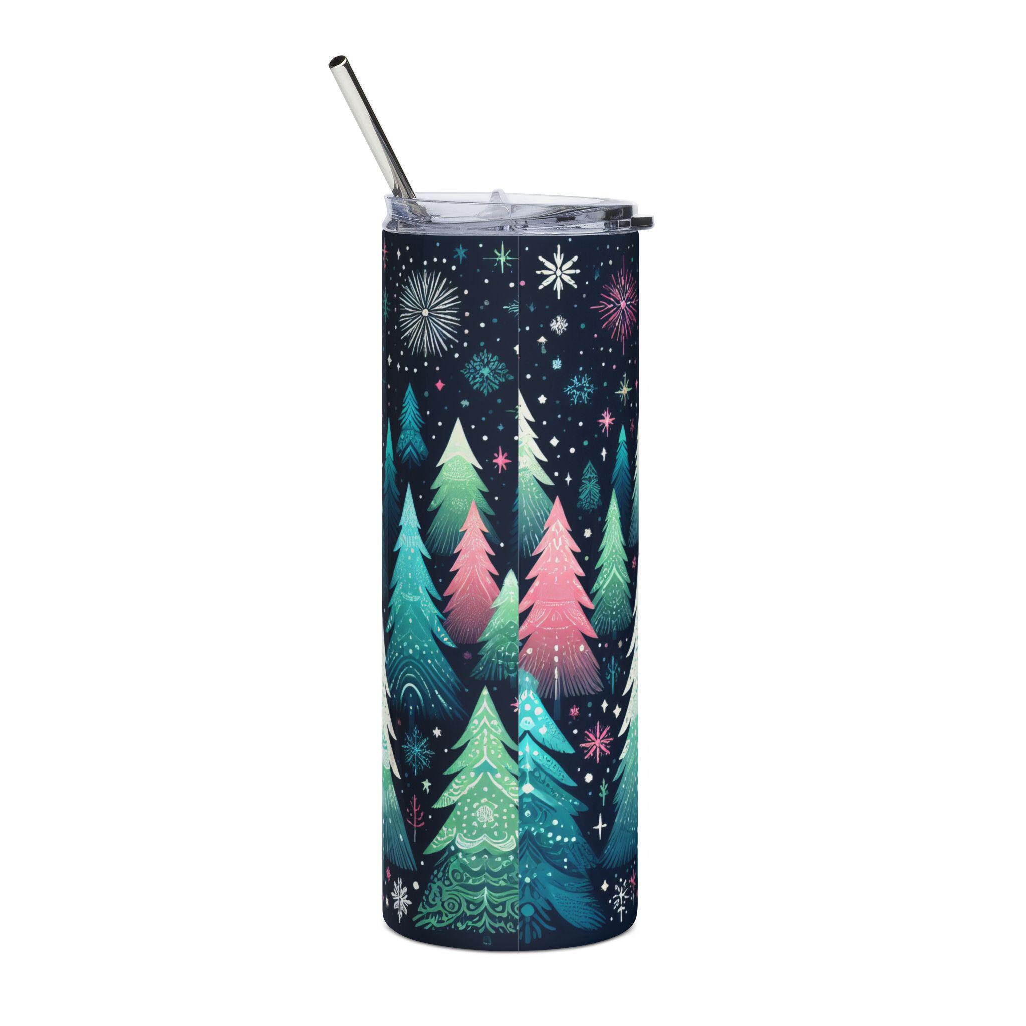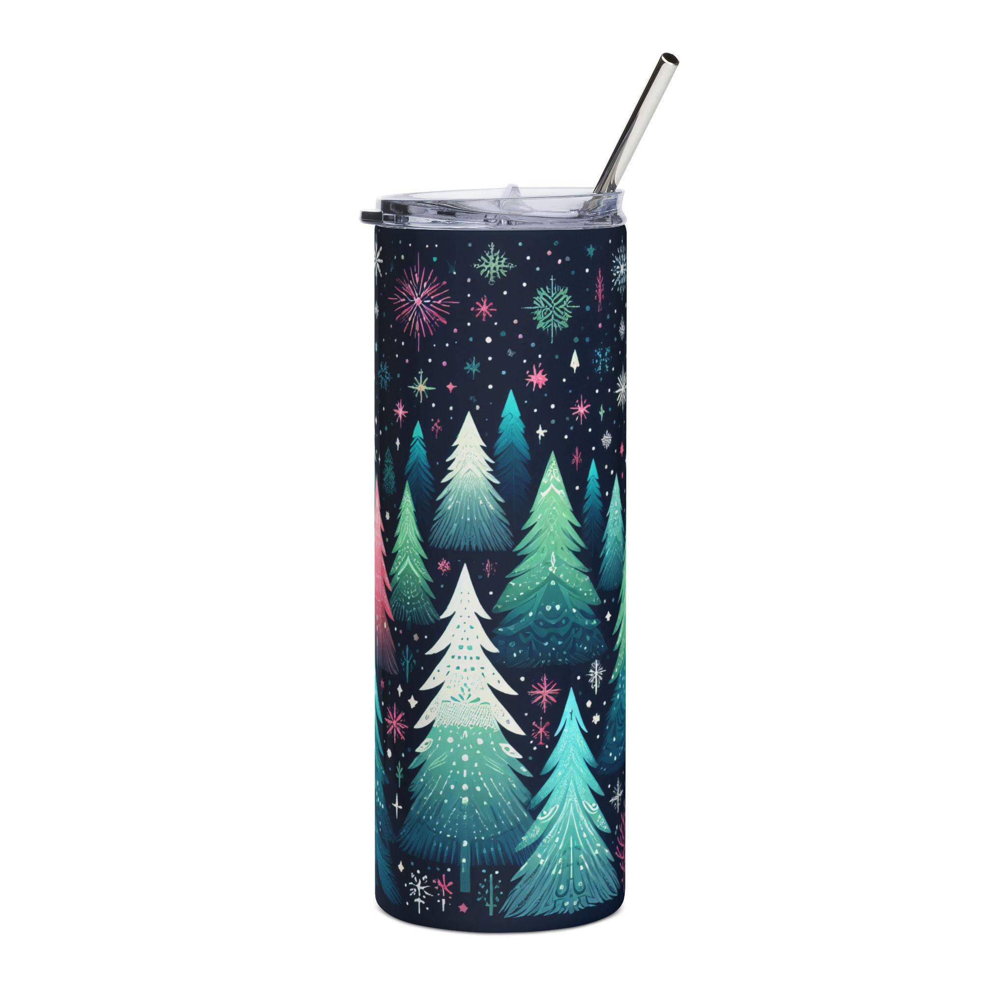 Tall, slim, and full of winter wonder — this 20 oz stainless steel tumbler wraps your drink in a midnight forest of teal, mint, and soft pink evergreens. The smooth glossy varnish brings out jewel-toned details: tiny stars, snowflakes, and sparkles that feel like a quiet snowfall under a starlit sky. Keep hot cocoa warm or iced drinks chilled while you wander holiday markets, commute through frosty mornings, or tuck a cozy beverage beside your favorite armchair. The included clear lid and reusable straw make sipping simple on the go. Lightweight and sturdy, it slips into narrow cup holders and feels at home in hands that love small seasonal comforts and woodland charm.