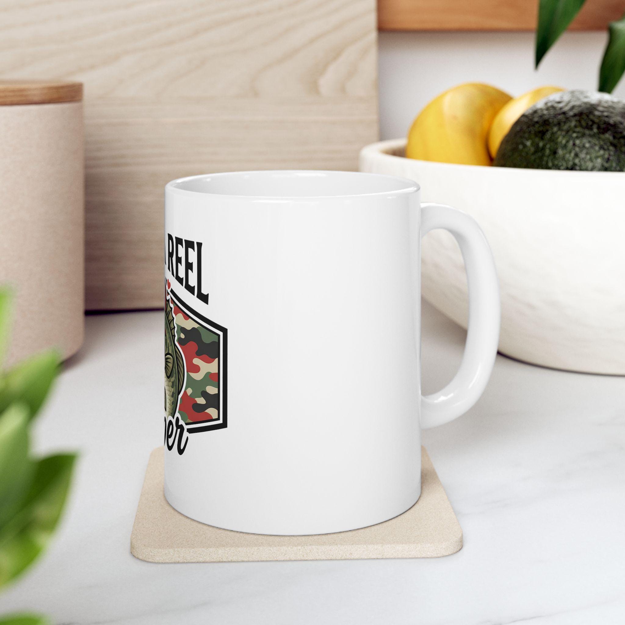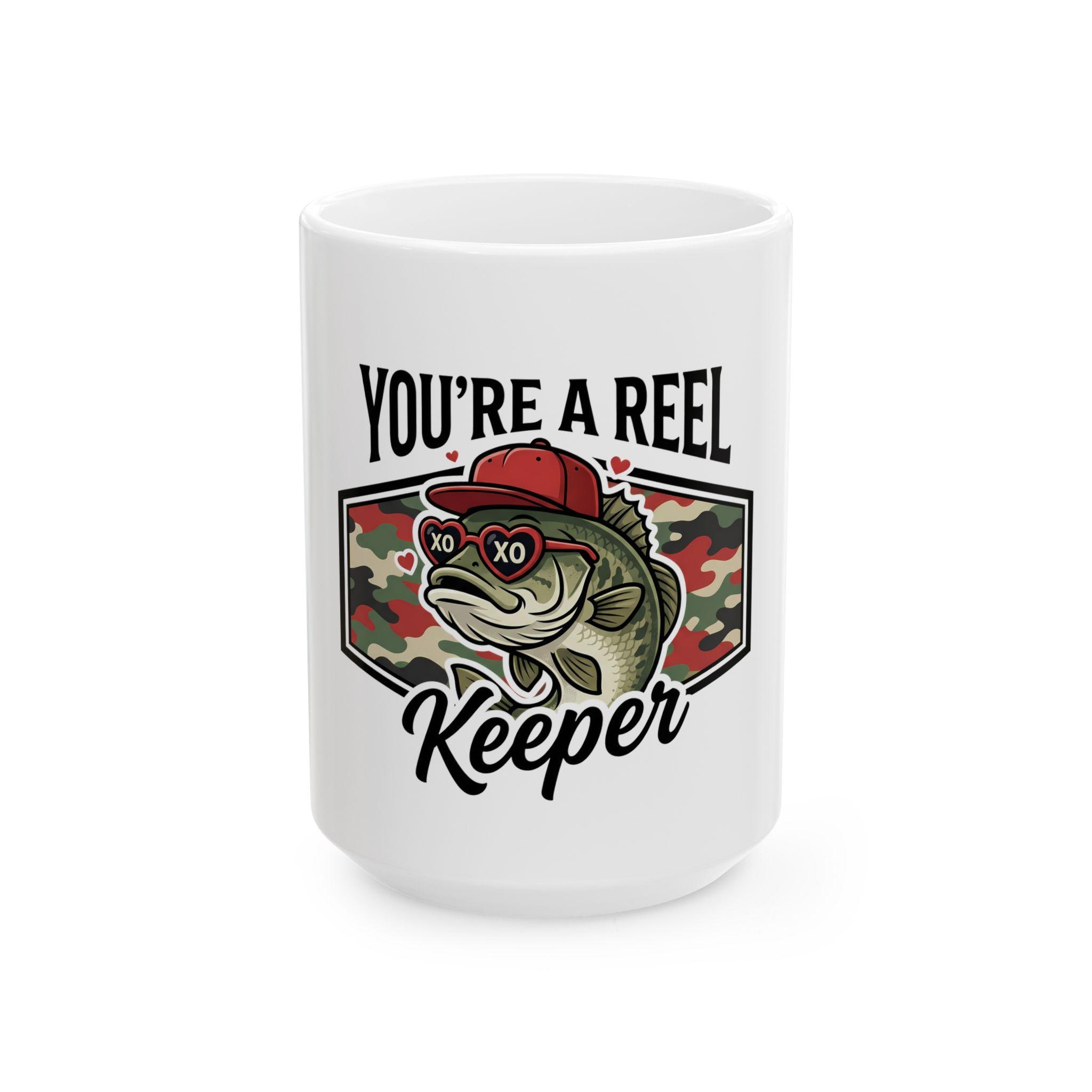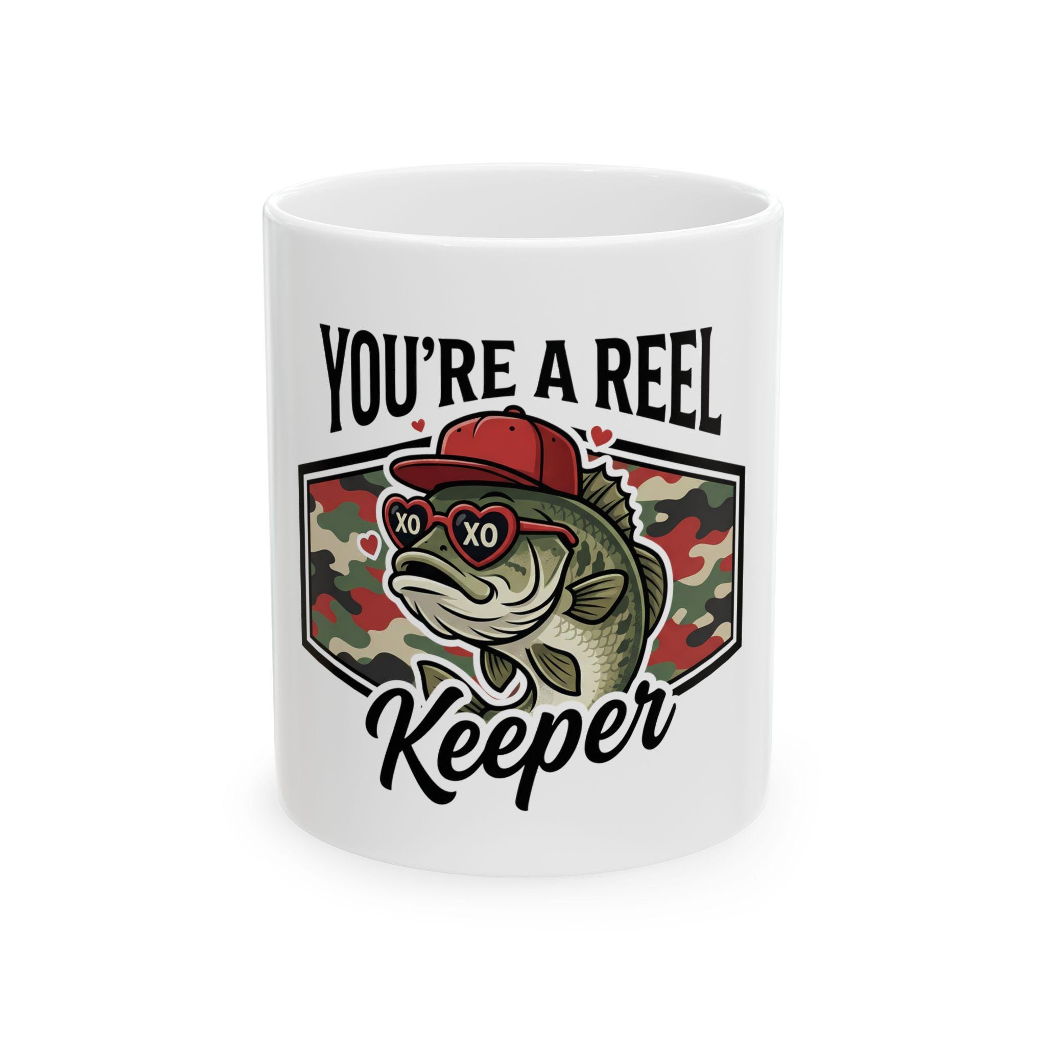 This ceramic mug carries a quiet, deliberate pride — the kind that comes from long mornings on the water and evenings spent swapping stories over a warm drink. The Reel Keeper design blends a bass silhouette with a camo heart, celebrating the slow, patient joy of fishing and the people who live for the next cast. It feels right in calloused hands and beside muddy boots. Use it to kickstart an early dawn, to warm chilled fingers after a day at the lake, or to anchor a memory of a shared catch. The glossy white surface makes the camo heart and bass artwork pop, so the mug looks lived-in and loved from the first sip.