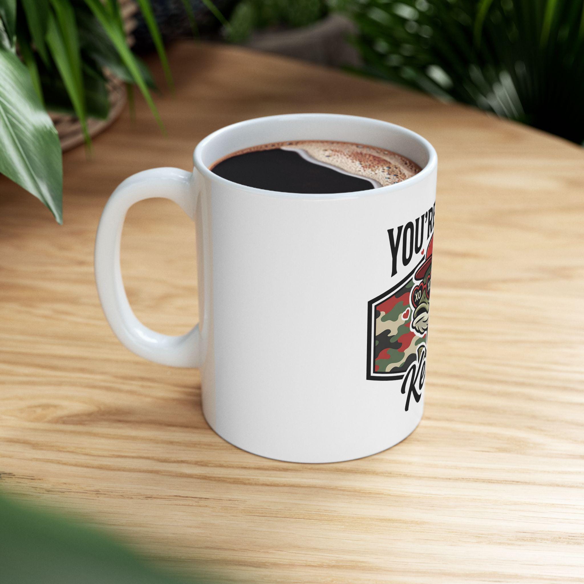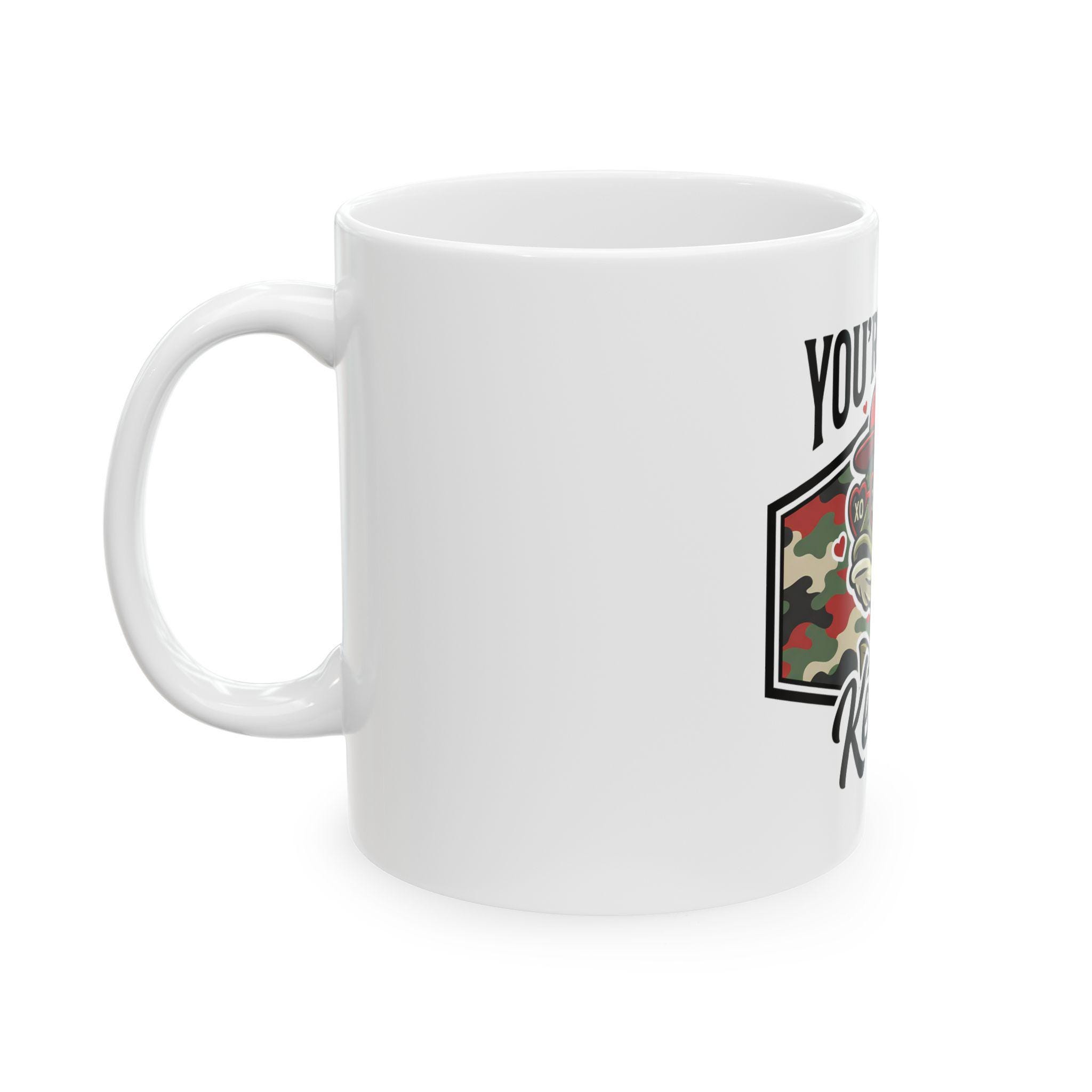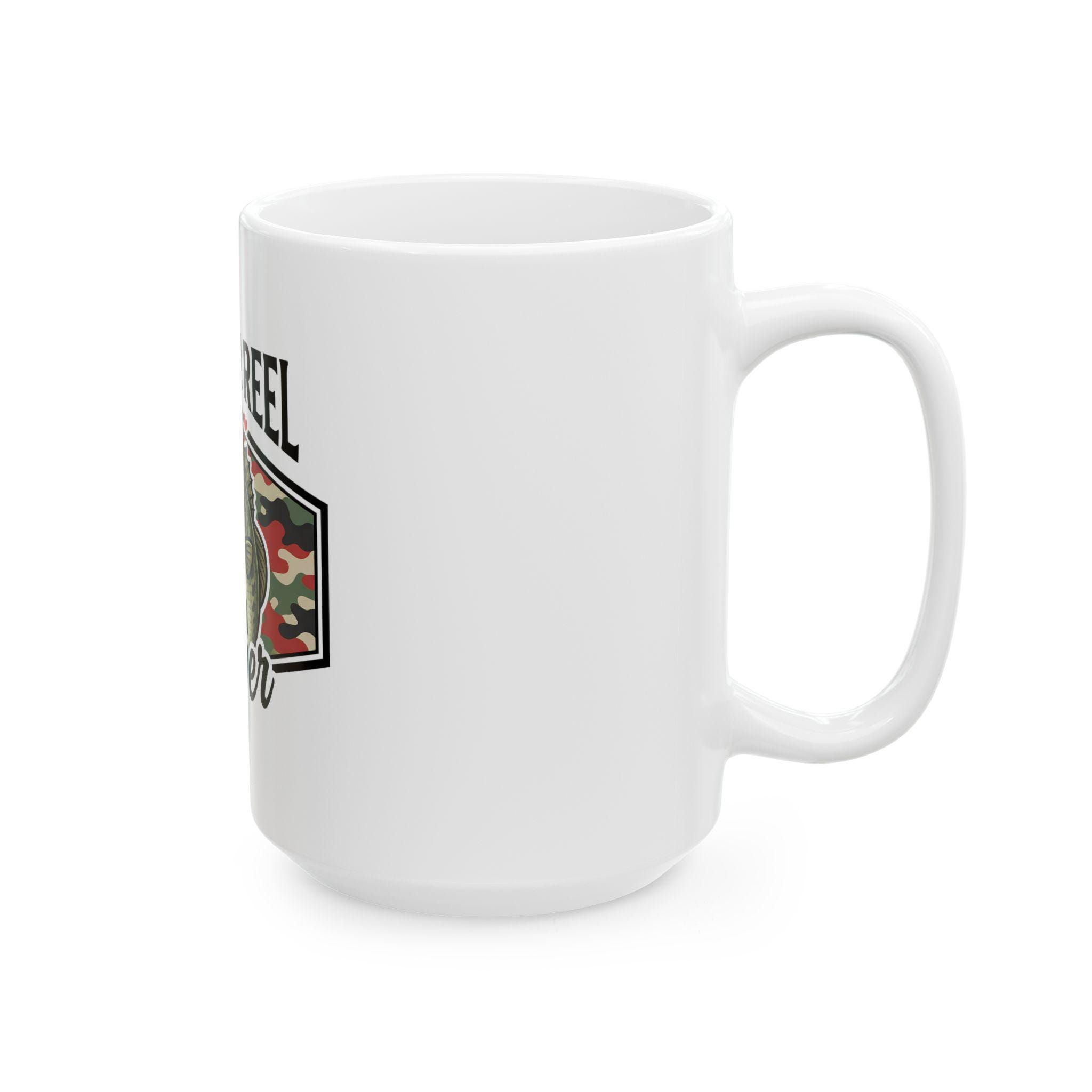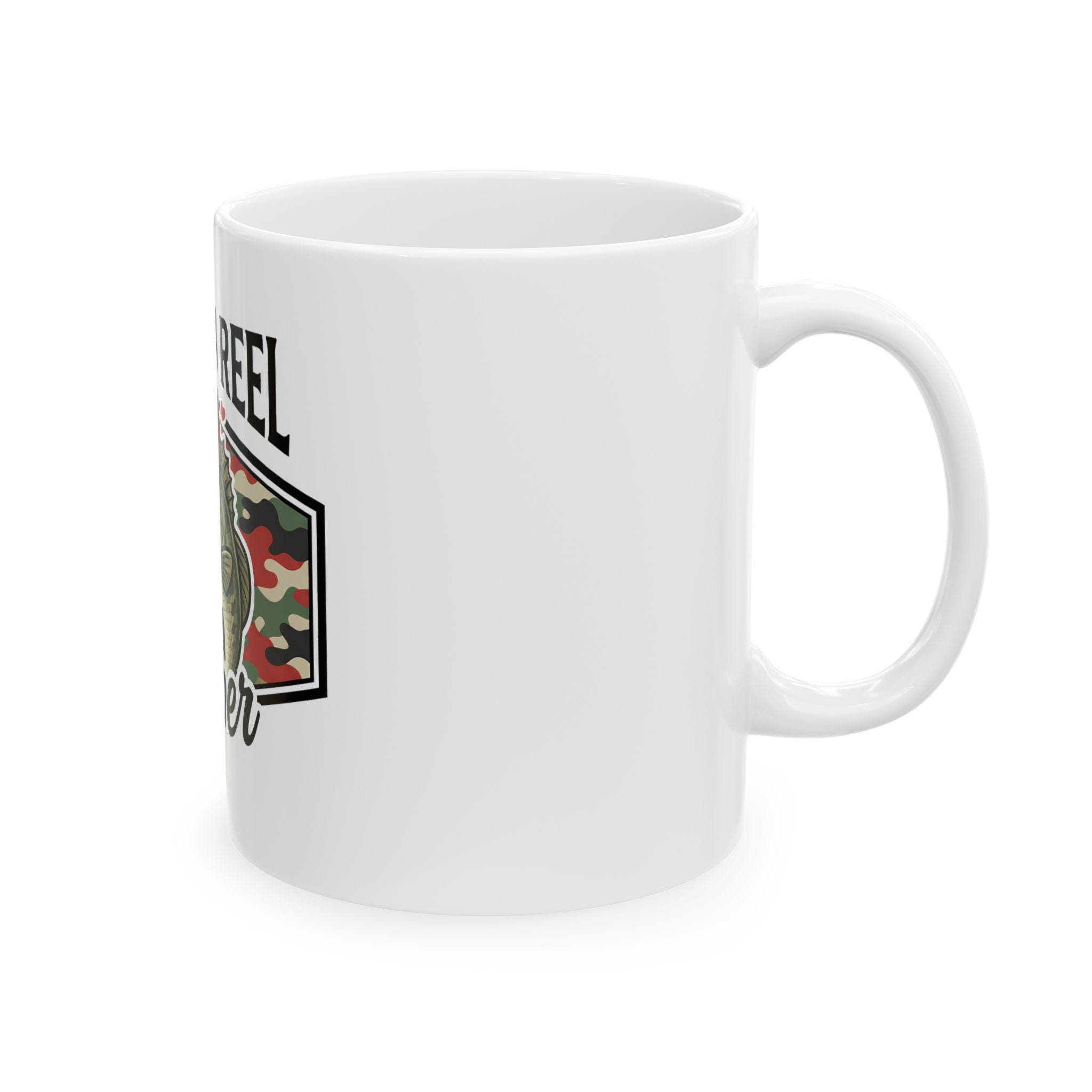 This ceramic mug carries a quiet, deliberate pride — the kind that comes from long mornings on the water and evenings spent swapping stories over a warm drink. The Reel Keeper design blends a bass silhouette with a camo heart, celebrating the slow, patient joy of fishing and the people who live for the next cast. It feels right in calloused hands and beside muddy boots. Use it to kickstart an early dawn, to warm chilled fingers after a day at the lake, or to anchor a memory of a shared catch. The glossy white surface makes the camo heart and bass artwork pop, so the mug looks lived-in and loved from the first sip.