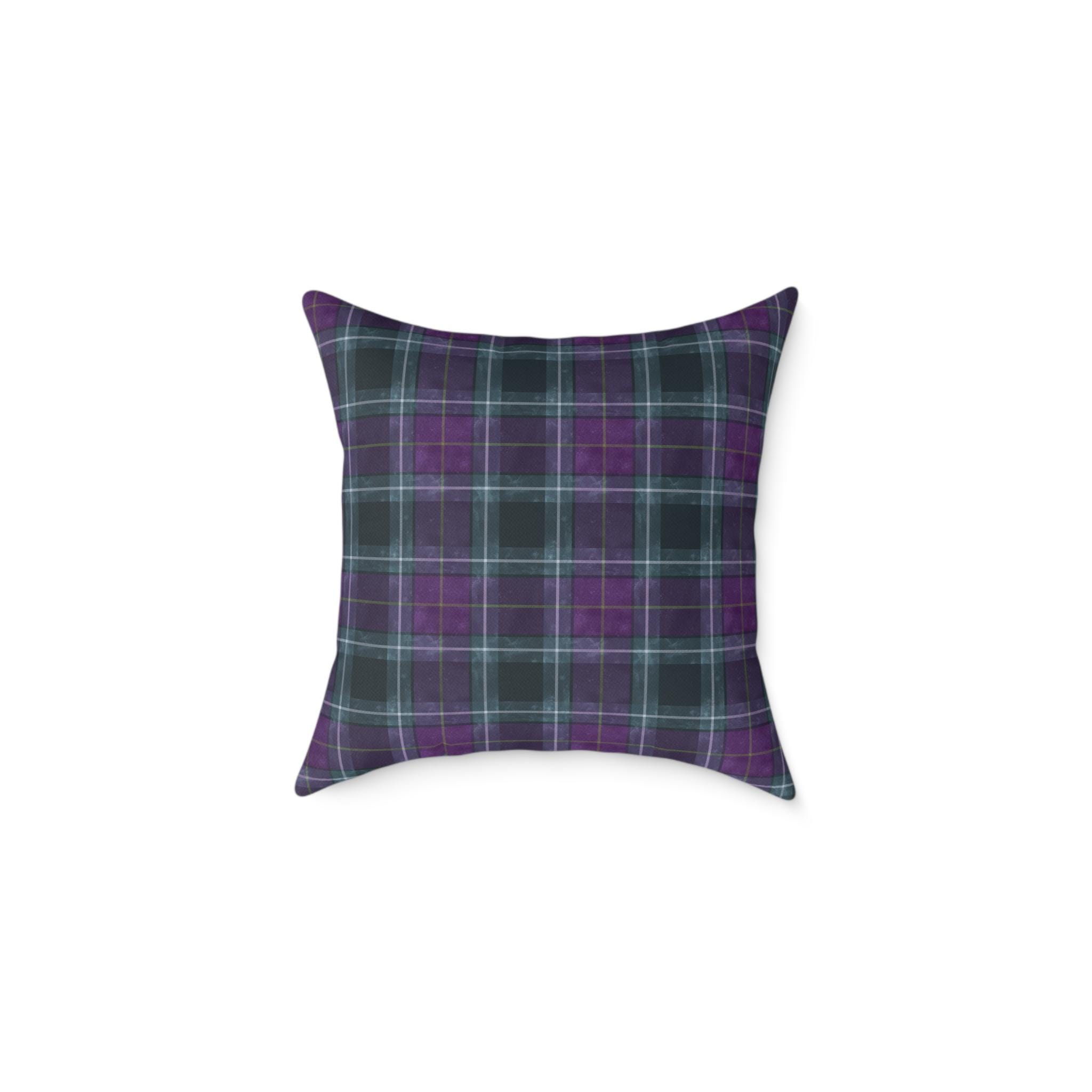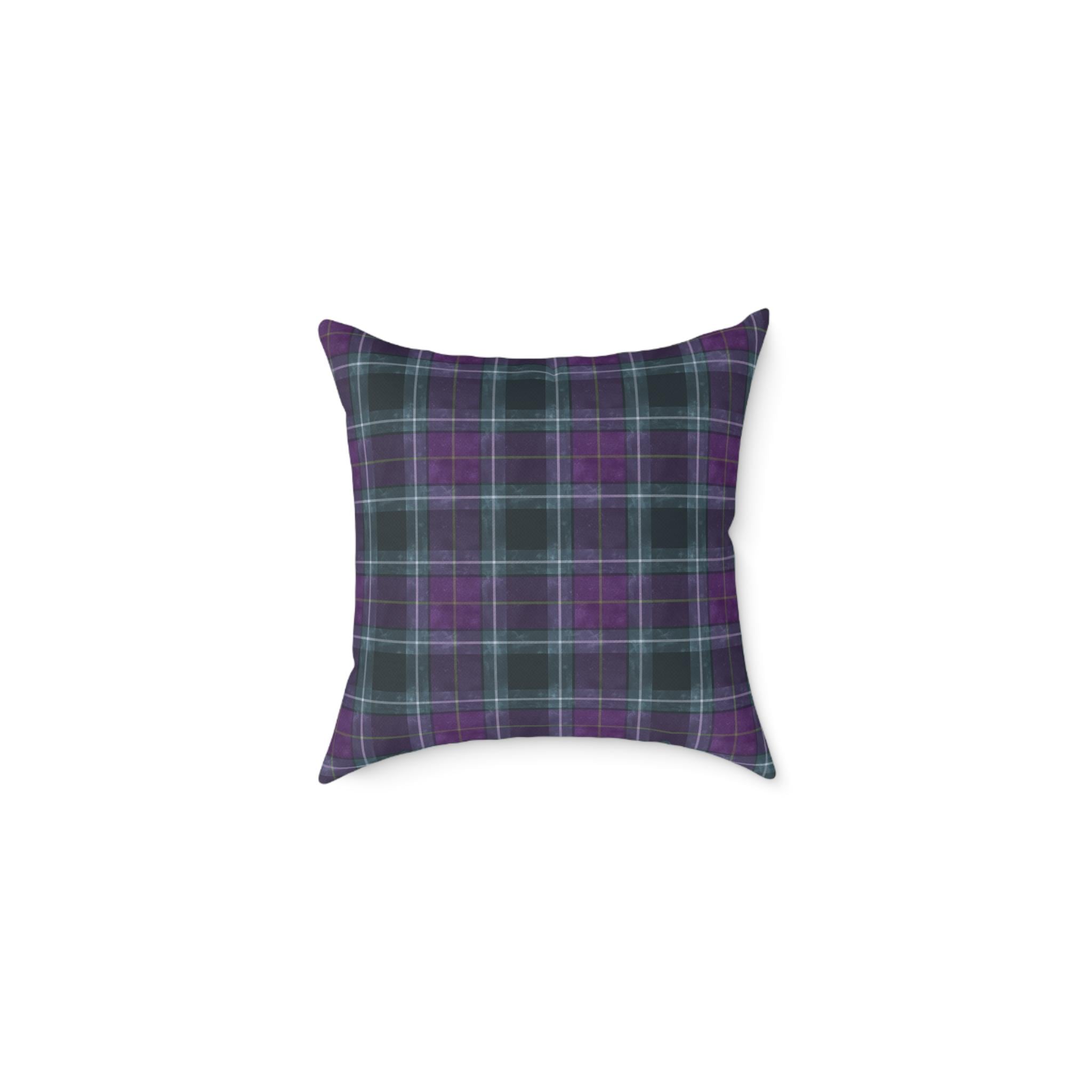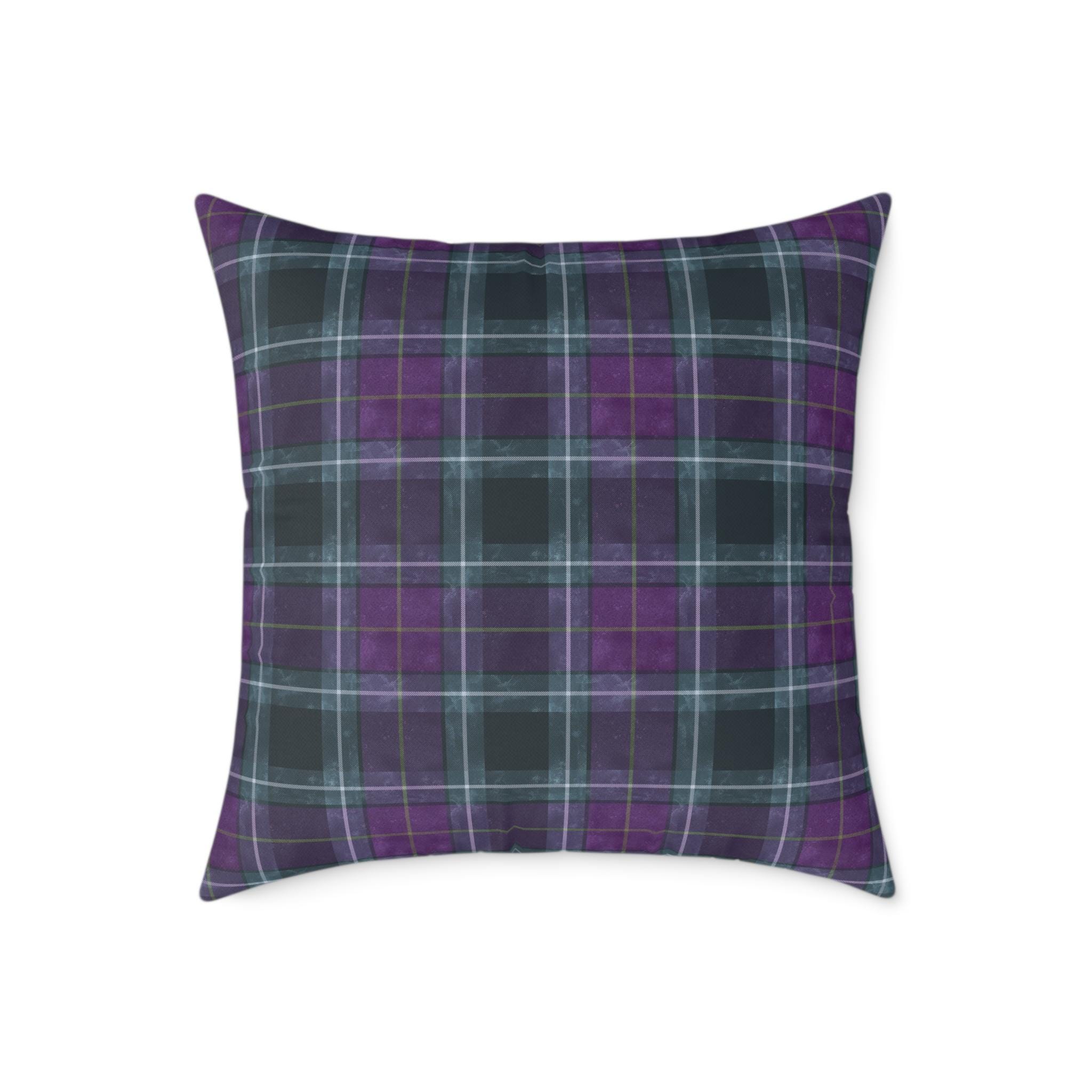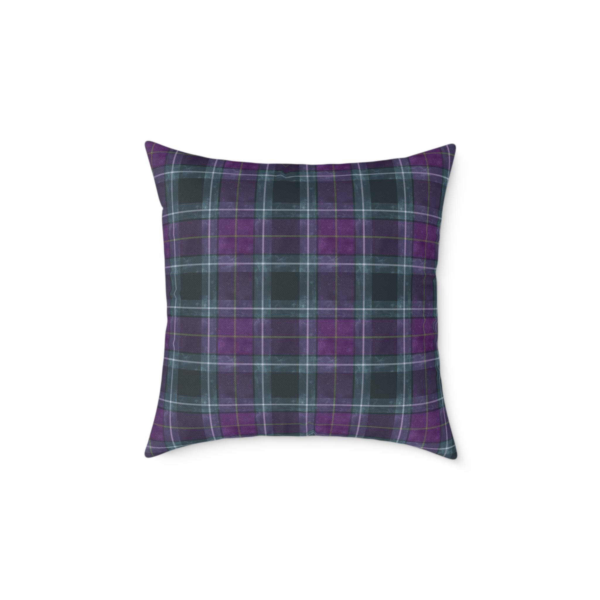 Soft, structured square pillow with a cozy tartan design in deep purples and muted teal lines. The fine-weave polyester canvas feels smooth to the touch while the resilient polyester filling keeps the pillow plump and supportive on sofas, reading nooks, or bedroom benches. The pattern is printed on both sides in vivid, fade-resistant color. A hidden zipper keeps the cover neat and allows easy cleaning or swapping of the insert. Available in multiple sizes to suit floor seating or accent cushion arrangements.