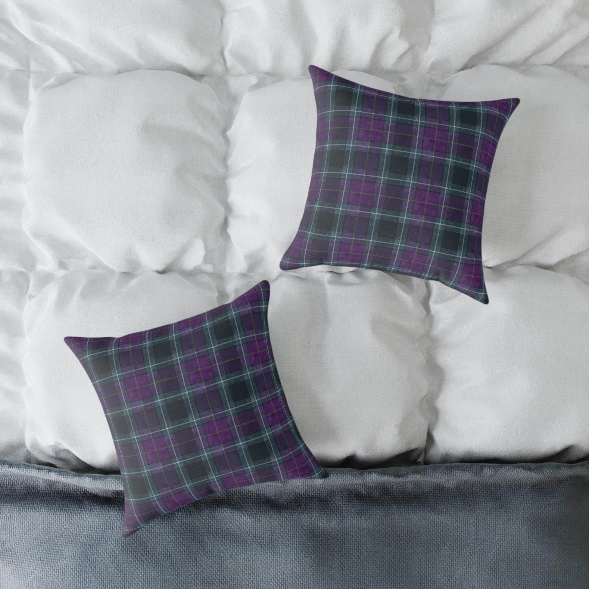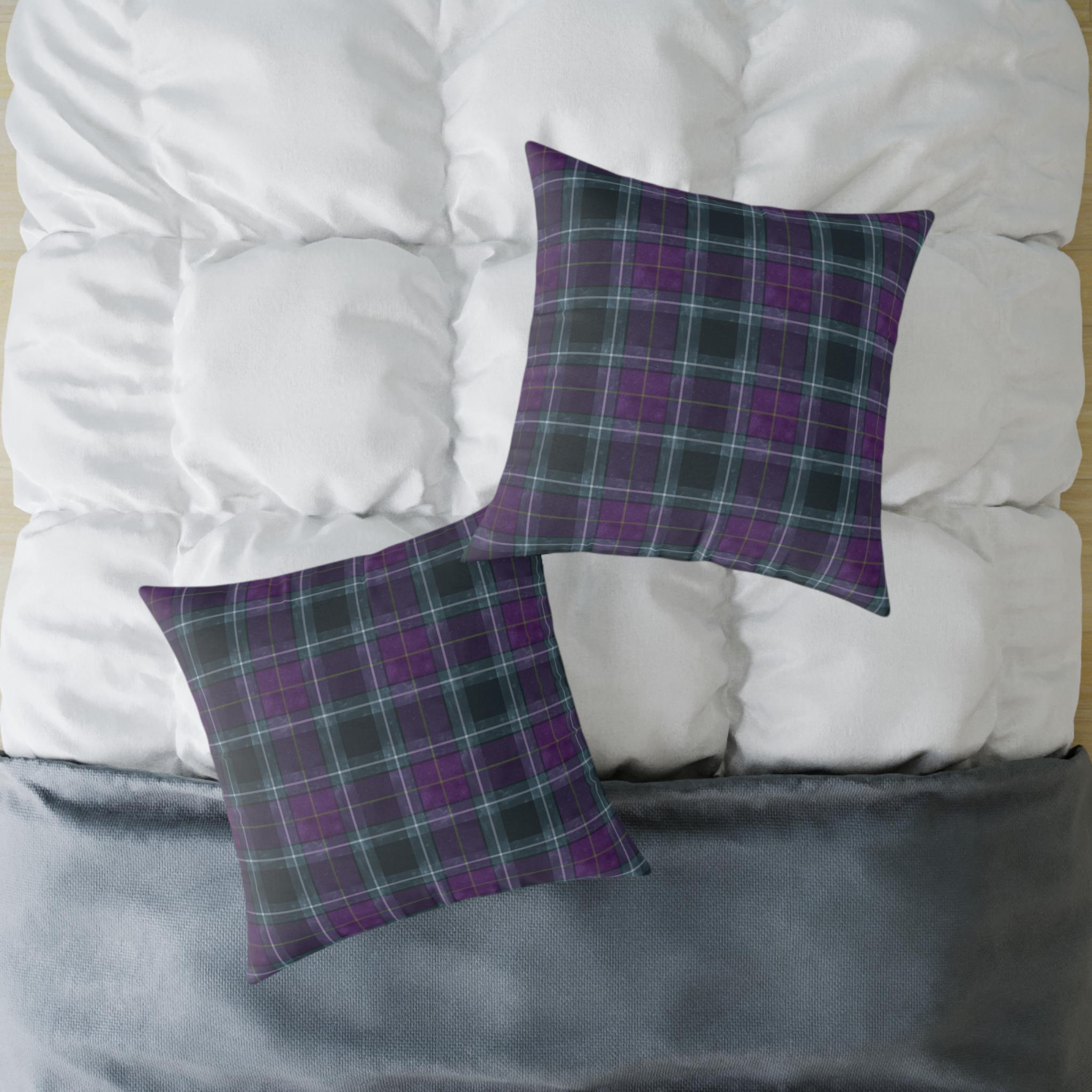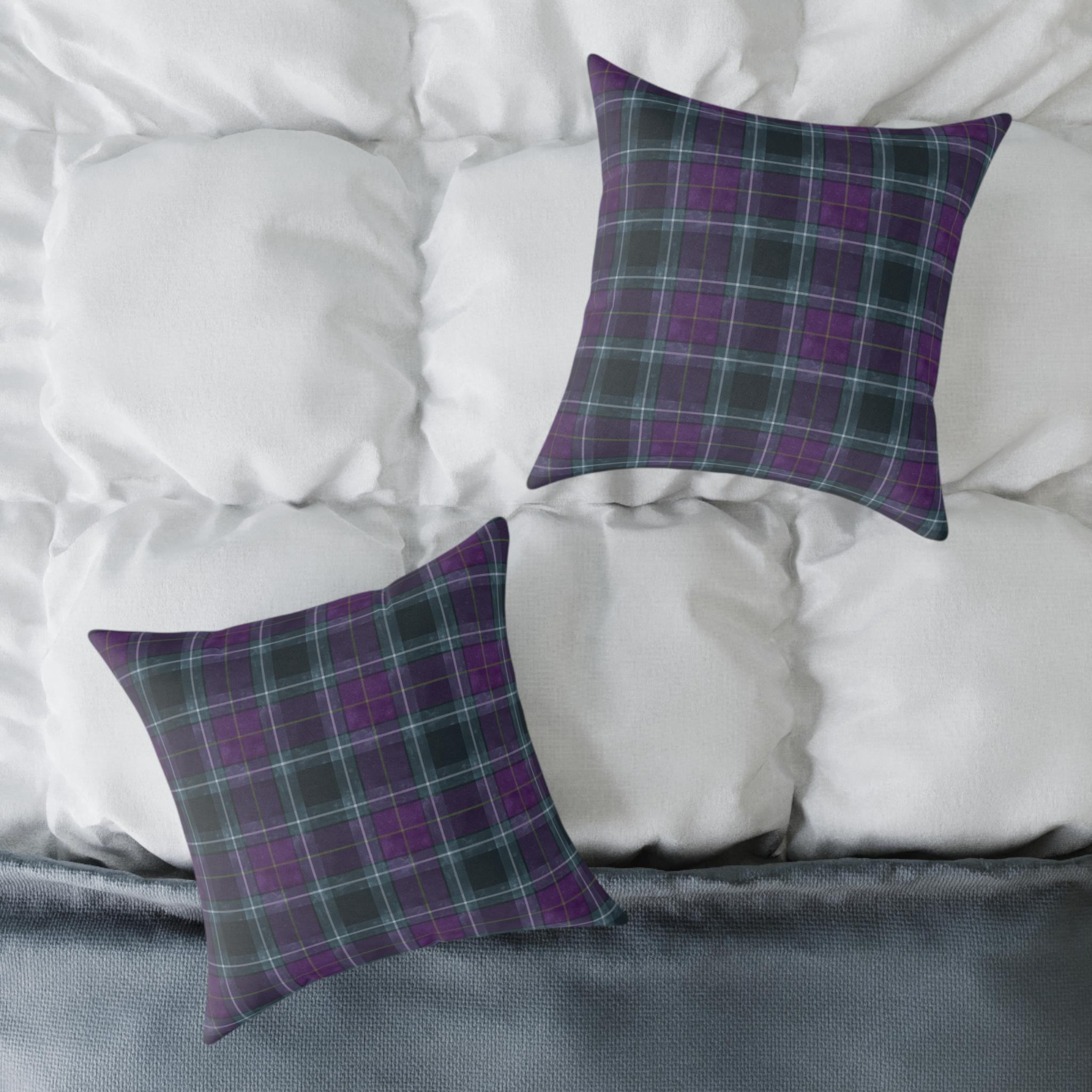 Soft, structured square pillow with a cozy tartan design in deep purples and muted teal lines. The fine-weave polyester canvas feels smooth to the touch while the resilient polyester filling keeps the pillow plump and supportive on sofas, reading nooks, or bedroom benches. The pattern is printed on both sides in vivid, fade-resistant color. A hidden zipper keeps the cover neat and allows easy cleaning or swapping of the insert. Available in multiple sizes to suit floor seating or accent cushion arrangements.
