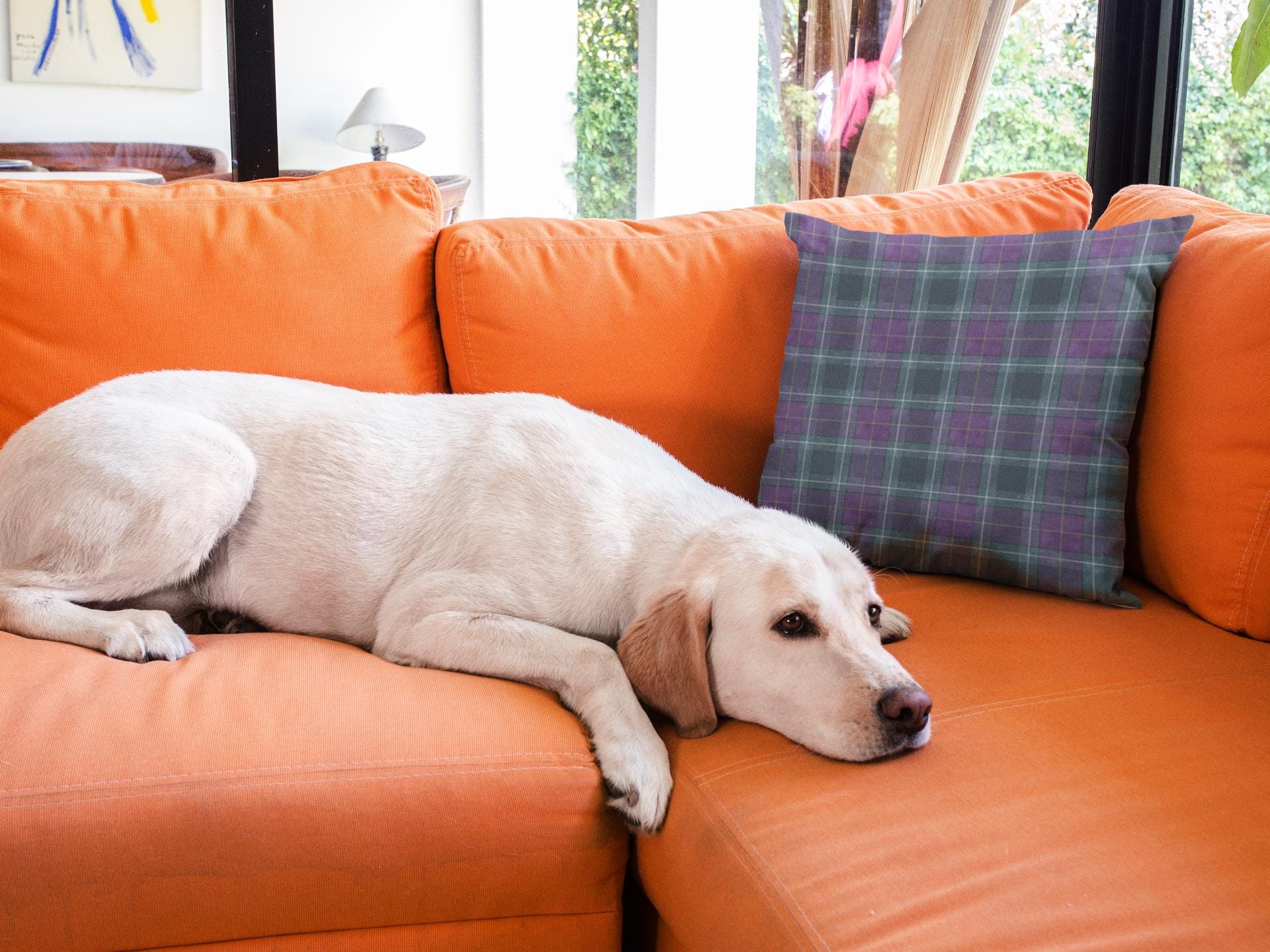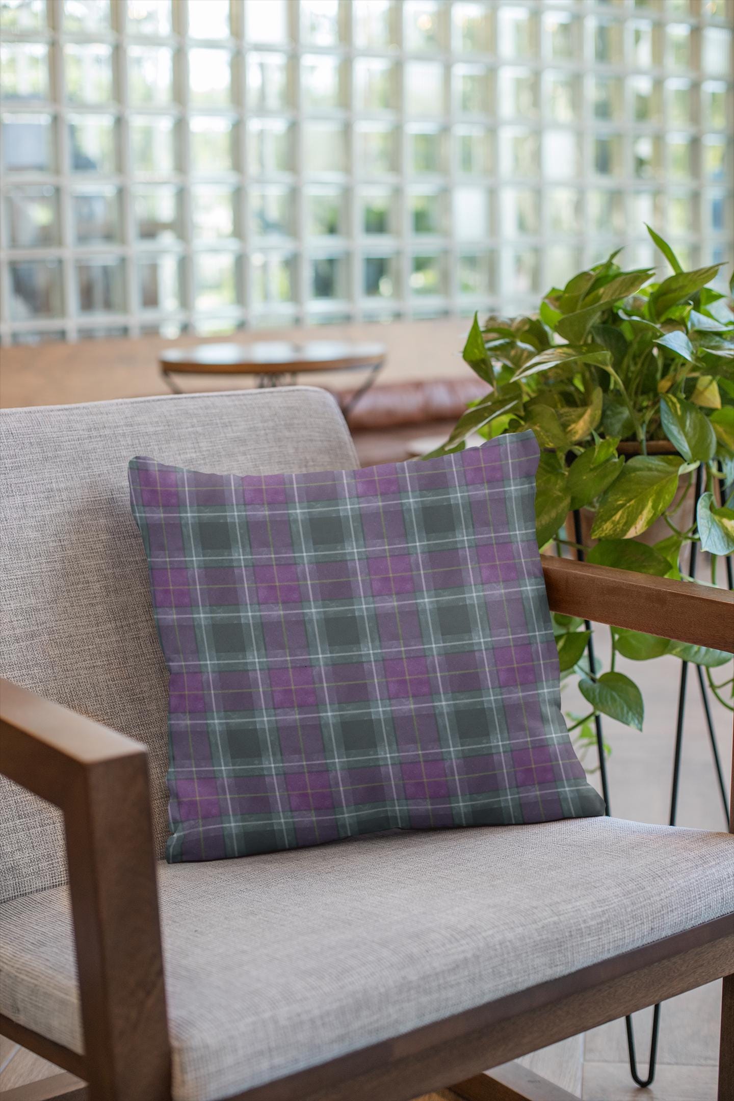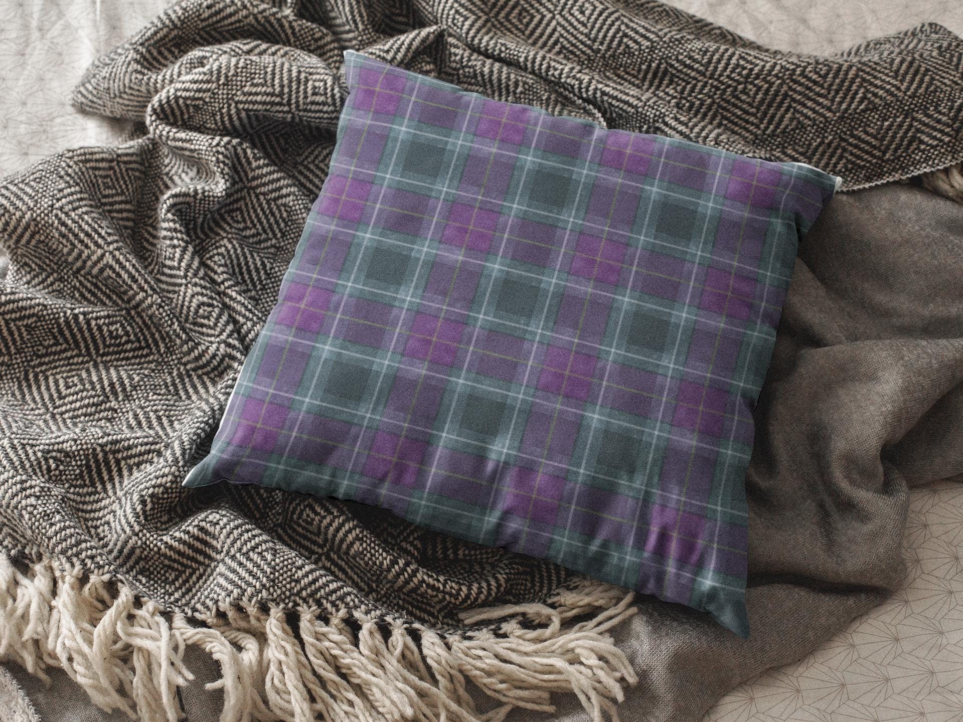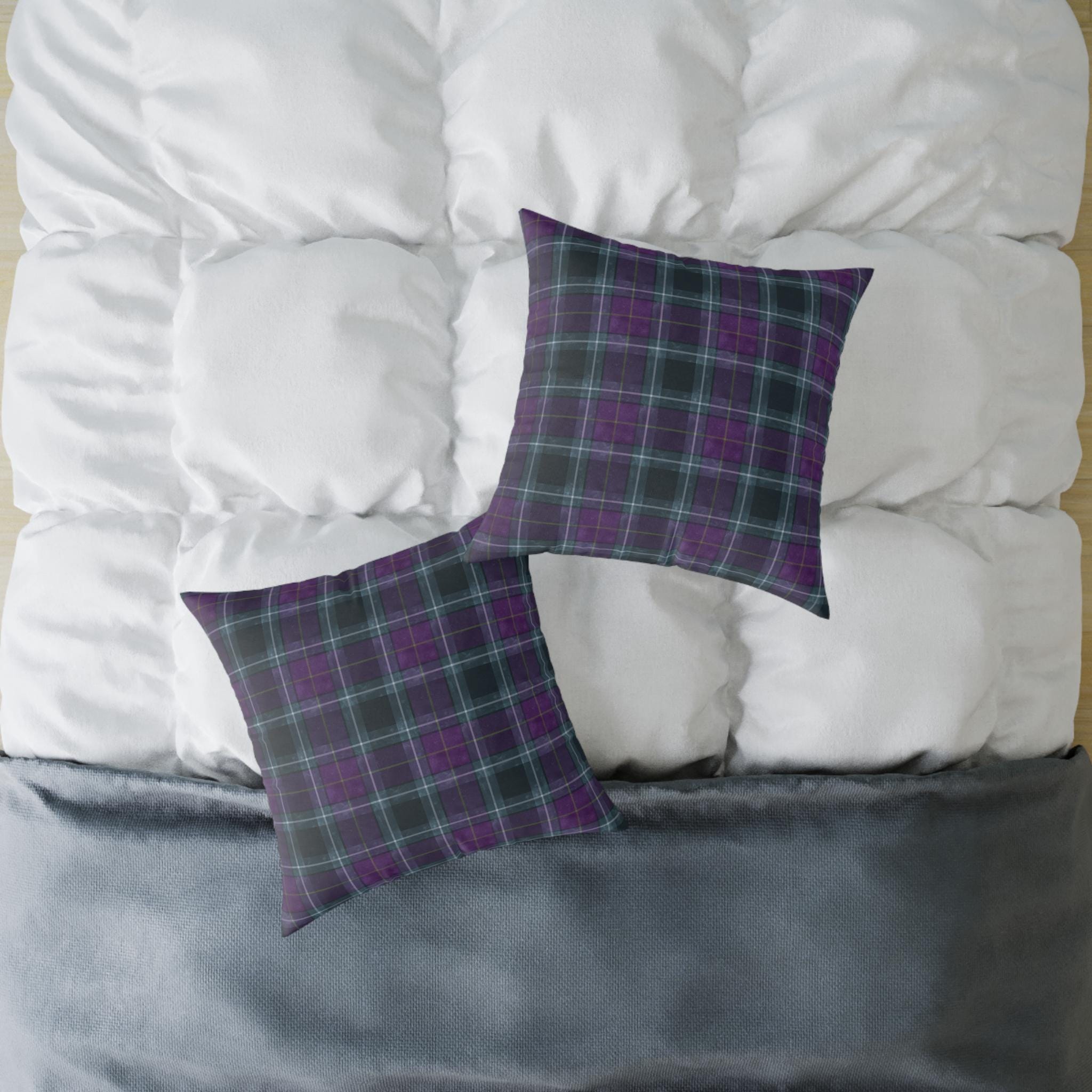 Soft, structured square pillow with a cozy tartan design in deep purples and muted teal lines. The fine-weave polyester canvas feels smooth to the touch while the resilient polyester filling keeps the pillow plump and supportive on sofas, reading nooks, or bedroom benches. The pattern is printed on both sides in vivid, fade-resistant color. A hidden zipper keeps the cover neat and allows easy cleaning or swapping of the insert. Available in multiple sizes to suit floor seating or accent cushion arrangements.