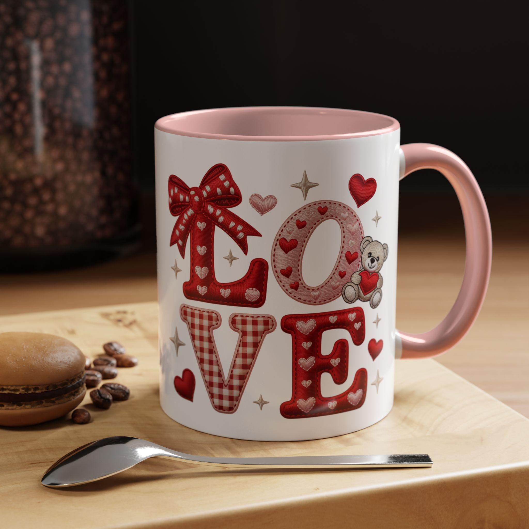 Warmth in every sip. This ceramic accent mug pairs a glossy white exterior with a bold colored interior and handle to frame a whimsical, heart-filled LOVE design—stitched textures, tiny hearts, and a cuddly teddy that makes each morning feel like a handwritten note. It feels gentle in your hands thanks to the classic C-shaped handle and smooth finish, and the vibrant print keeps its charm through daily use. Bring it out on cozy mornings, quiet Valentine’s breakfasts, or whenever you want to send a small, sweet moment across the table.