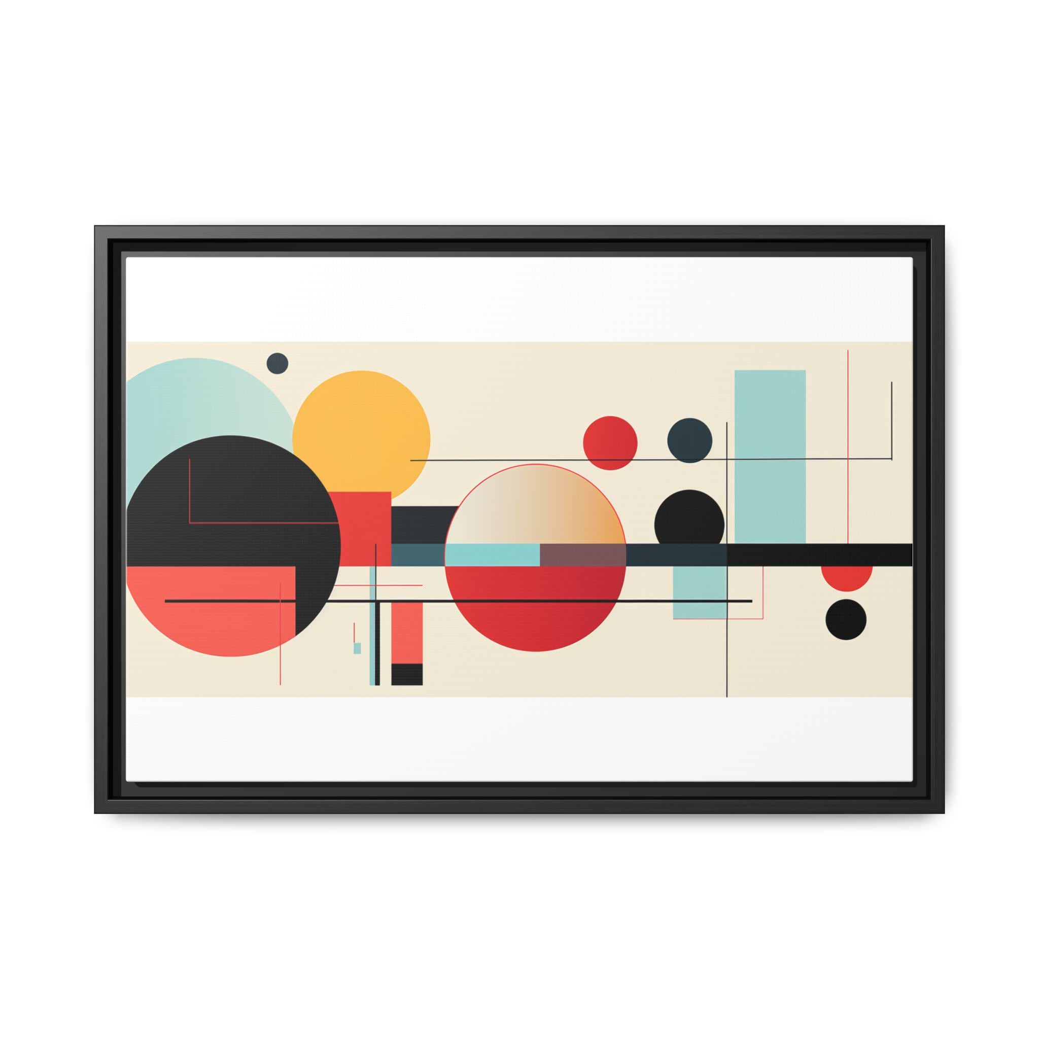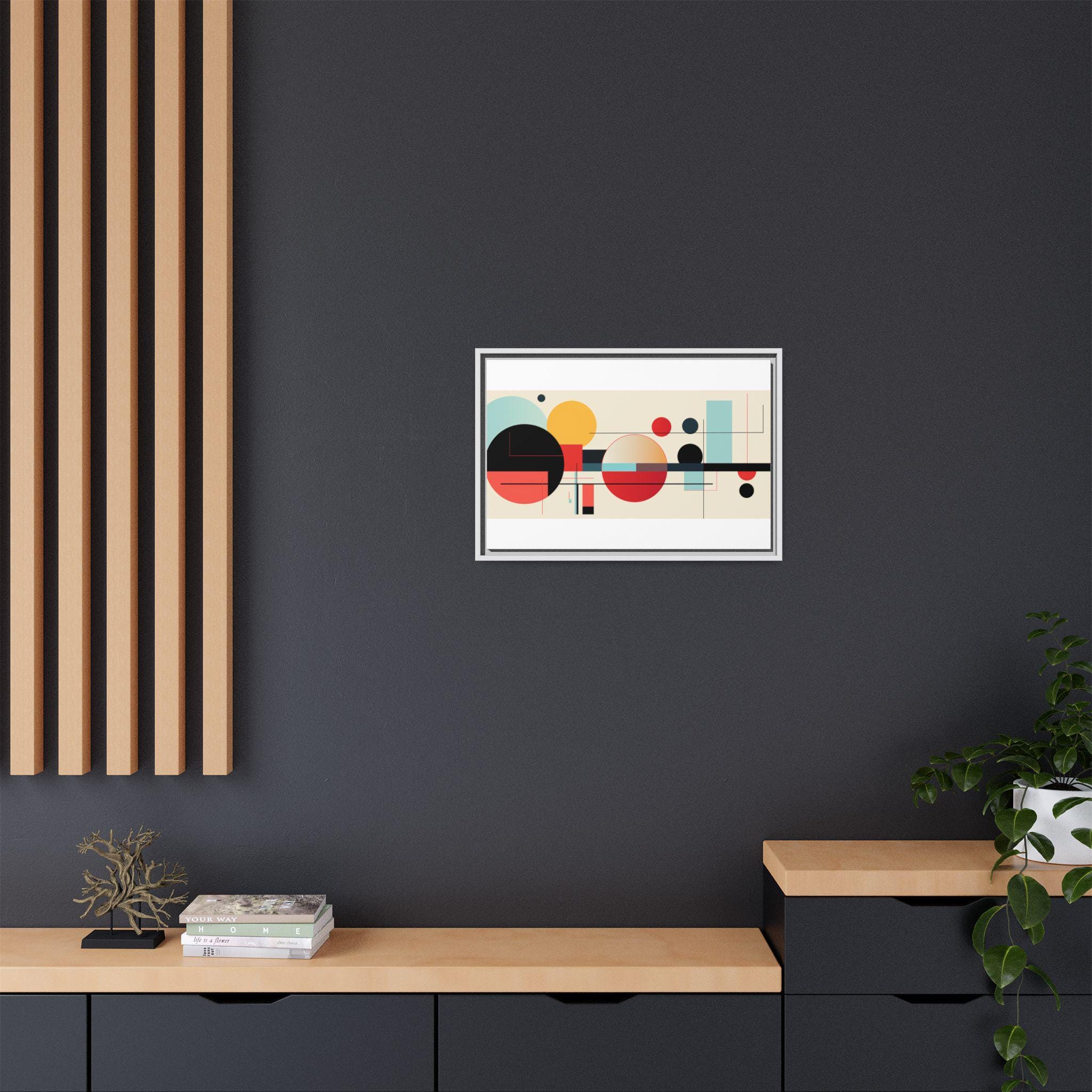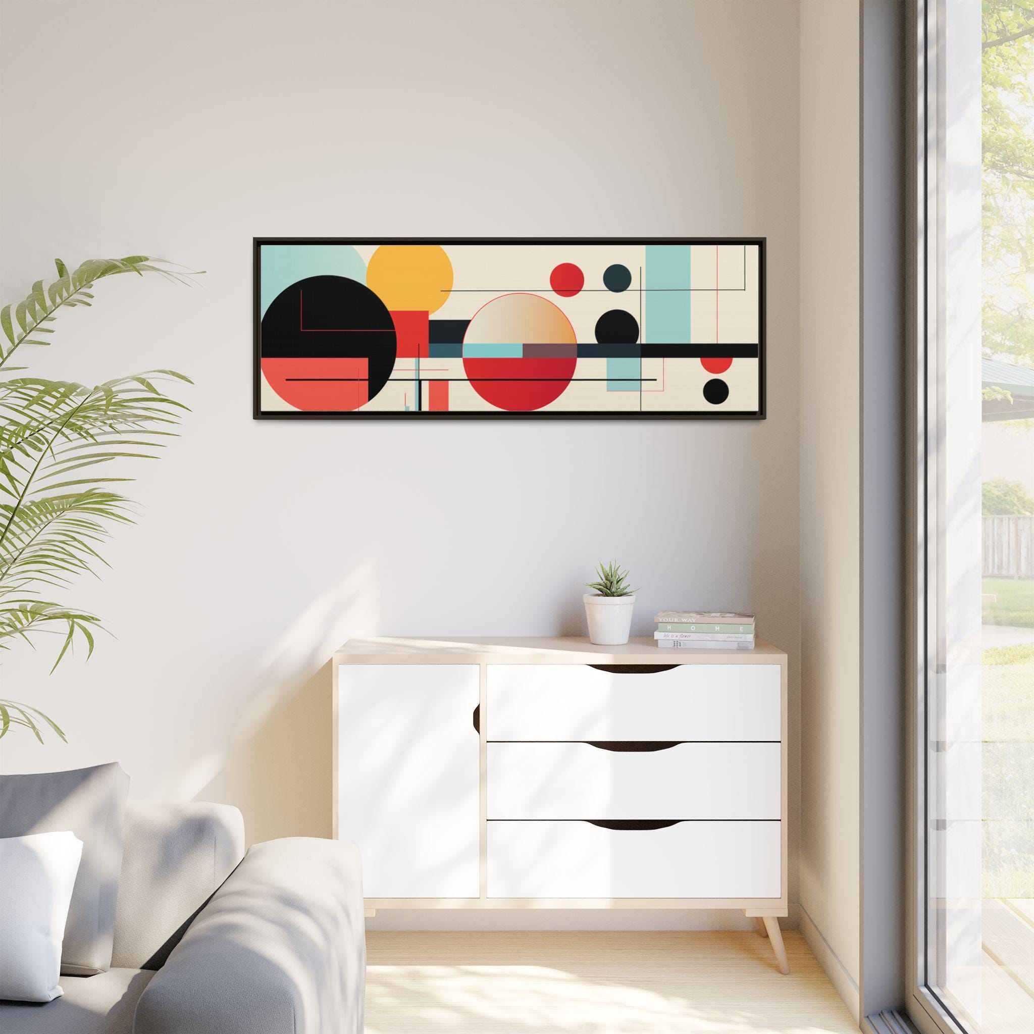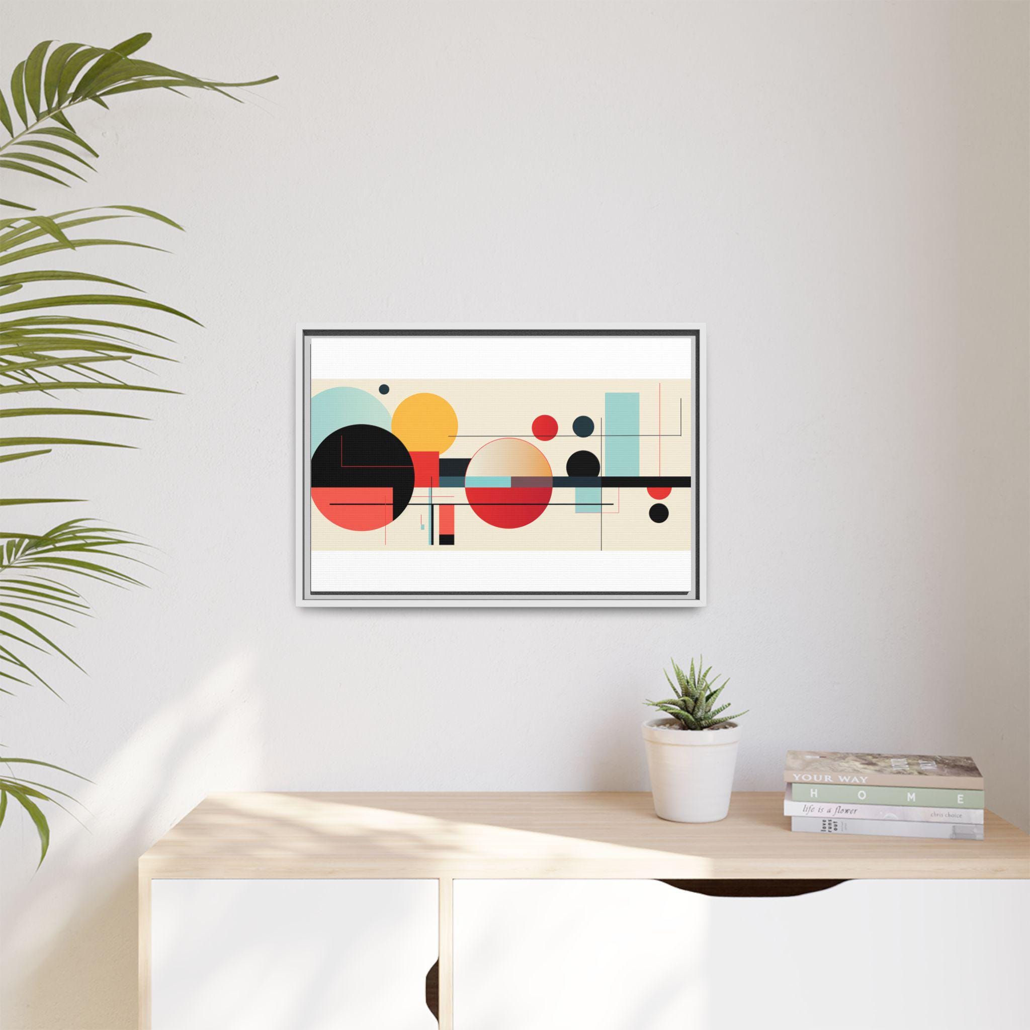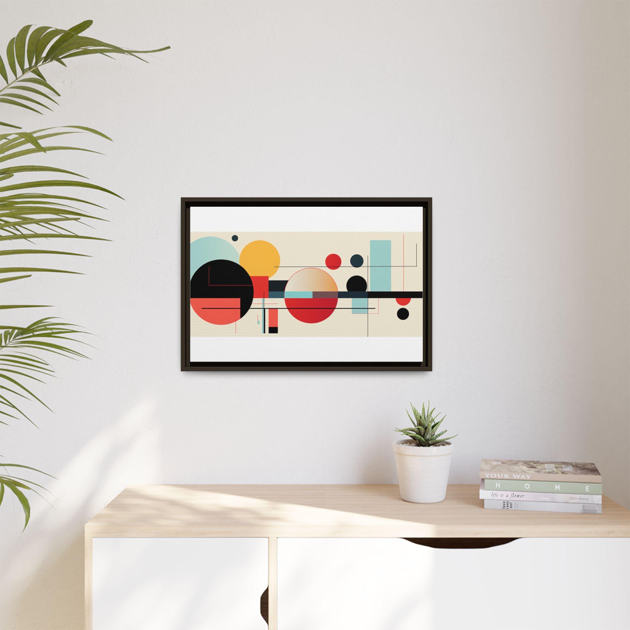 This framed matte canvas brings clean, modern energy to any wall. Bold geometric circles and fine linear accents float on a warm, neutral field — warm reds and deep blacks balanced by soft teal and gold. The low-reflective matte finish keeps the image soft and gallery-ready, while the slim pine frame adds a subtle, natural edge. Hang it above a console, over a sofa, or in a home office to anchor a mid-century or contemporary space with composed color and rhythm.