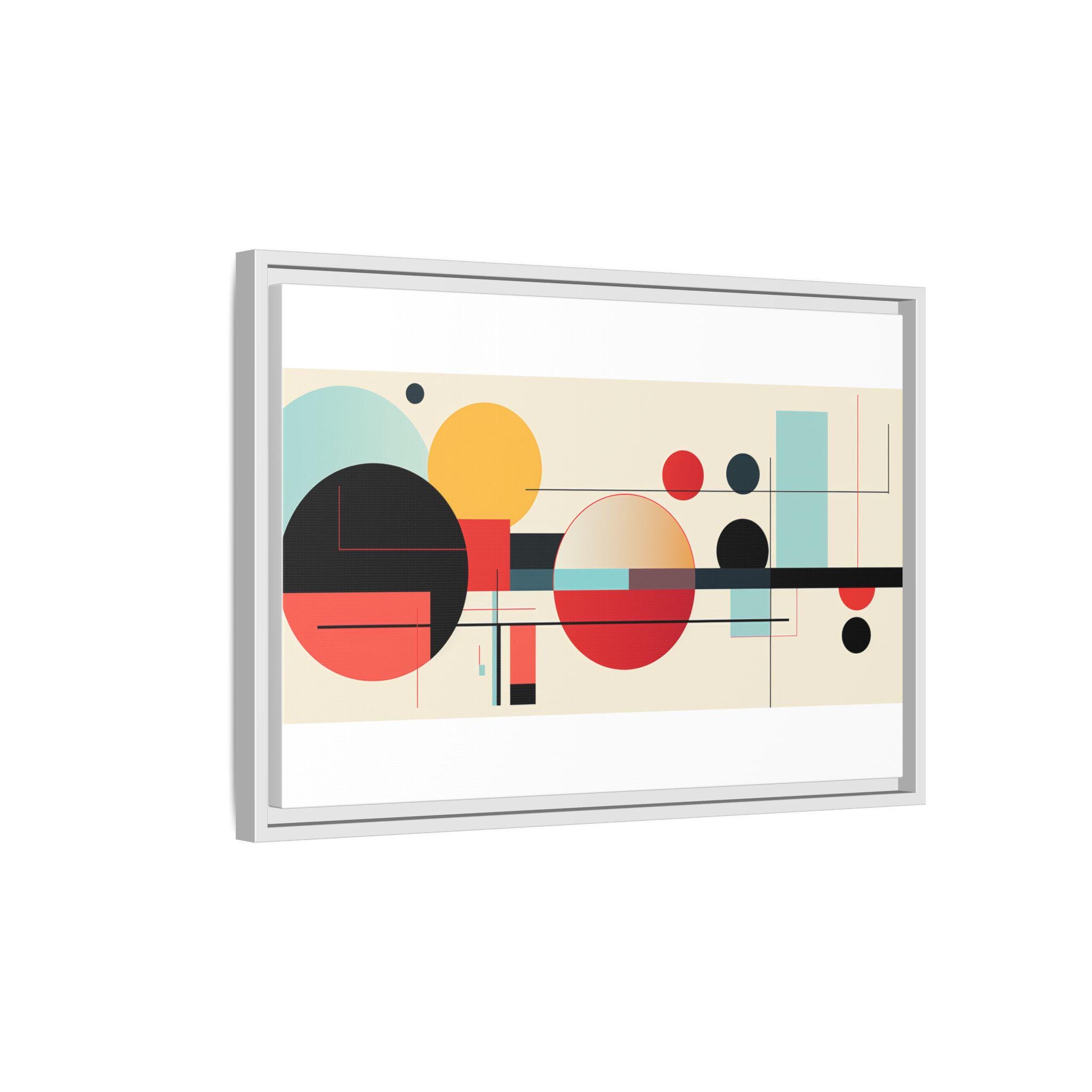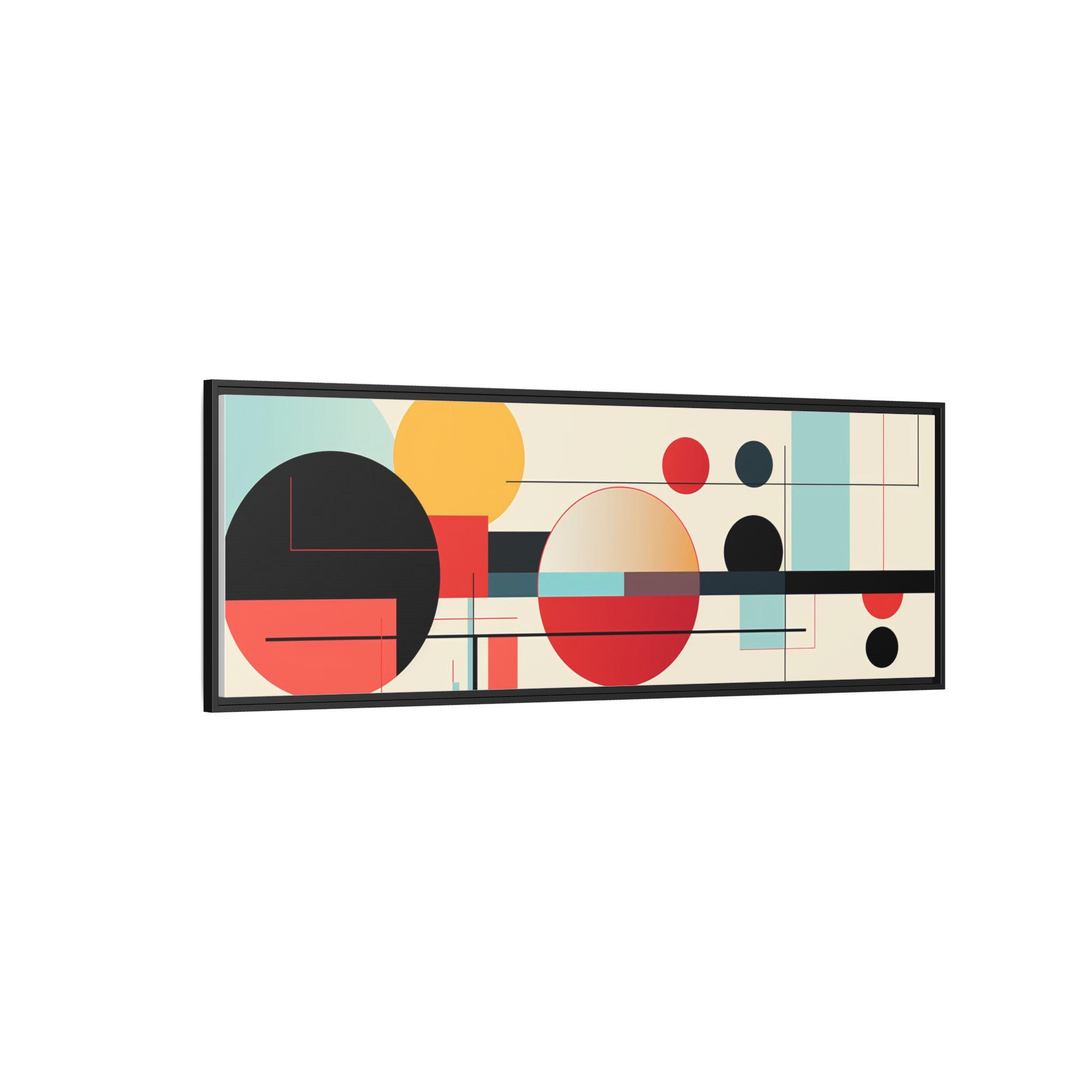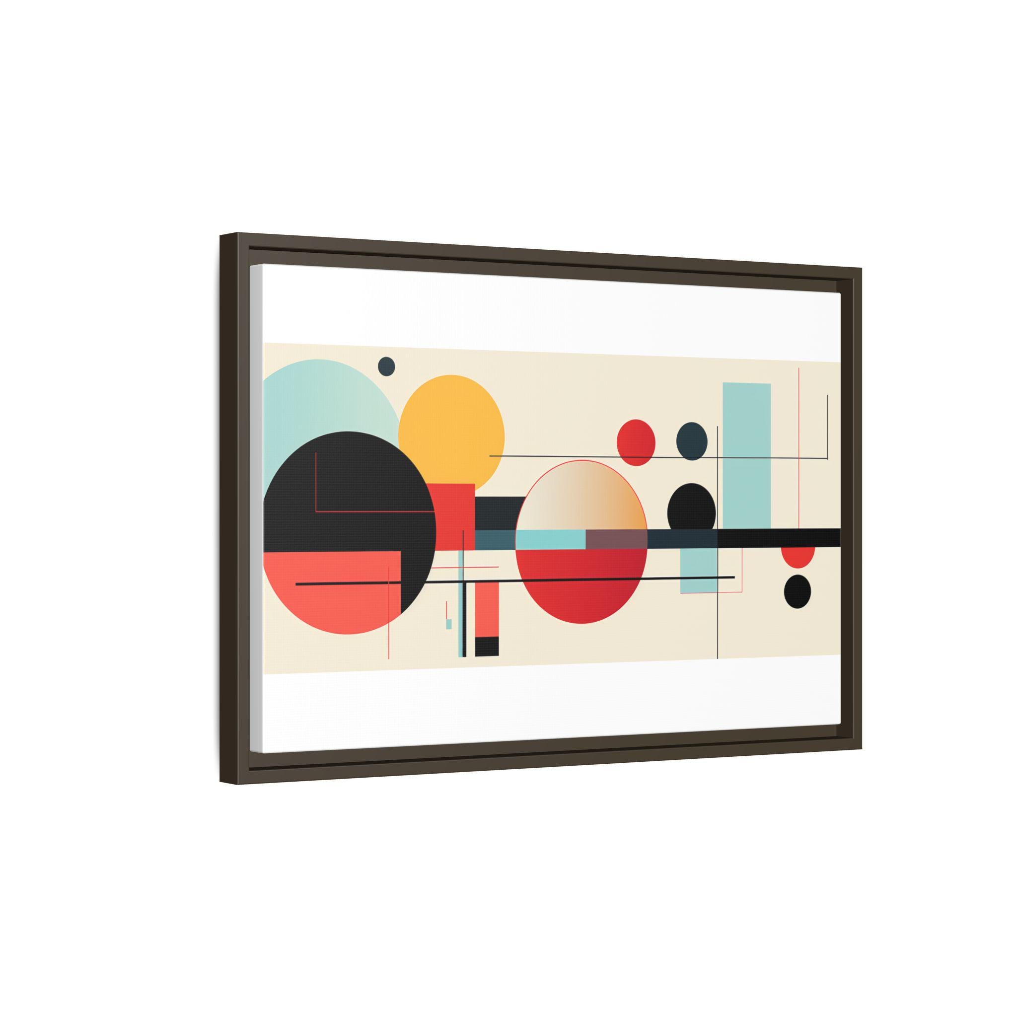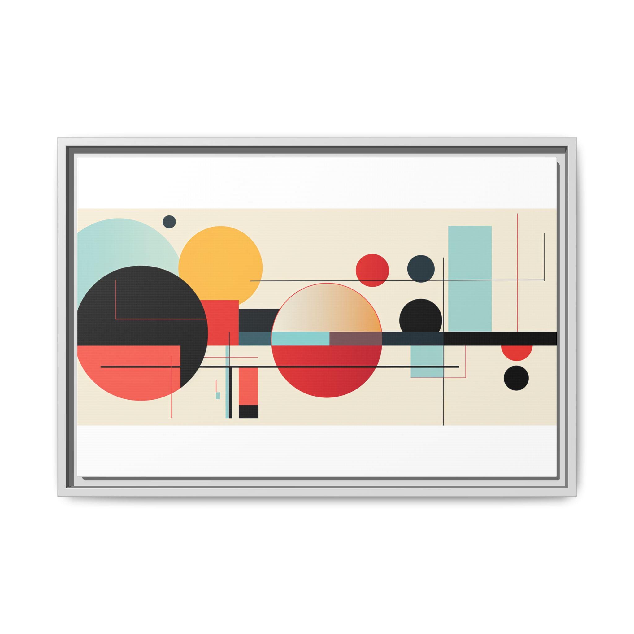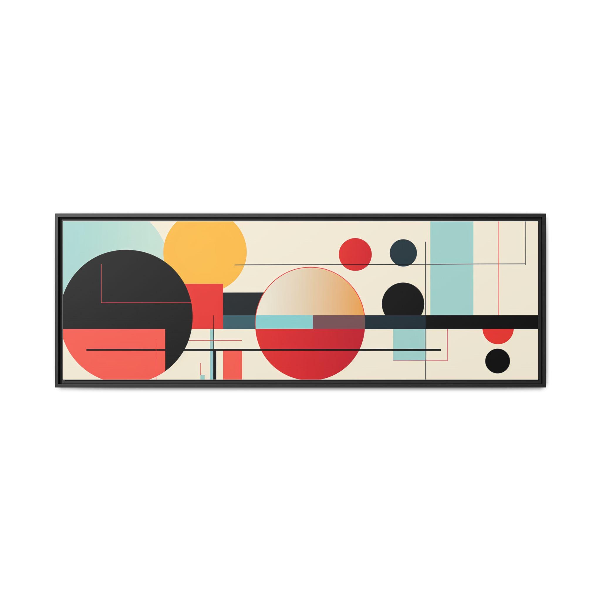 This framed matte canvas brings clean, modern energy to any wall. Bold geometric circles and fine linear accents float on a warm, neutral field — warm reds and deep blacks balanced by soft teal and gold. The low-reflective matte finish keeps the image soft and gallery-ready, while the slim pine frame adds a subtle, natural edge. Hang it above a console, over a sofa, or in a home office to anchor a mid-century or contemporary space with composed color and rhythm.